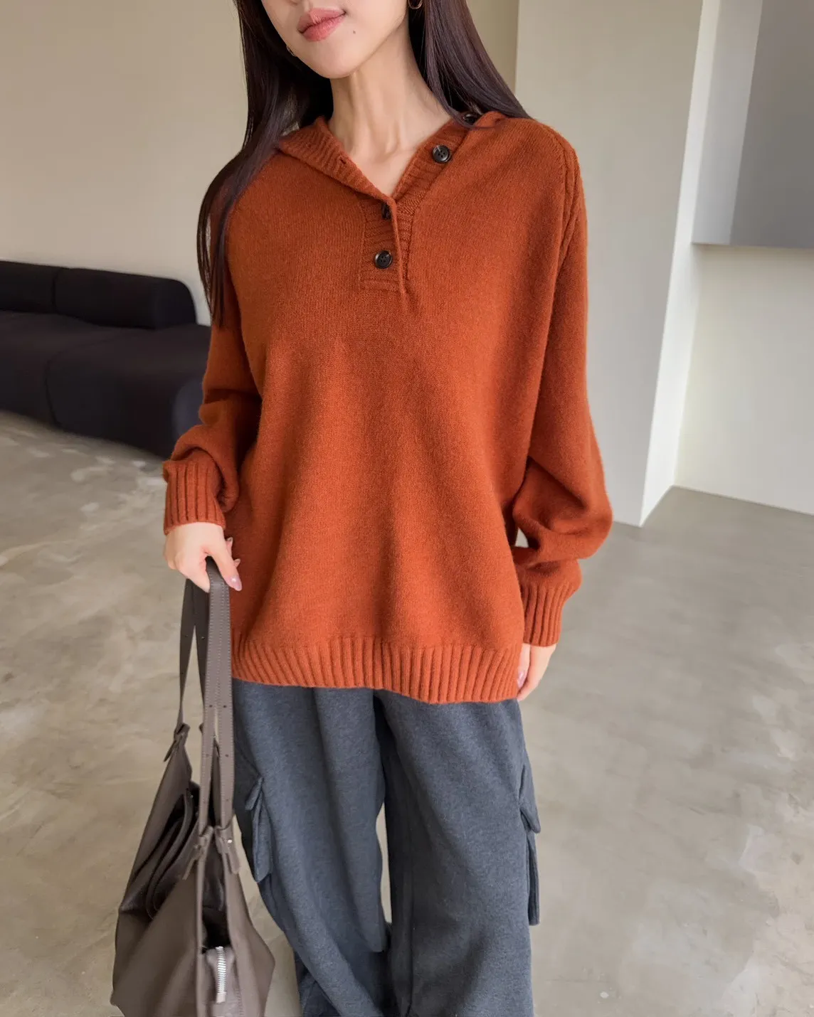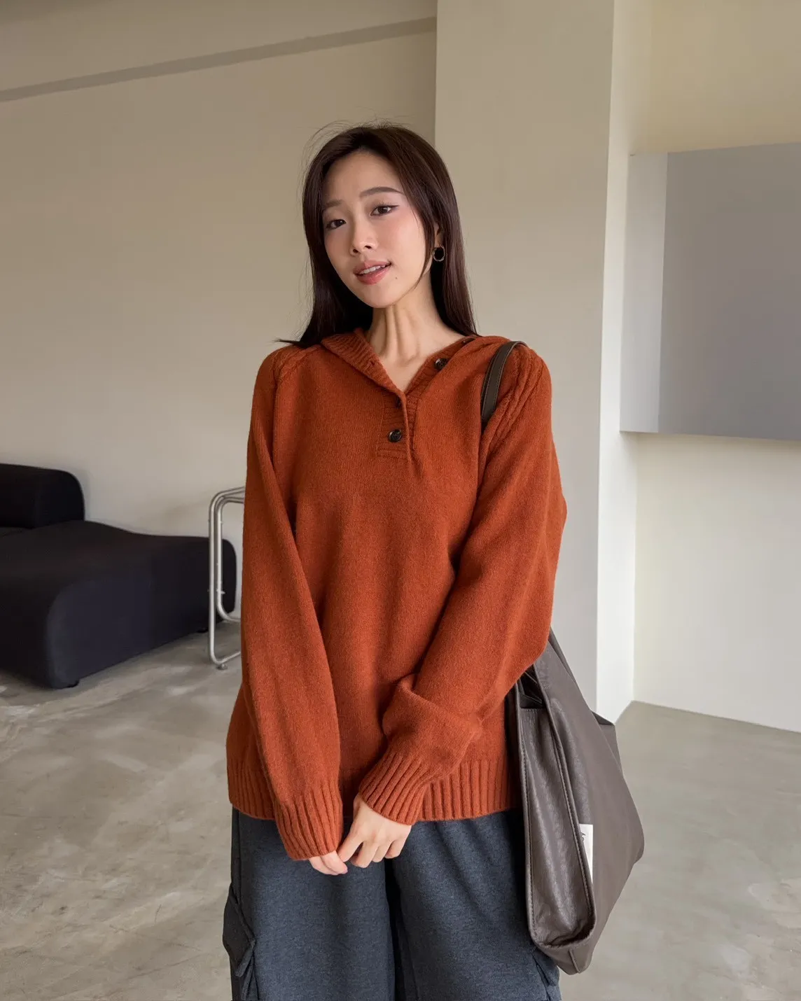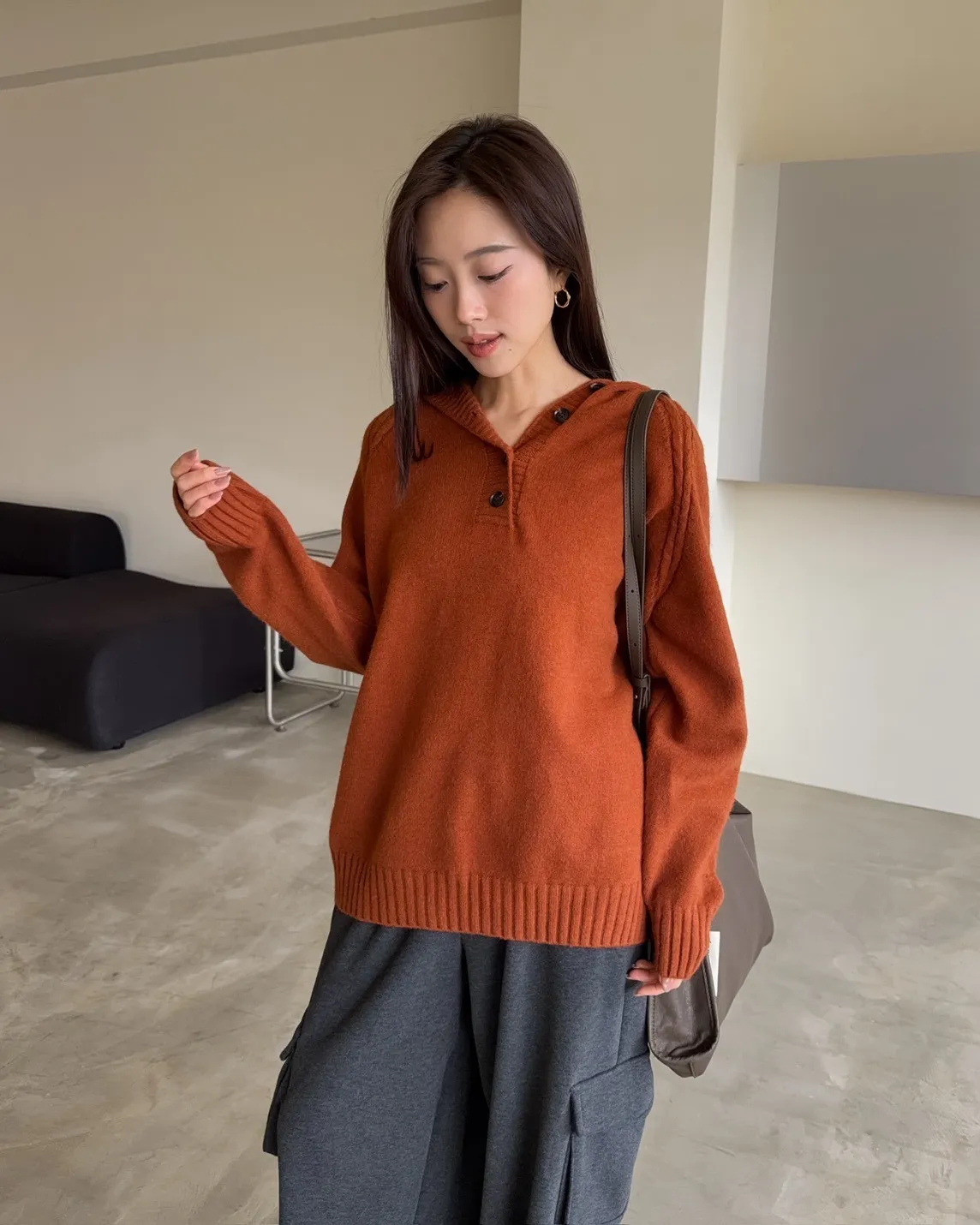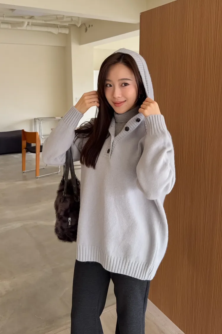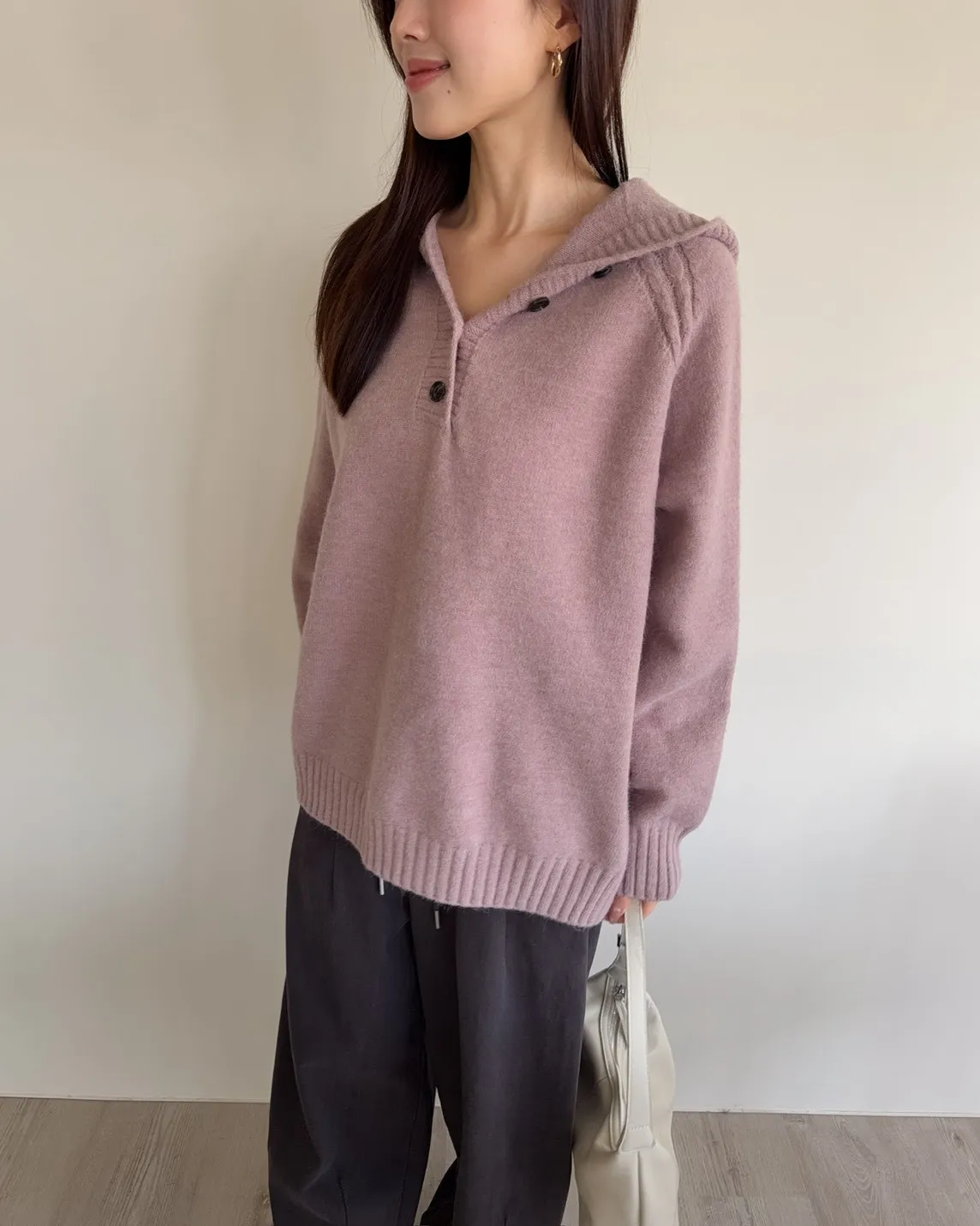 X0038(五色)敲可愛鈕扣連帽毛衣(杏/粉紅/橘/淺藍/灰)