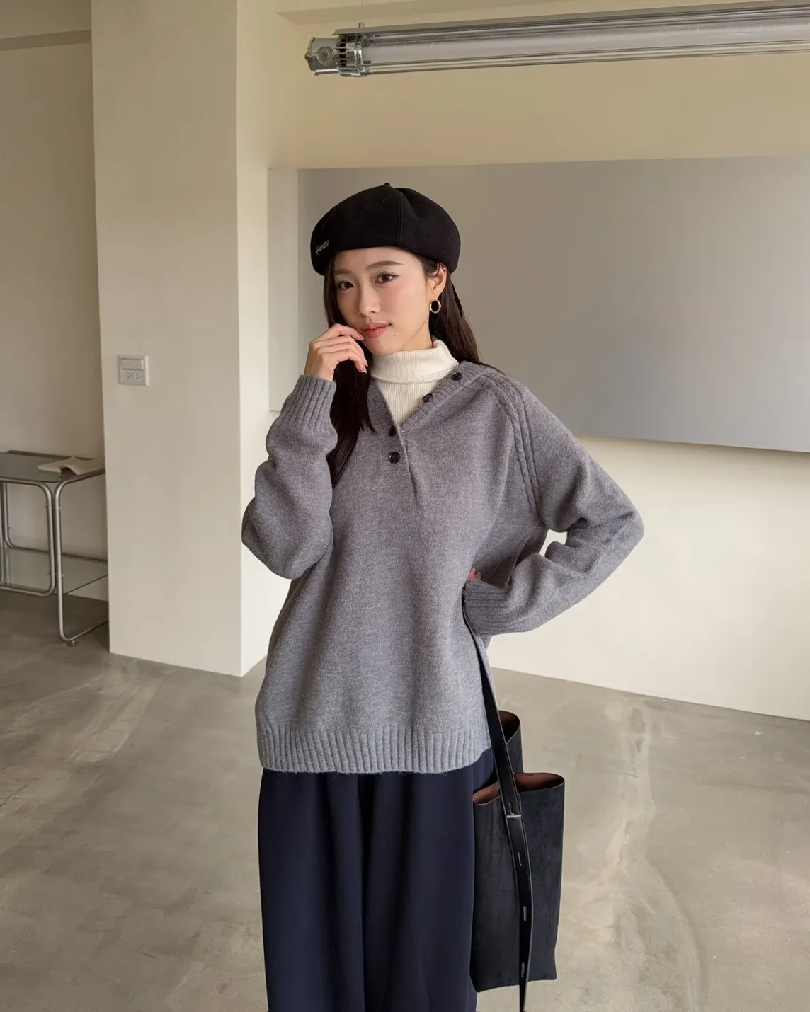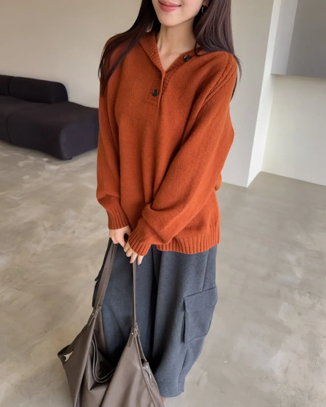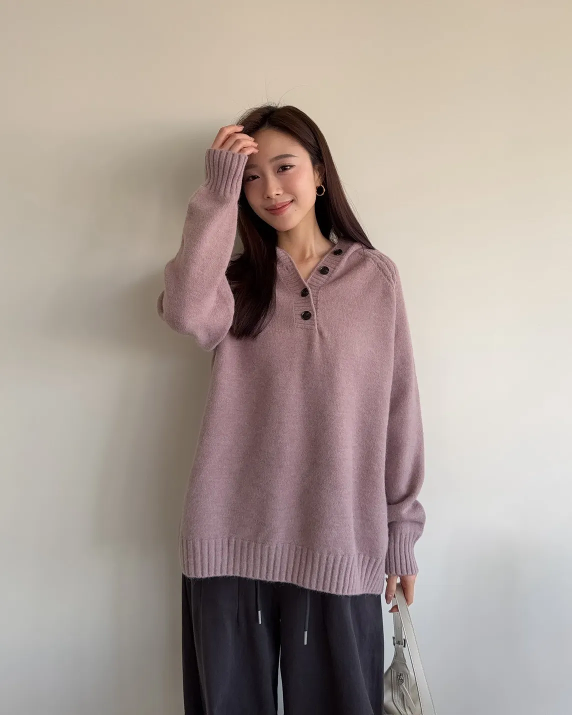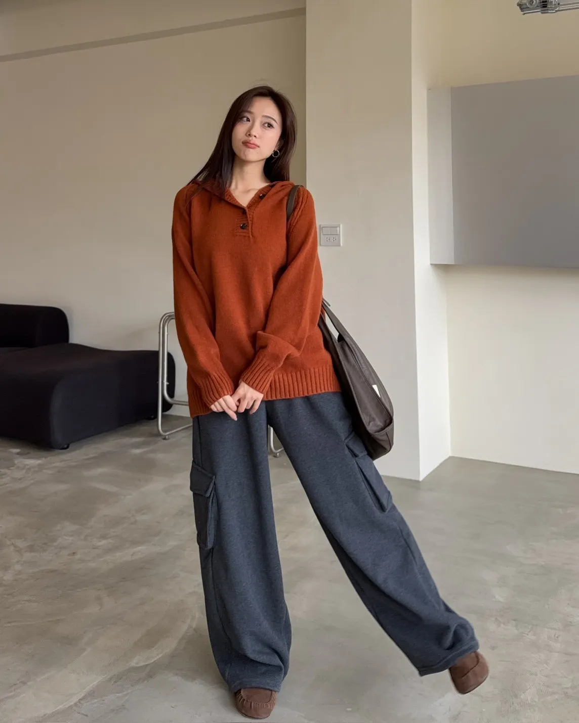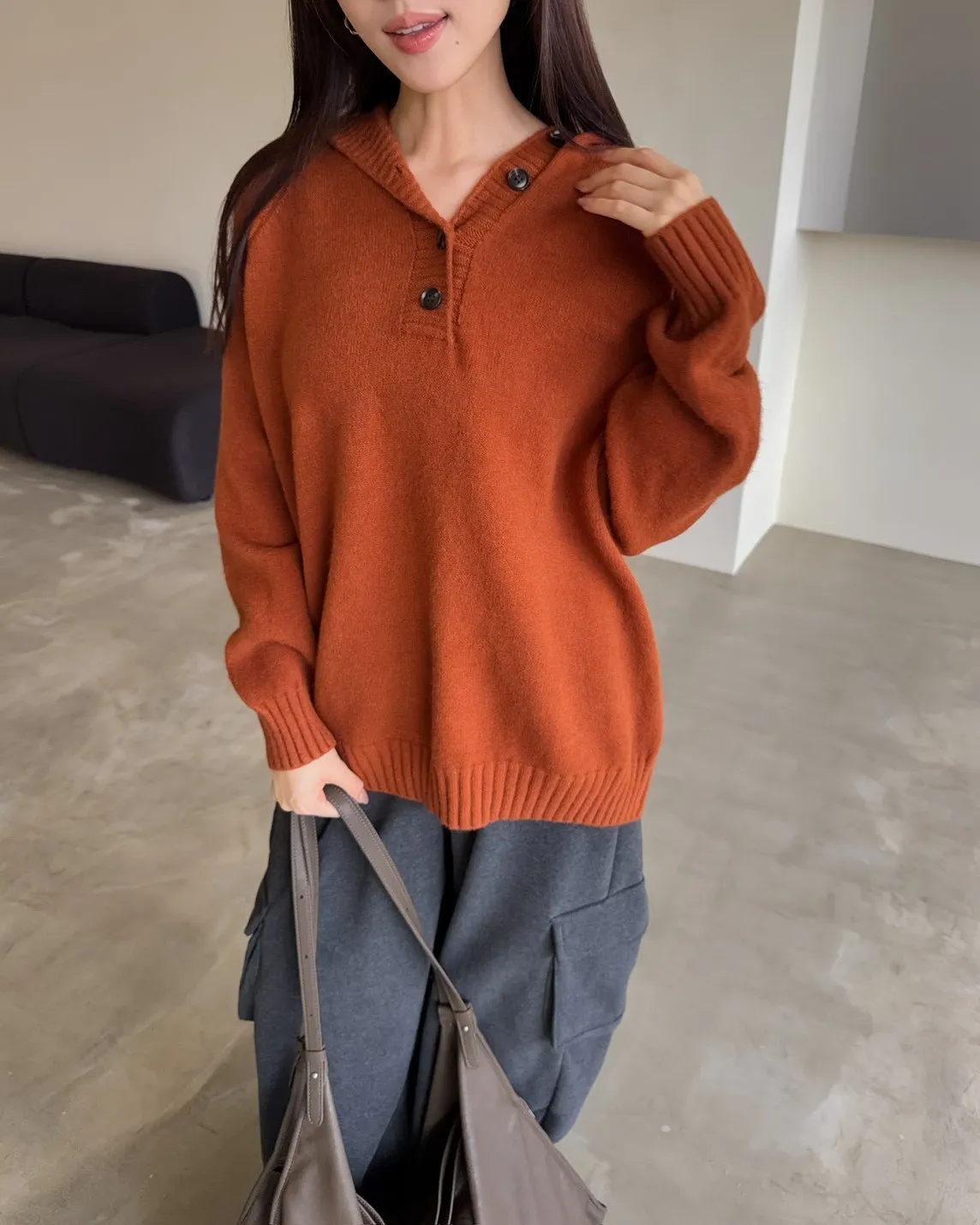 X0038(五色)敲可愛鈕扣連帽毛衣(杏/粉紅/橘/淺藍/灰)