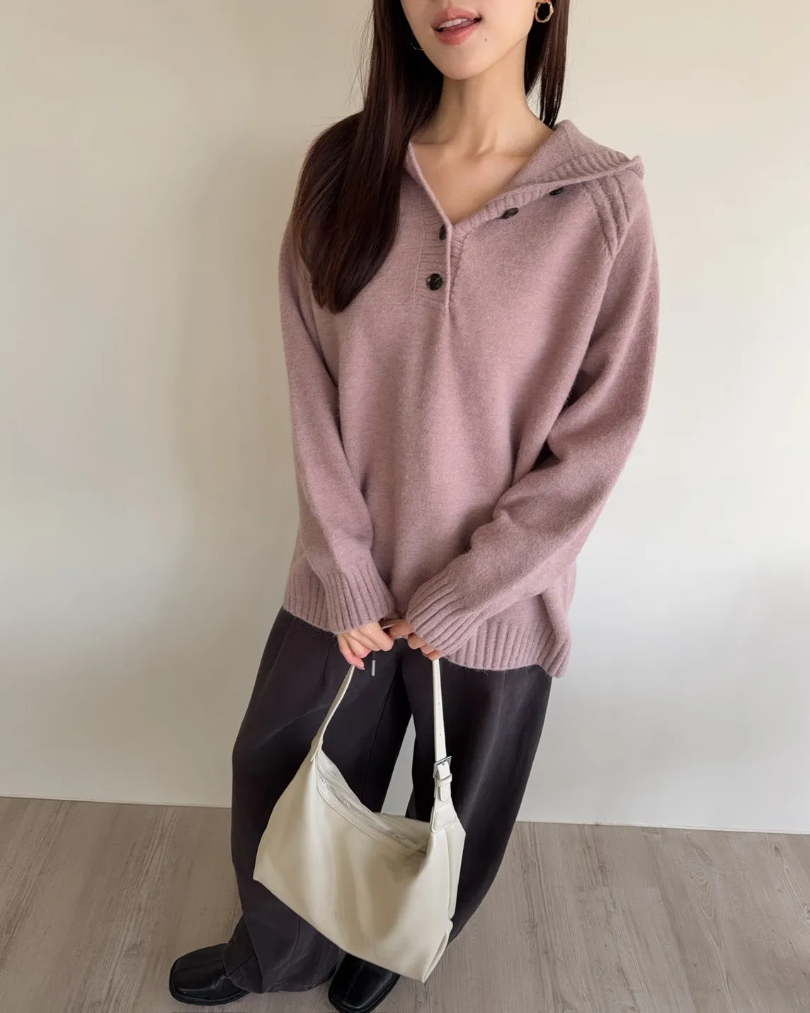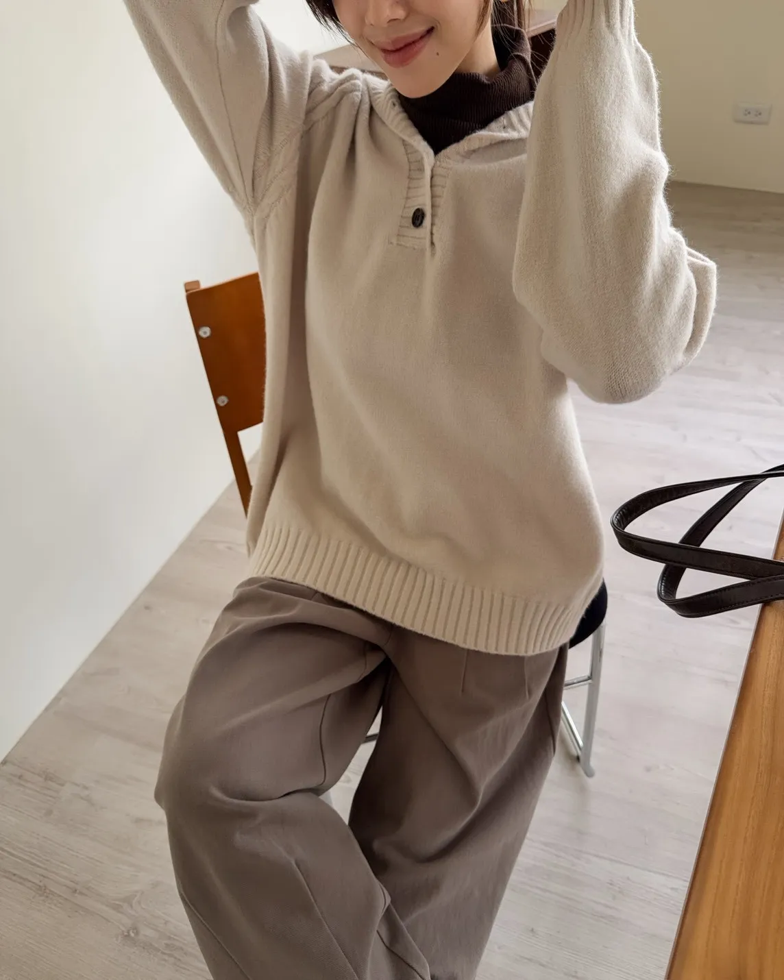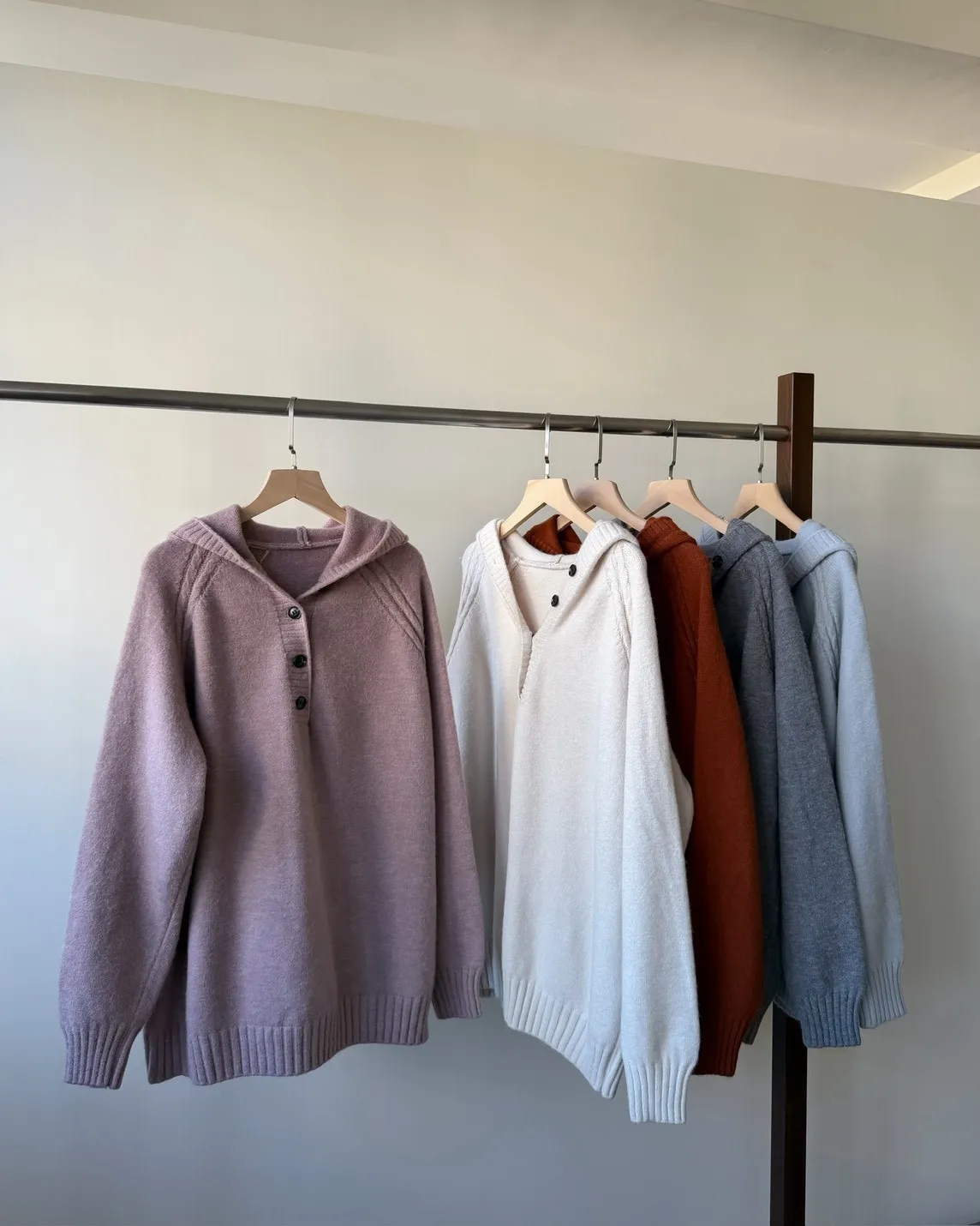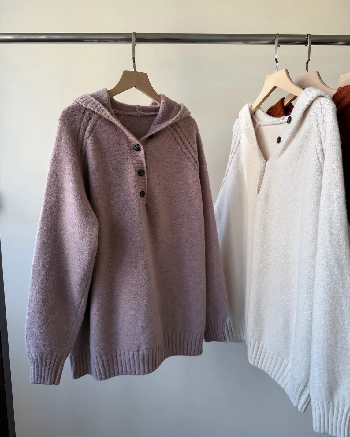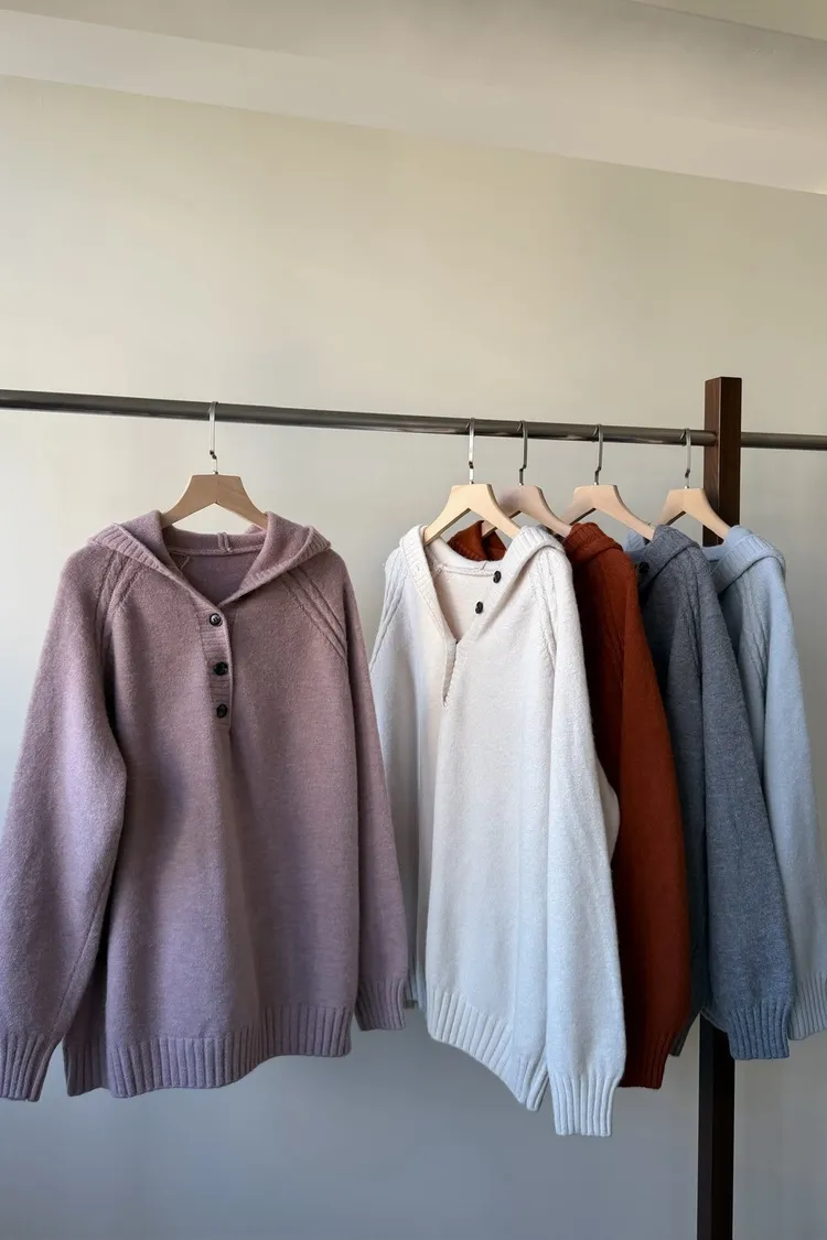 連帽 中長版 鈕扣 針織 顏色可愛 落肩 肩膀縫線造型