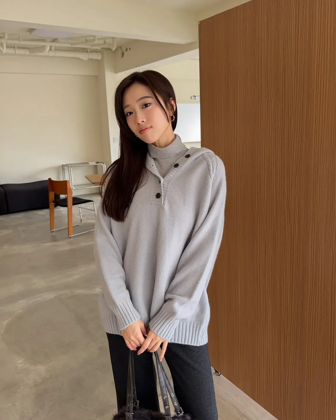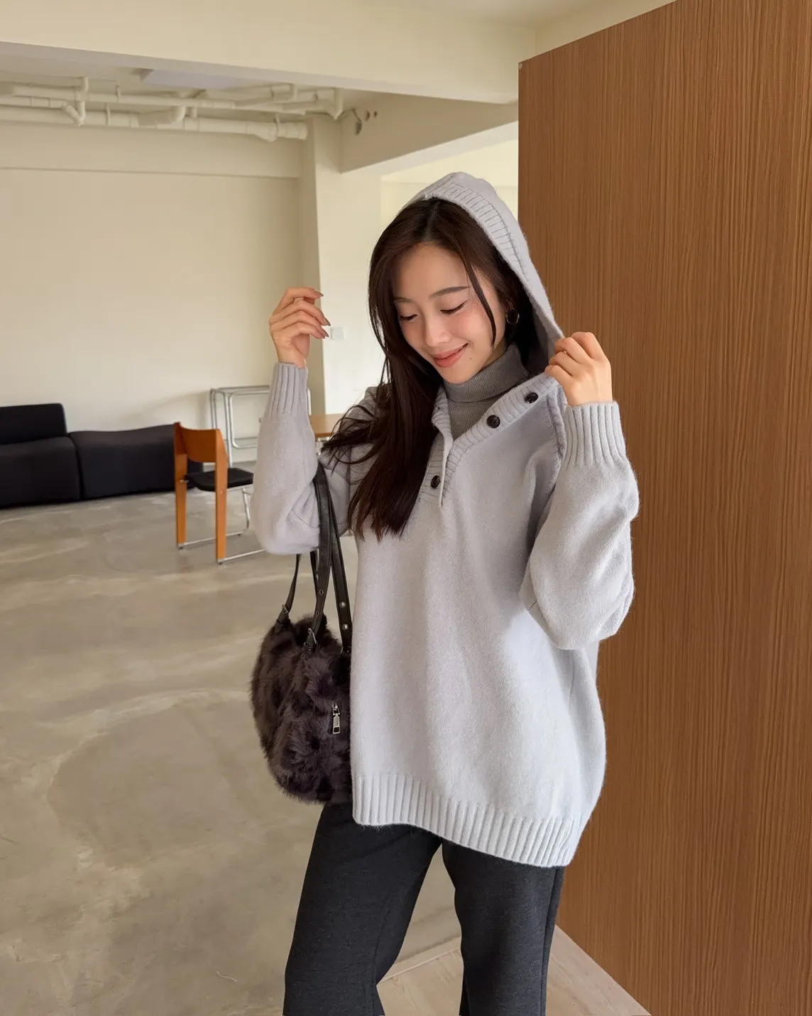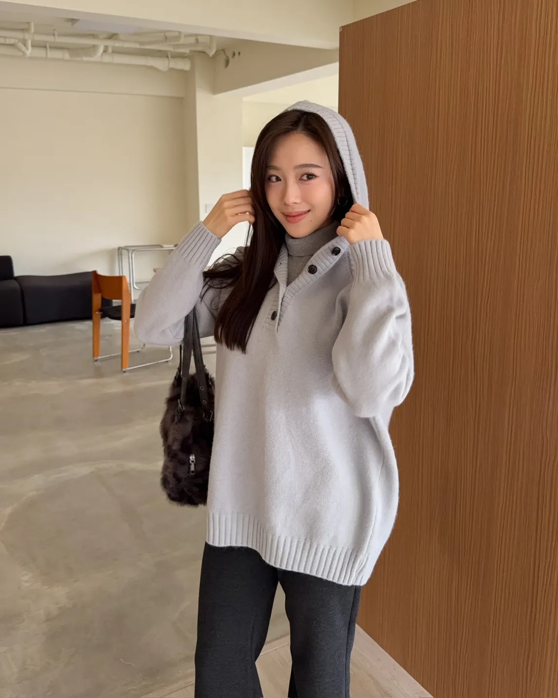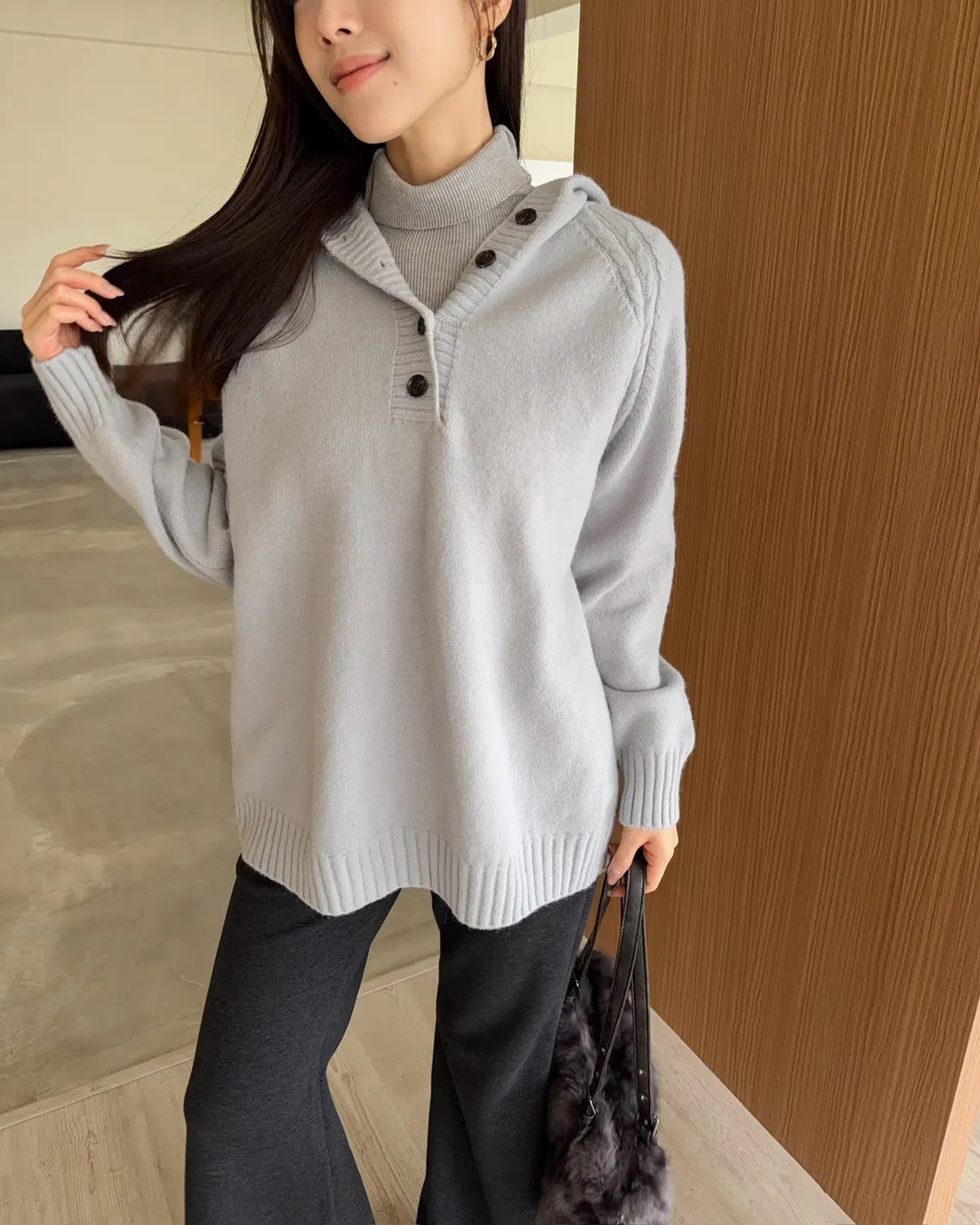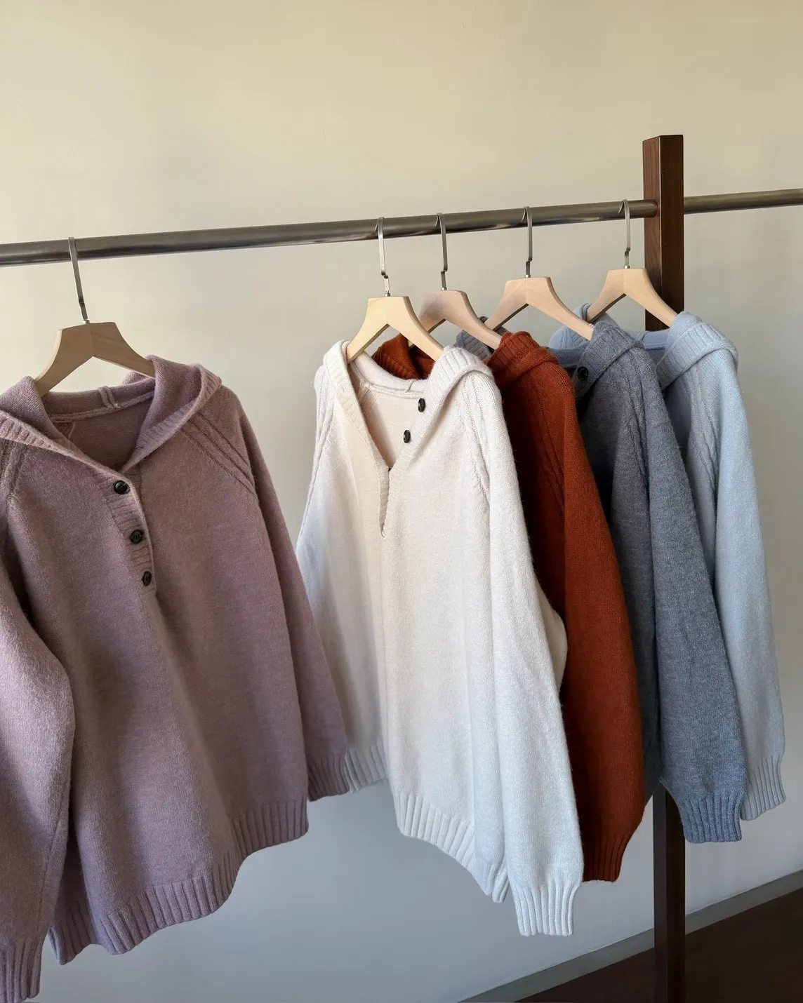 連帽 中長版 鈕扣 針織 顏色可愛 落肩 肩膀縫線造型