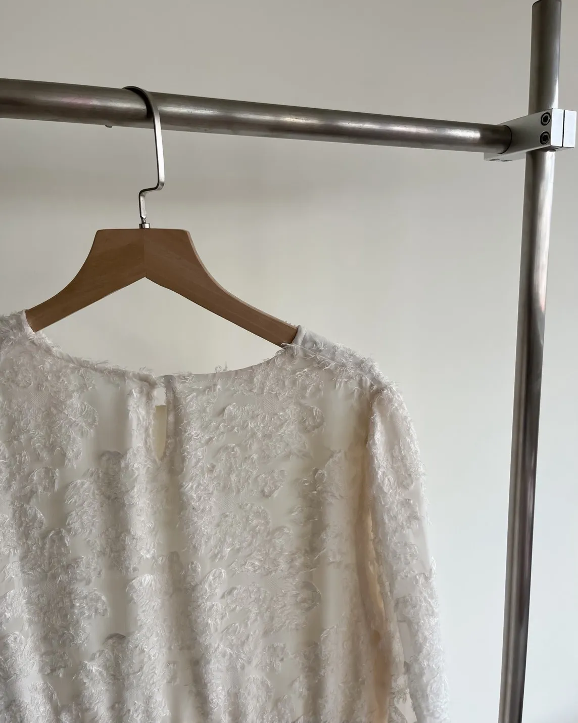 領口後1顆鈕扣 有內襯 薄透紗+羽毛 腰圍鬆緊 袖口鬆緊 布料本身無彈性