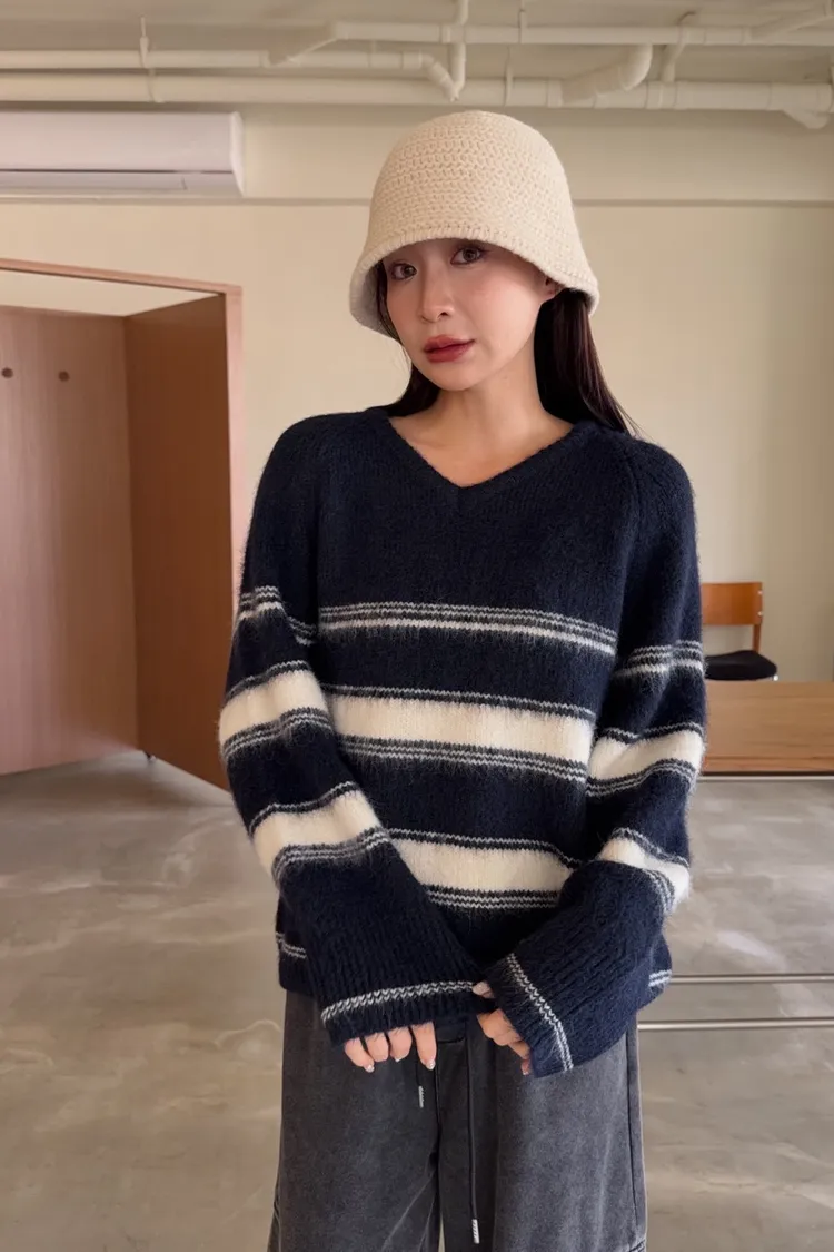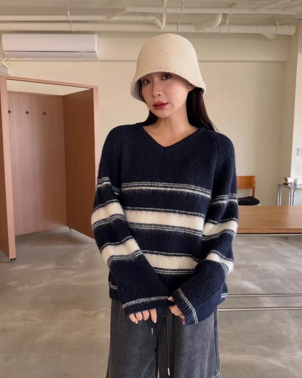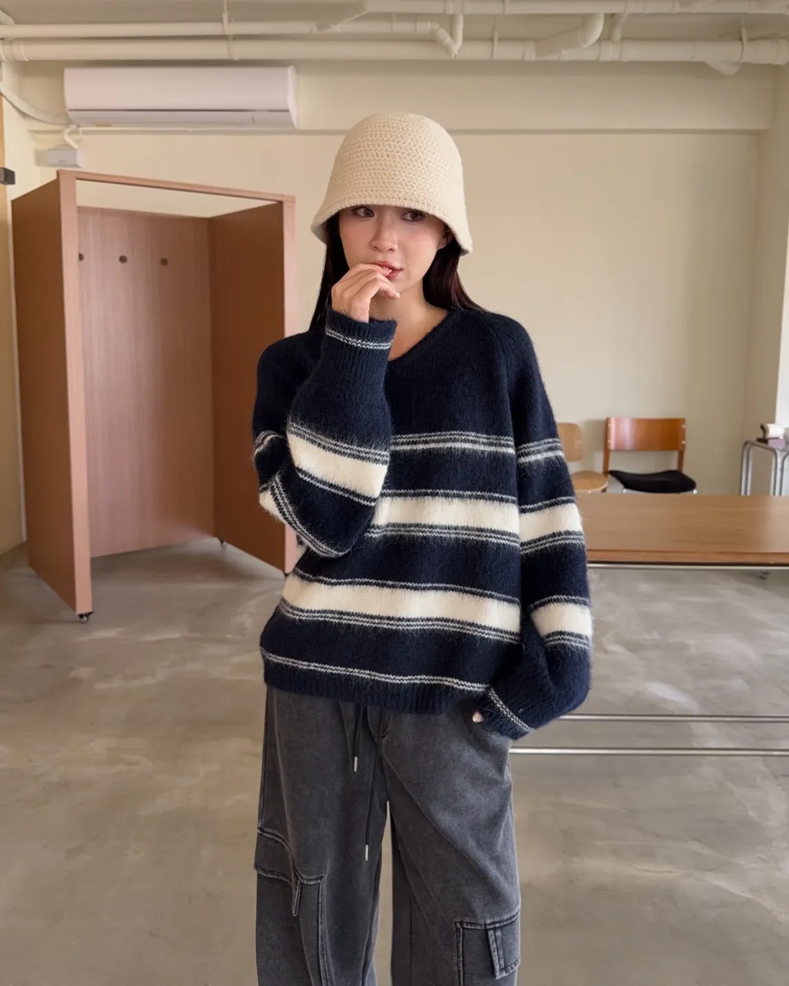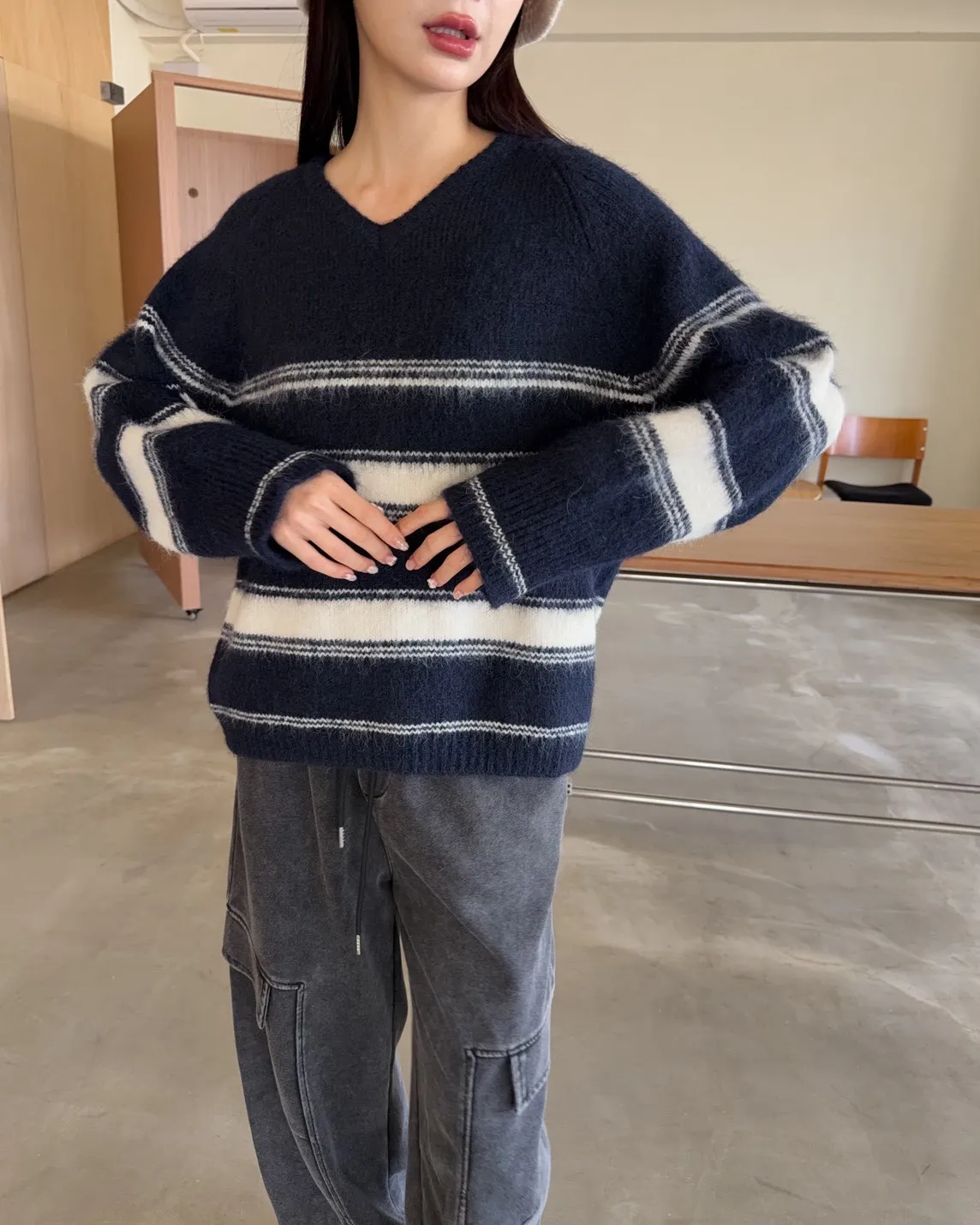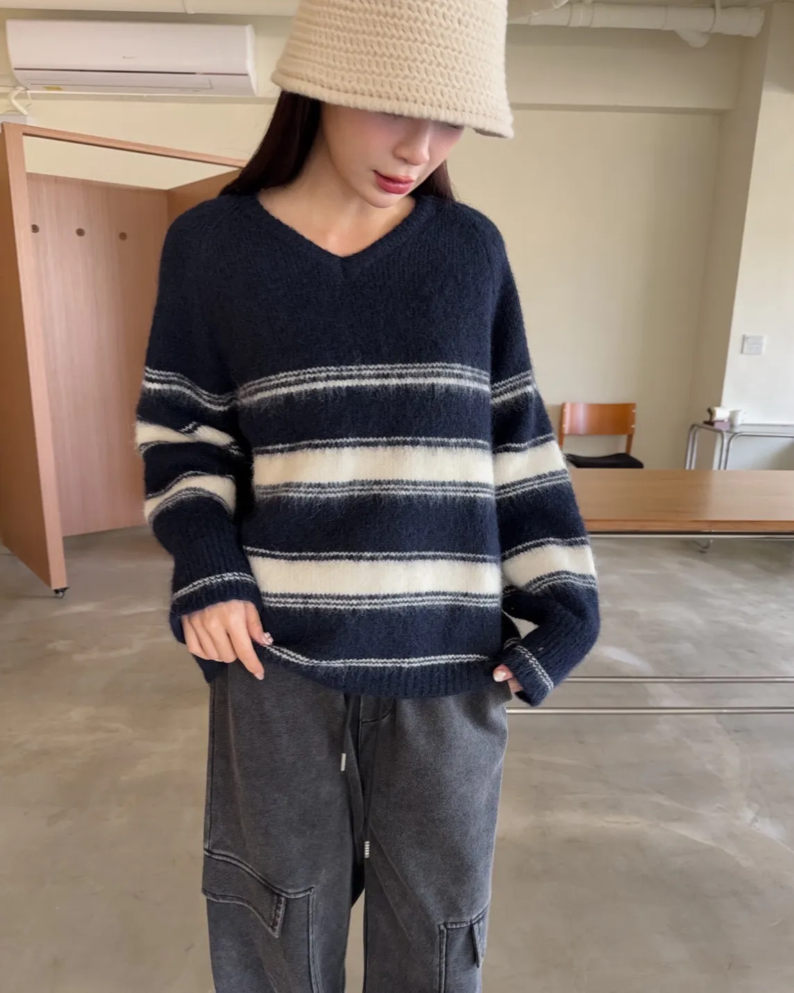 V領 配色條紋 混毛針織 有厚度 寬鬆落肩