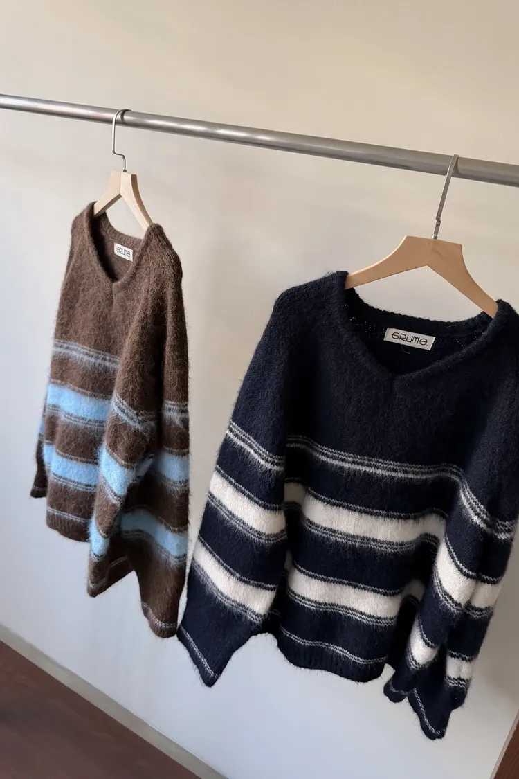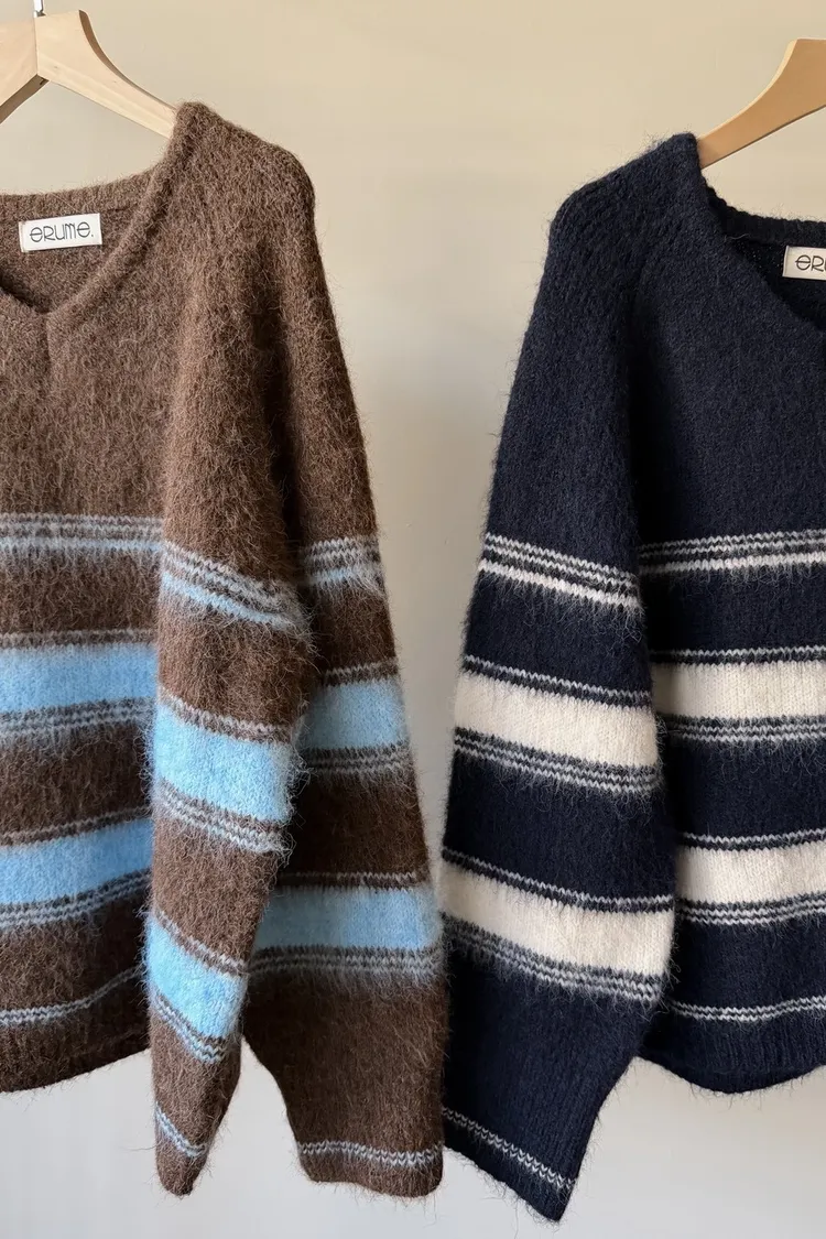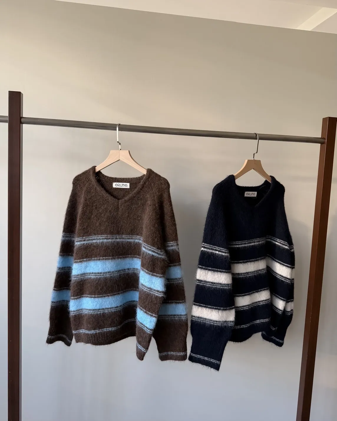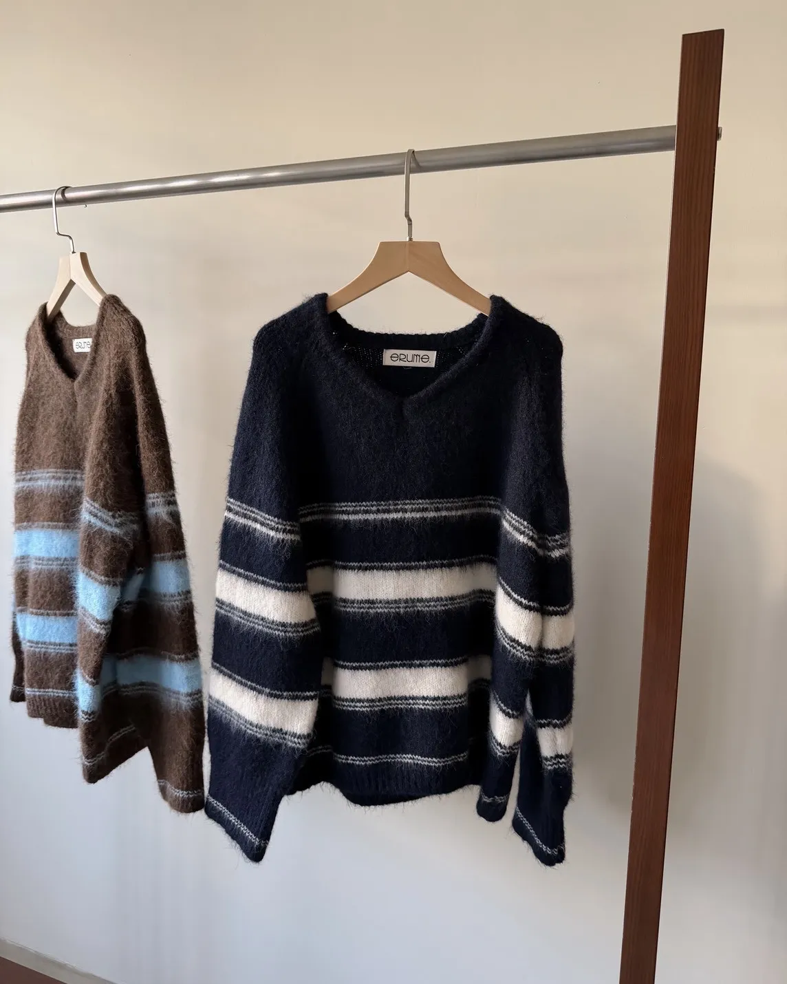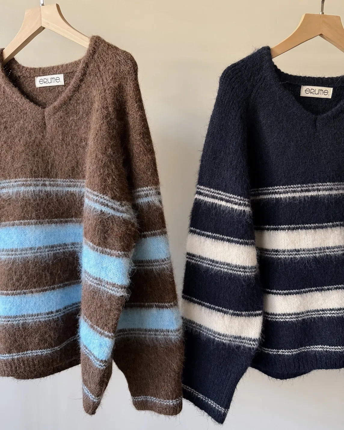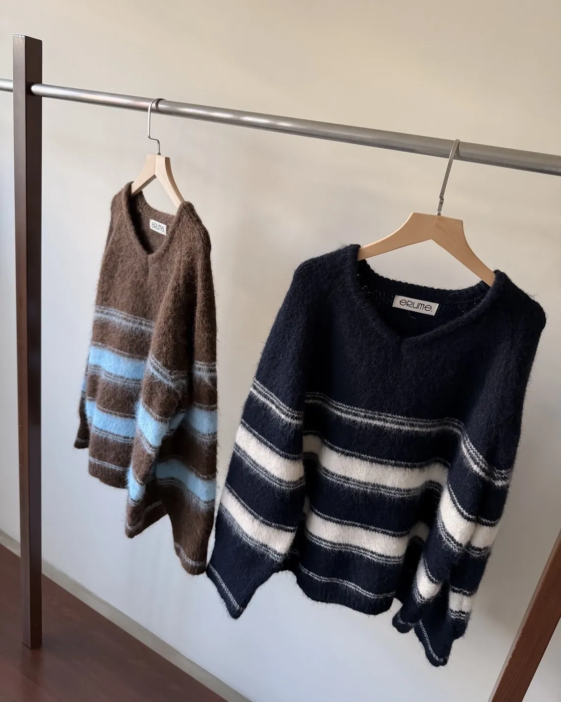 V領 配色條紋 混毛針織 有厚度 寬鬆落肩