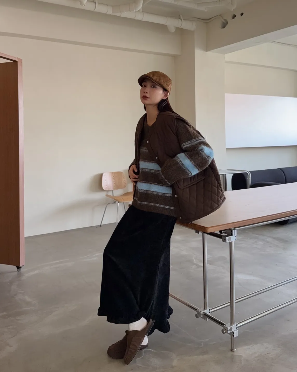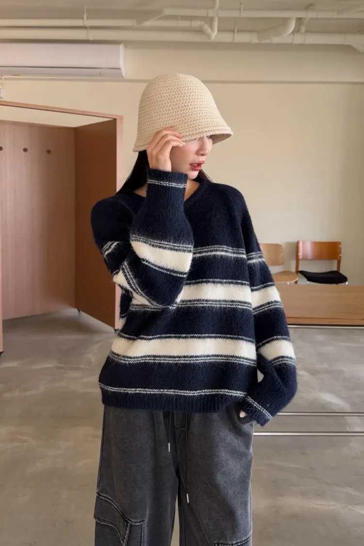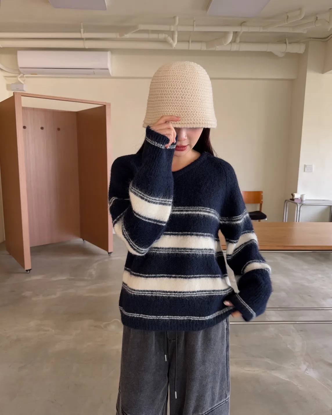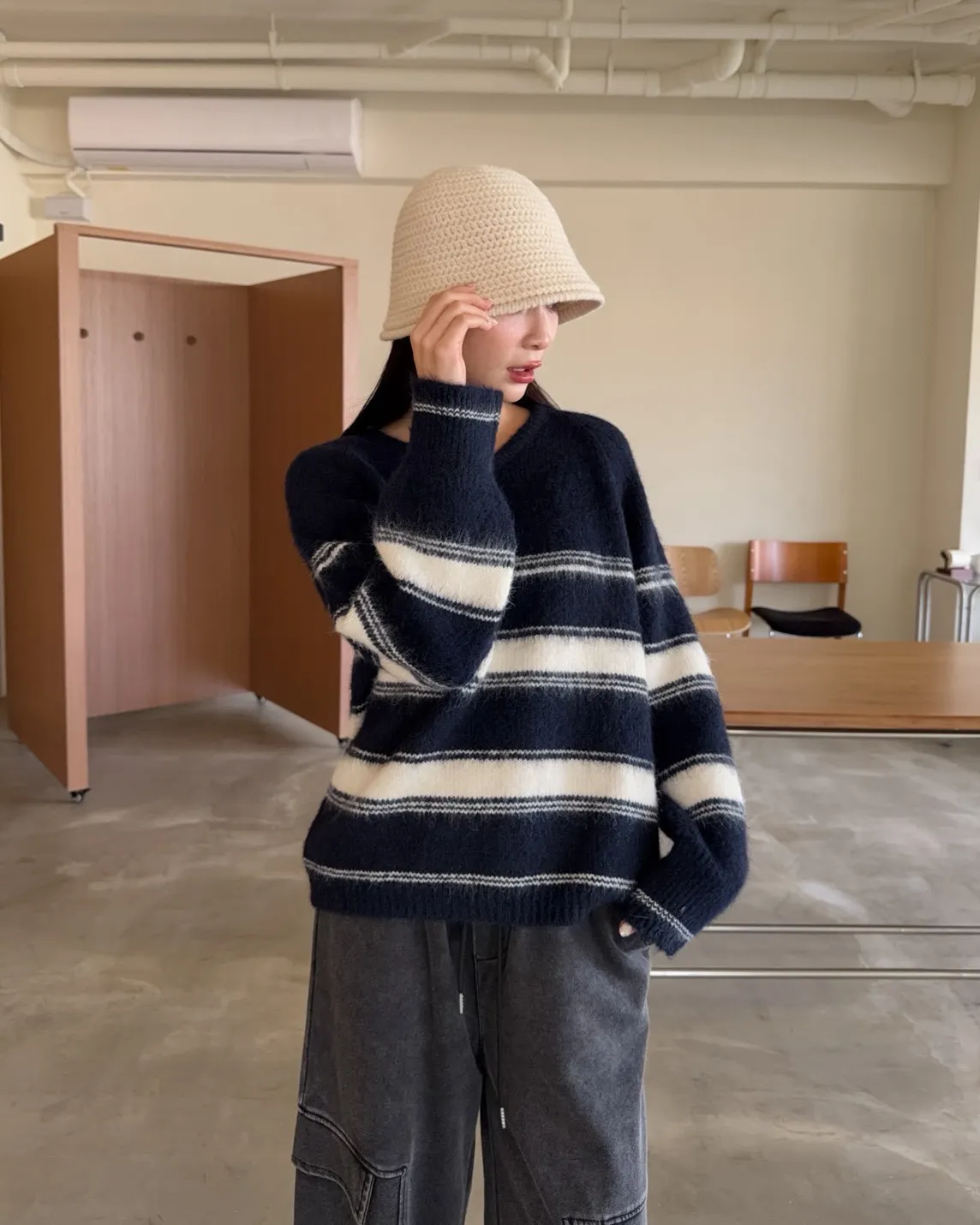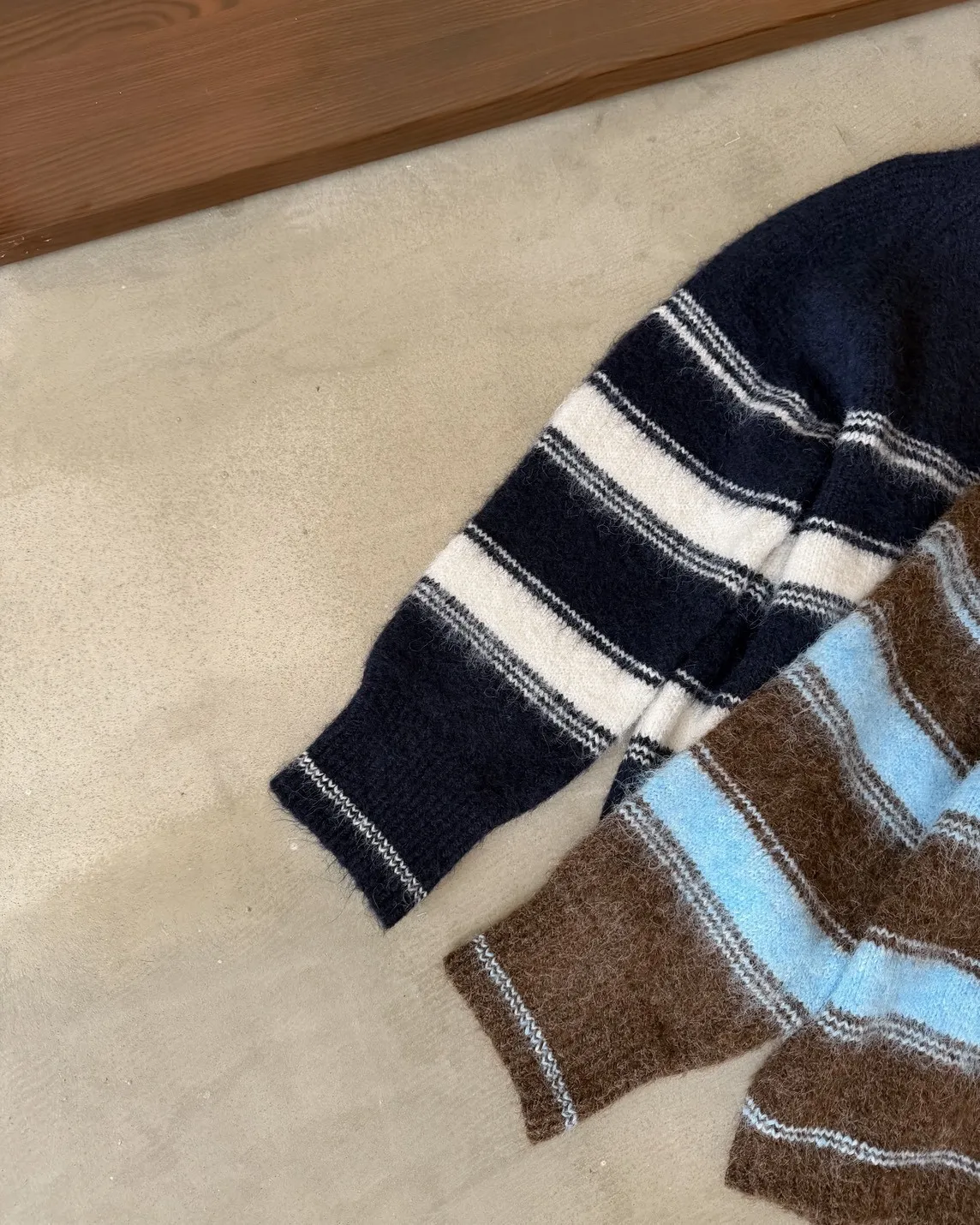 V領 配色條紋 混毛針織 有厚度 寬鬆落肩