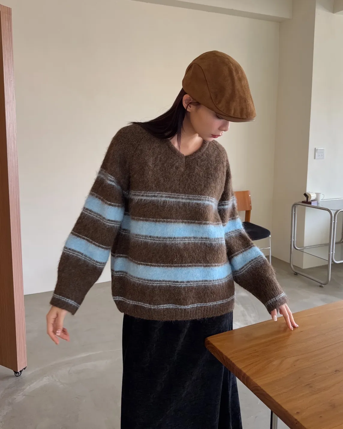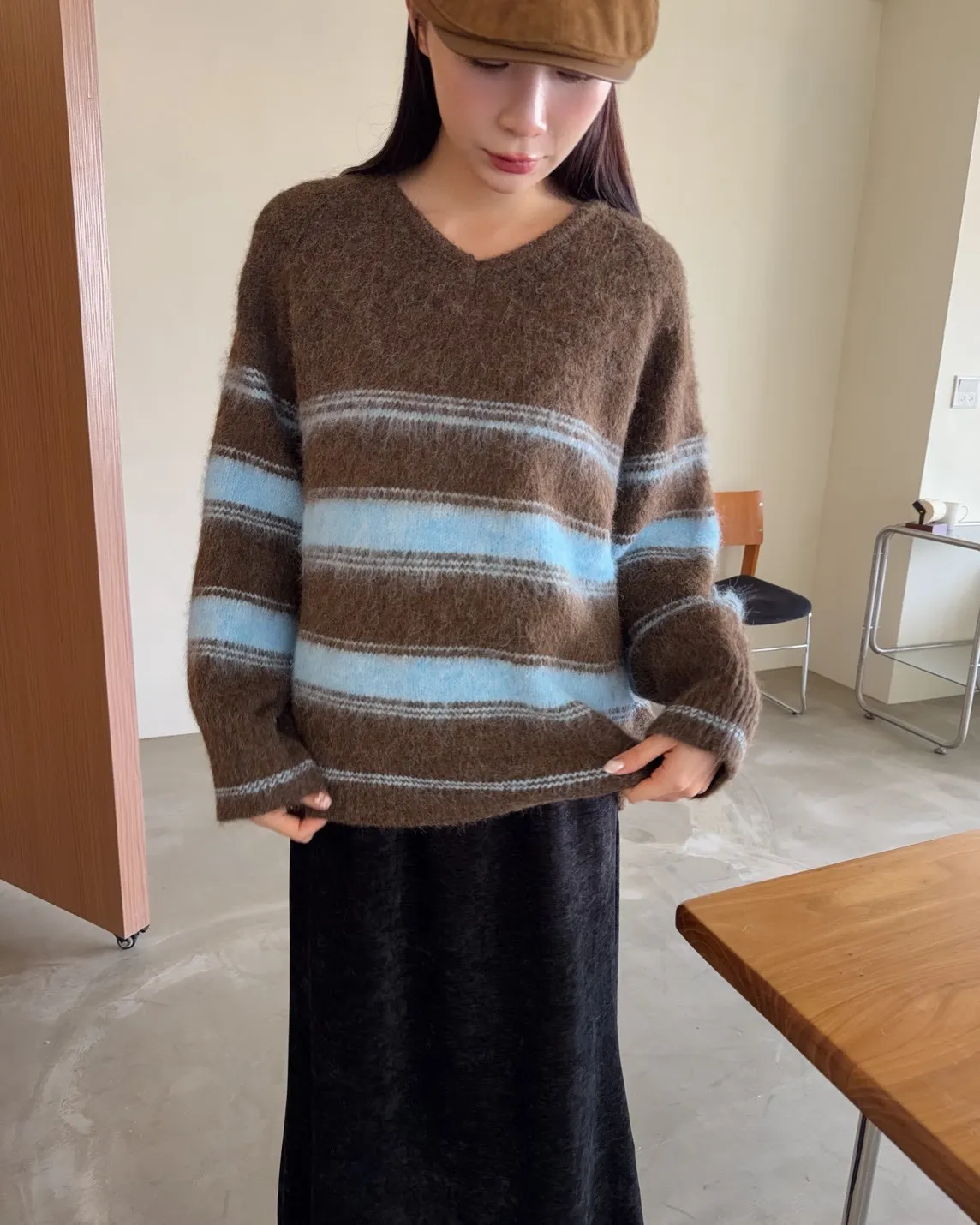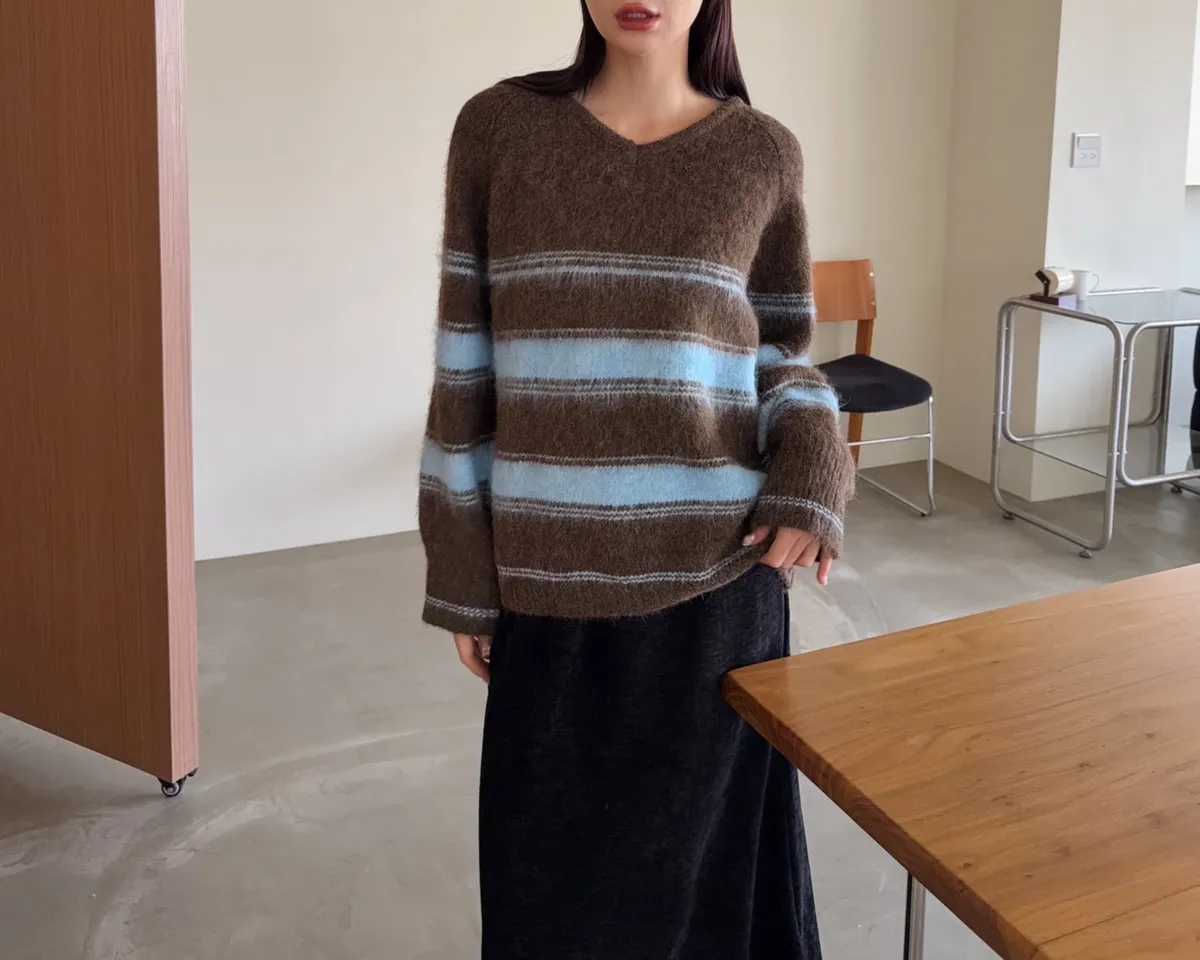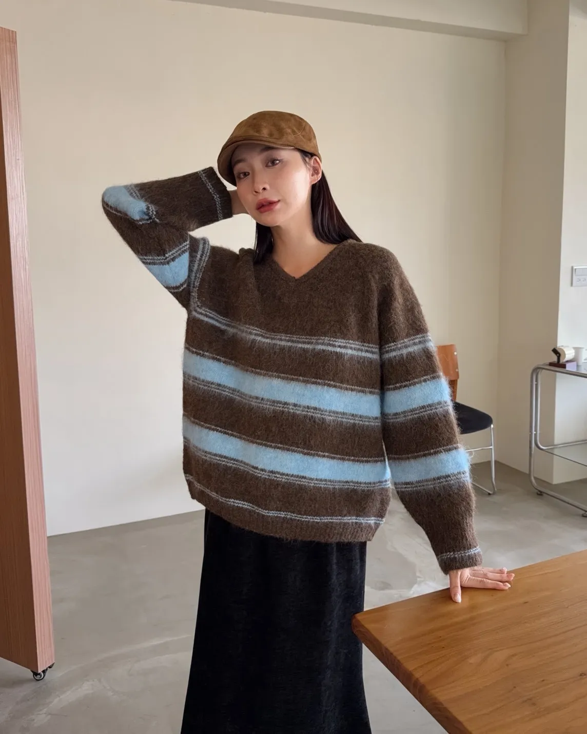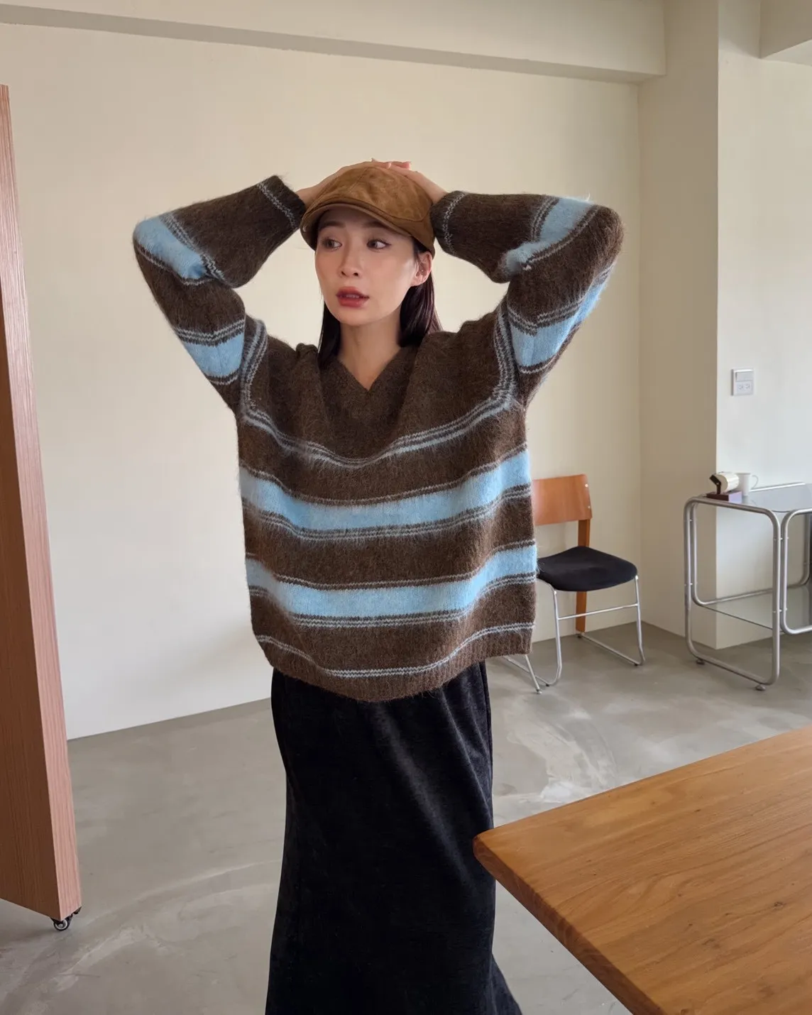 X0011配色好好看橫紋V領混毛毛衣(咖啡/深藍)