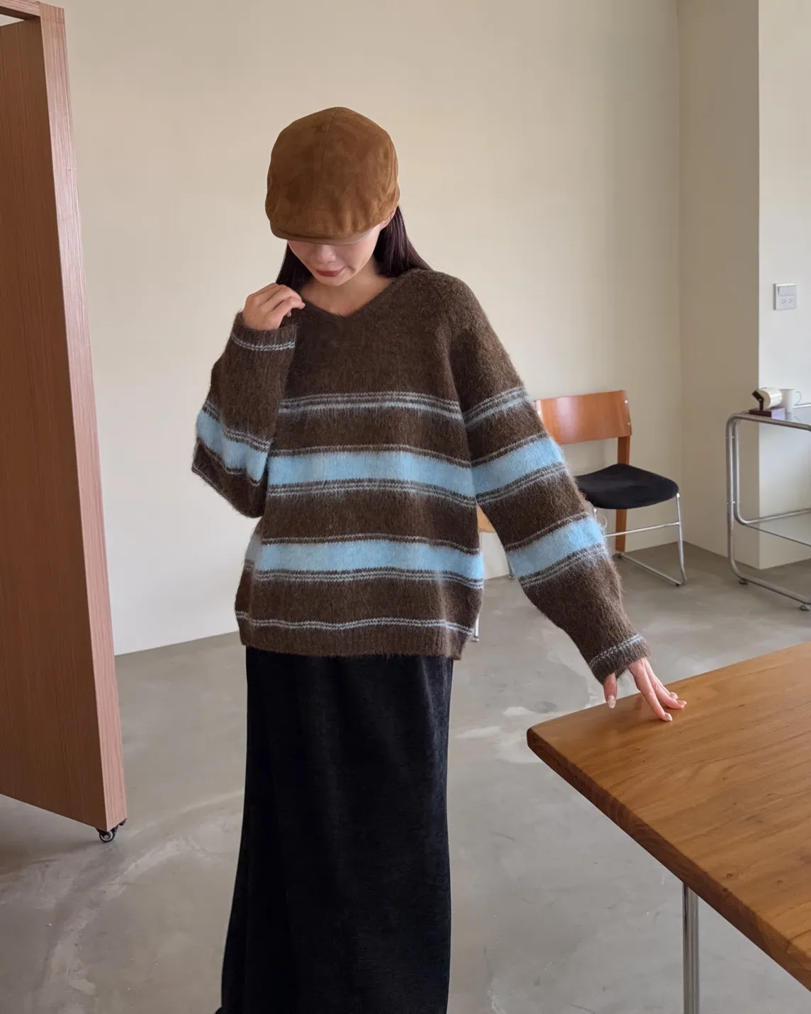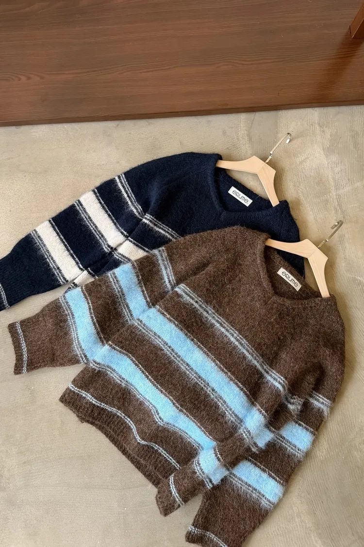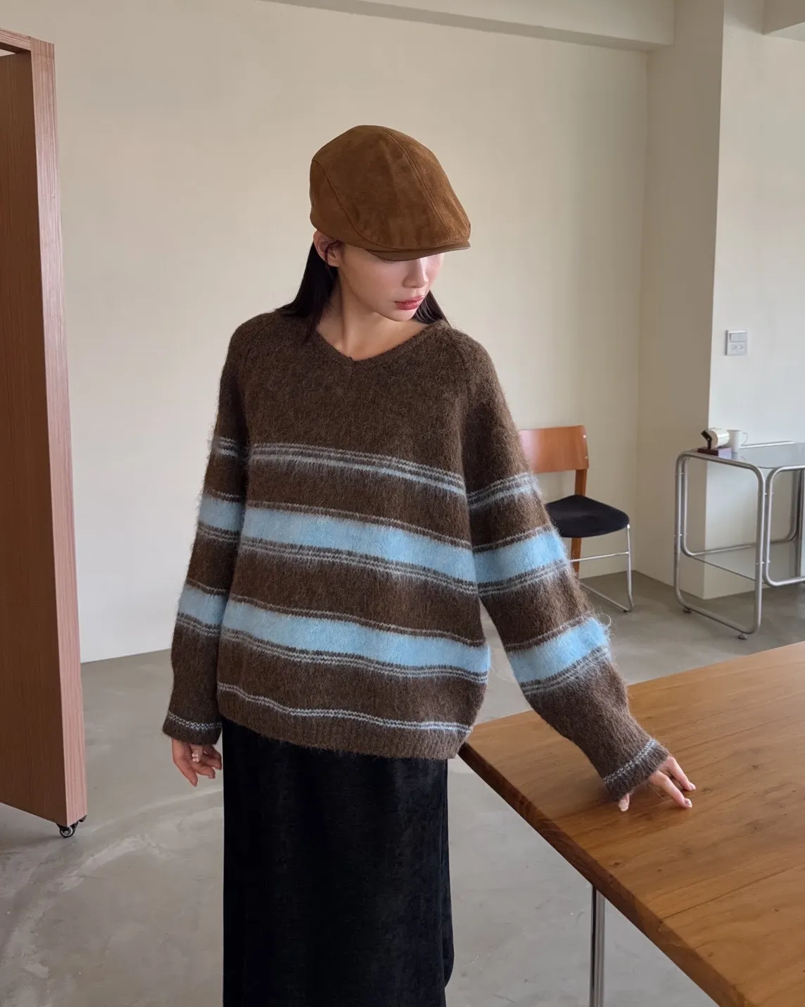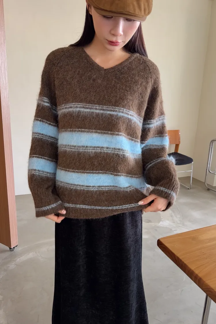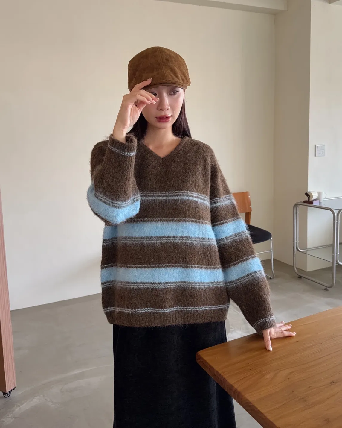 X0011配色好好看橫紋V領混毛毛衣(咖啡/深藍)