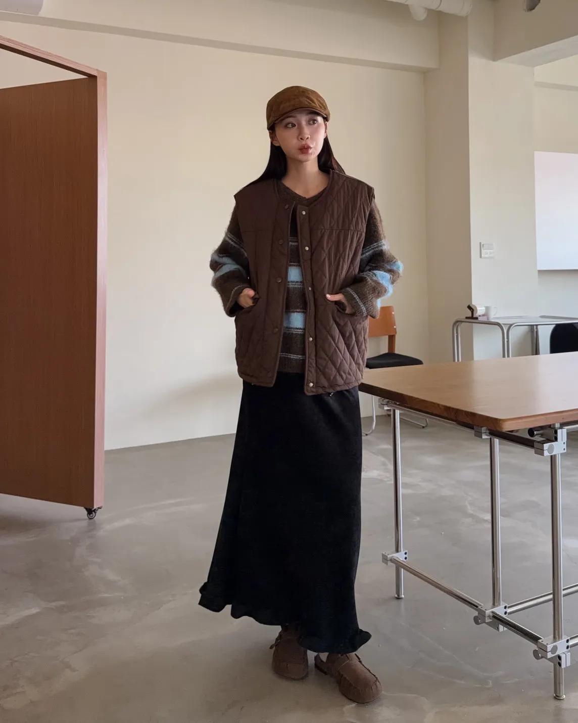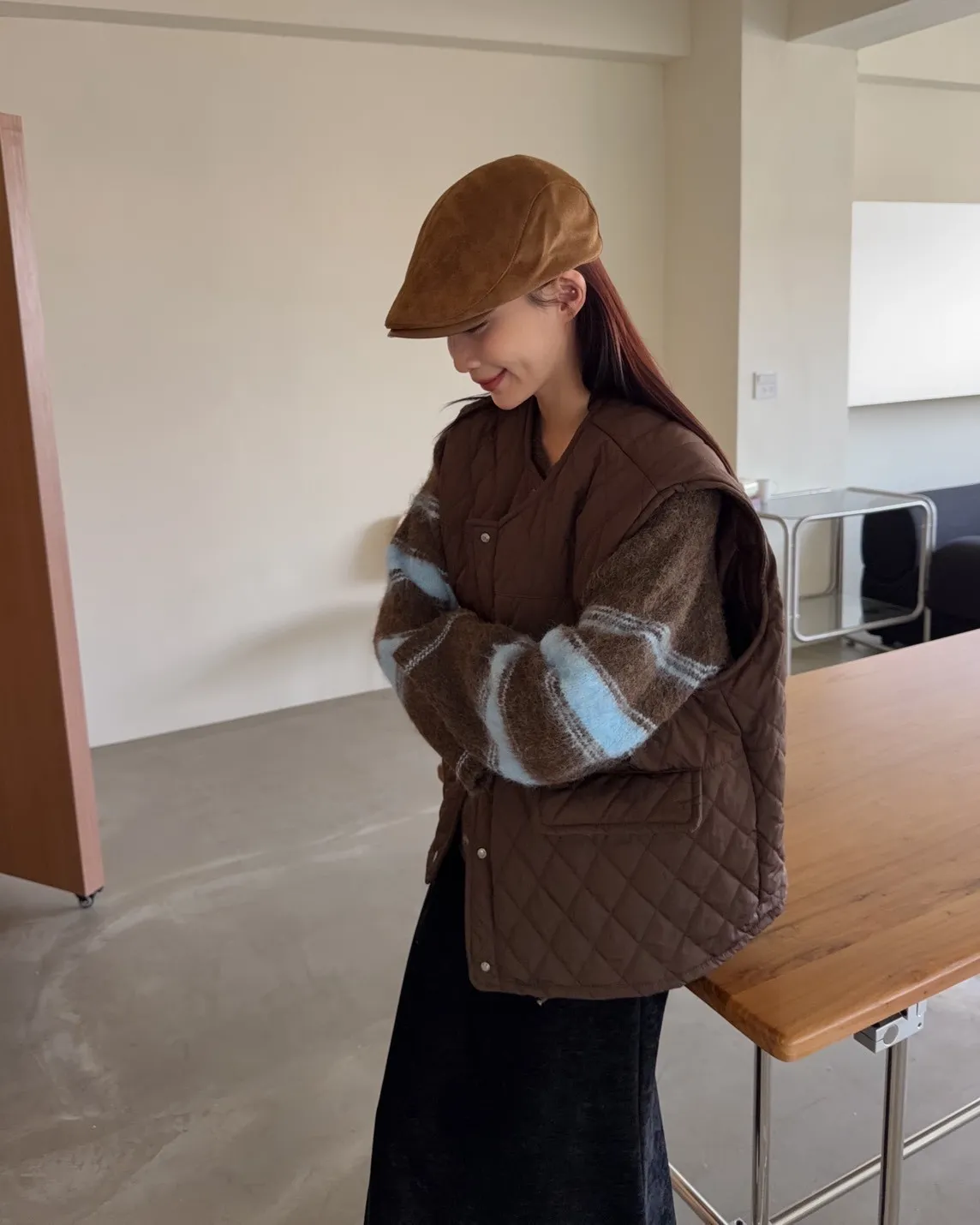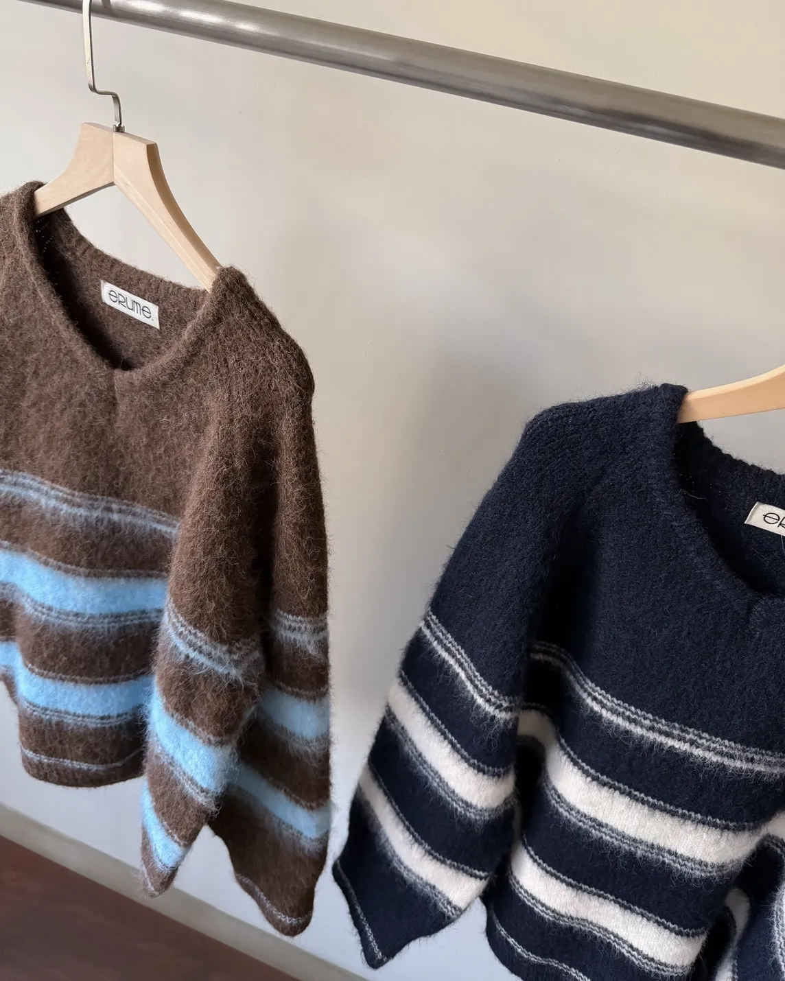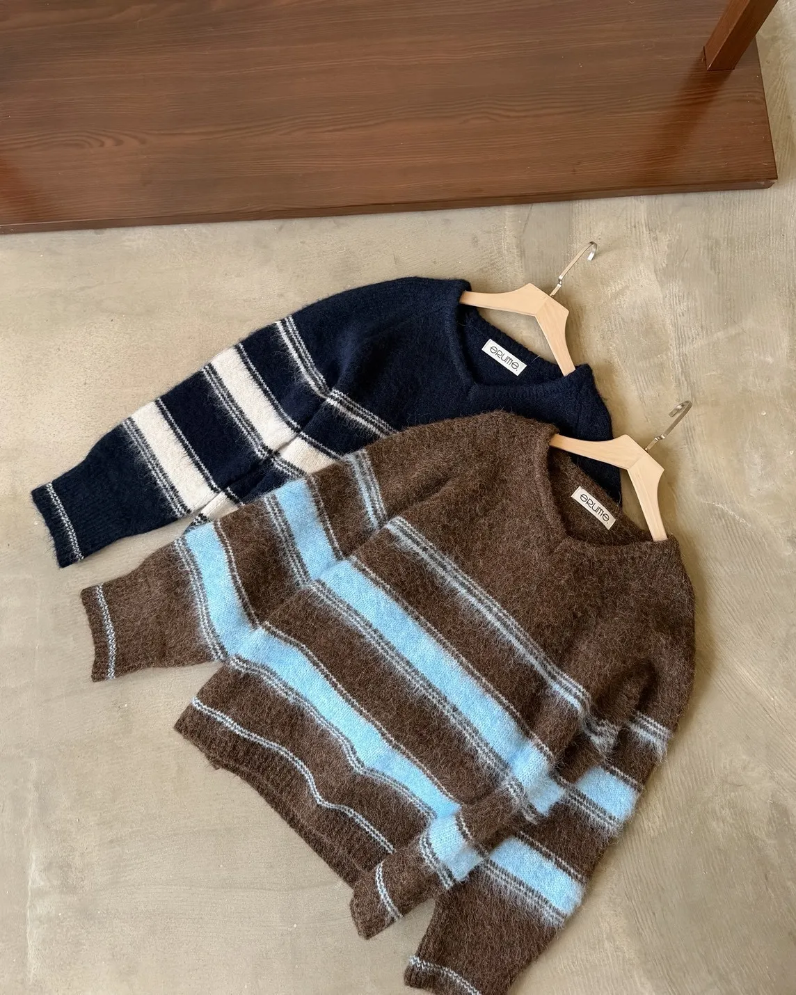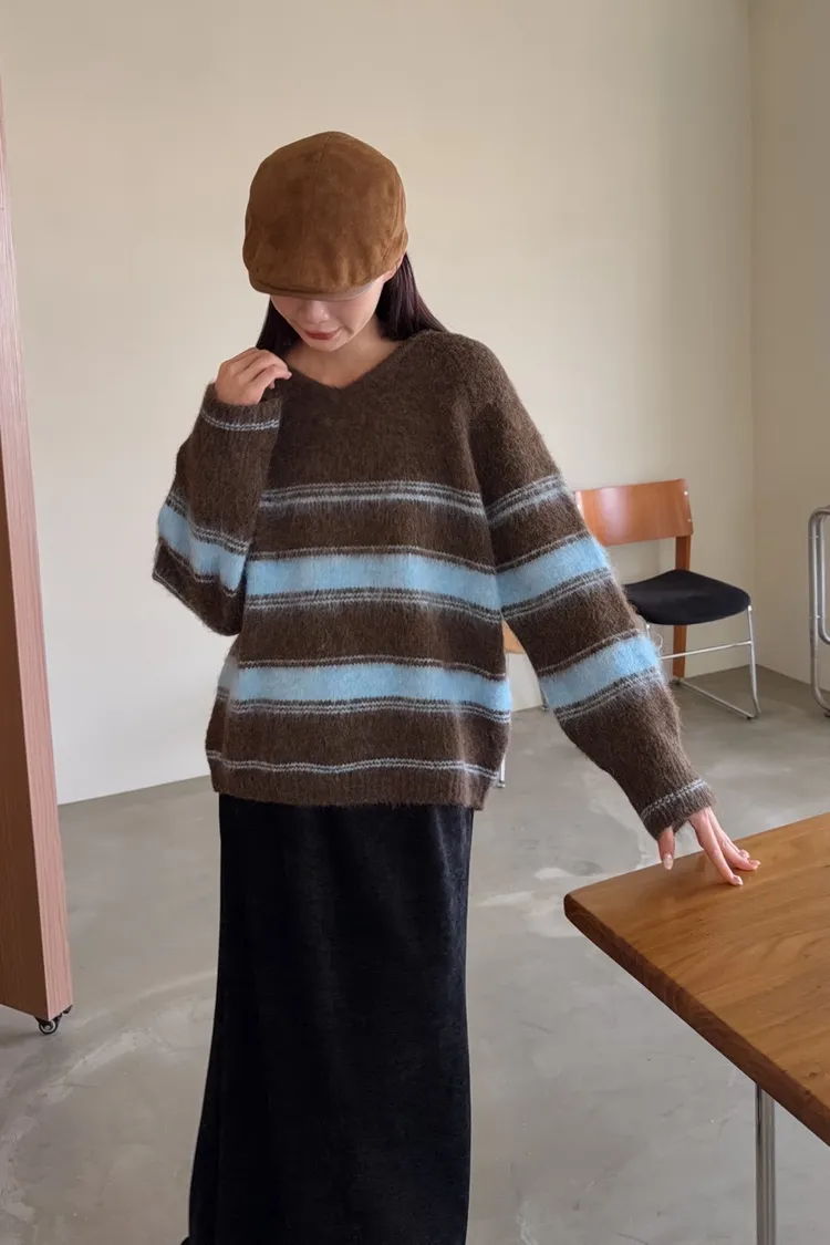 X0011配色好好看橫紋V領混毛毛衣(咖啡/深藍)