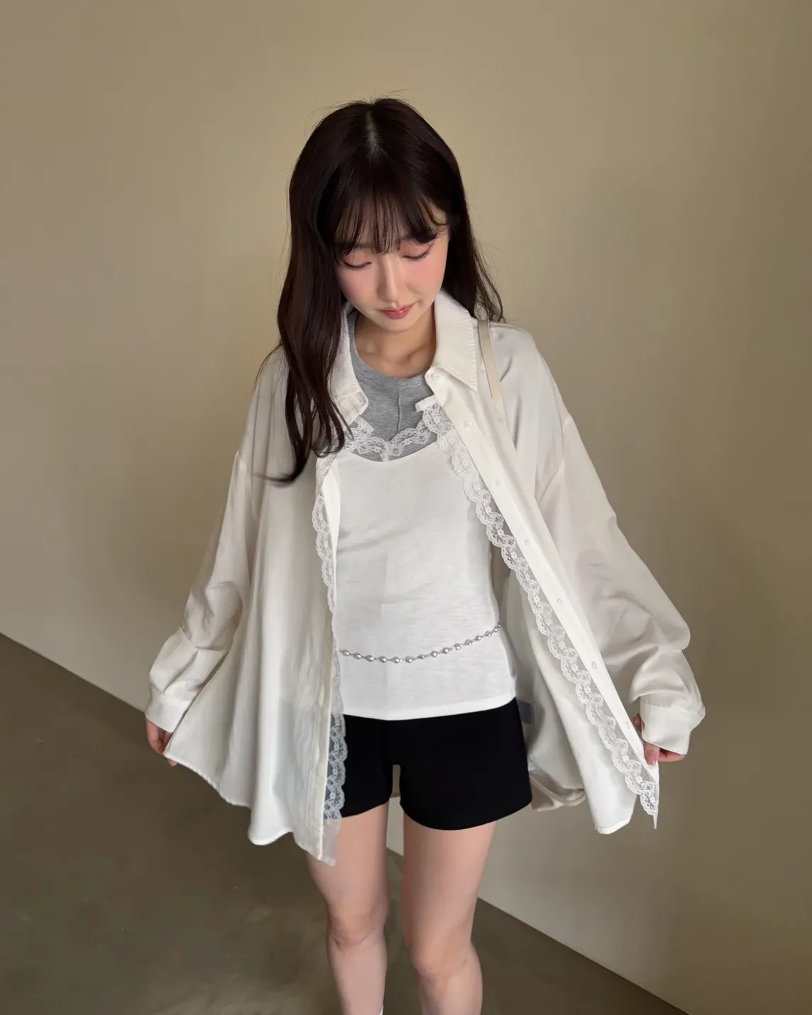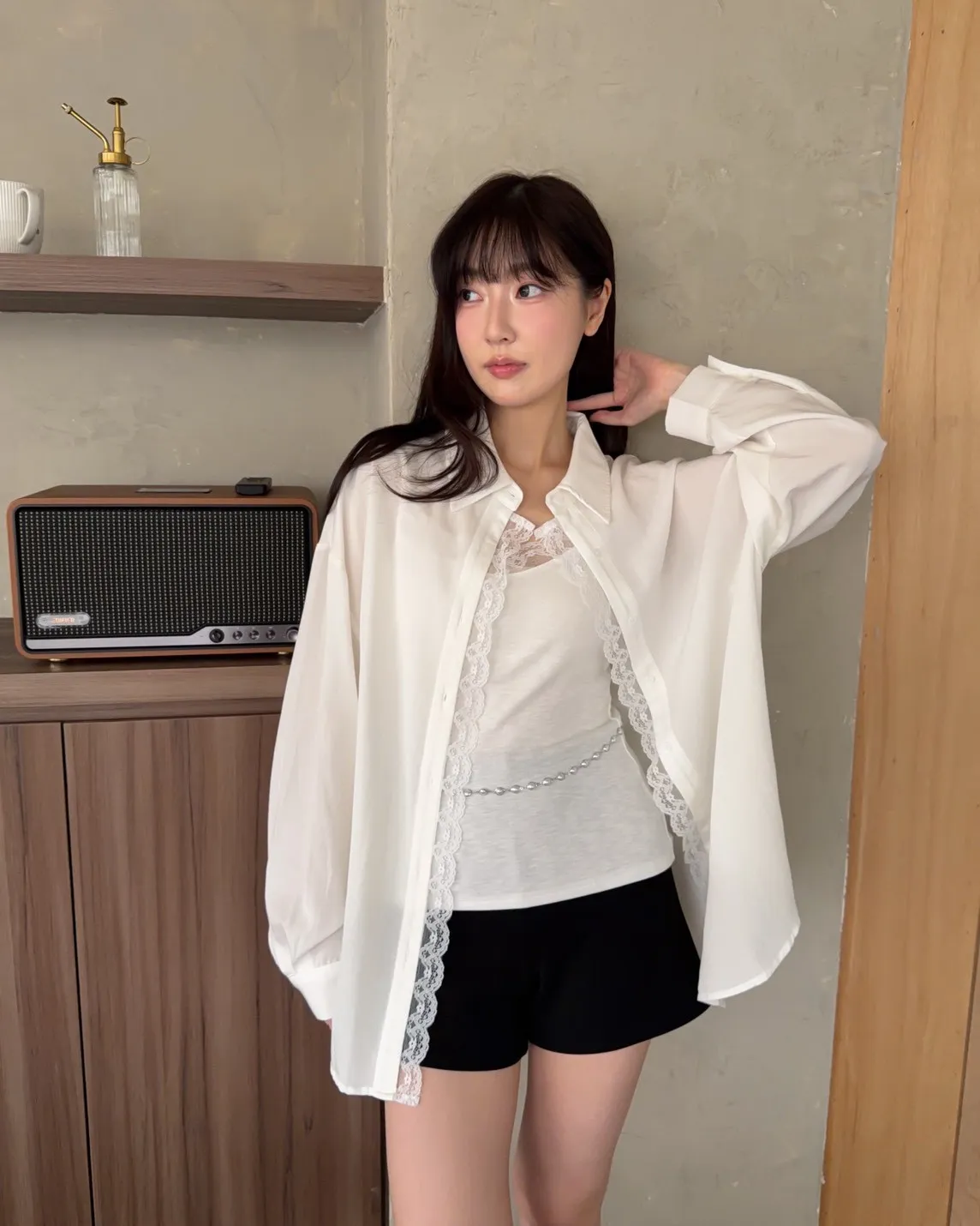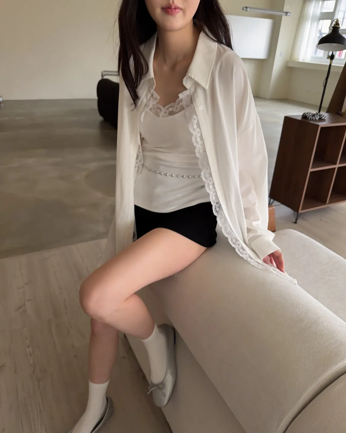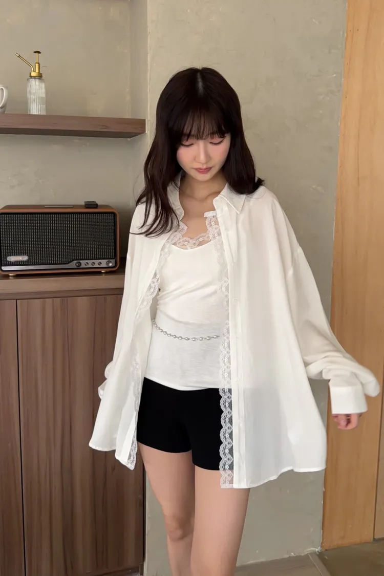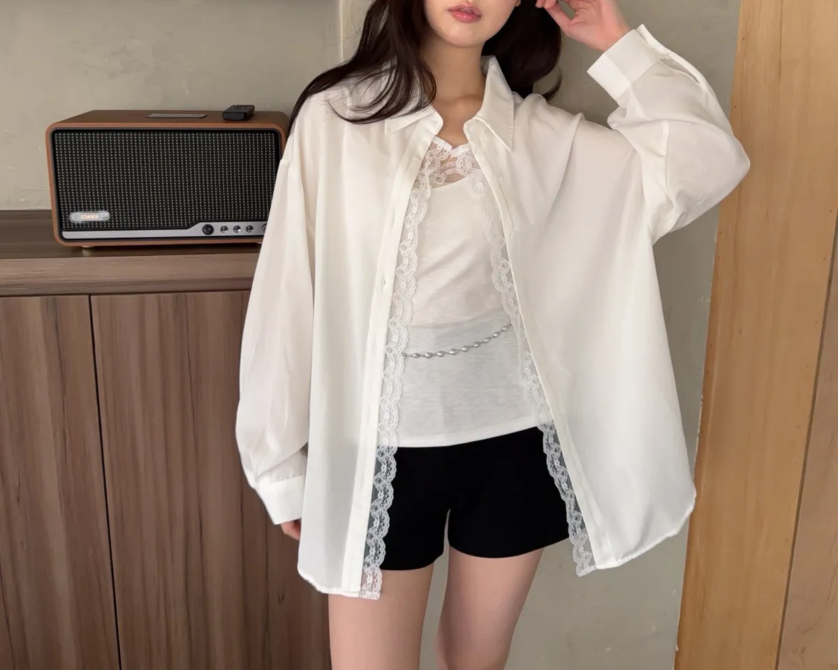 襯衫-寬鬆 前短後長 前面蕾絲滾邊 輕薄布料