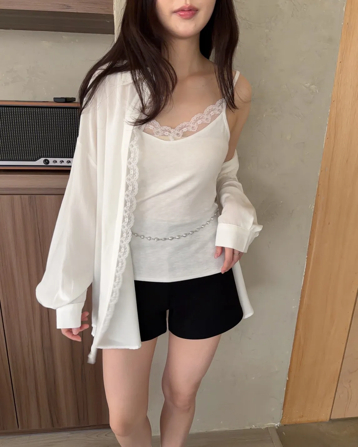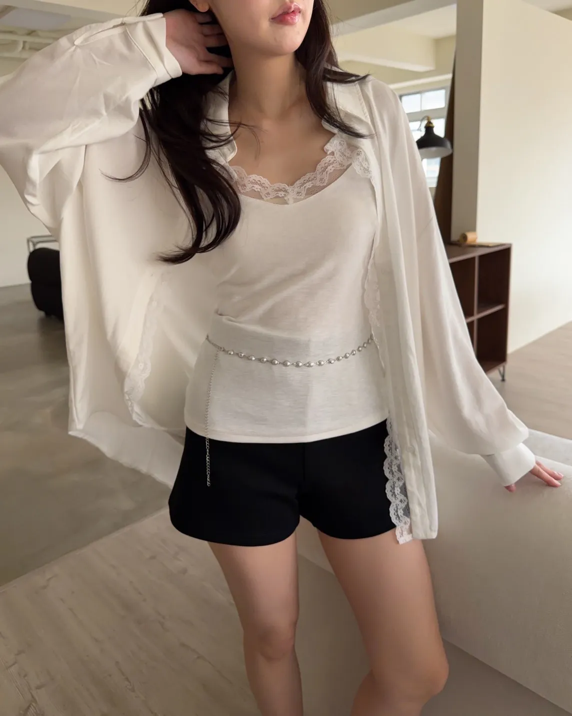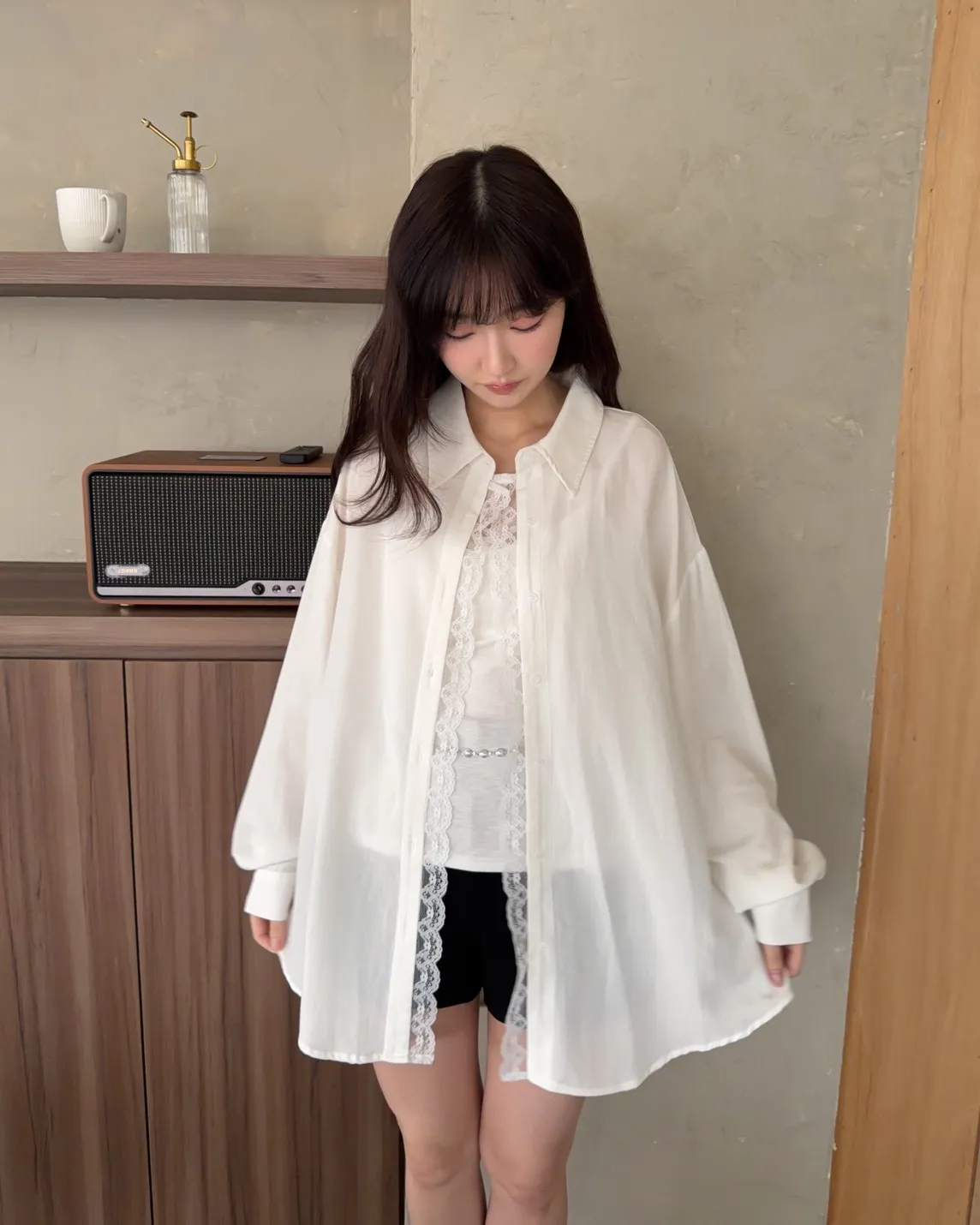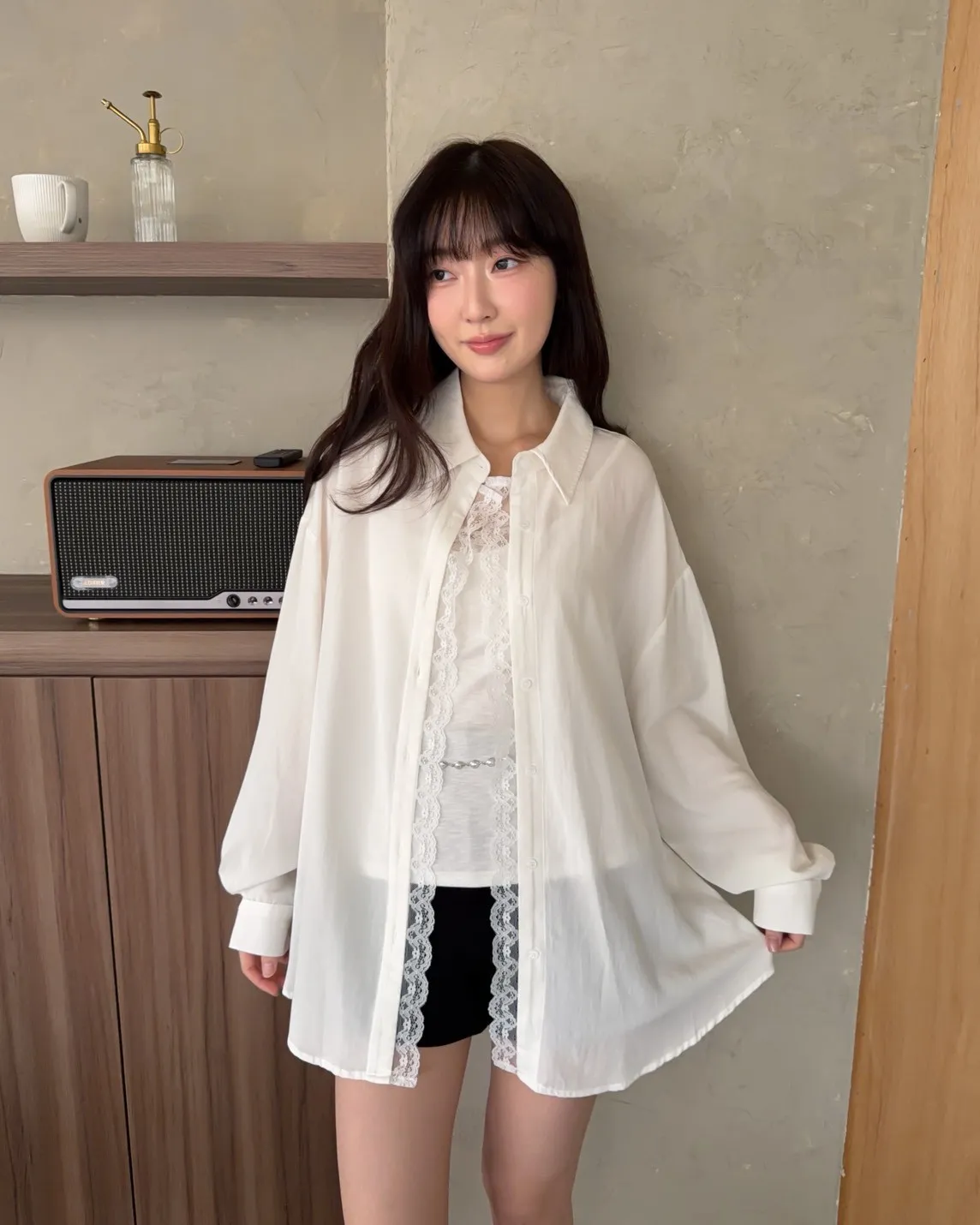 襯衫-寬鬆 前短後長 前面蕾絲滾邊 輕薄布料
