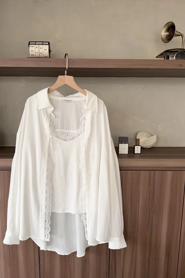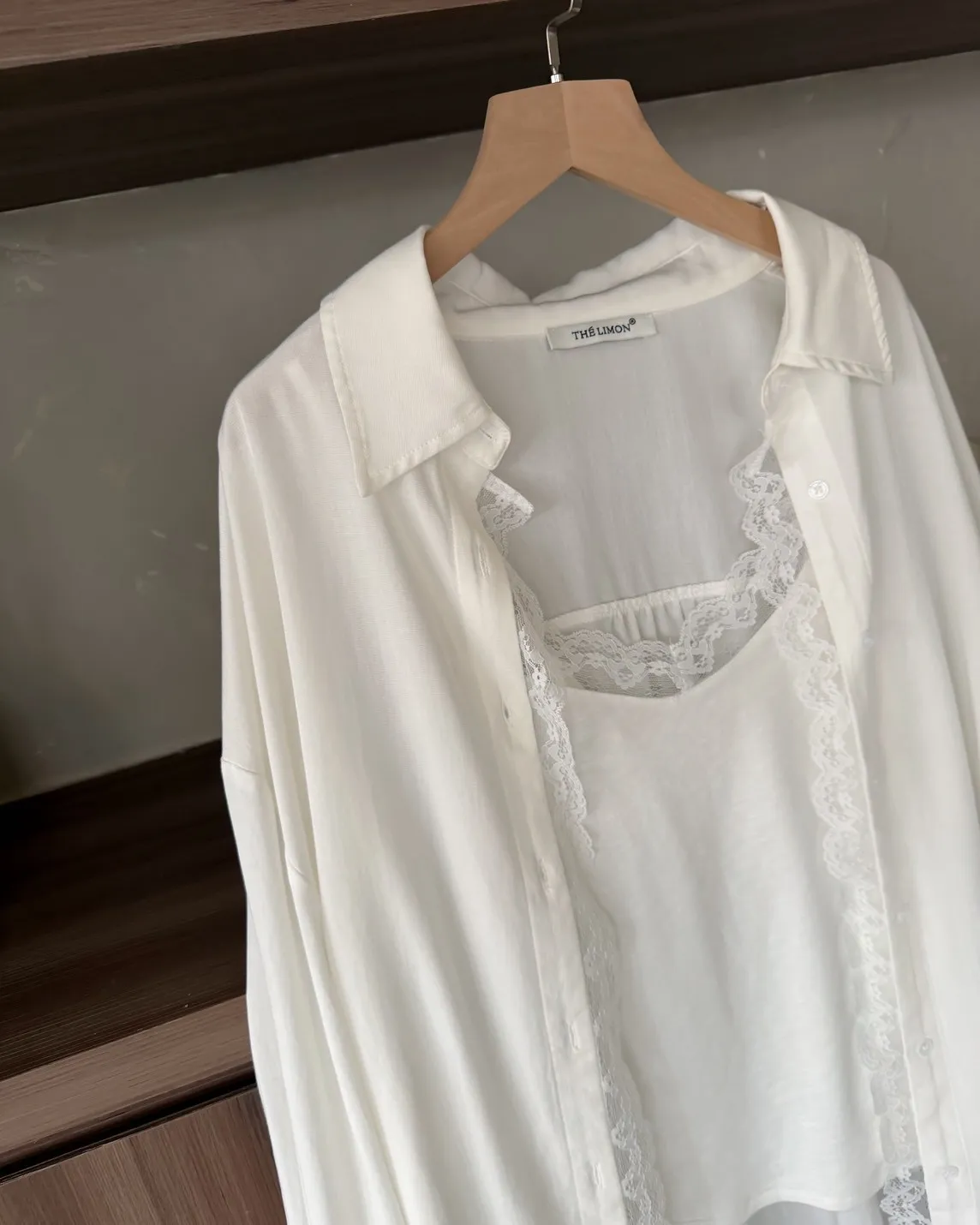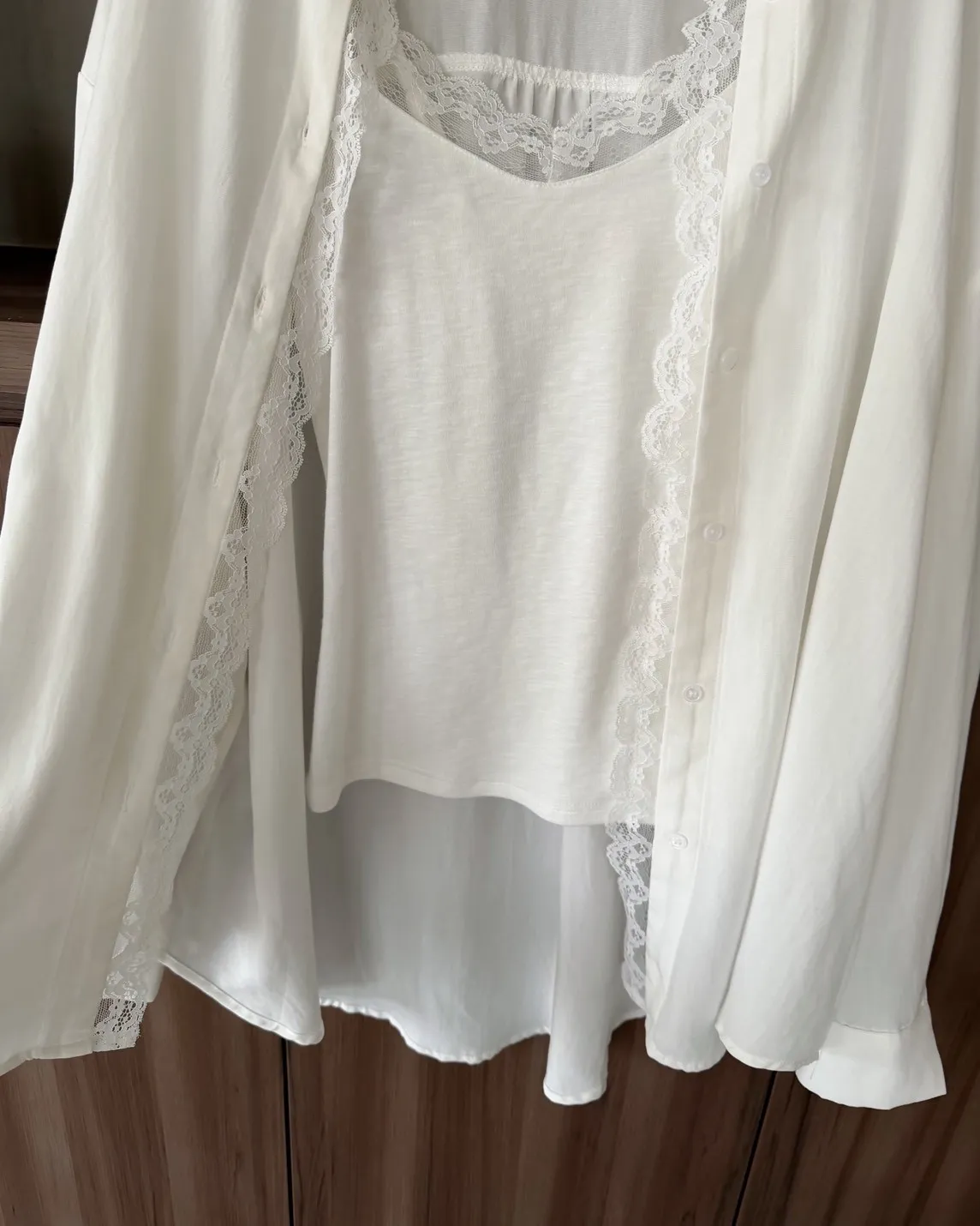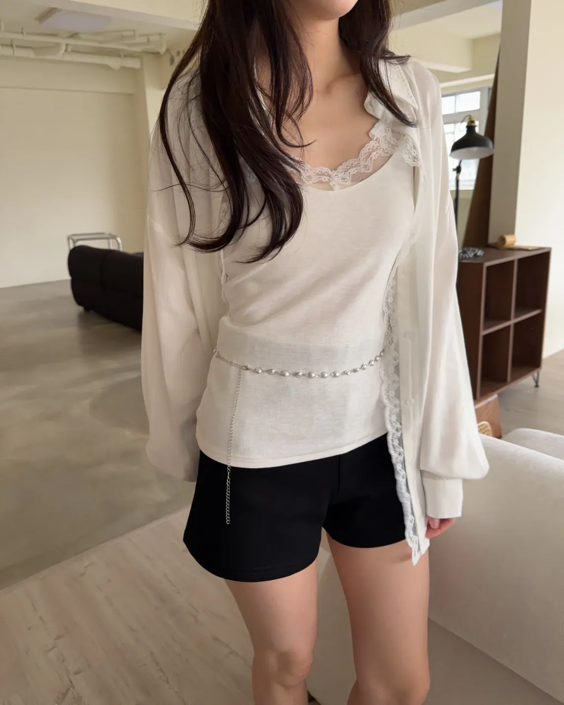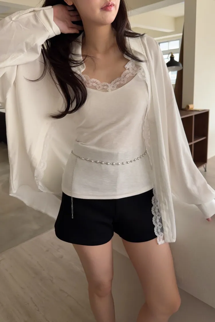 襯衫-寬鬆 前短後長 前面蕾絲滾邊 輕薄布料