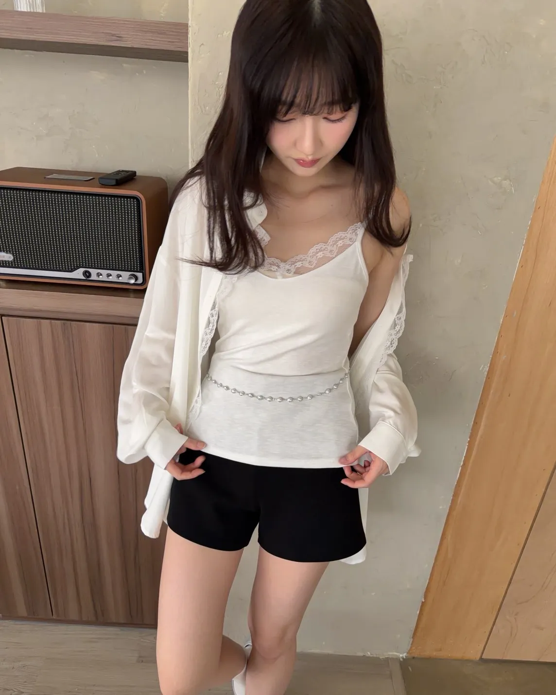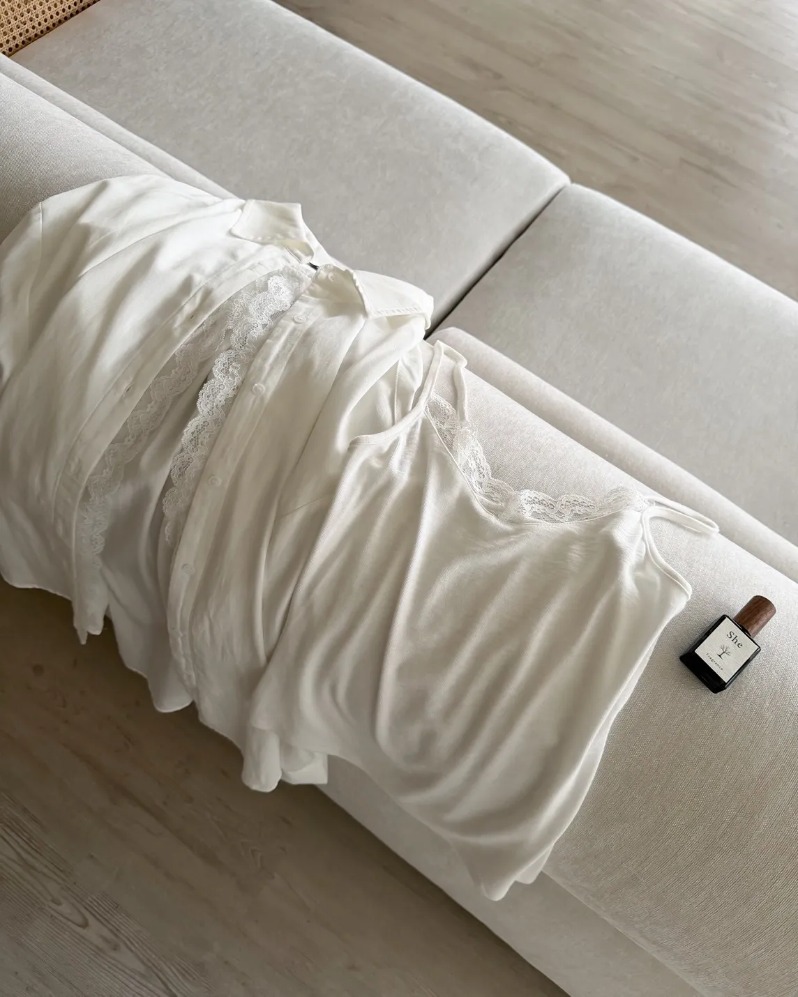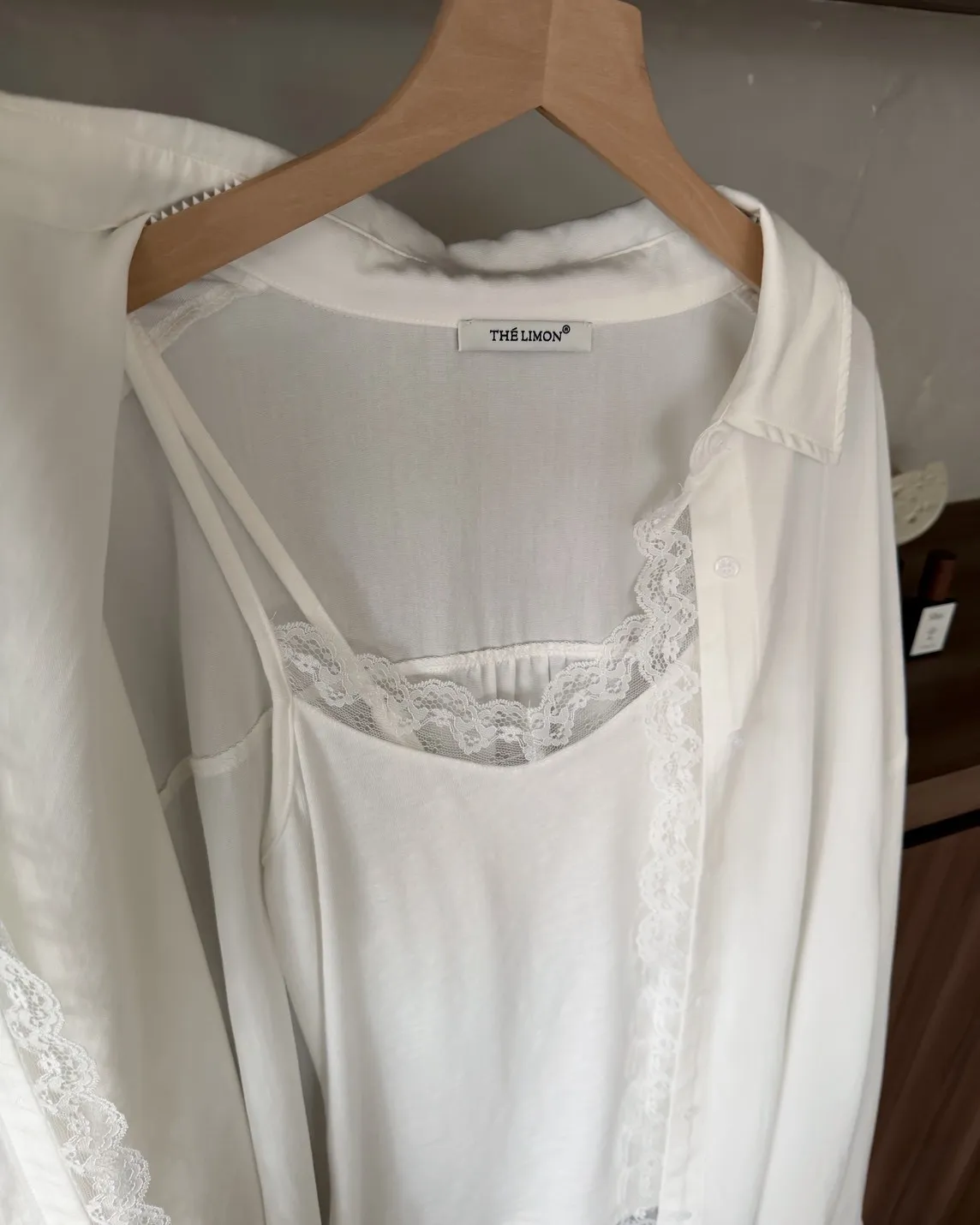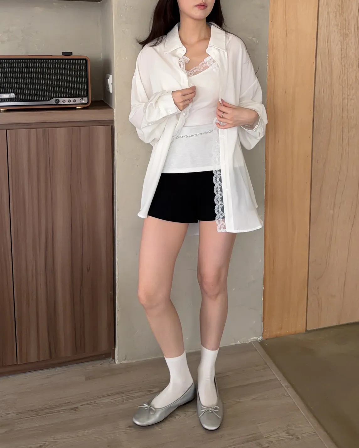 襯衫-寬鬆 前短後長 前面蕾絲滾邊 輕薄布料