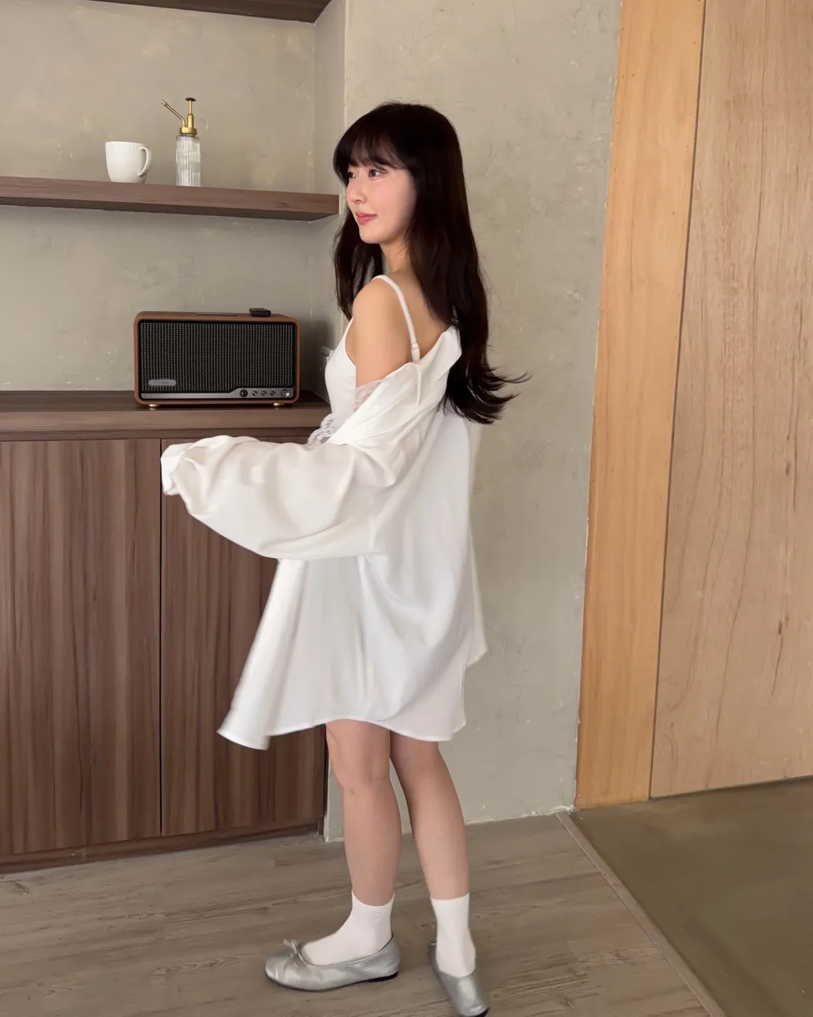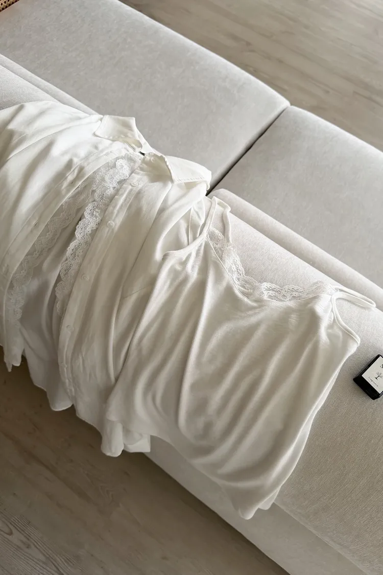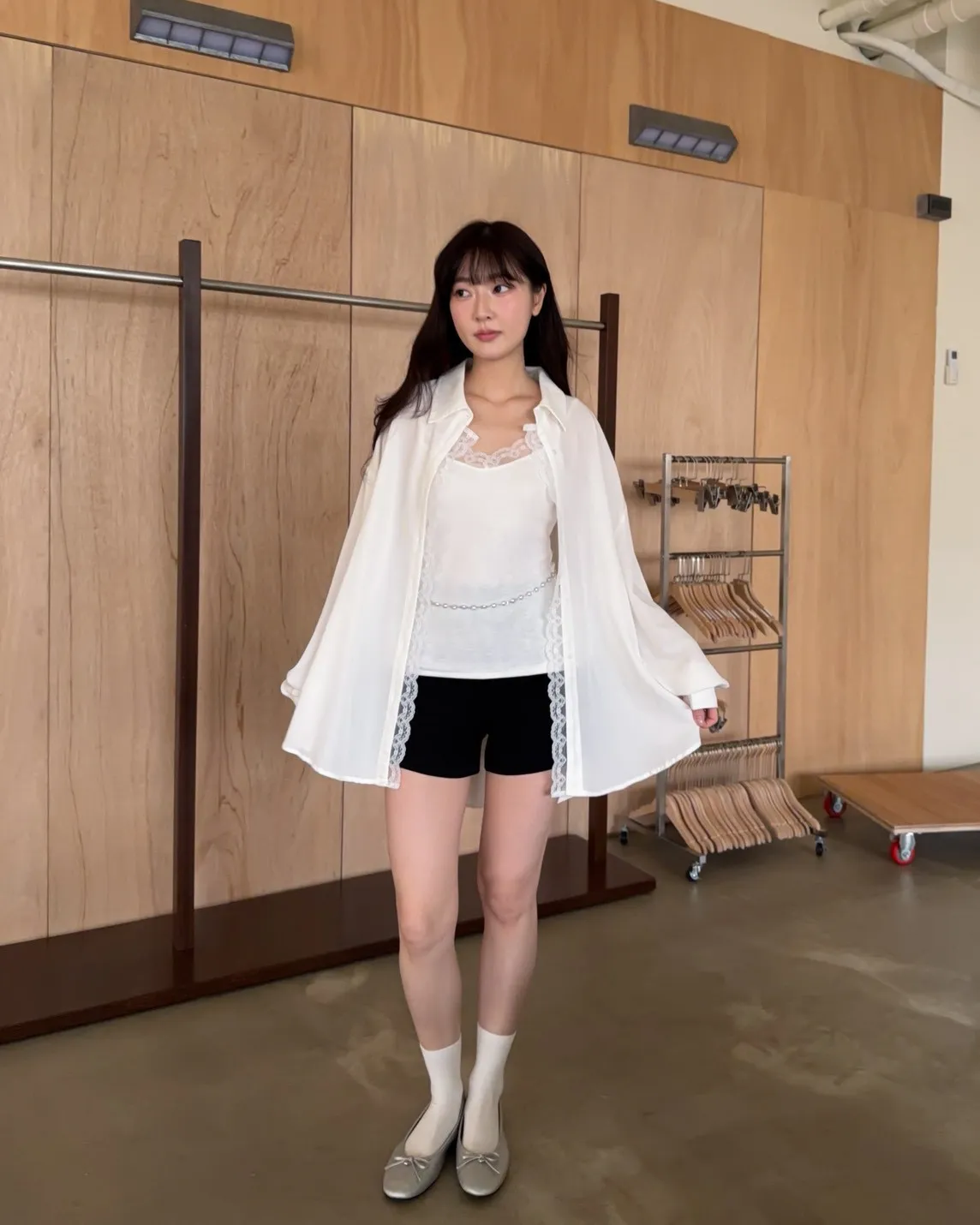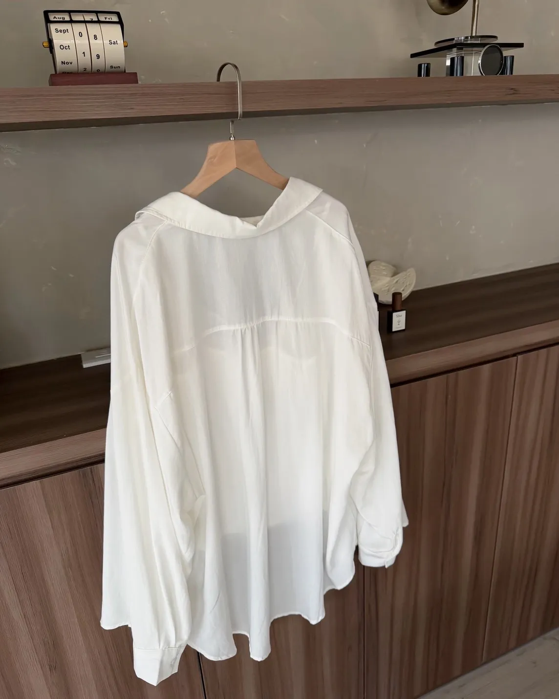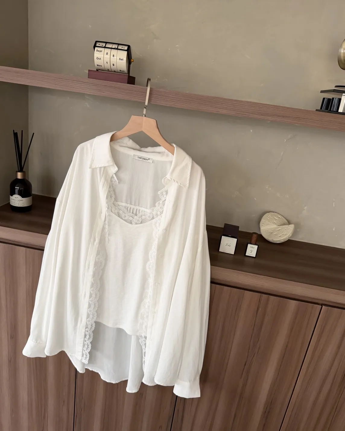 襯衫-寬鬆 前短後長 前面蕾絲滾邊 輕薄布料