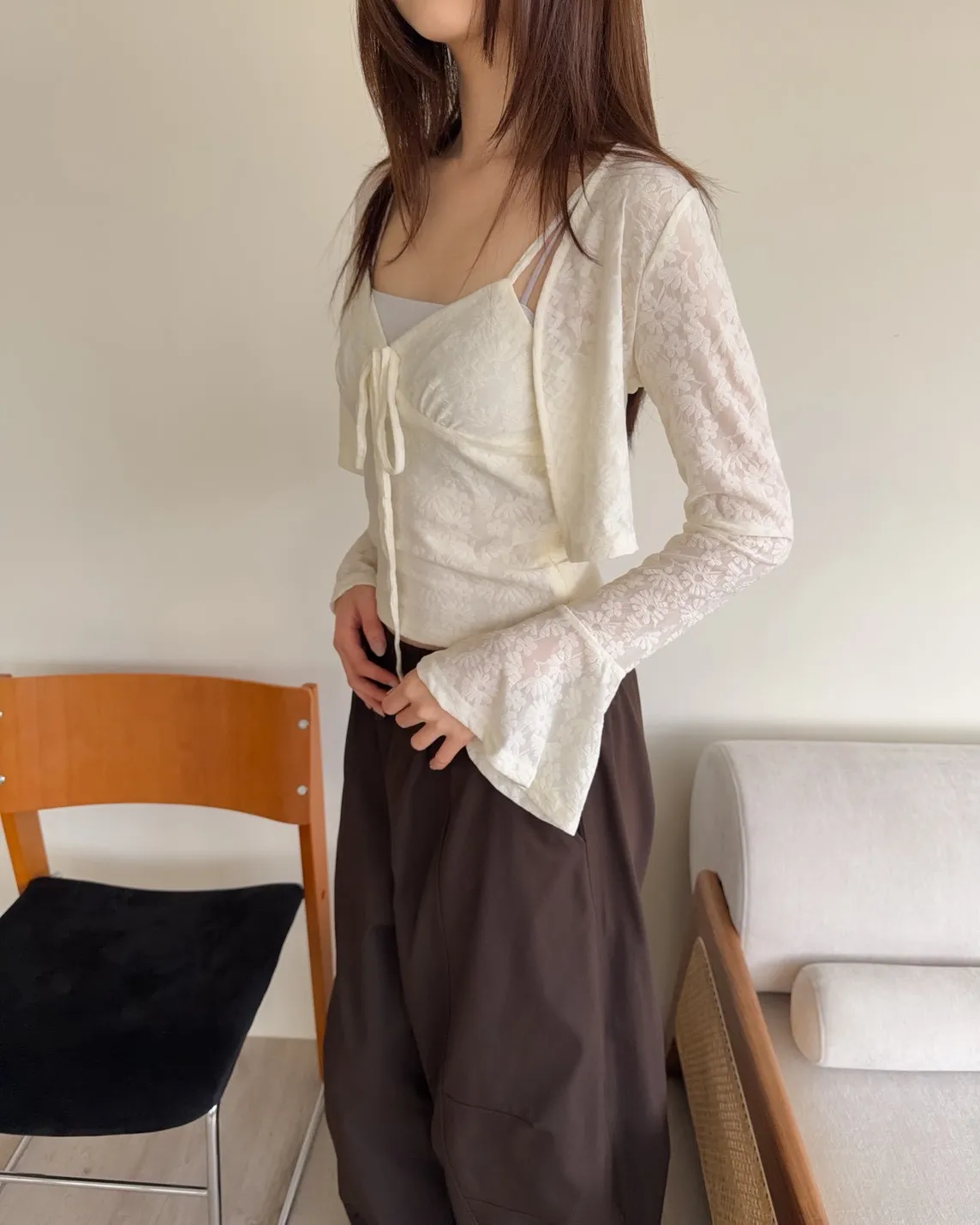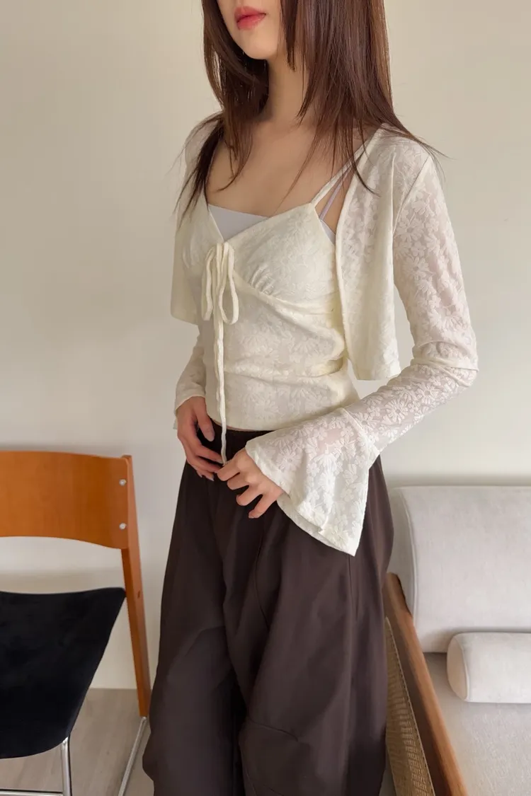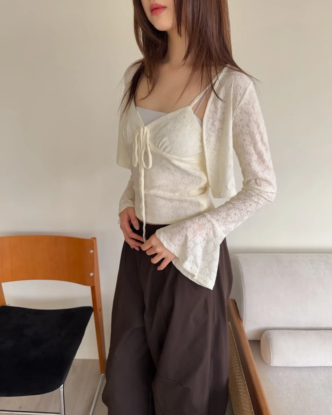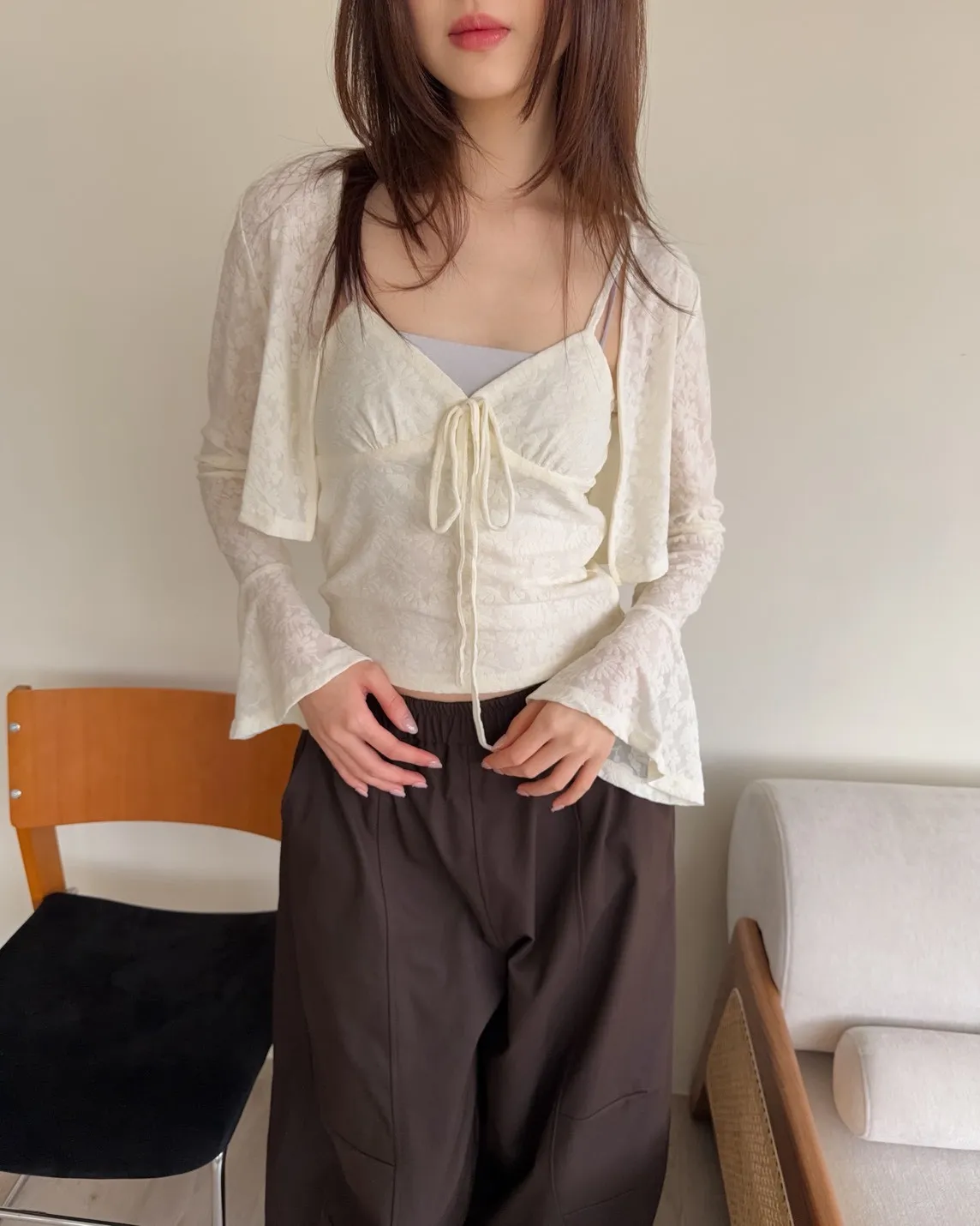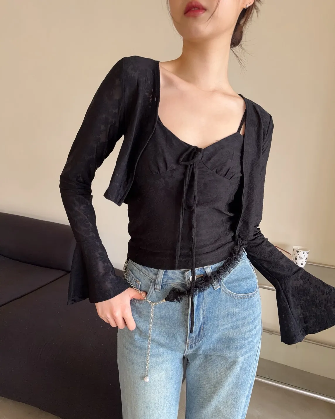 A0001(SET)心花開小背心+短版喇叭袖外套(白/米/黑)