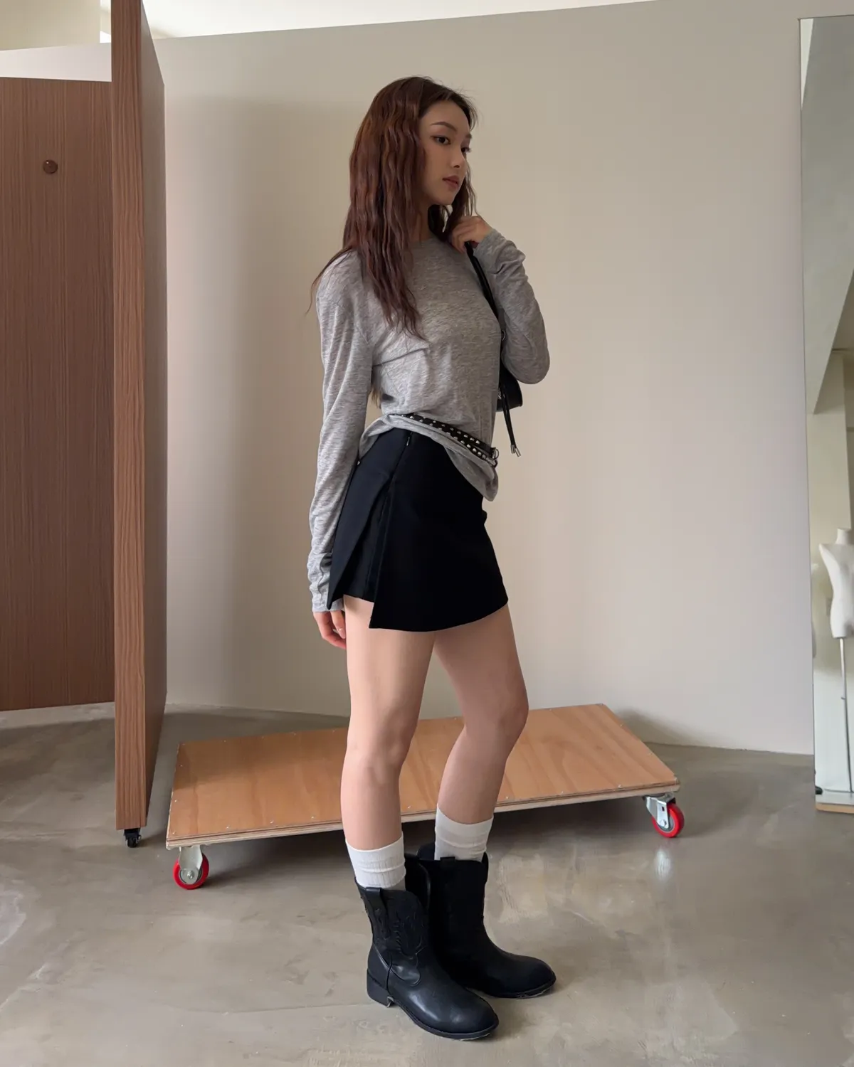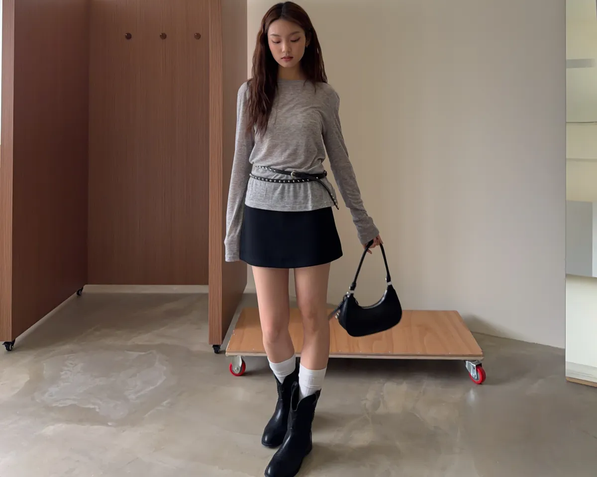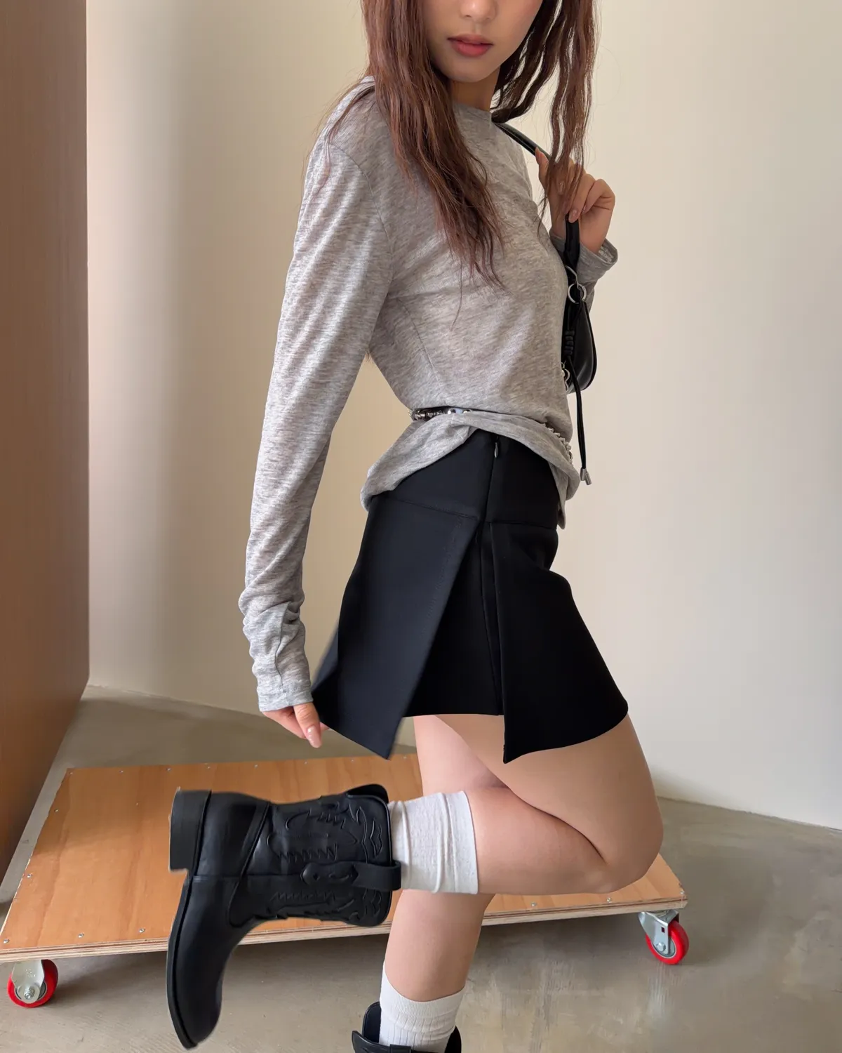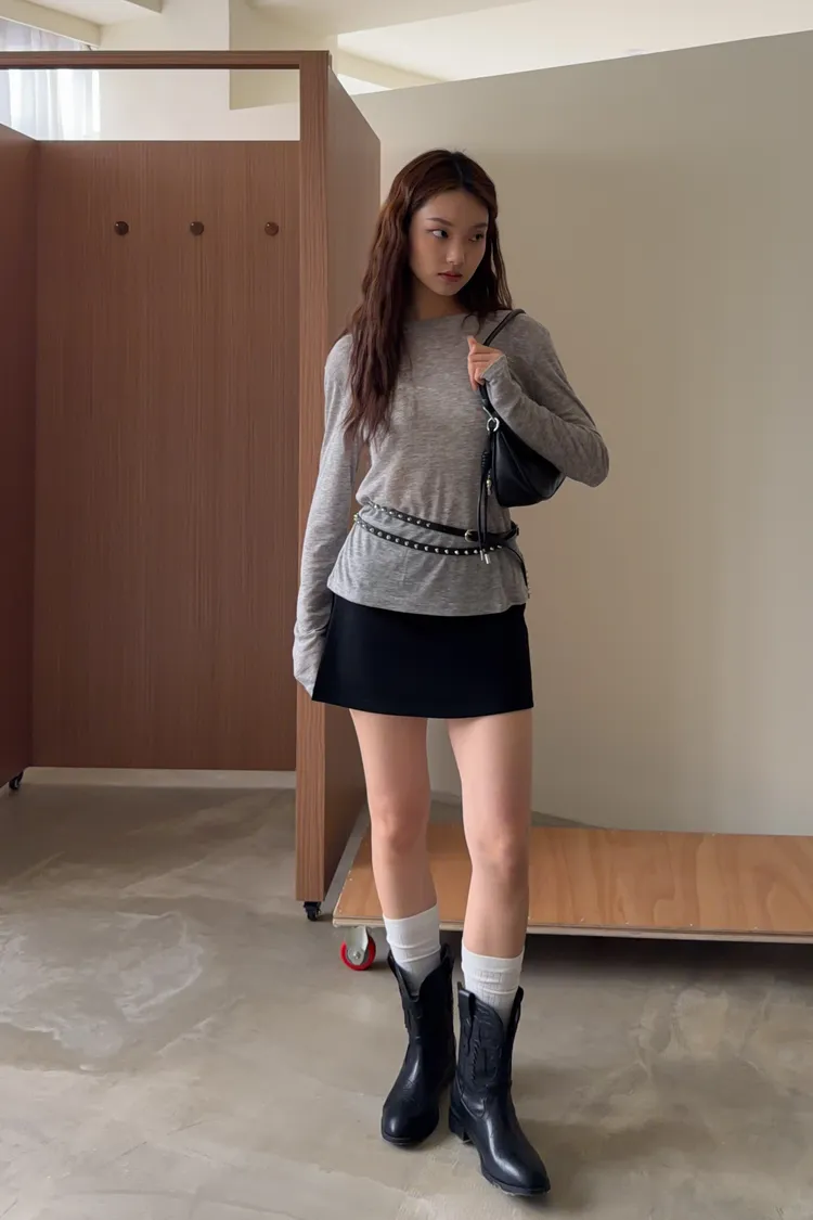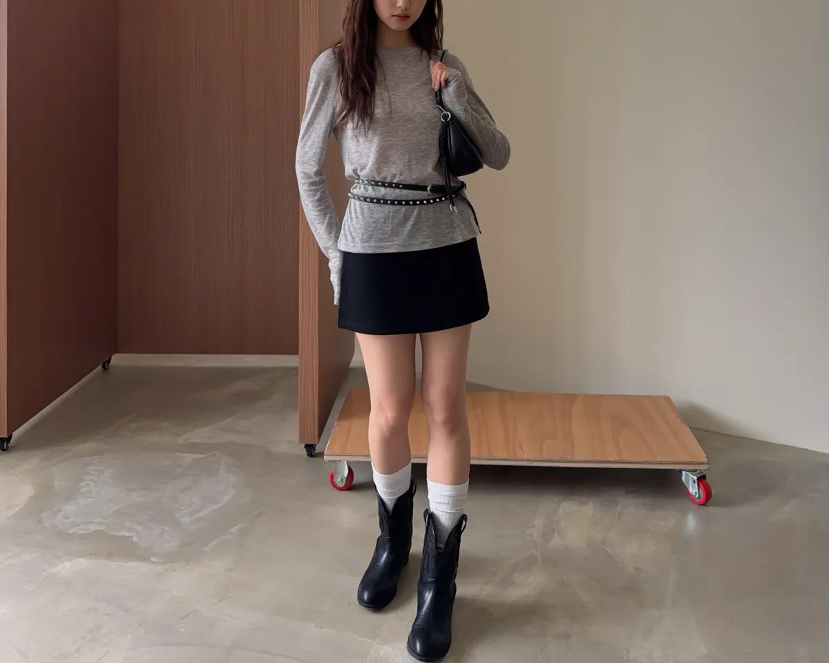 B0031側開衩棉短褲裙(灰/黑)