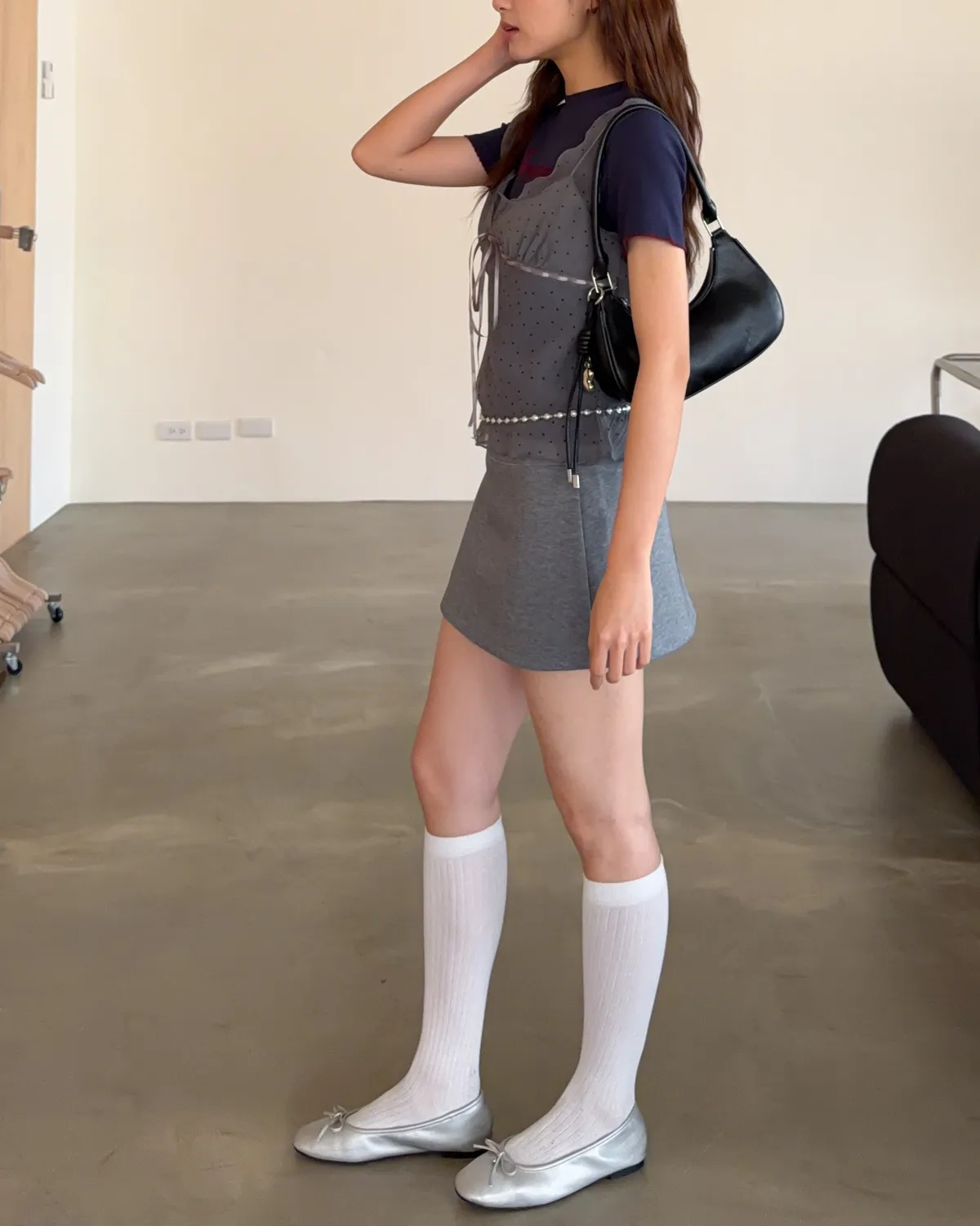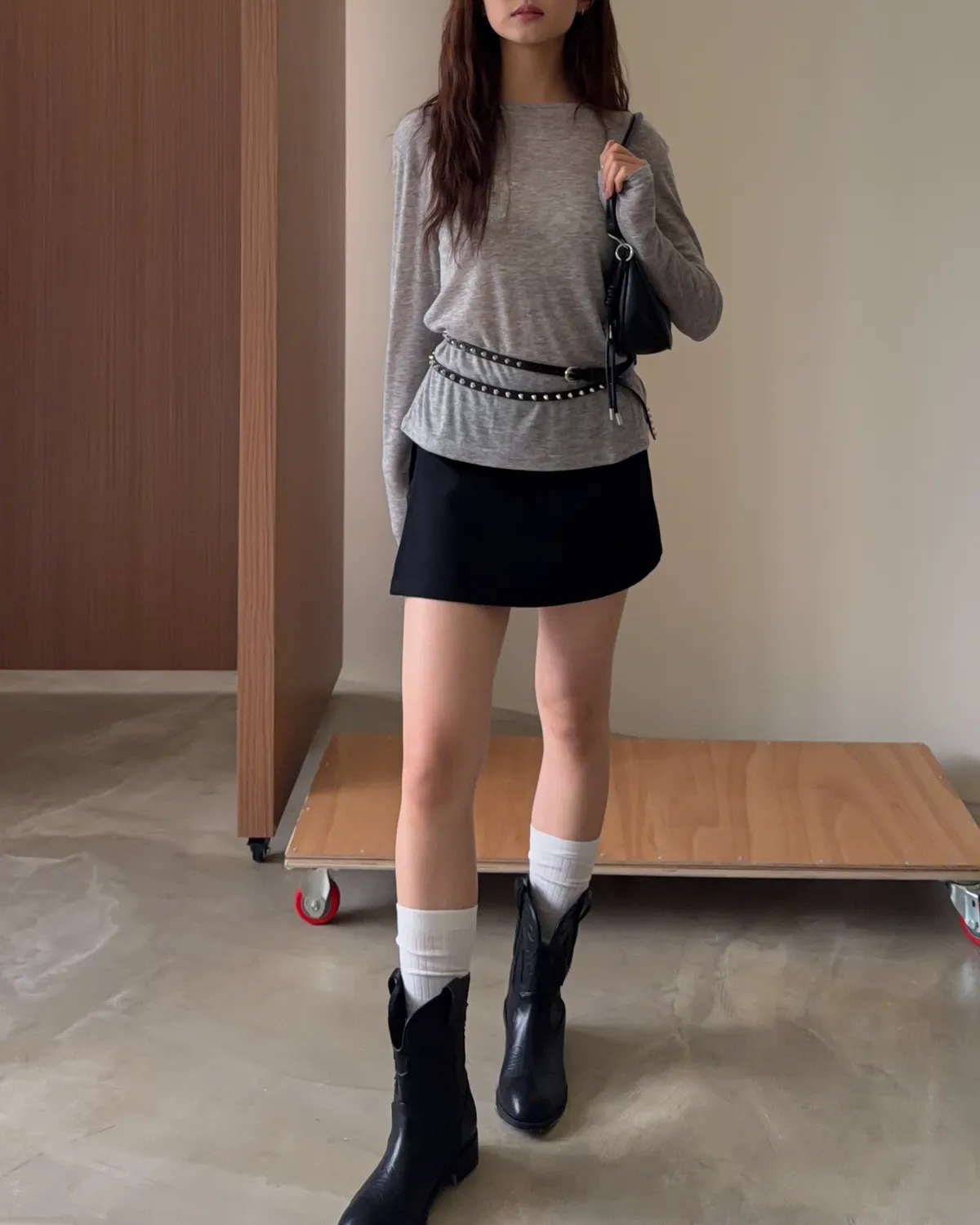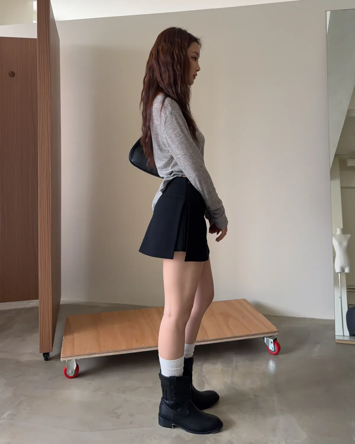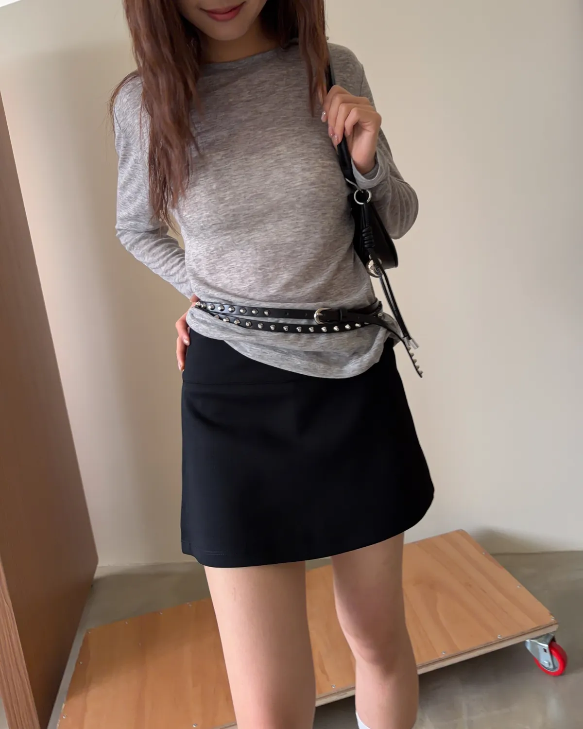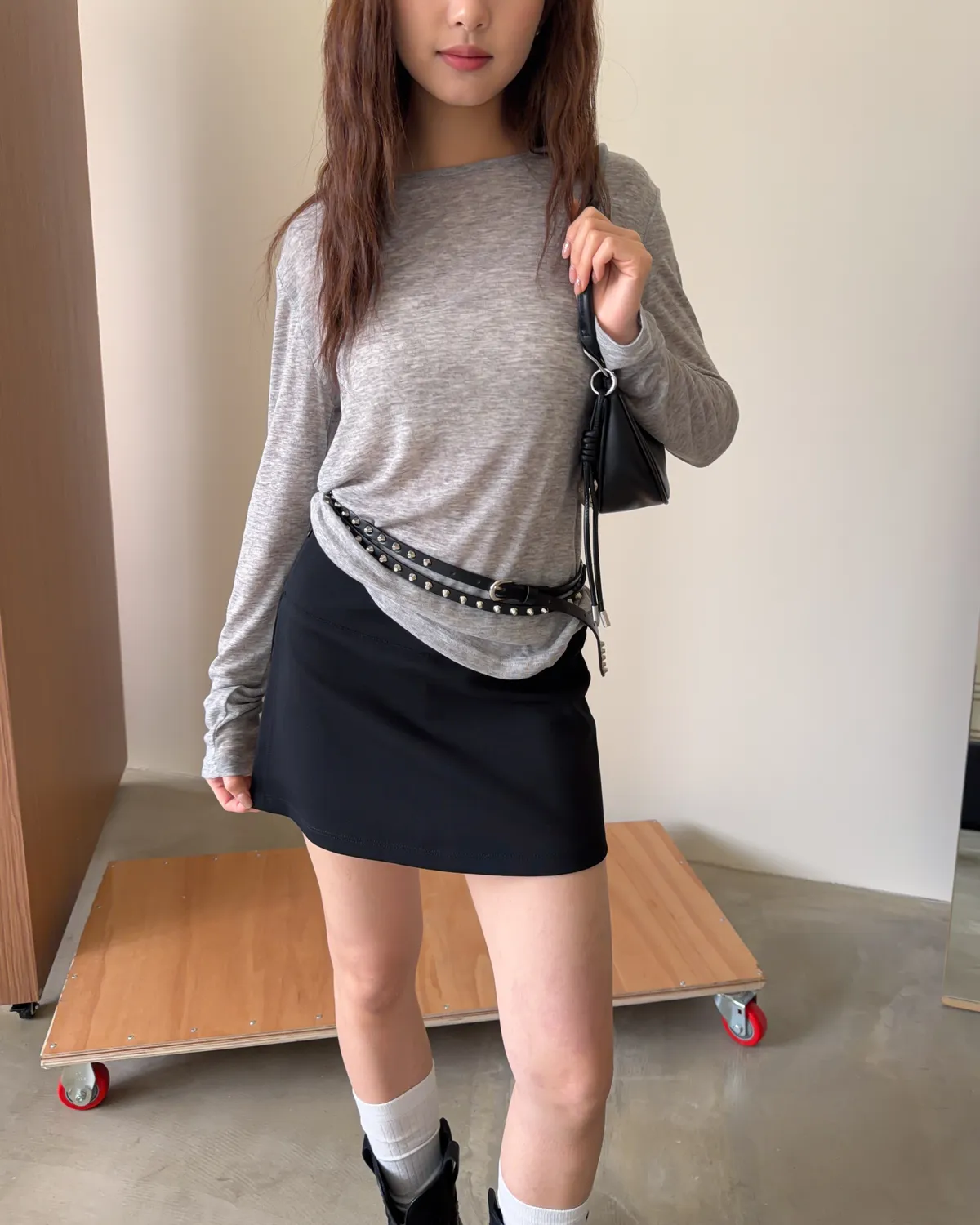 B0031側開衩棉短褲裙(灰/黑)