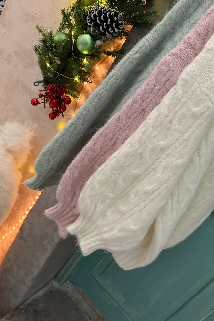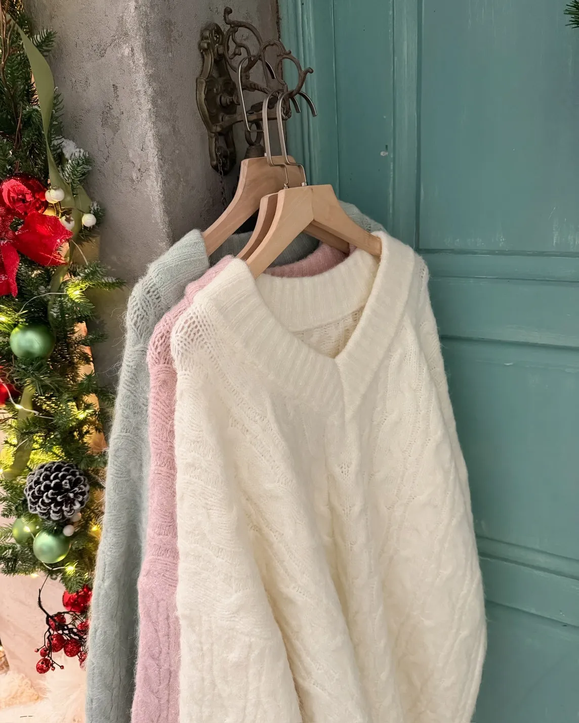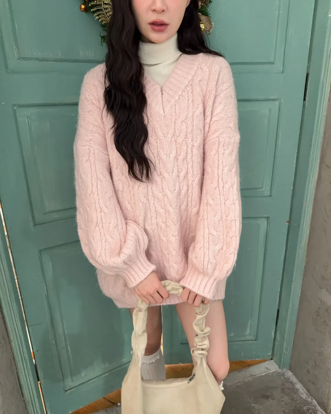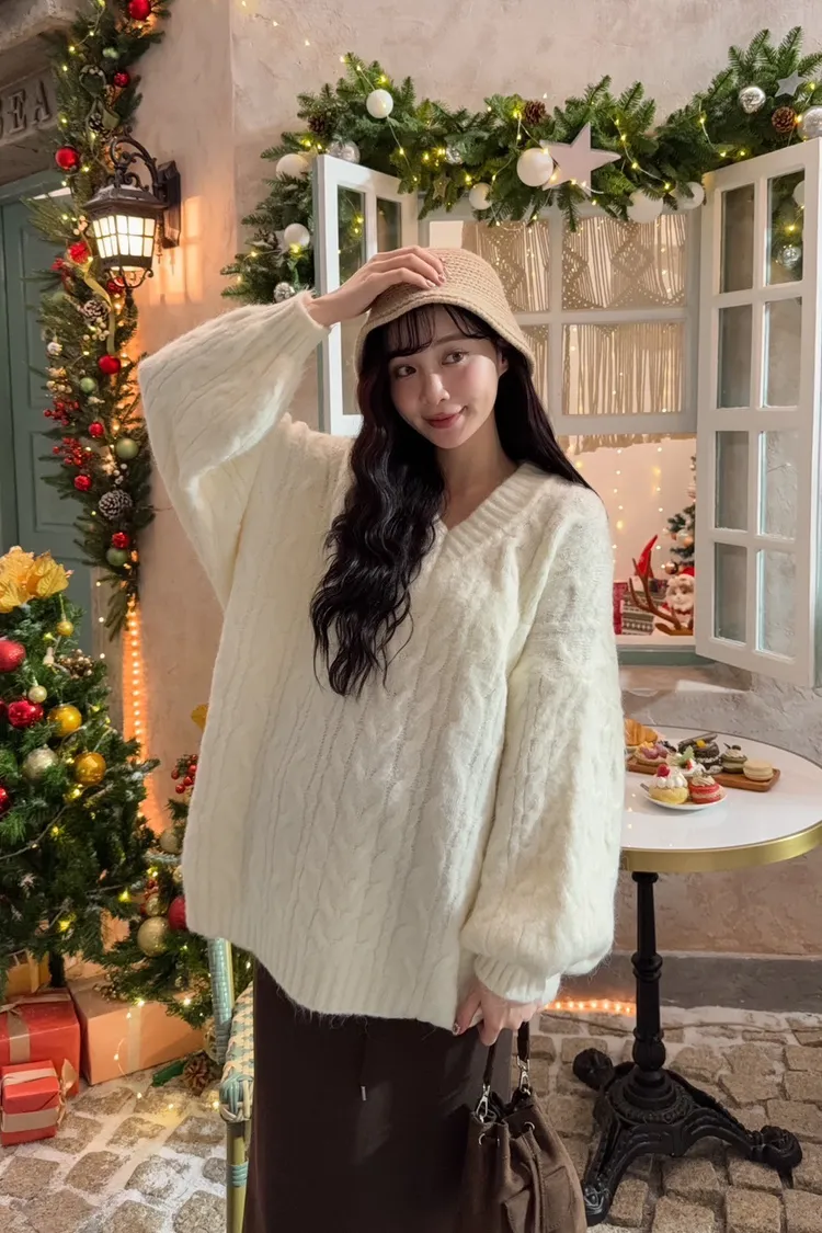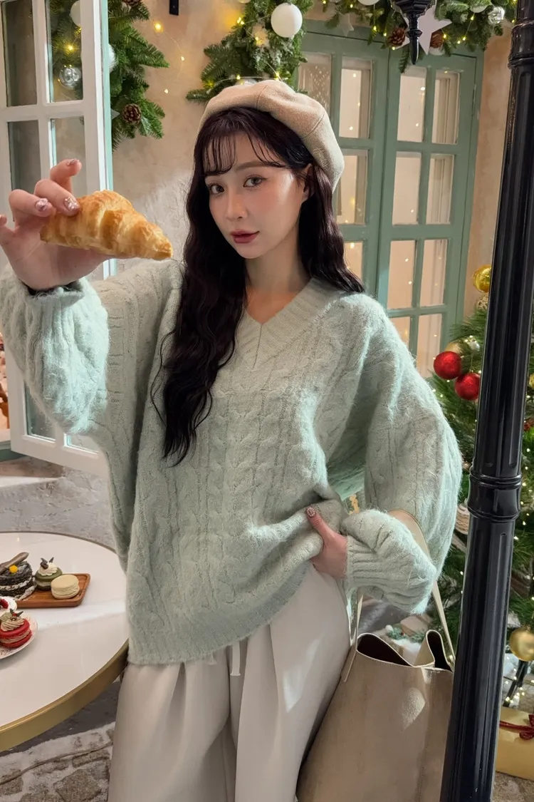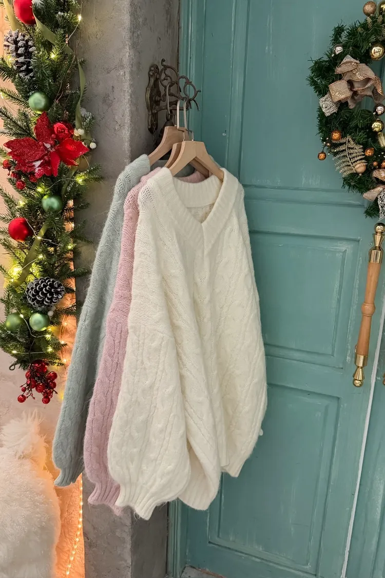X0062酸甜初戀大件V領麻花毛衣(米白/粉紅/淡綠)