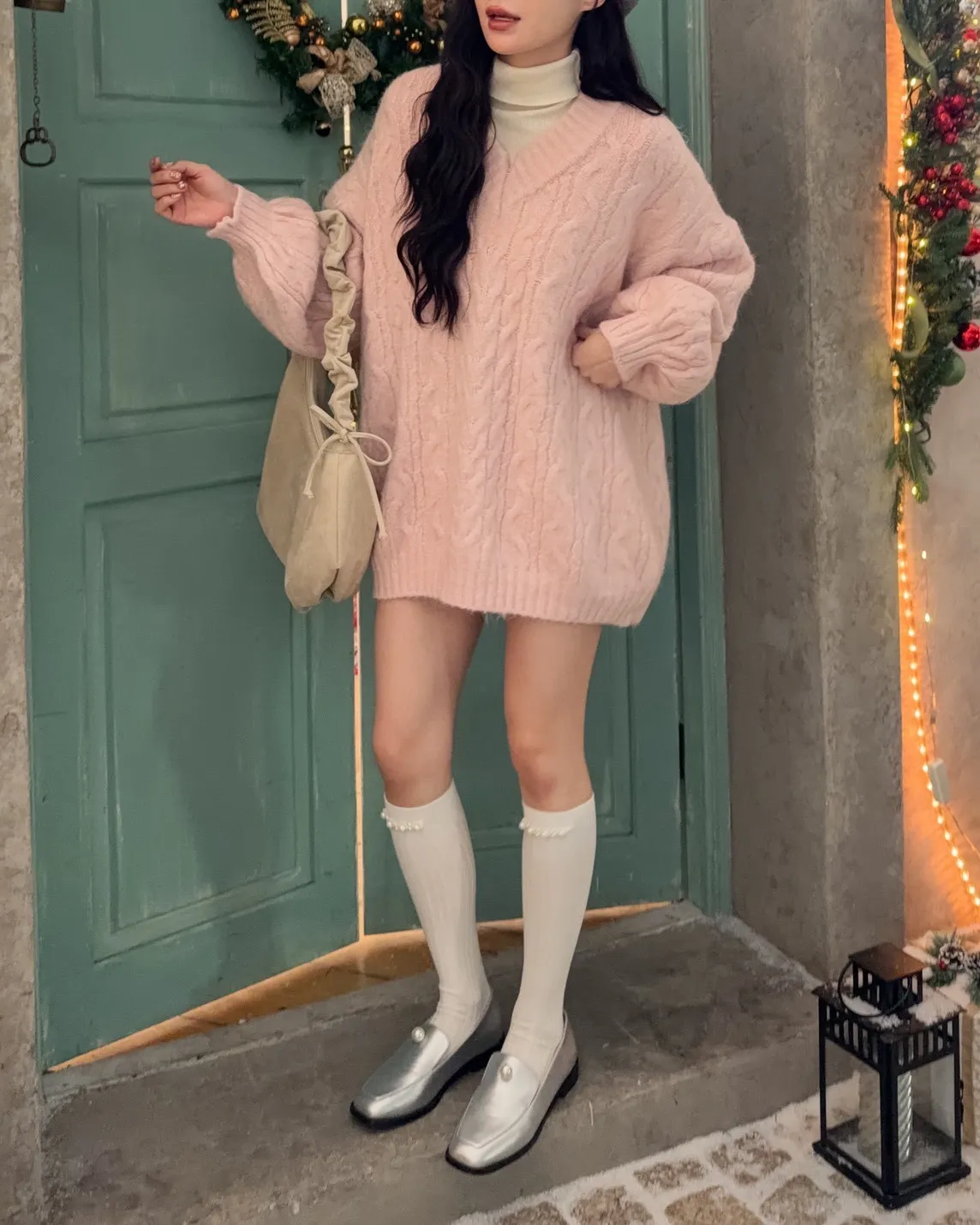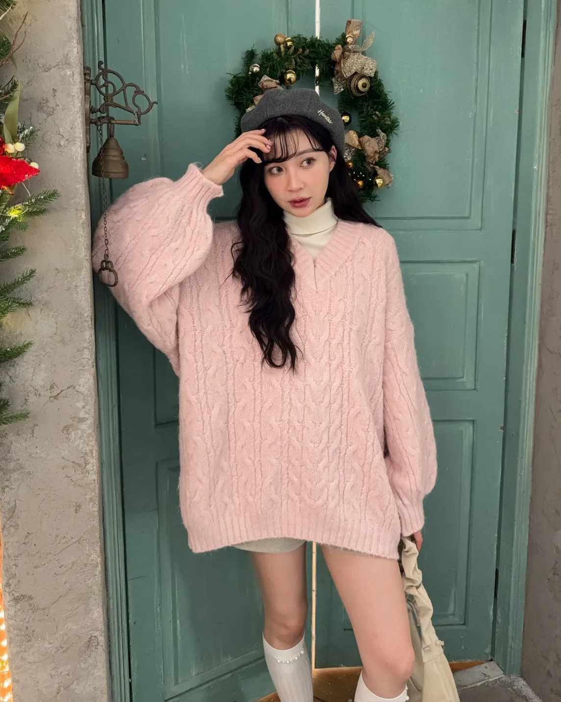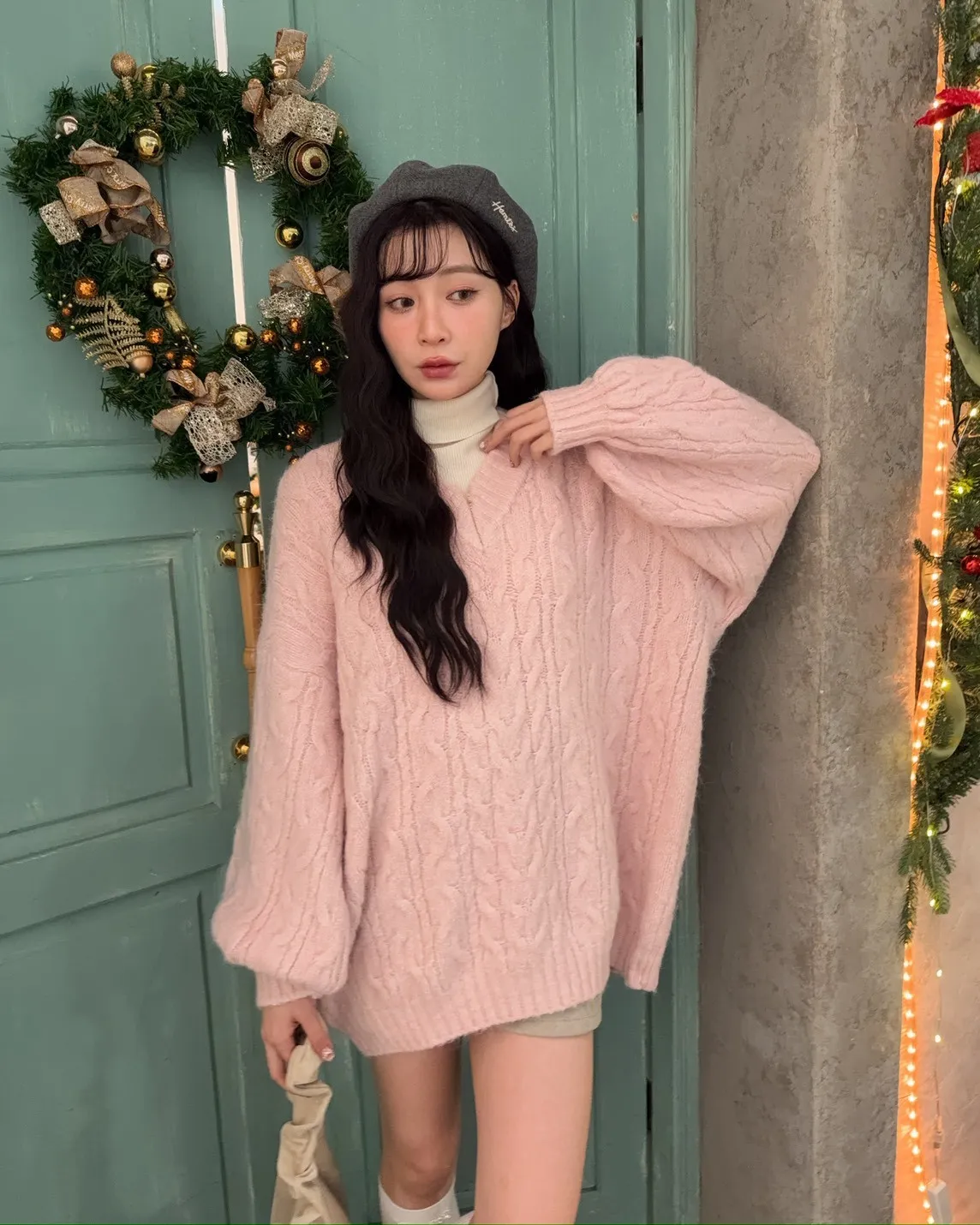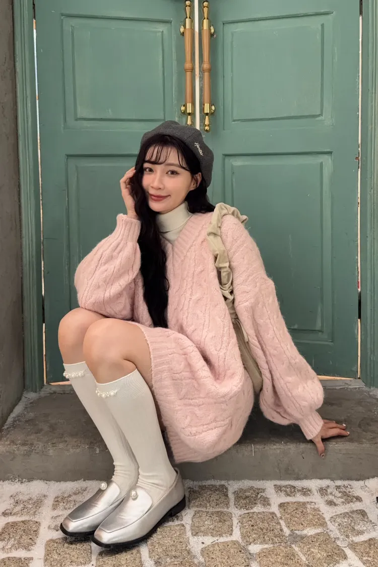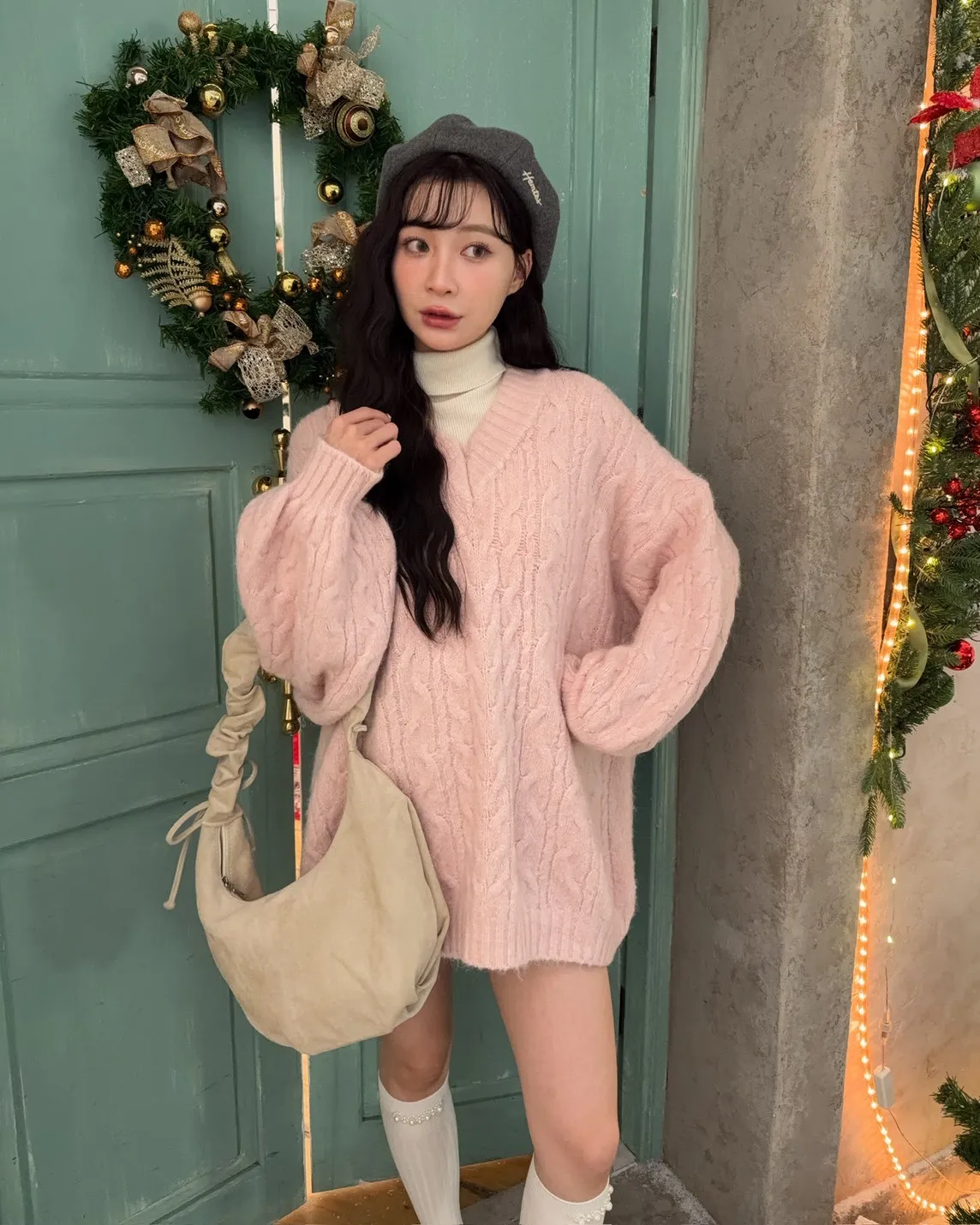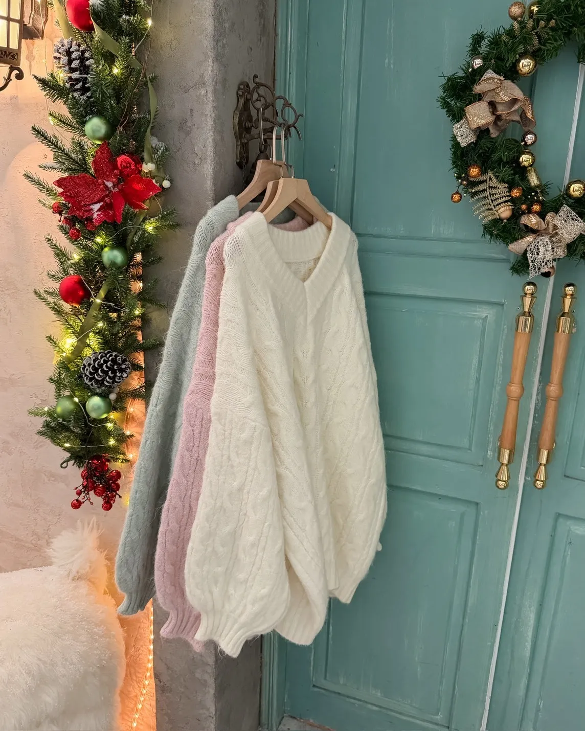 X0062酸甜初戀大件V領麻花毛衣(米白/粉紅/淡綠)