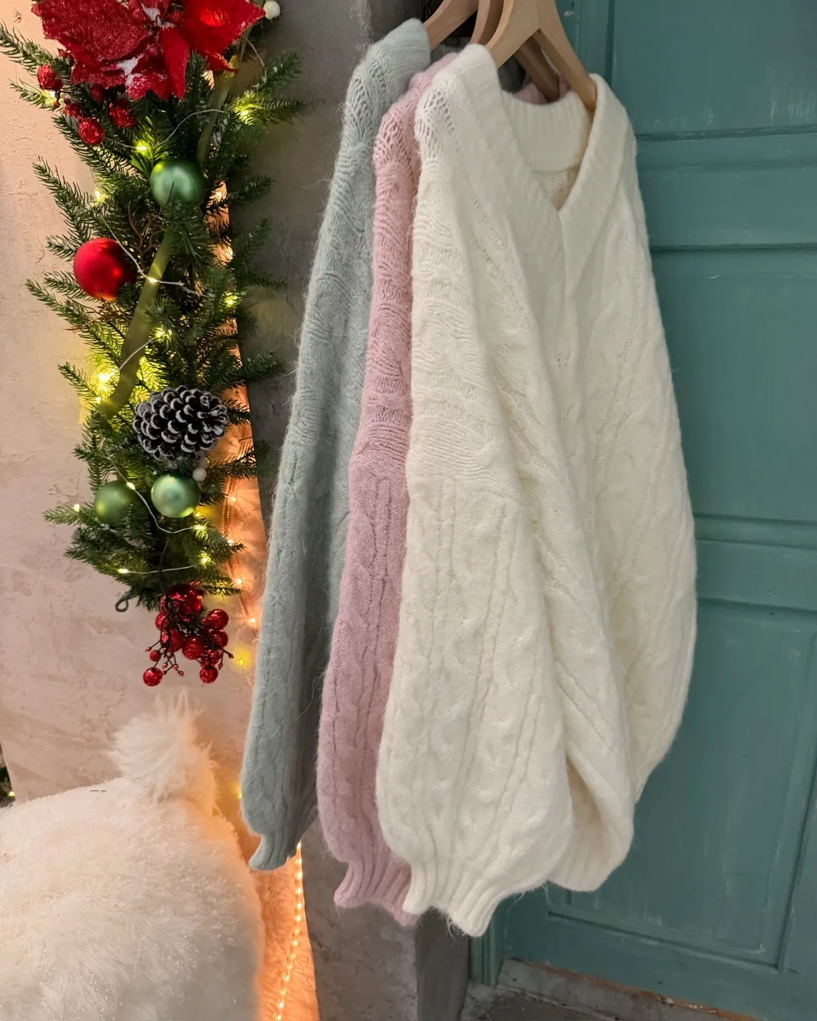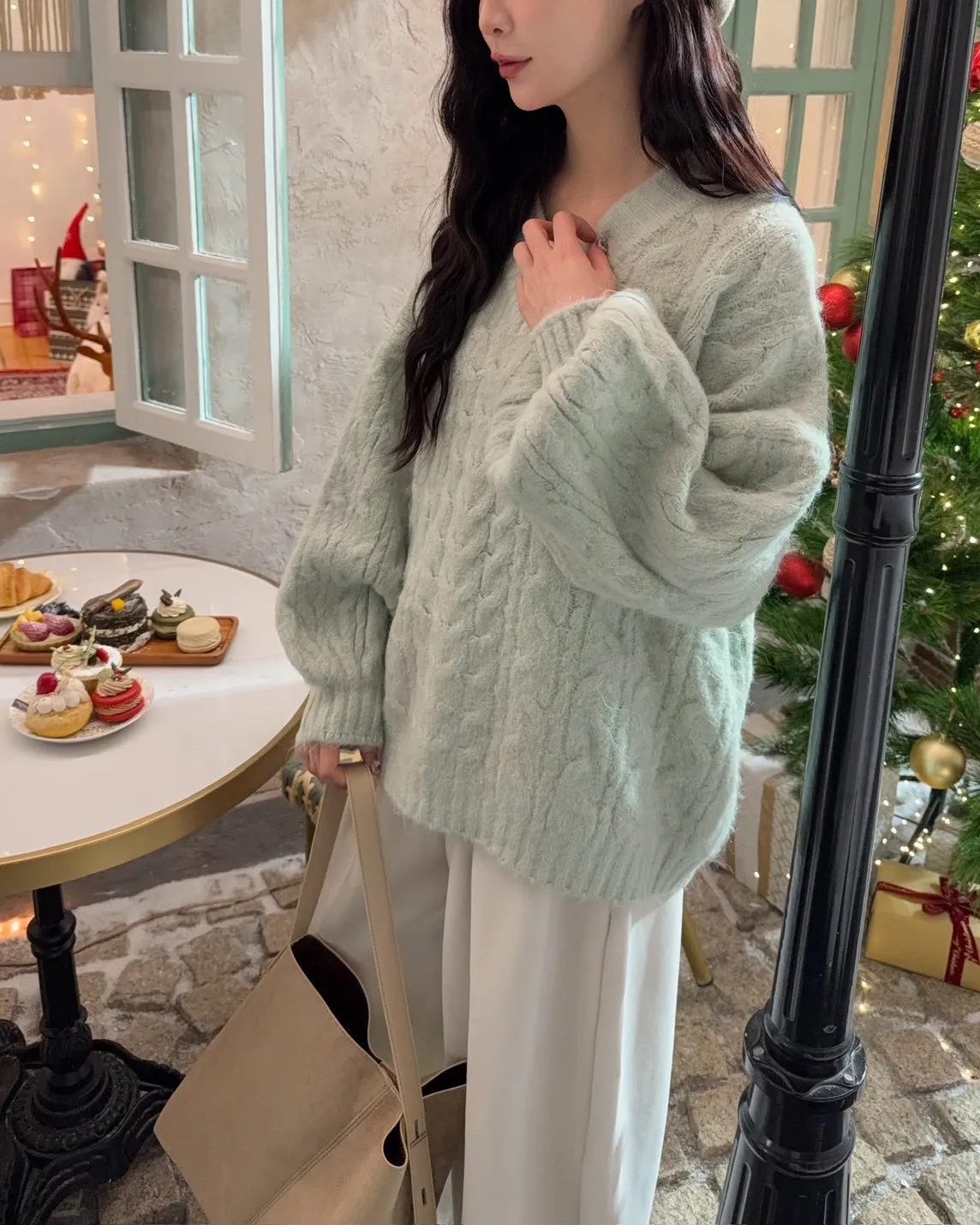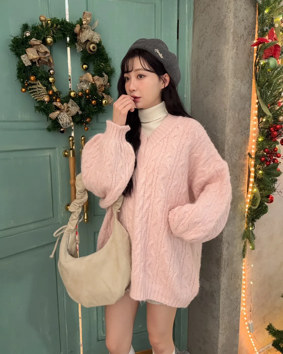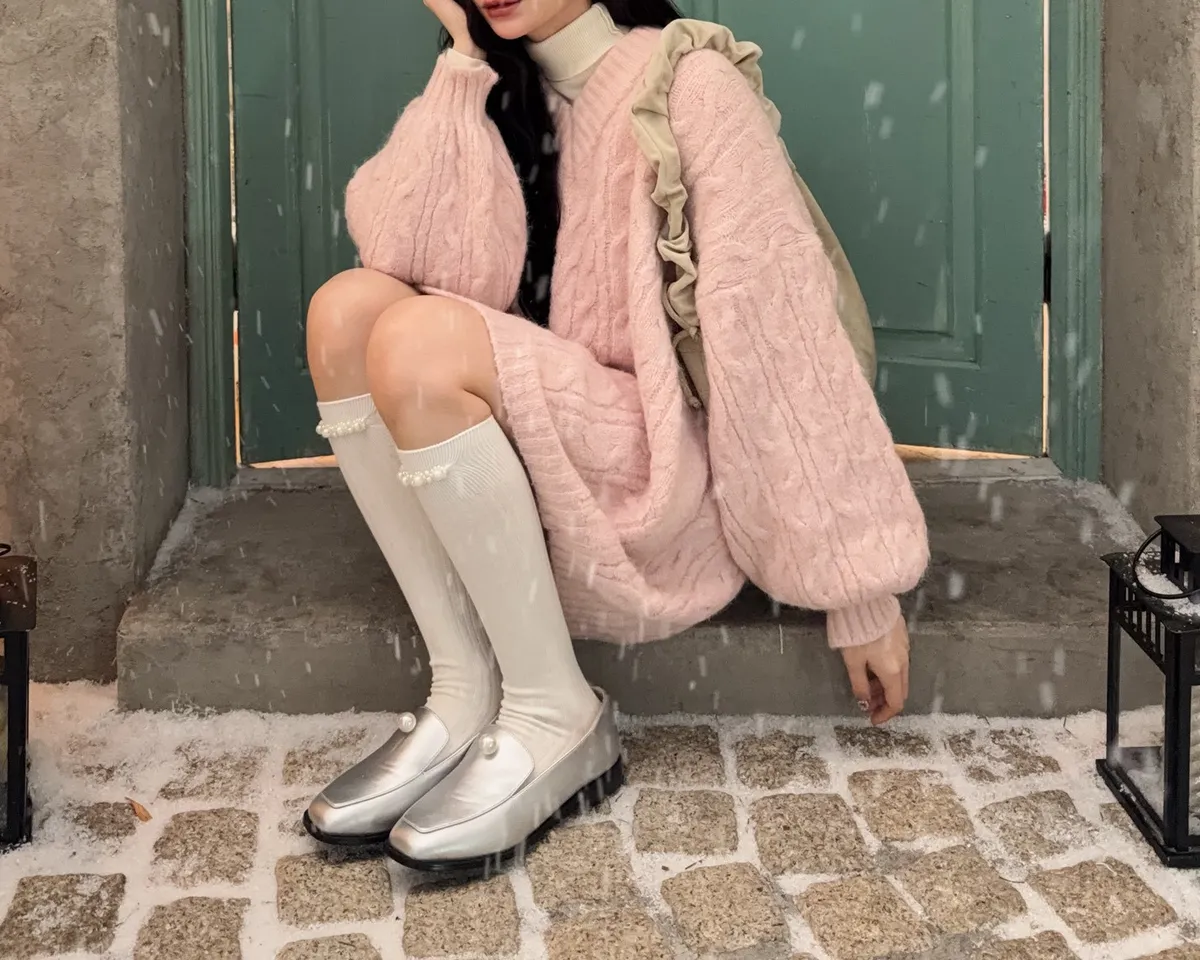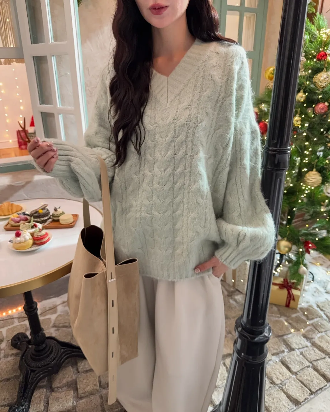 X0062酸甜初戀大件V領麻花毛衣(米白/粉紅/淡綠)