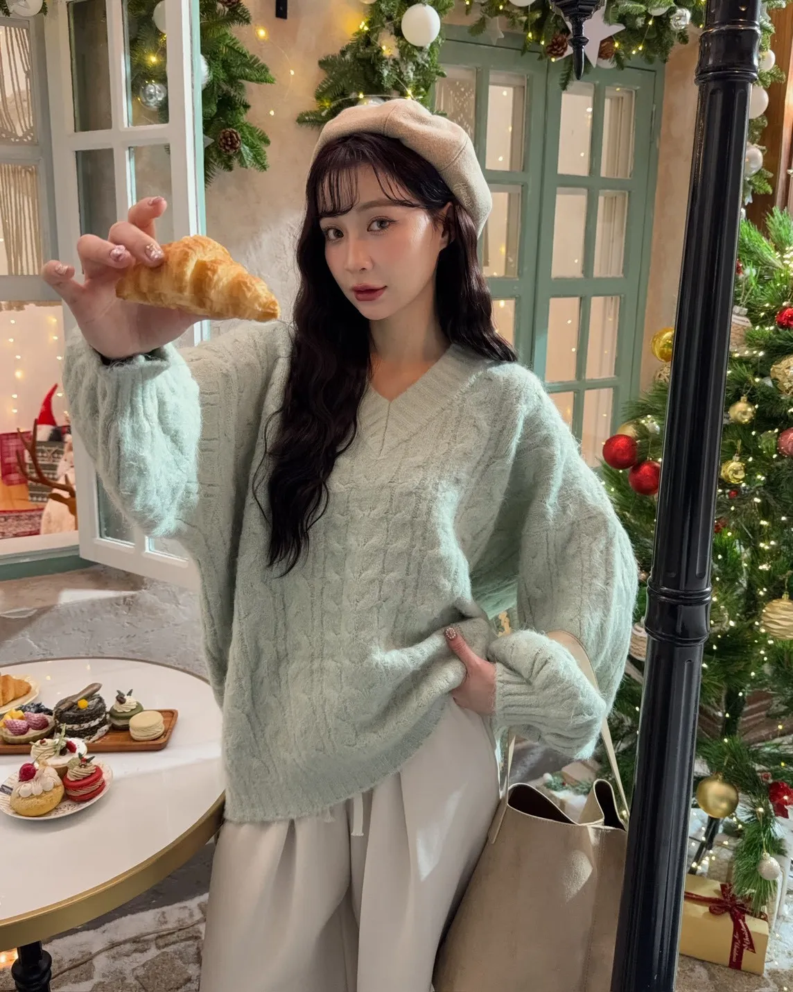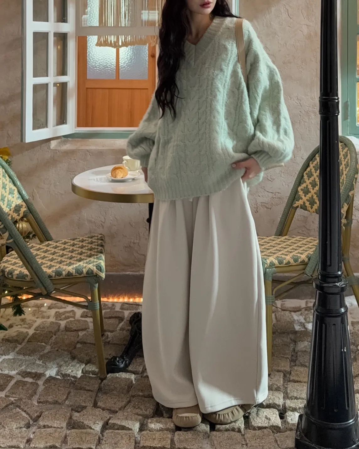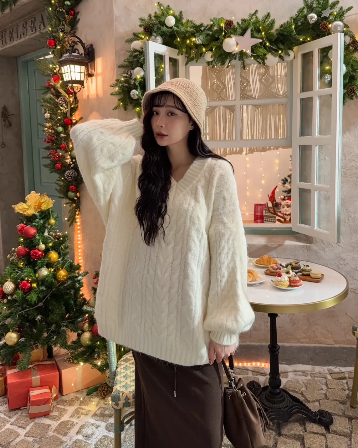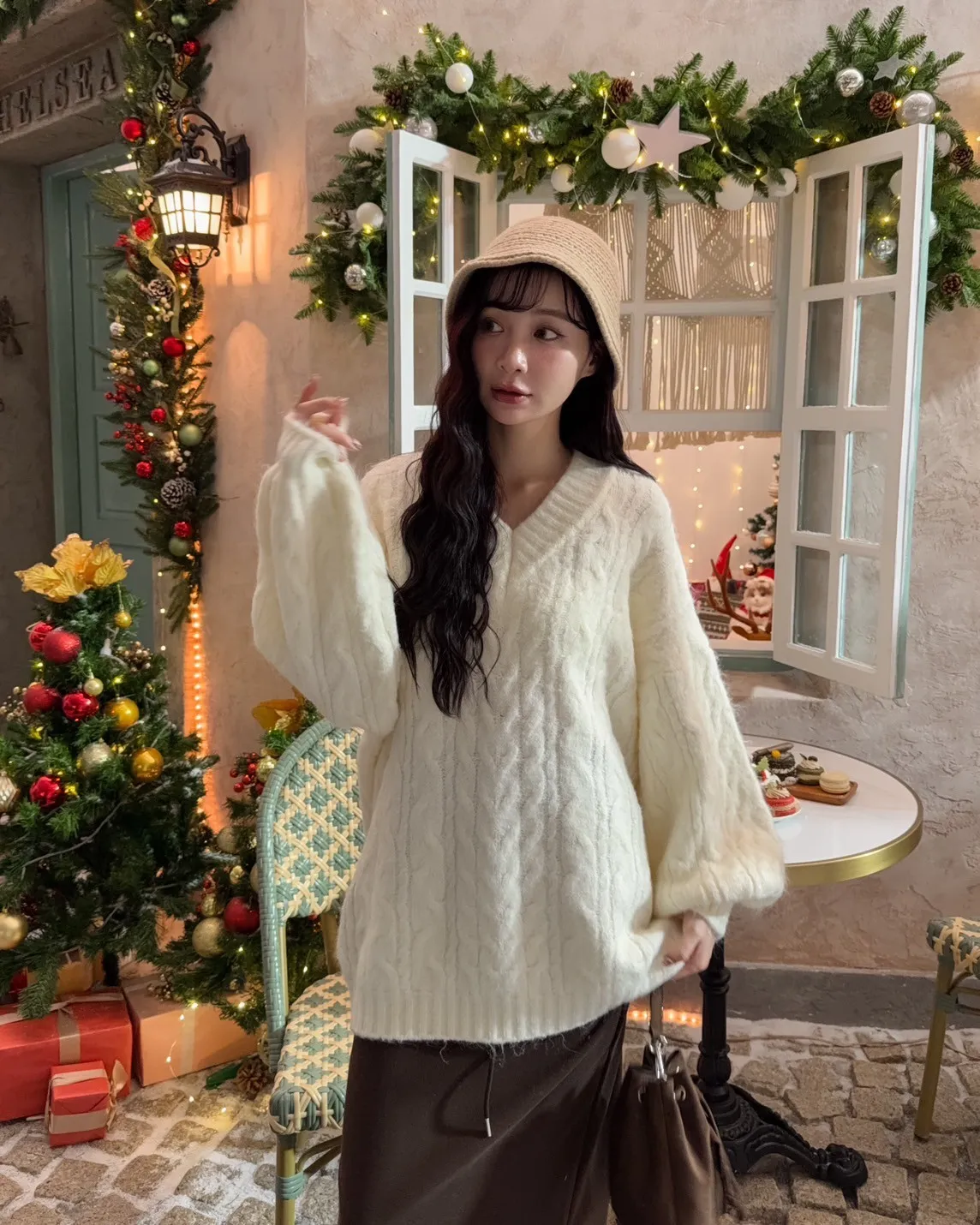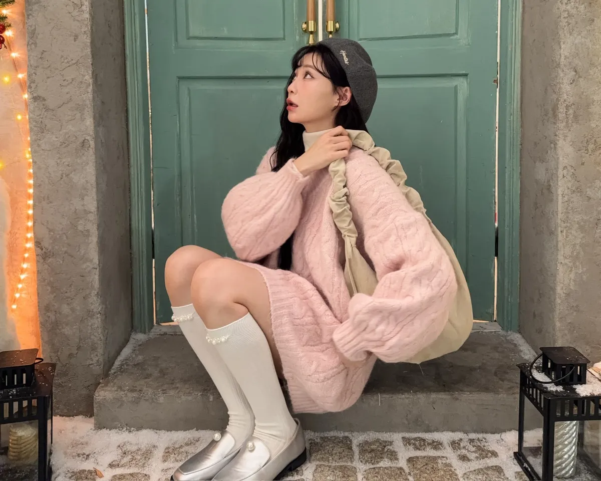 X0062酸甜初戀大件V領麻花毛衣(米白/粉紅/淡綠)
