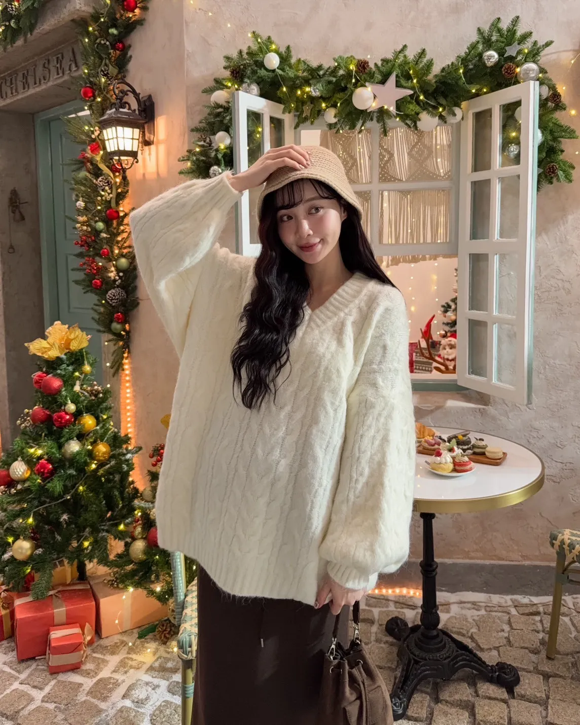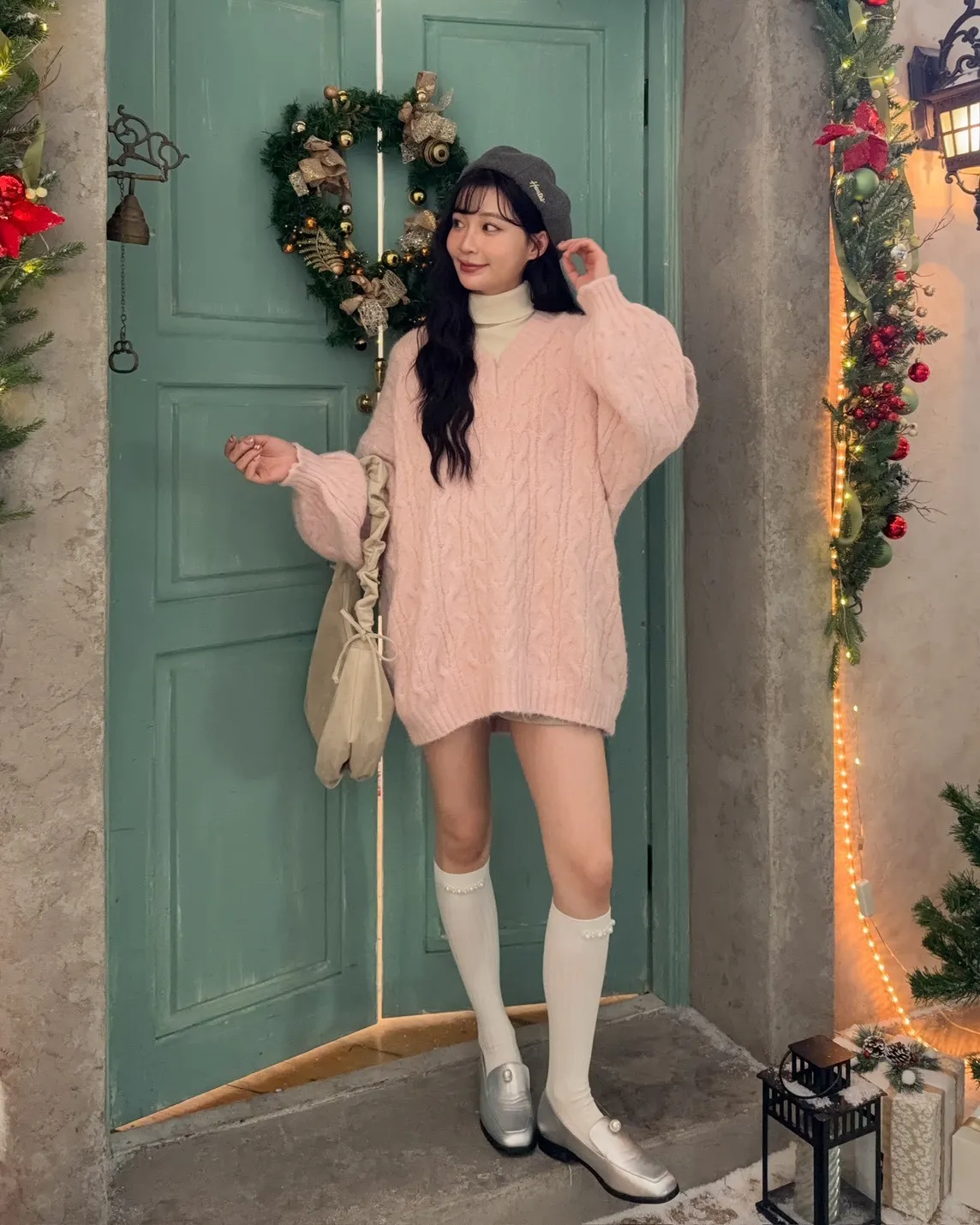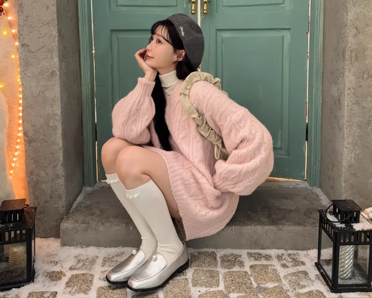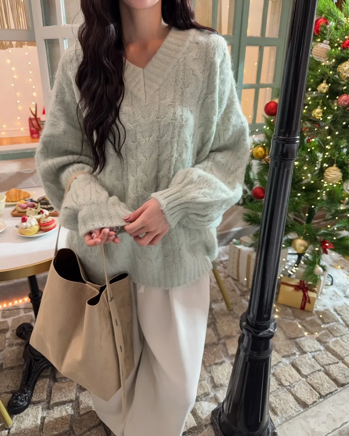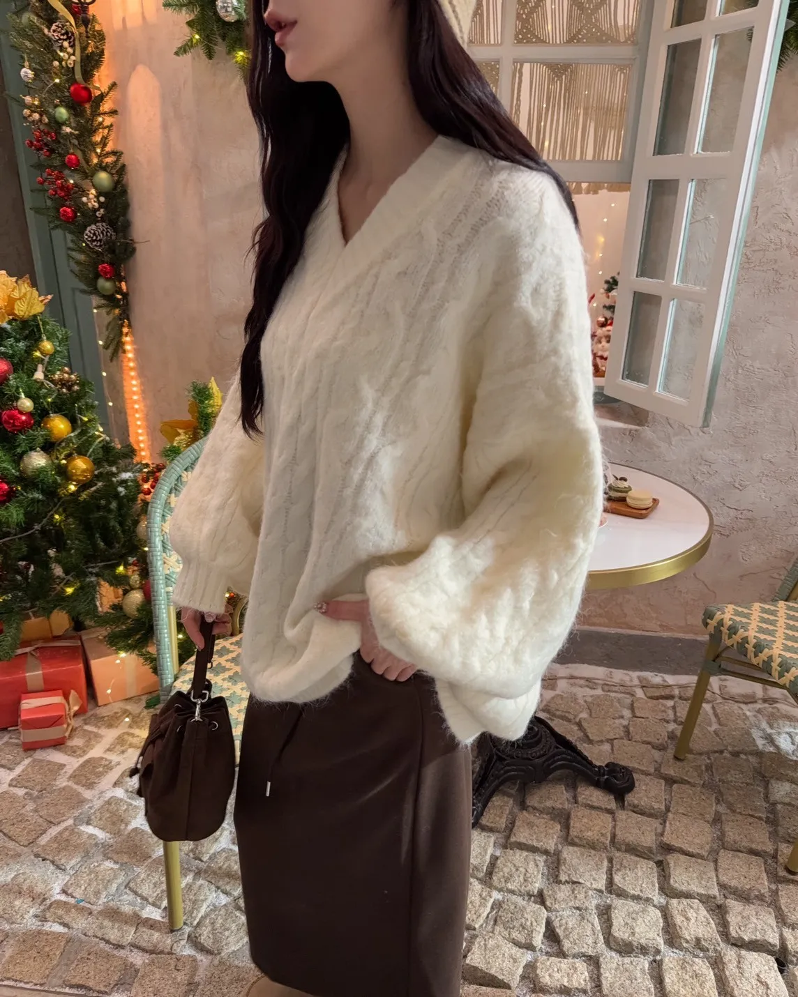 X0062酸甜初戀大件V領麻花毛衣(米白/粉紅/淡綠)