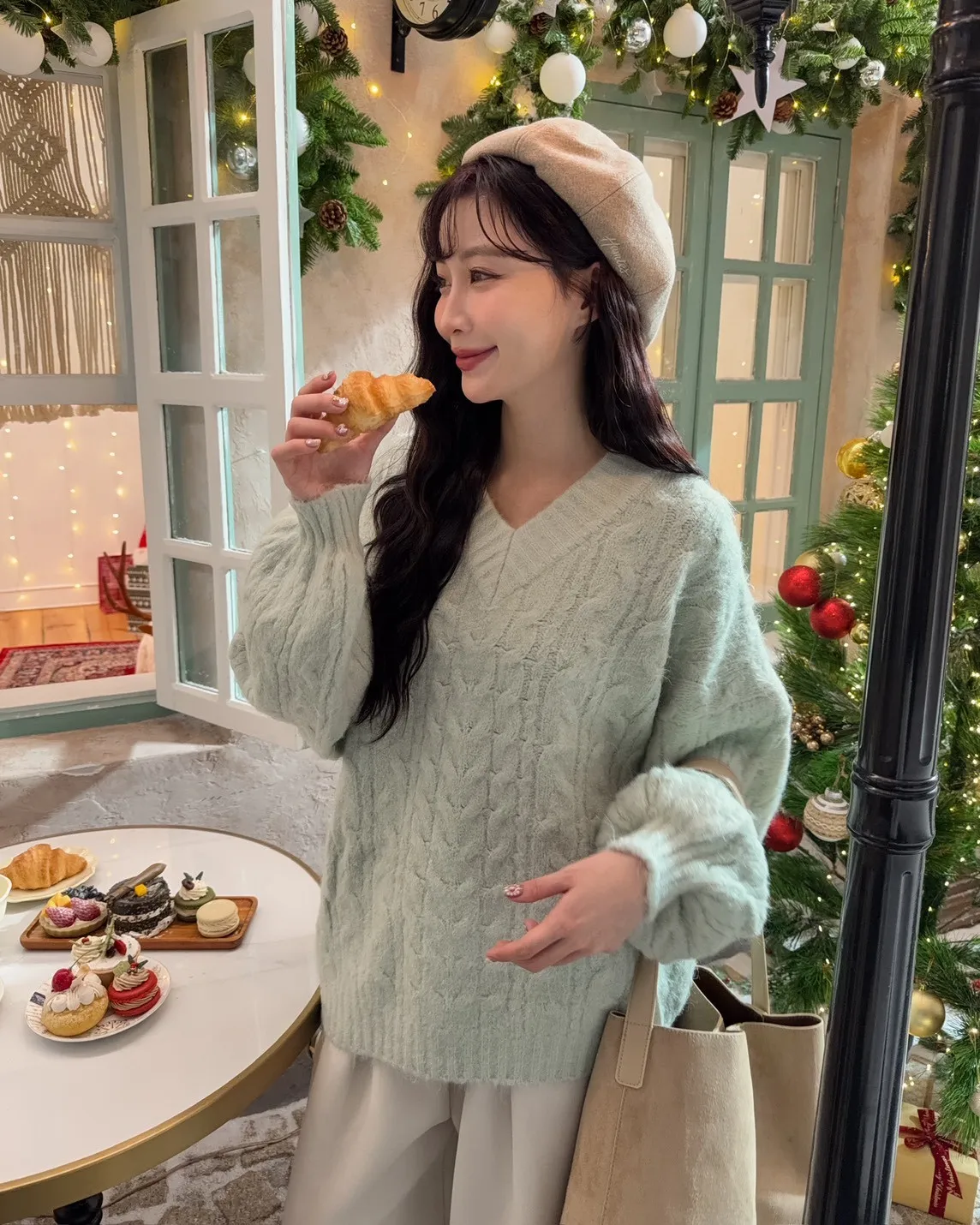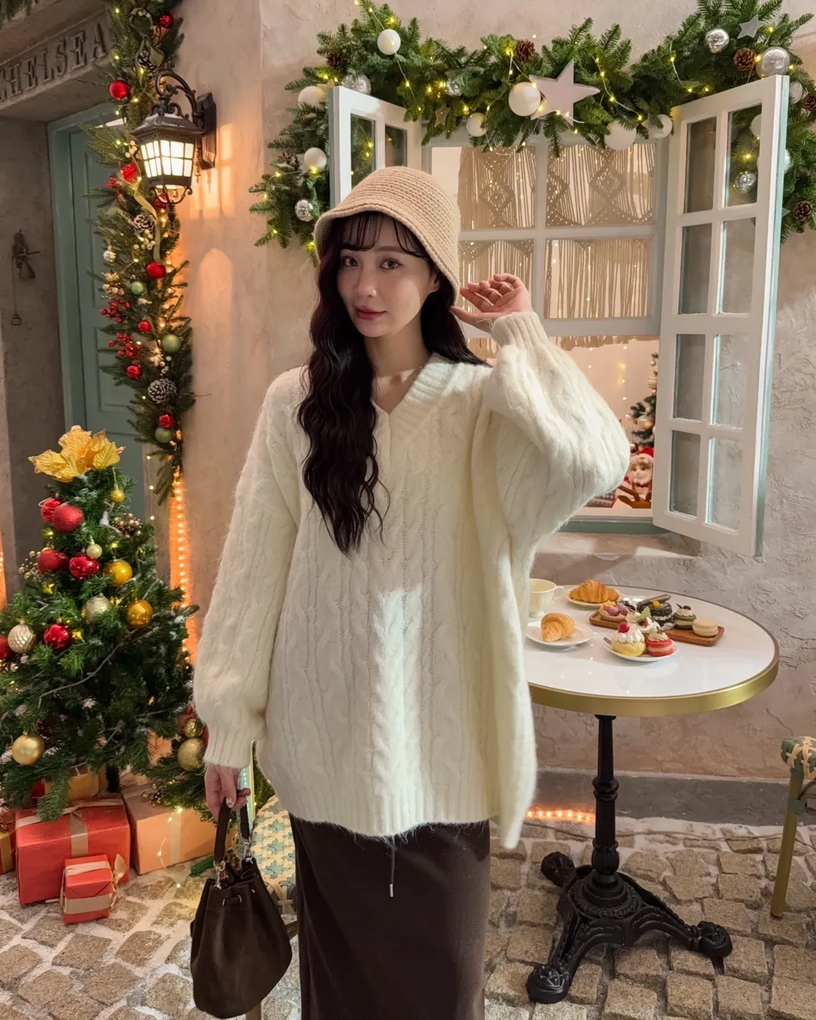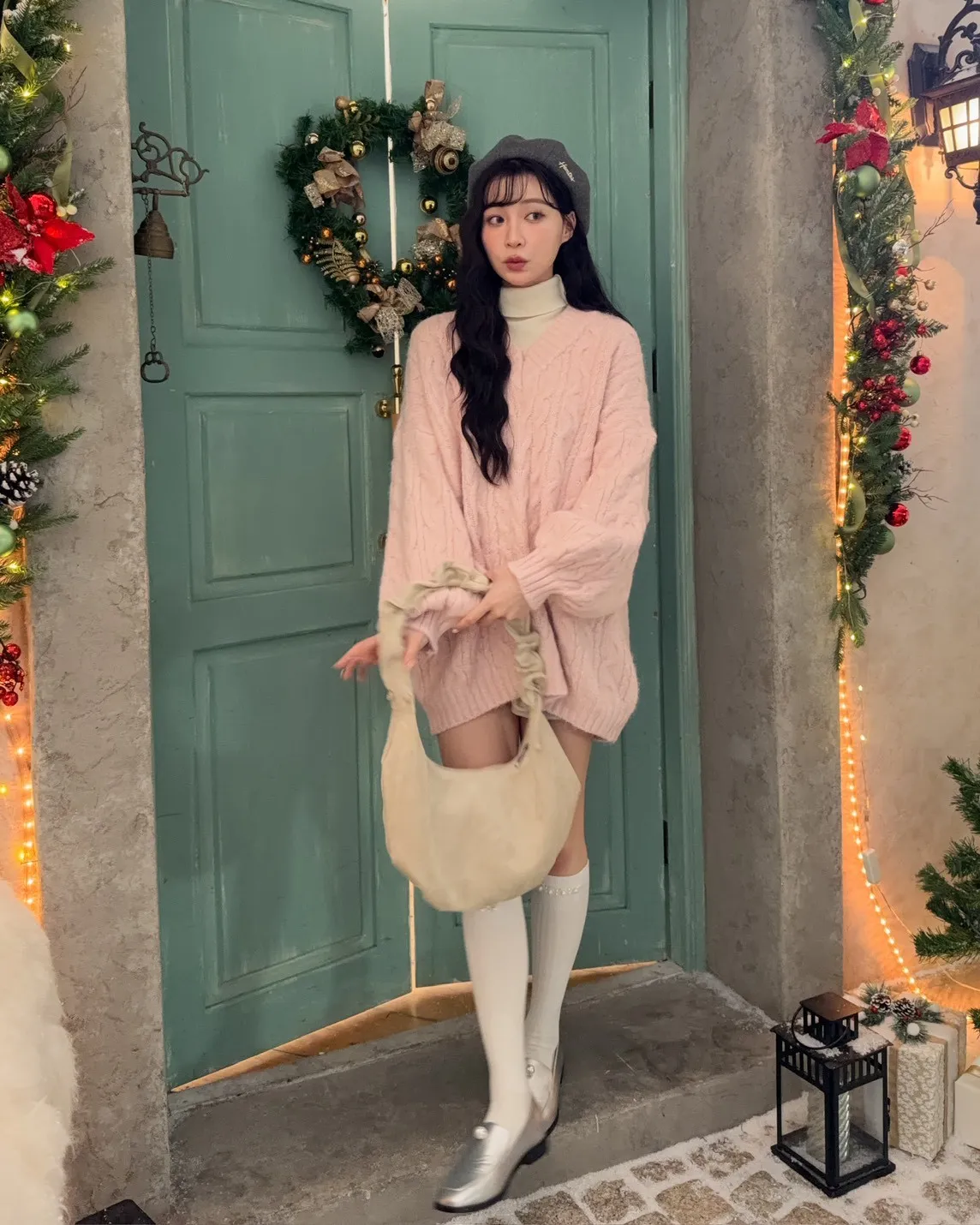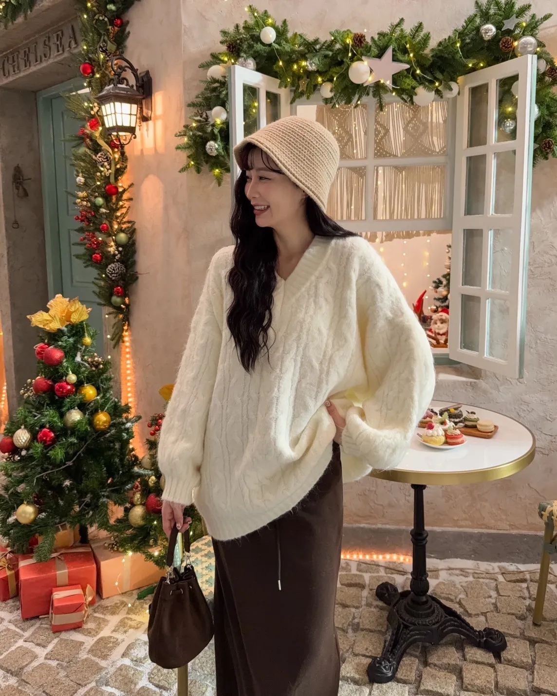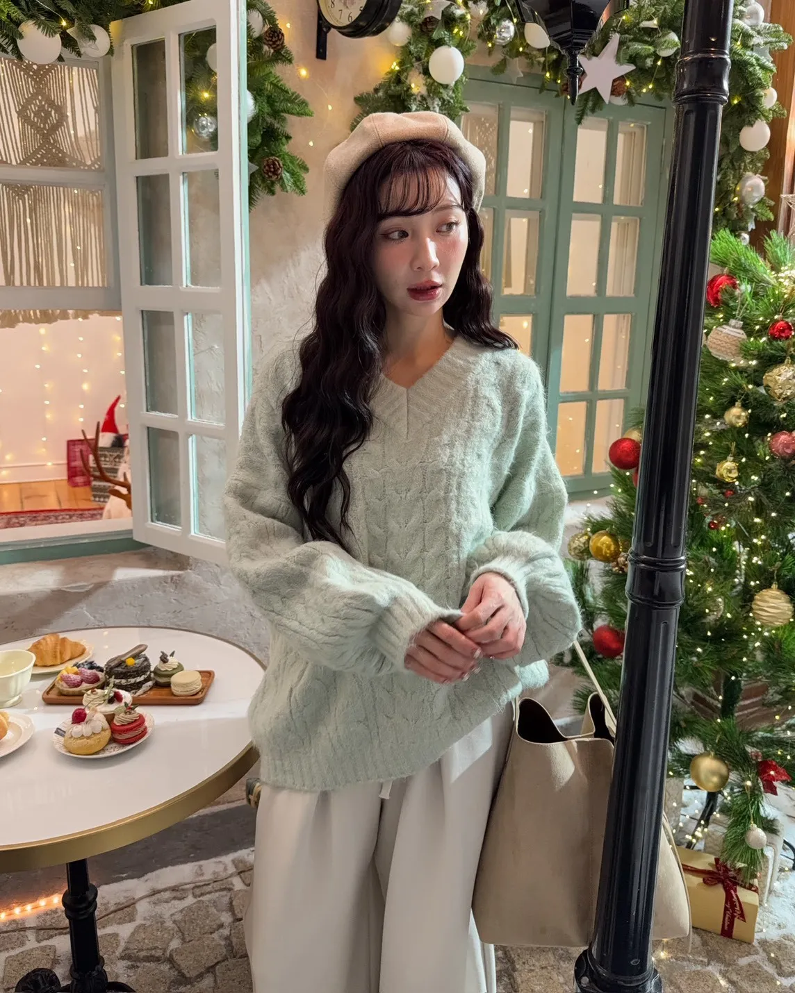 X0062酸甜初戀大件V領麻花毛衣(米白/粉紅/淡綠)