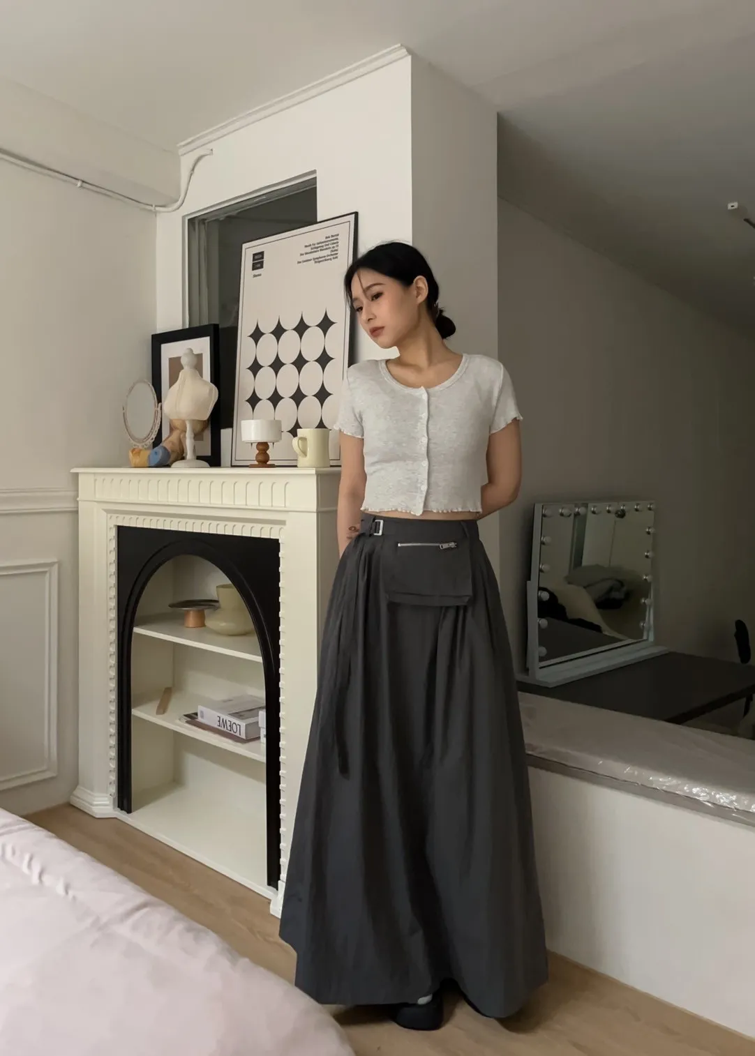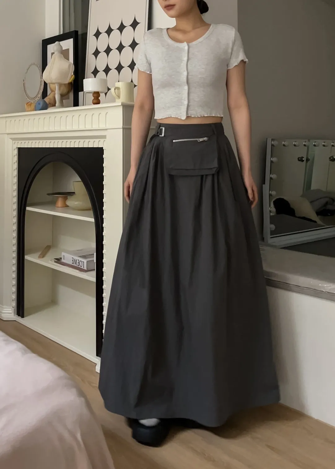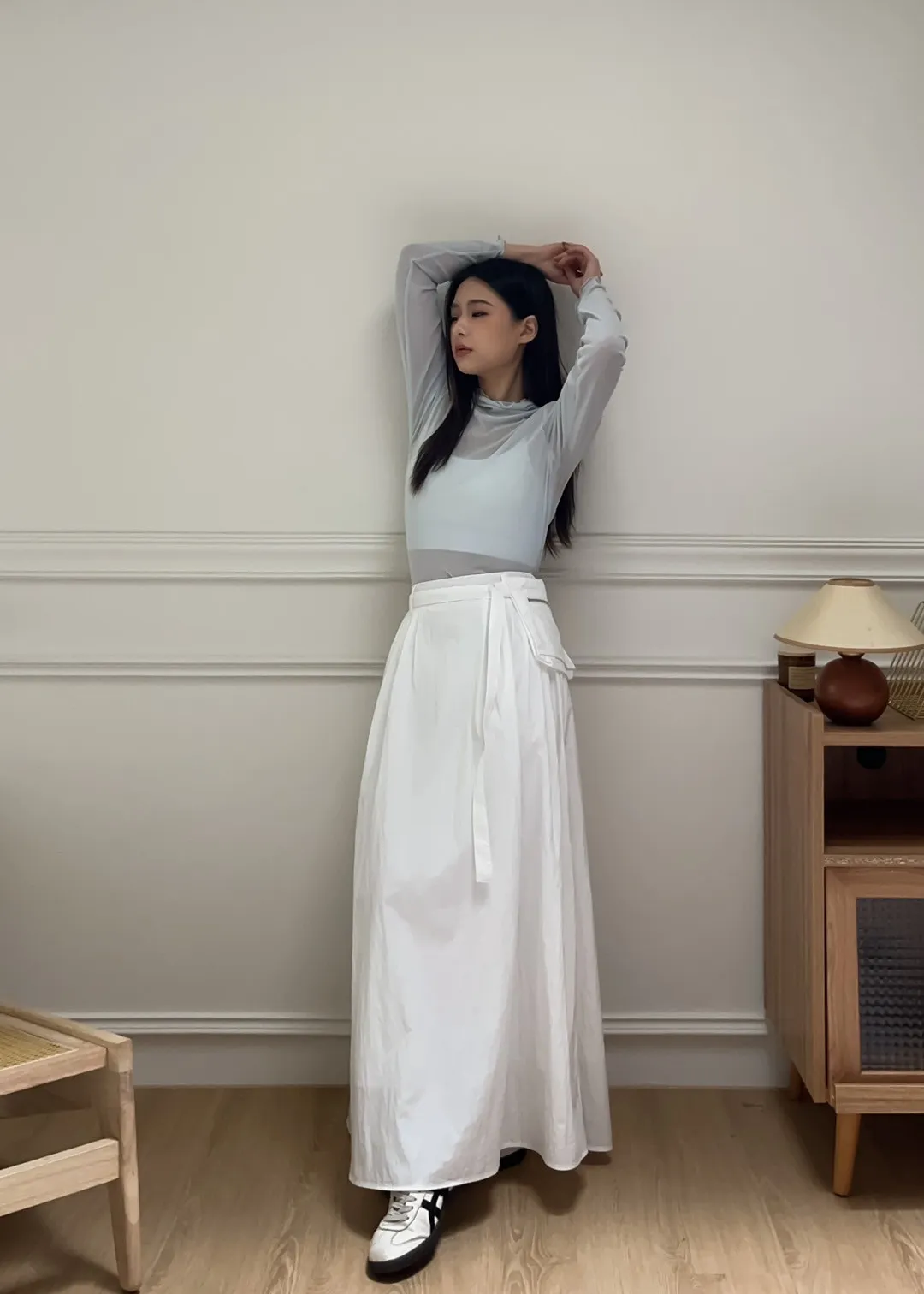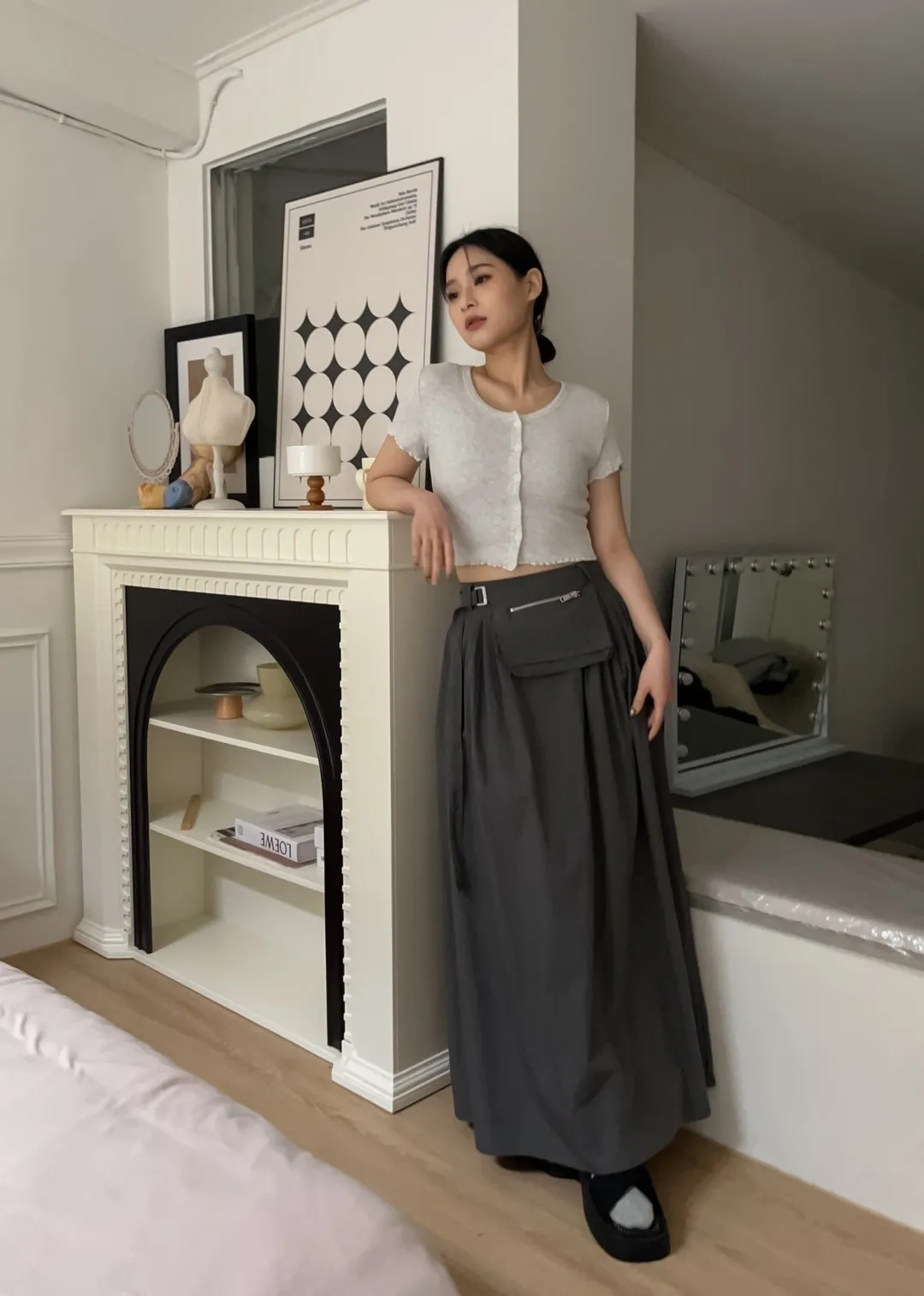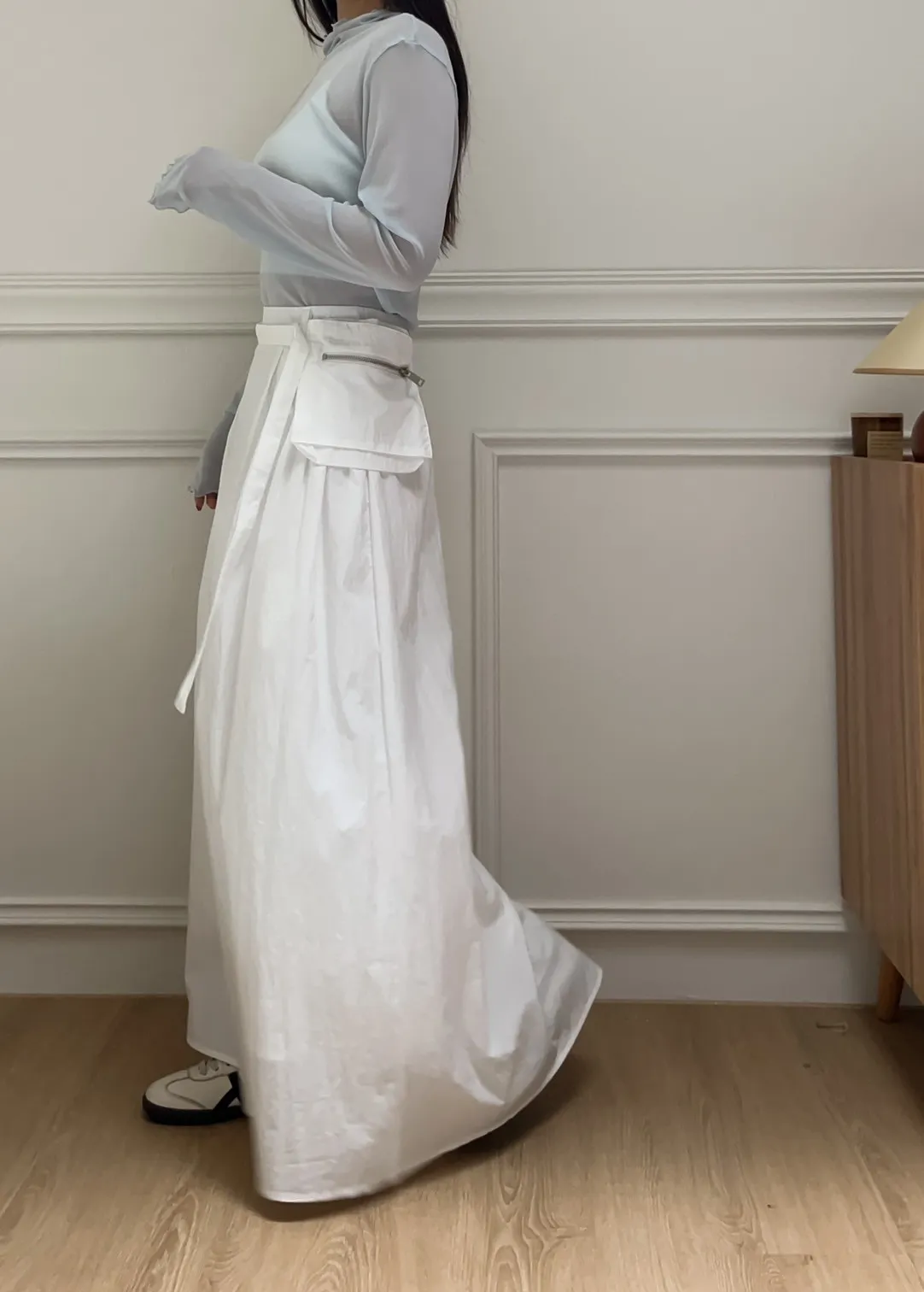 M0030(附腰包)個性打折刷刷長裙(白/灰/黑)(售完不補)