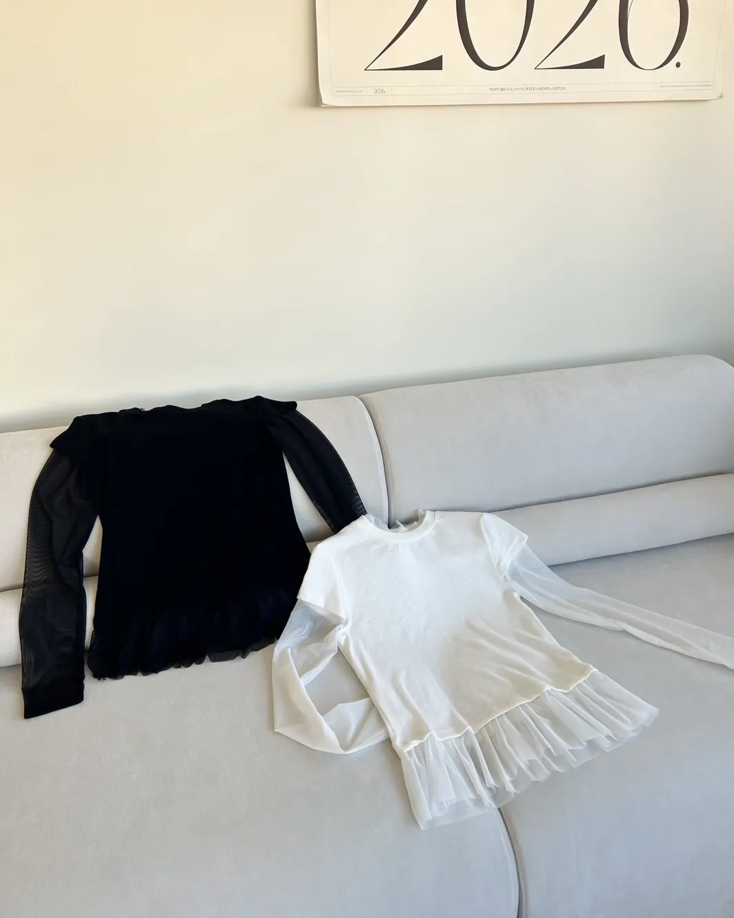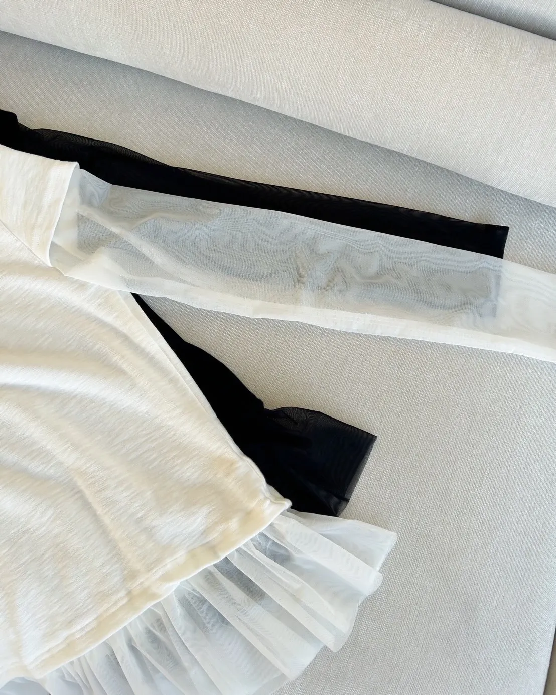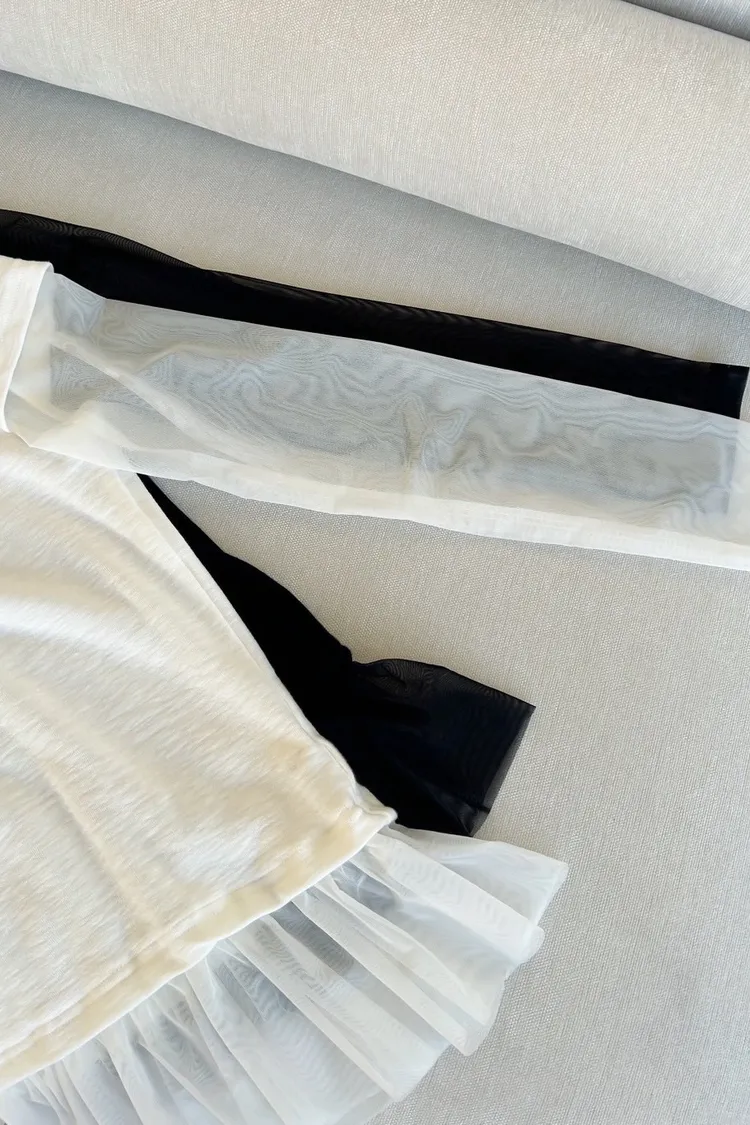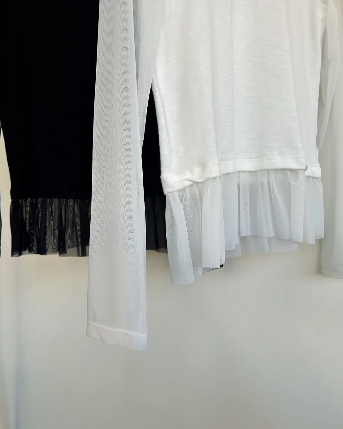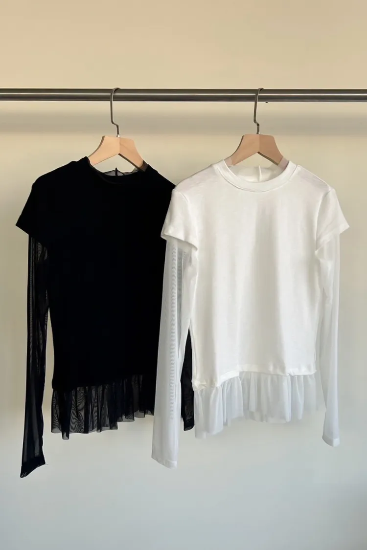 A0053夢幻紗裙擺層次假兩件上衣(白/黑)