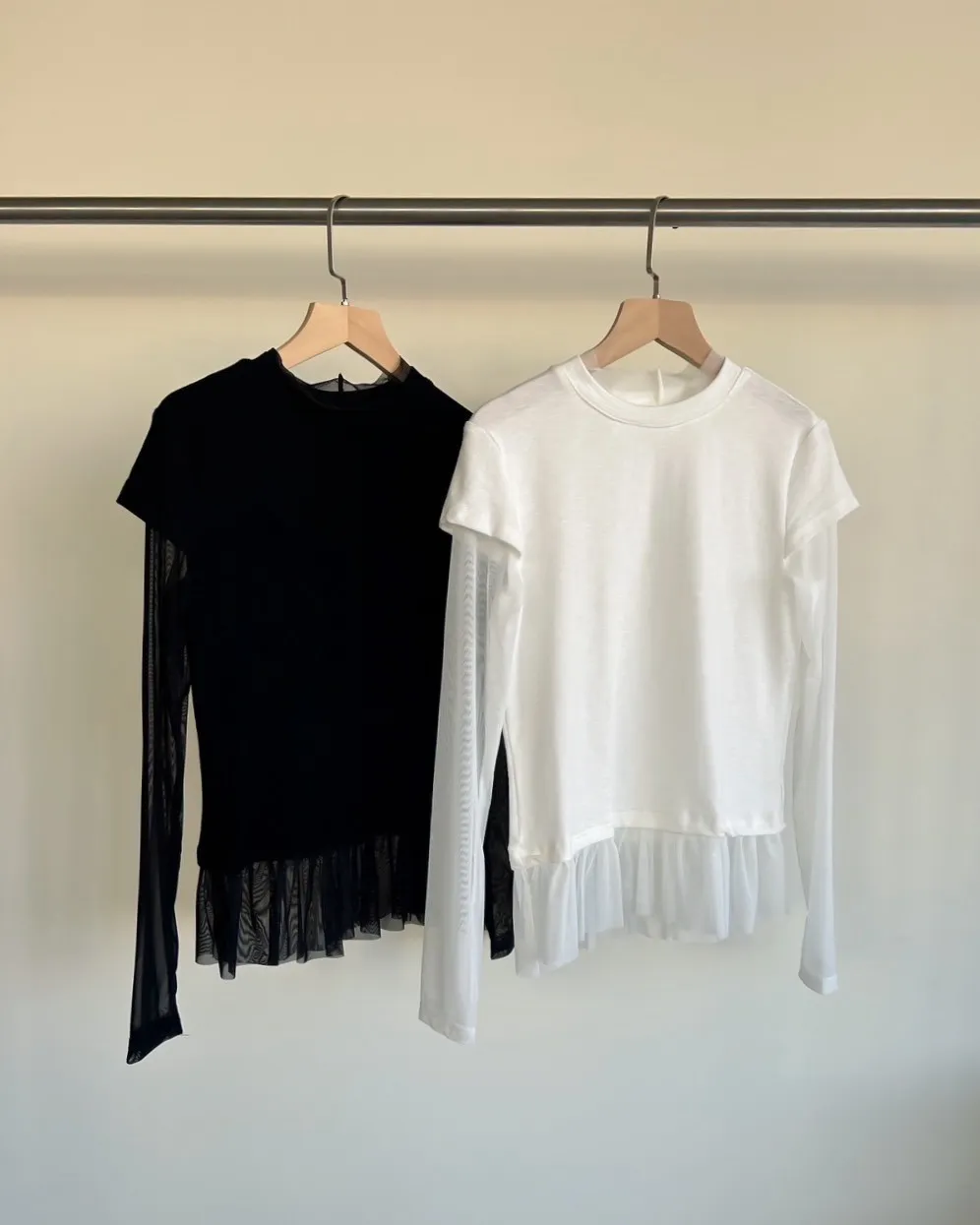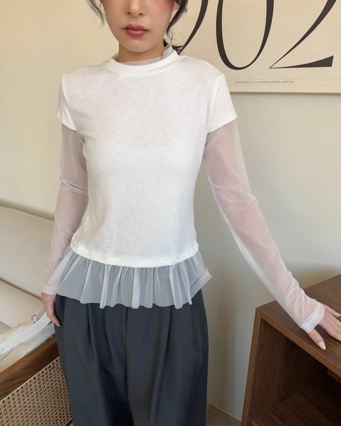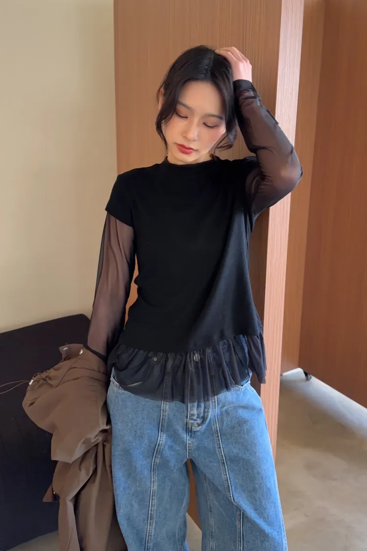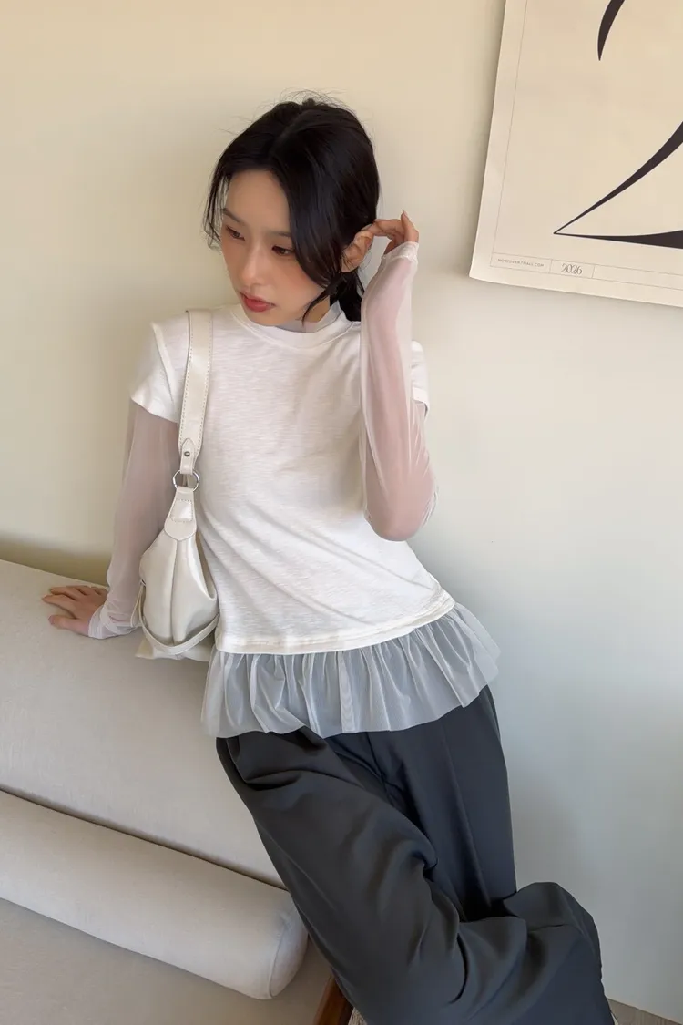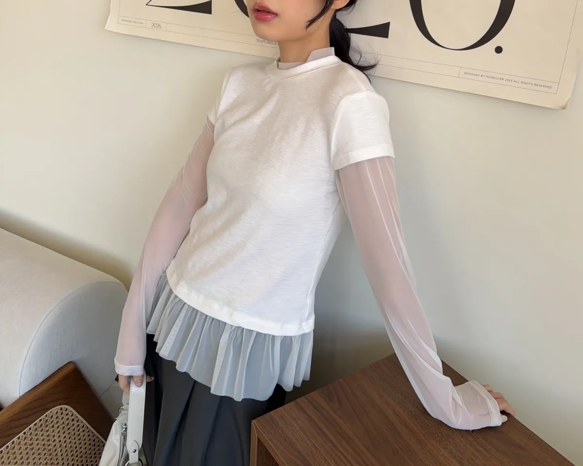 假兩件(短袖+透膚) 紗裙下擺 紋理感短袖 透膚長袖 不用疊搭就有層次感