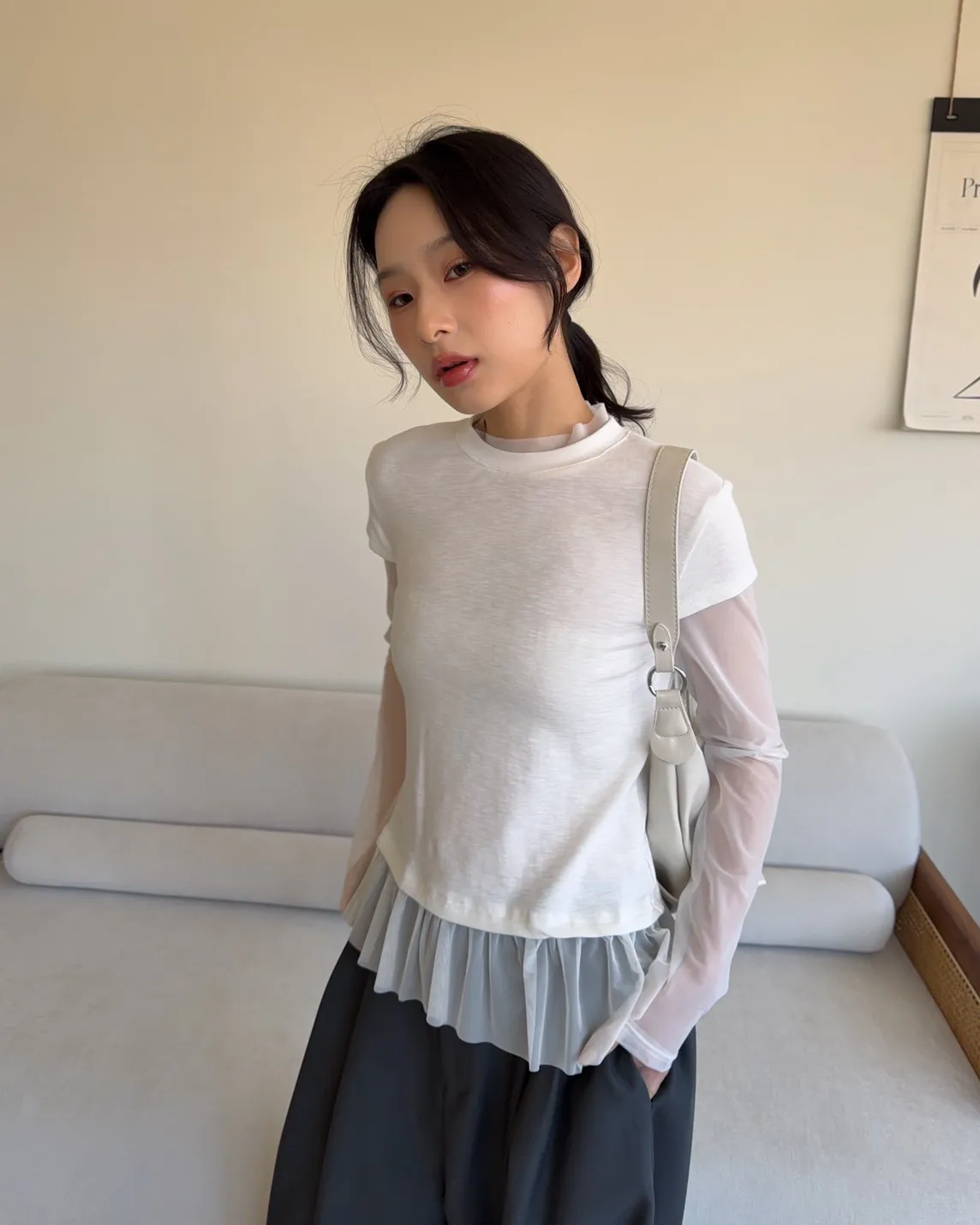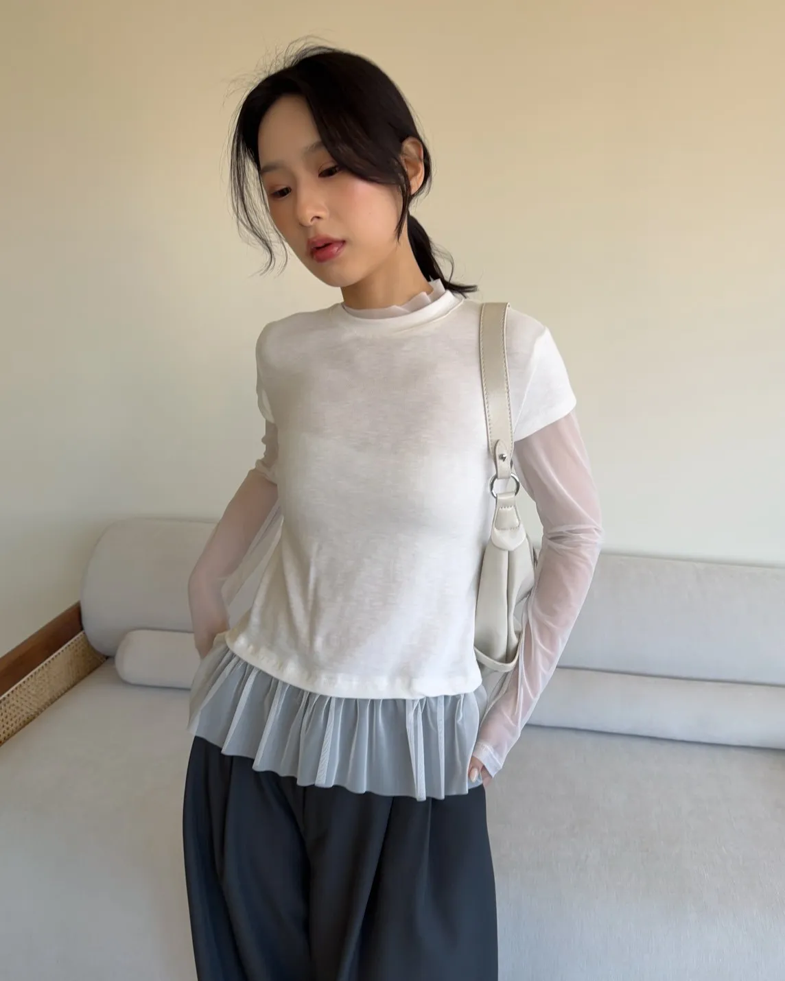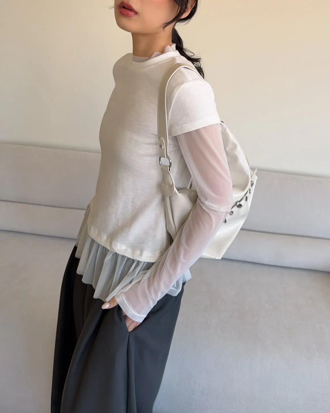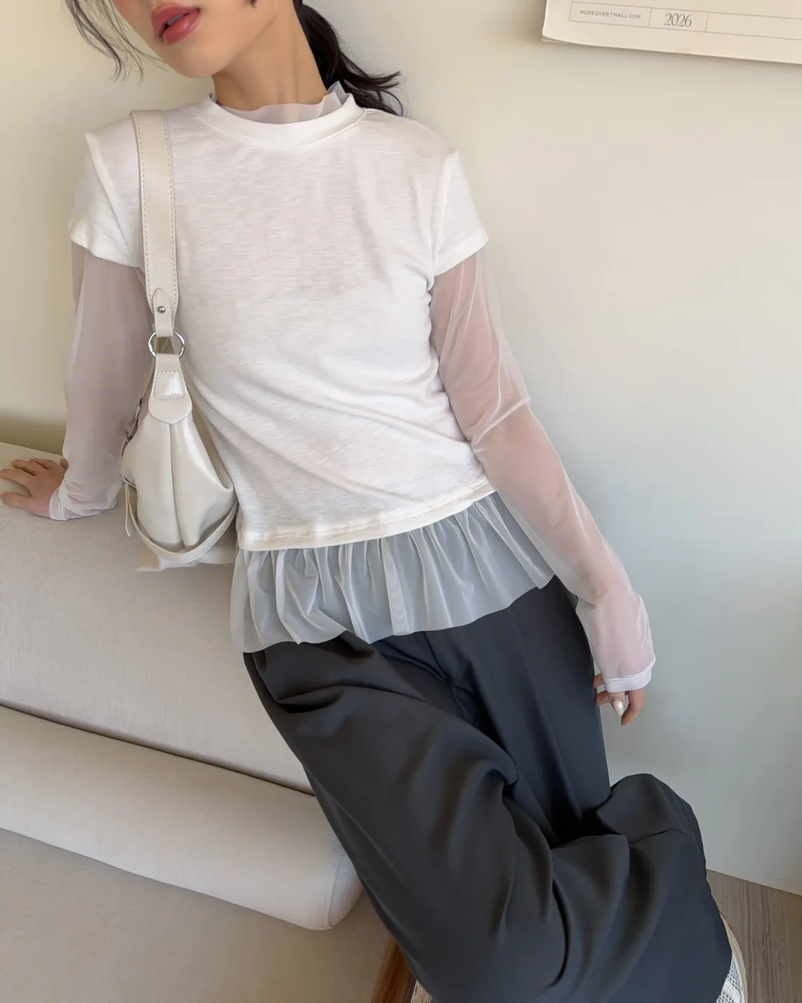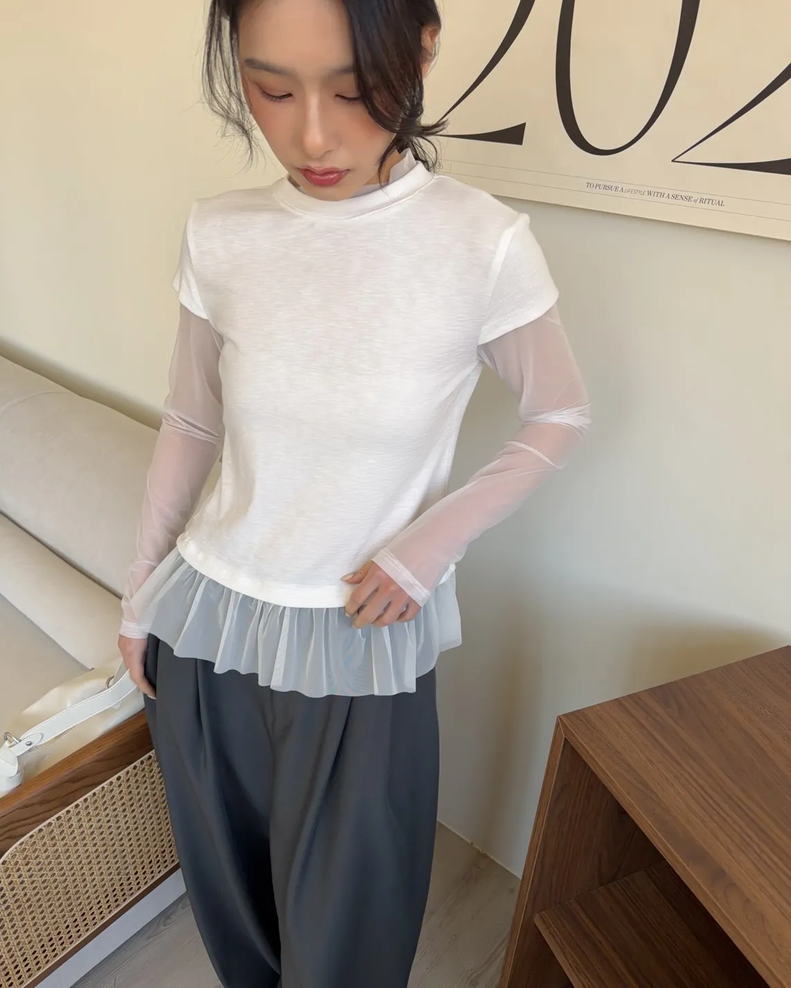 假兩件(短袖+透膚) 紗裙下擺 紋理感短袖 透膚長袖 不用疊搭就有層次感