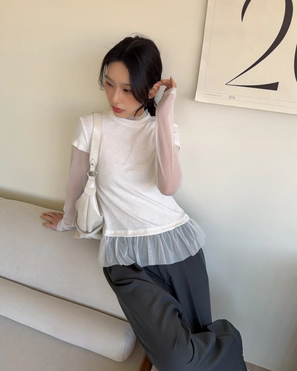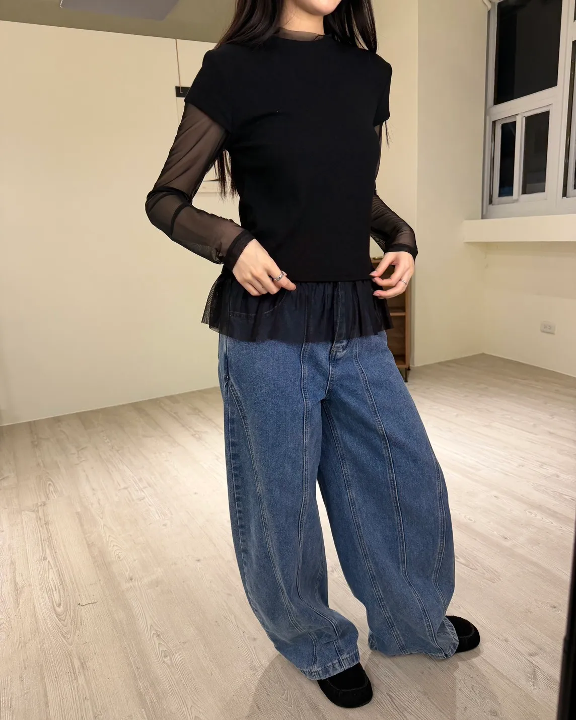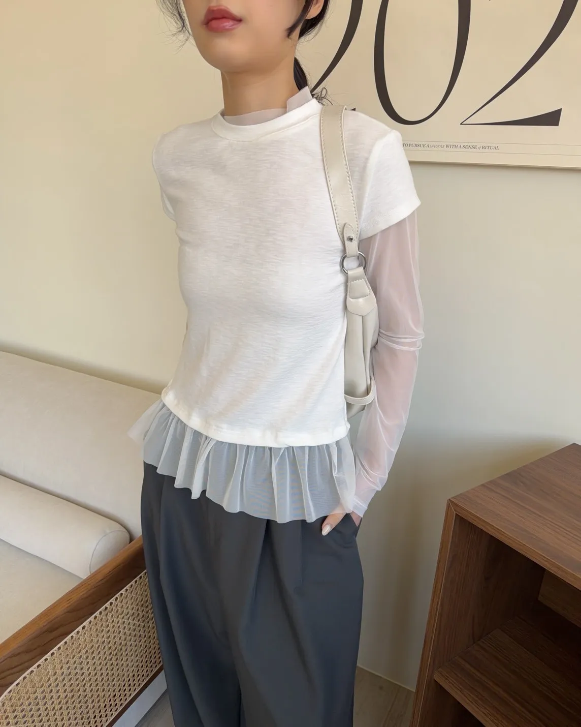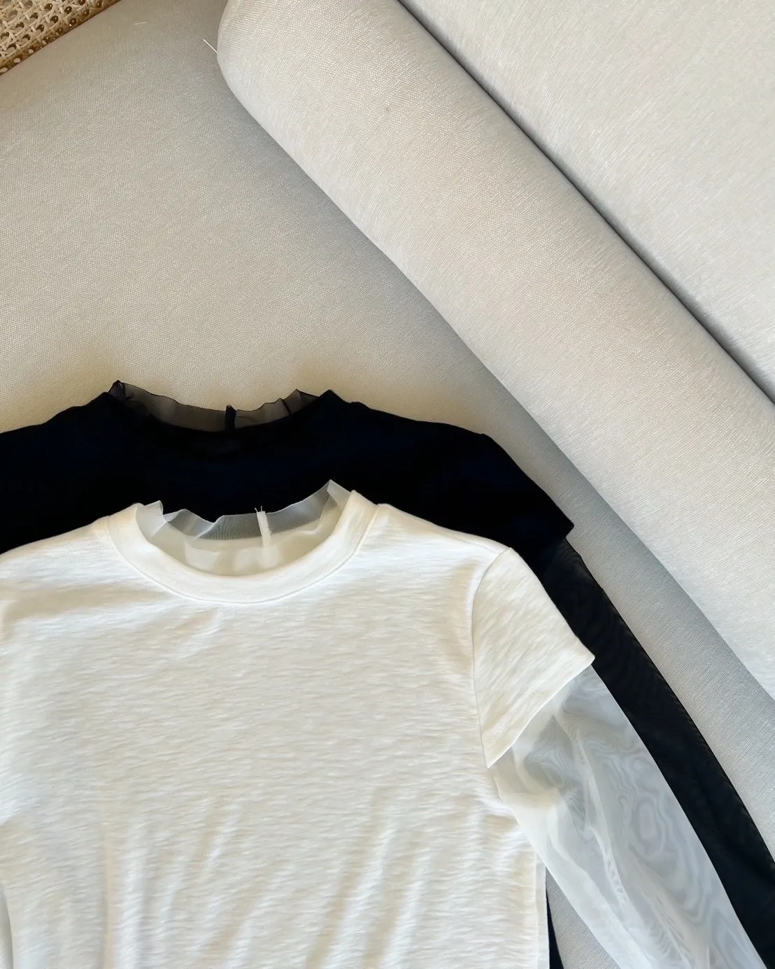 假兩件(短袖+透膚) 紗裙下擺 紋理感短袖 透膚長袖 不用疊搭就有層次感