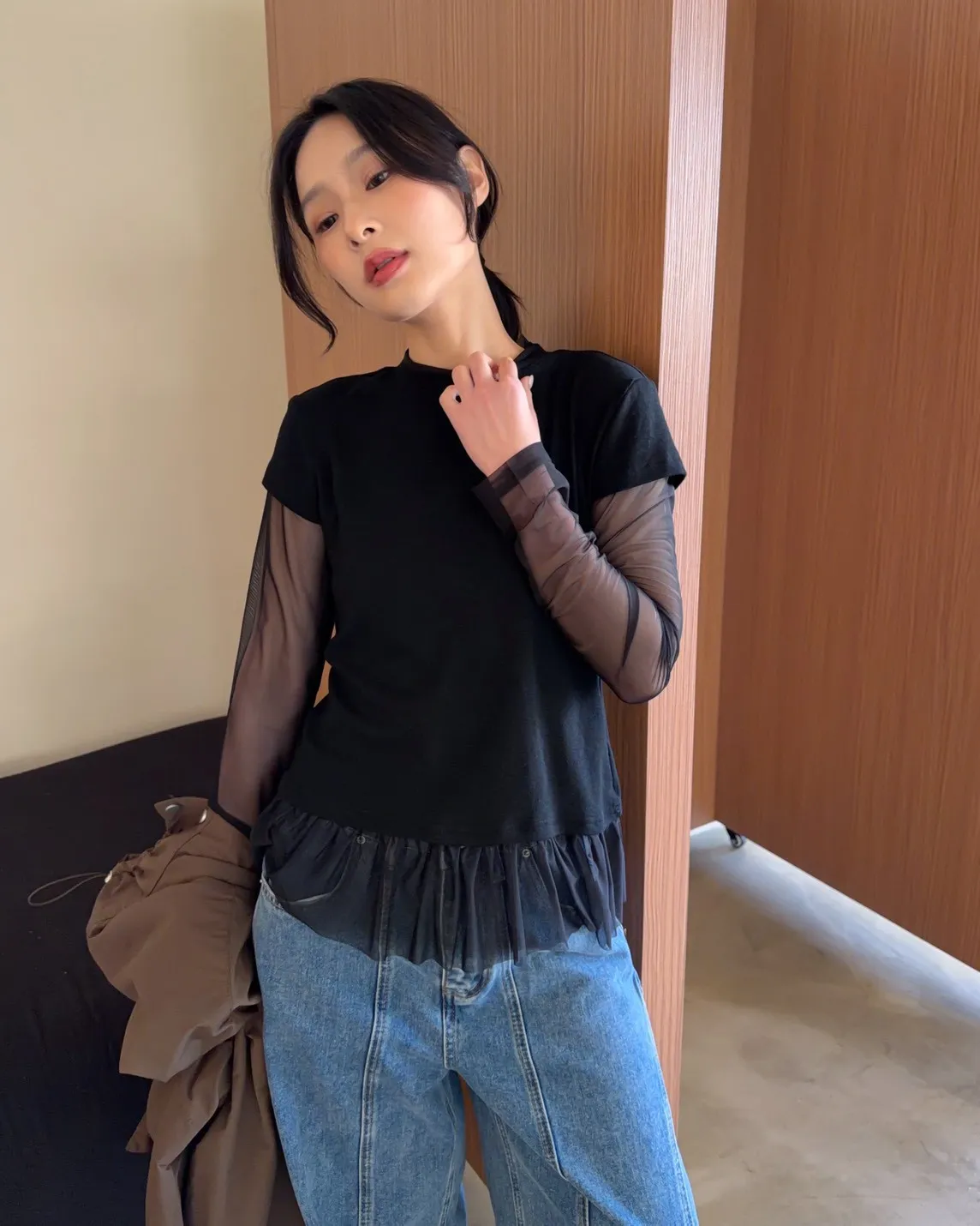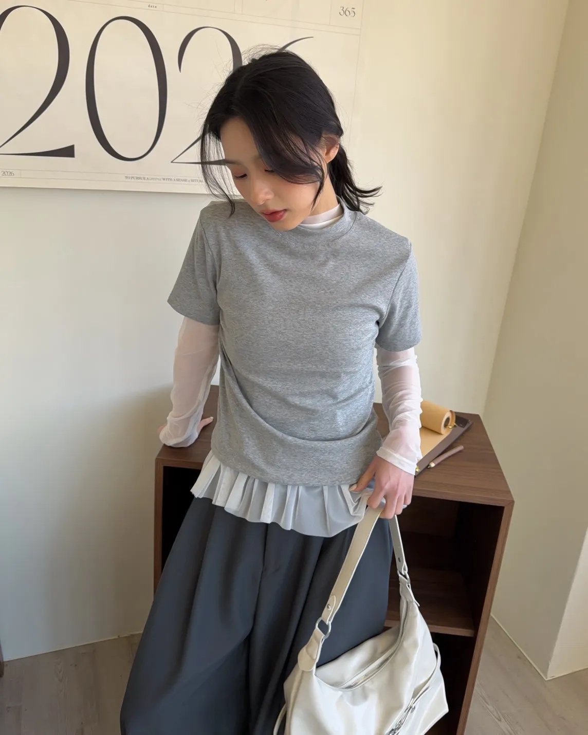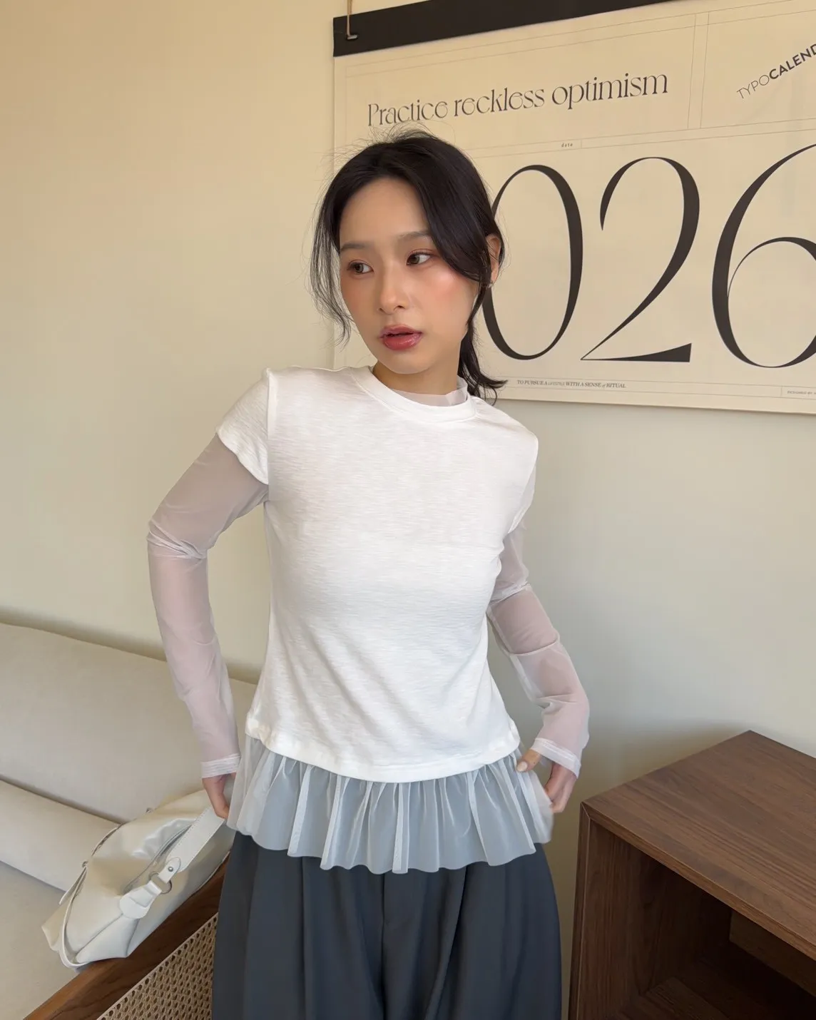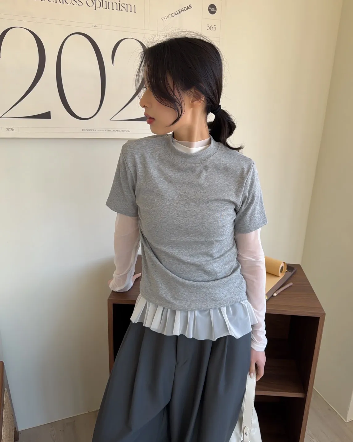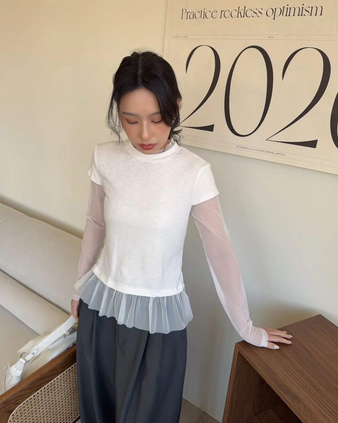 假兩件(短袖+透膚) 紗裙下擺 紋理感短袖 透膚長袖 不用疊搭就有層次感