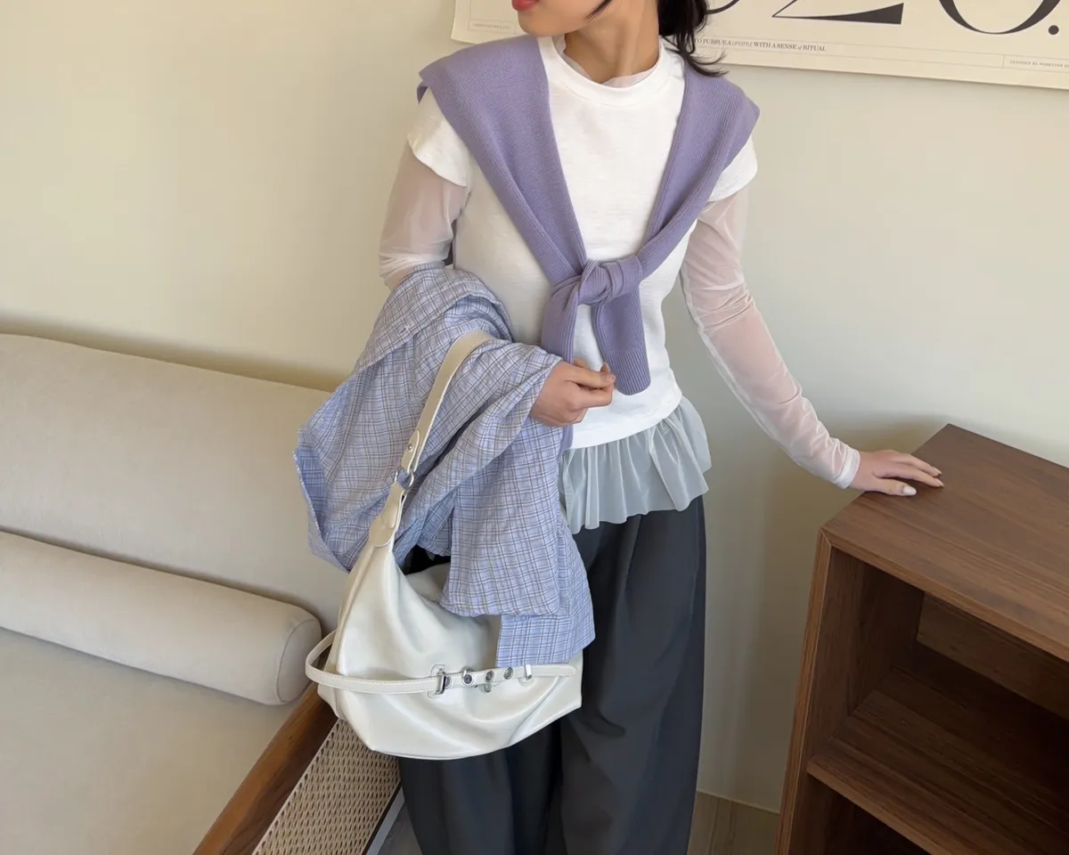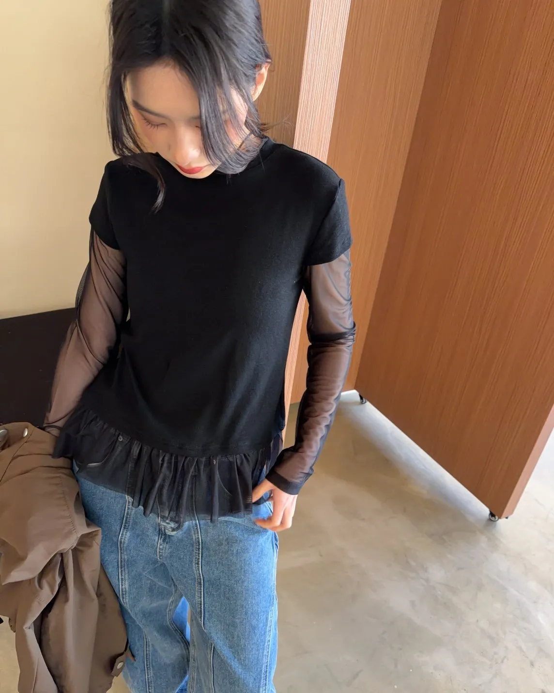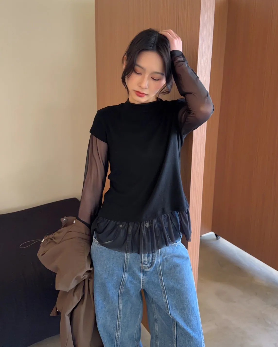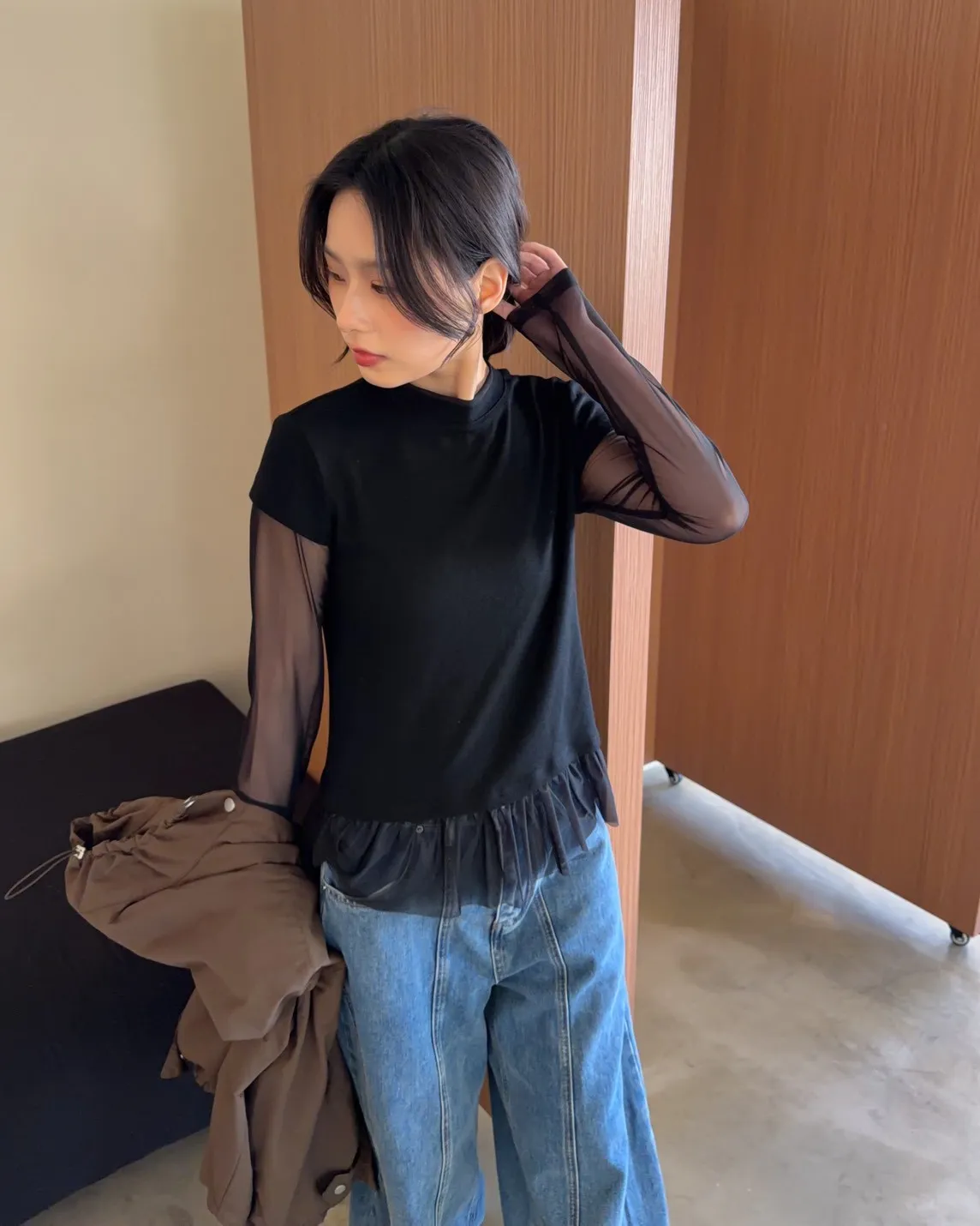 假兩件(短袖+透膚) 紗裙下擺 紋理感短袖 透膚長袖 不用疊搭就有層次感