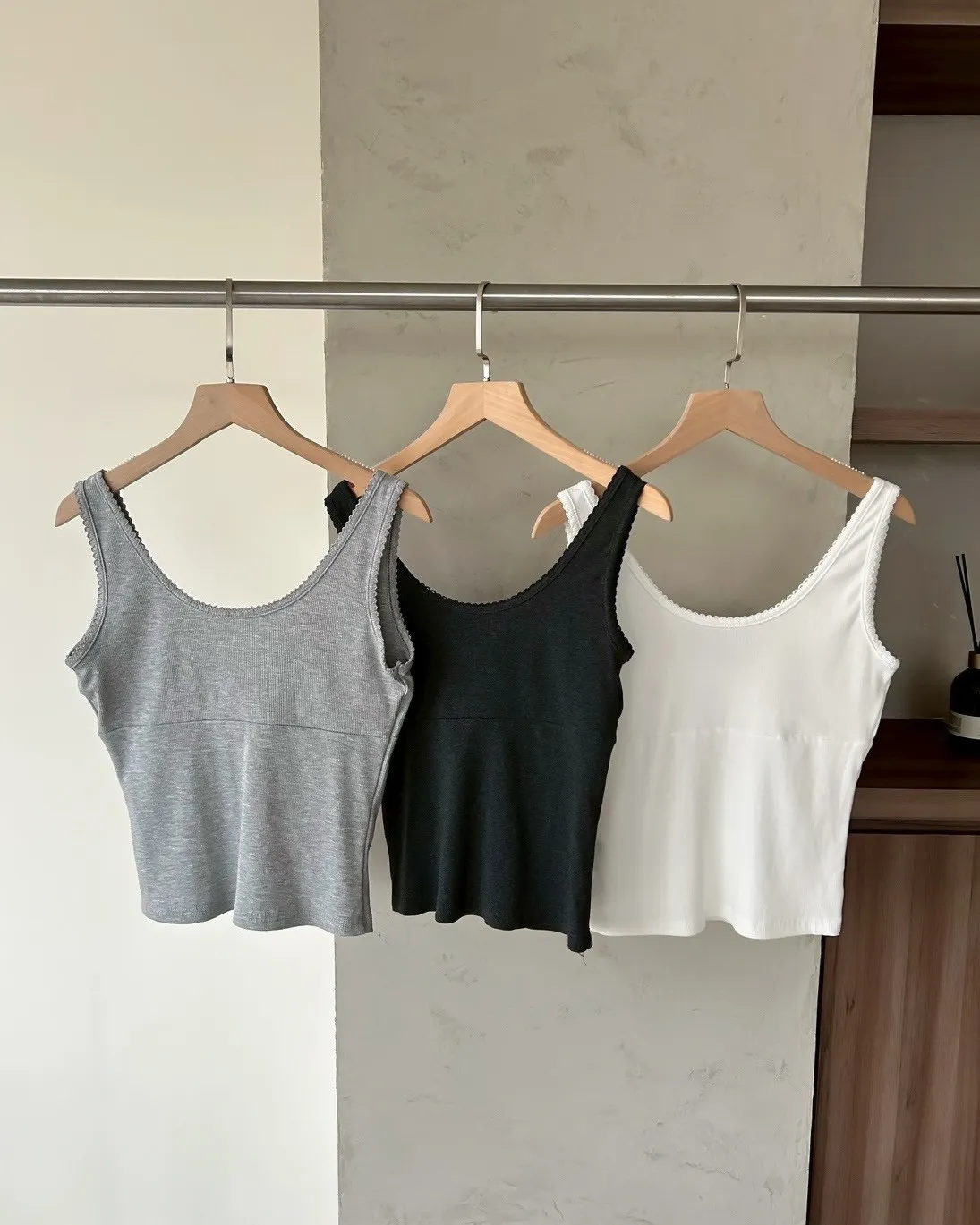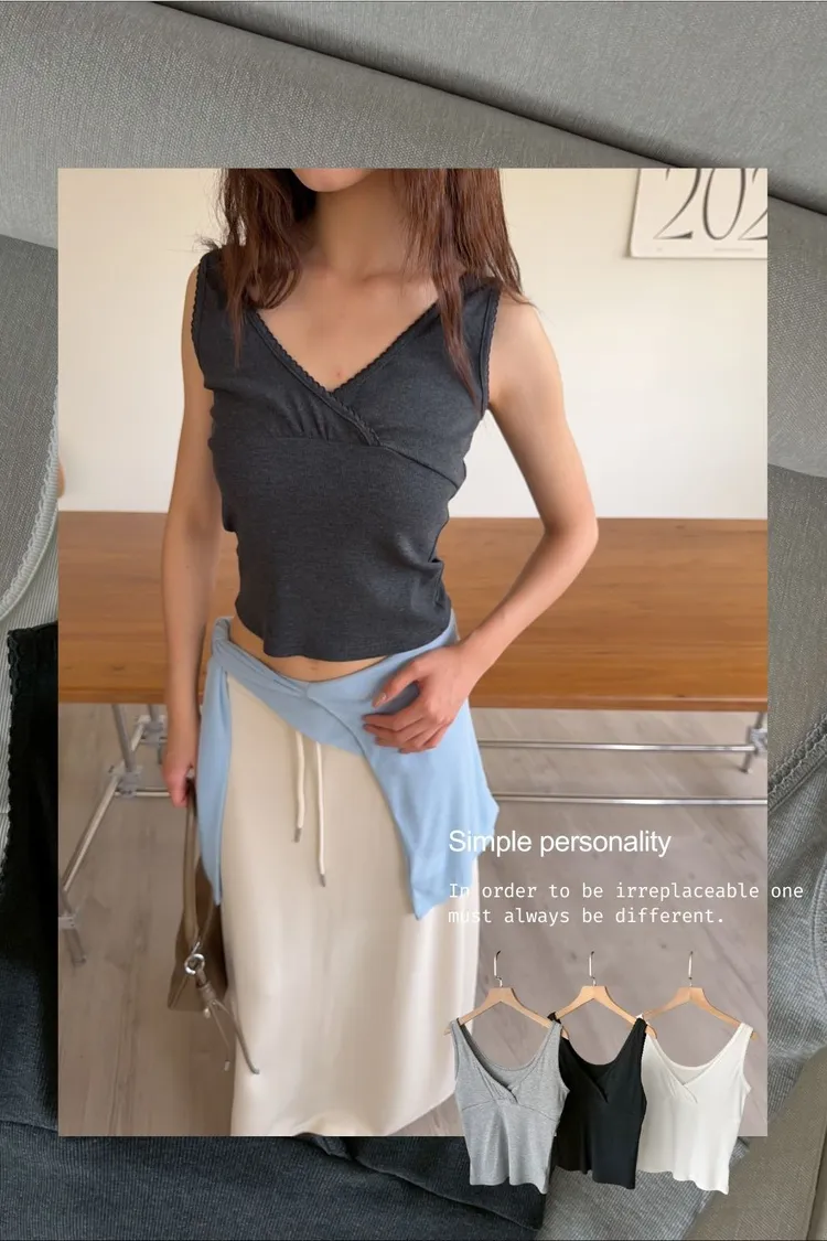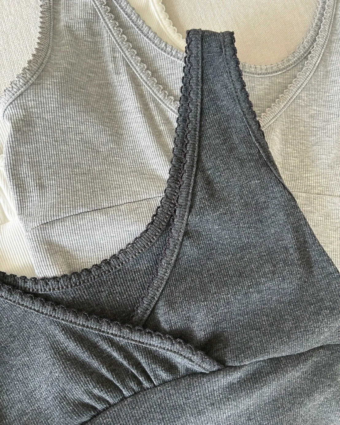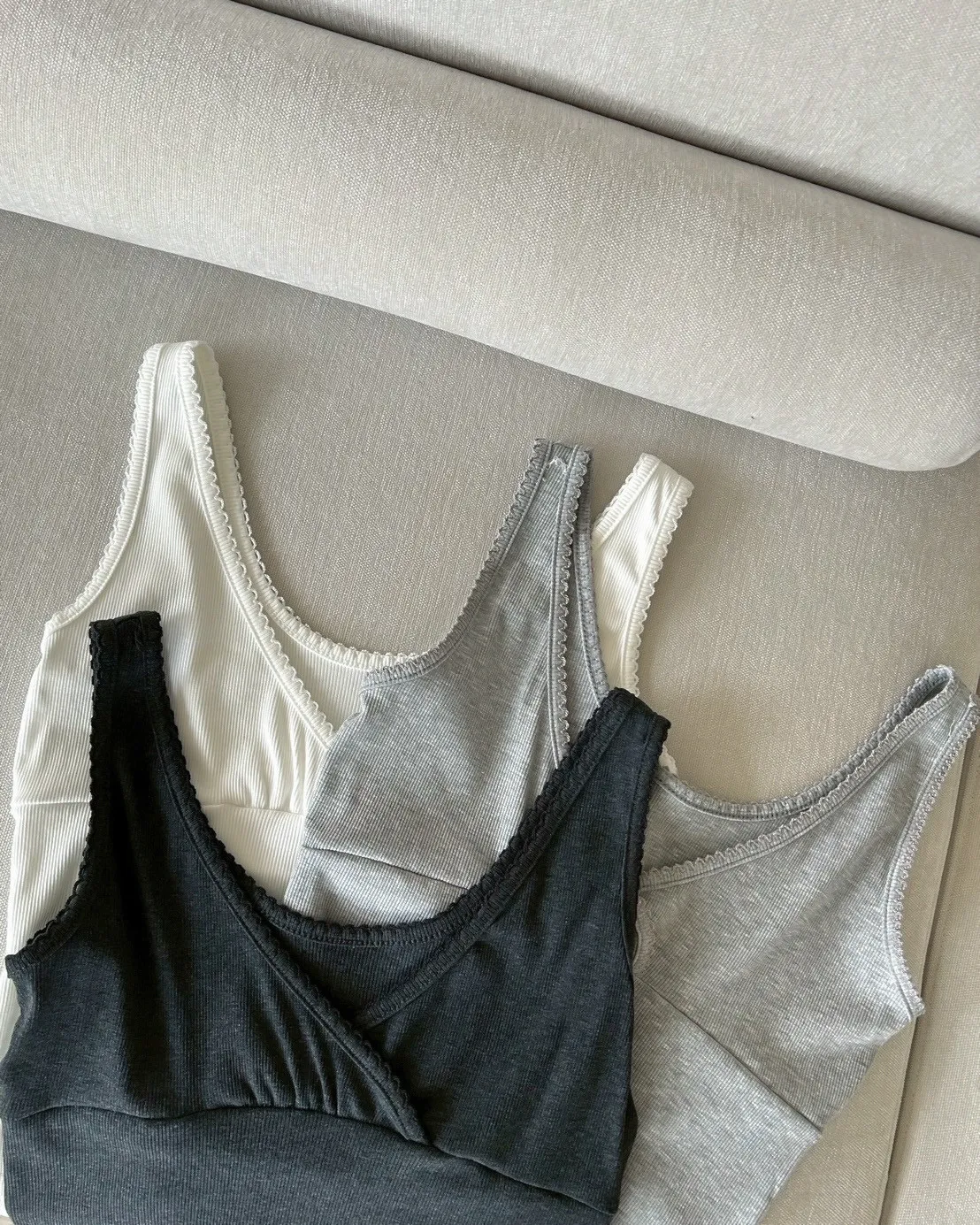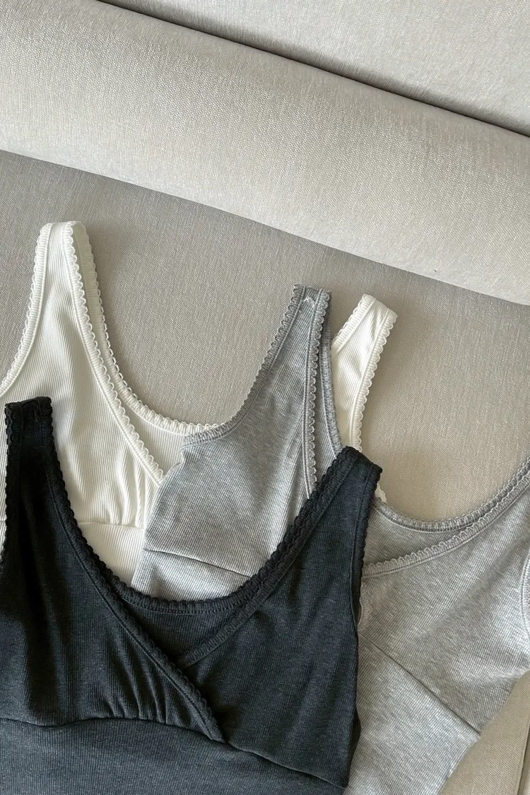 B0033法式花邊坑紋棉背心(白/灰/黑灰)