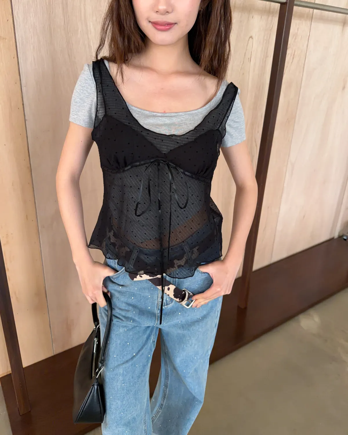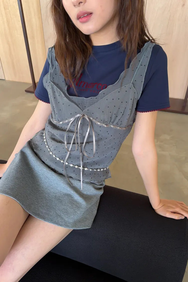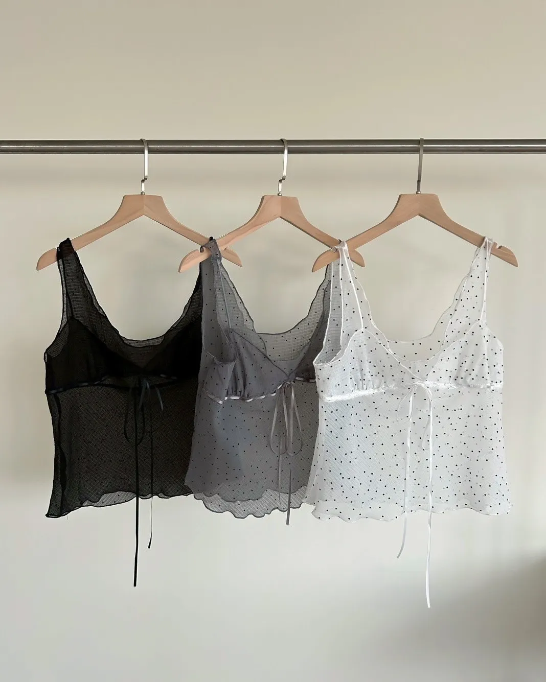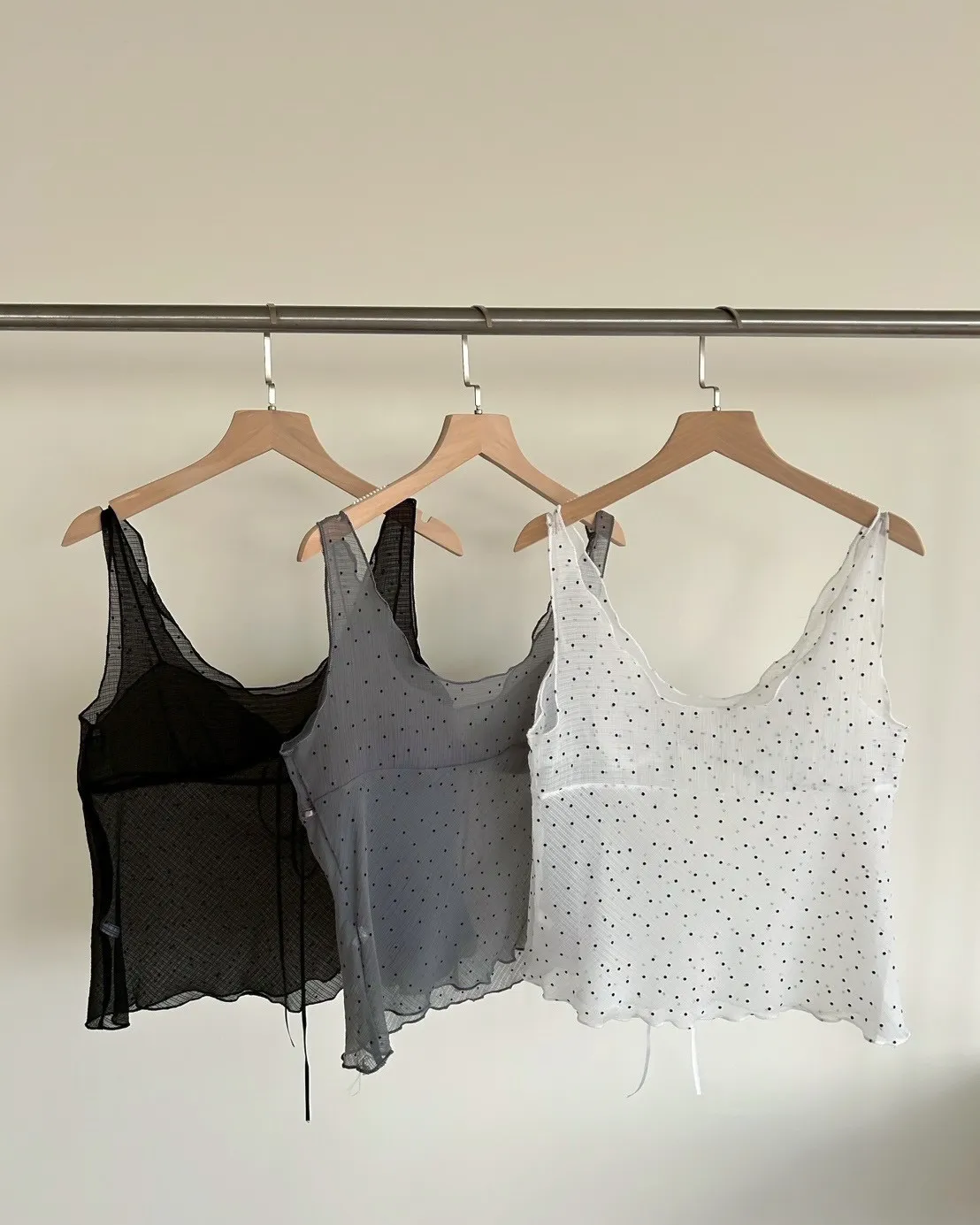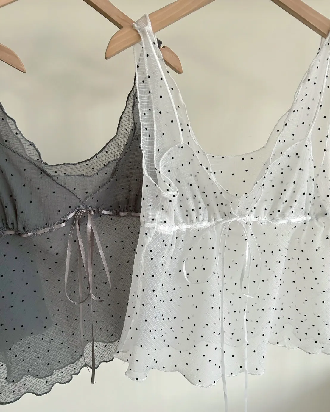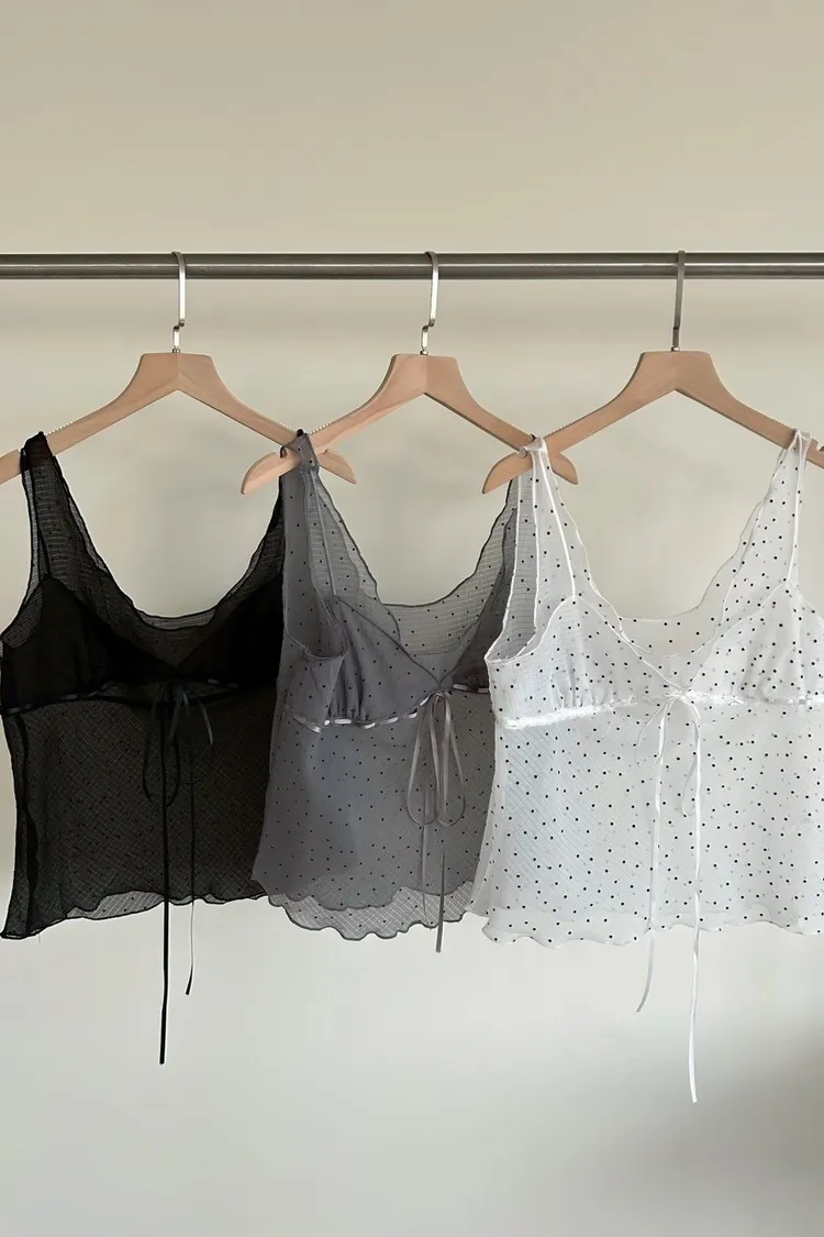 B0036波點點抽繩綁帶透紗背心(白/灰/黑)