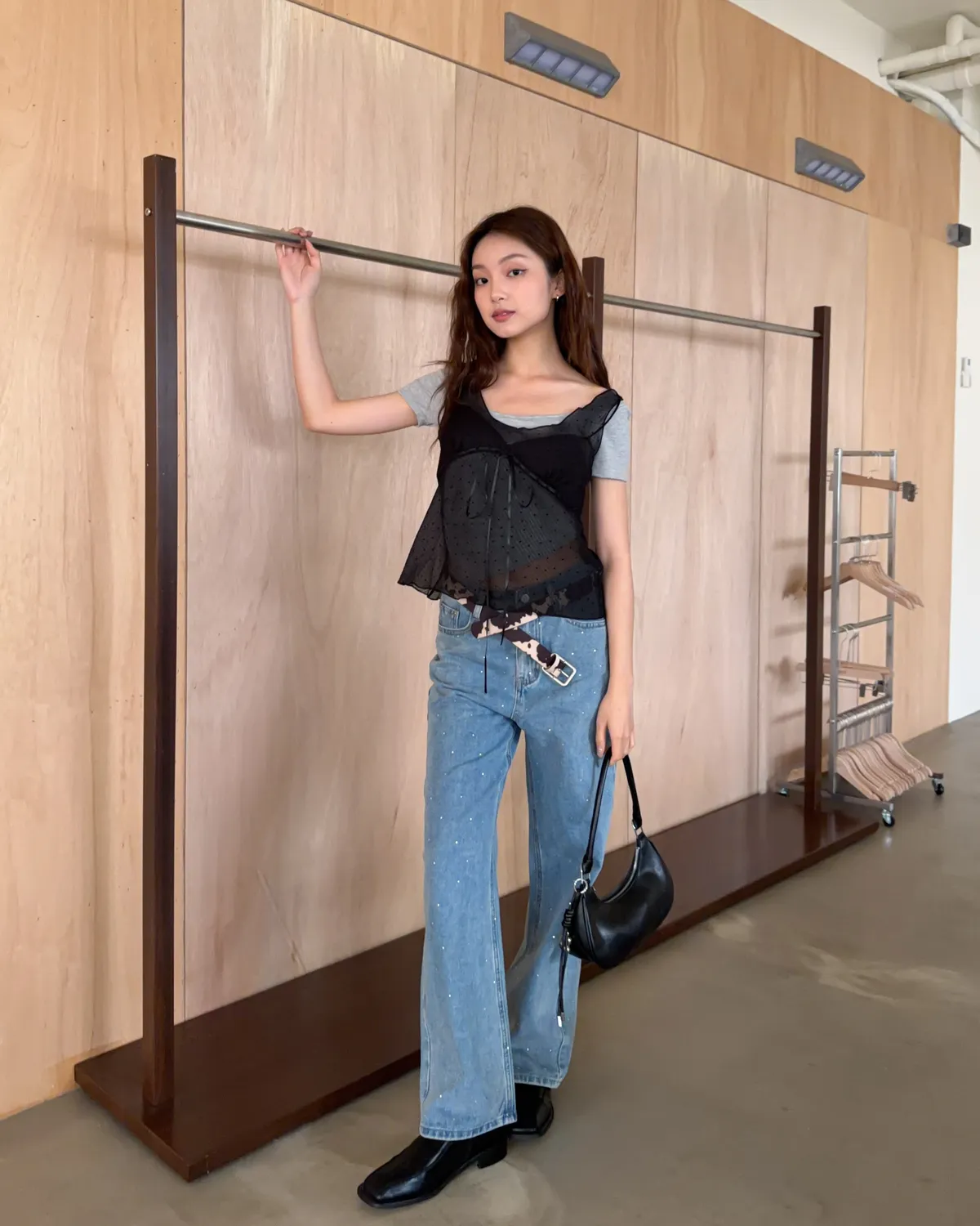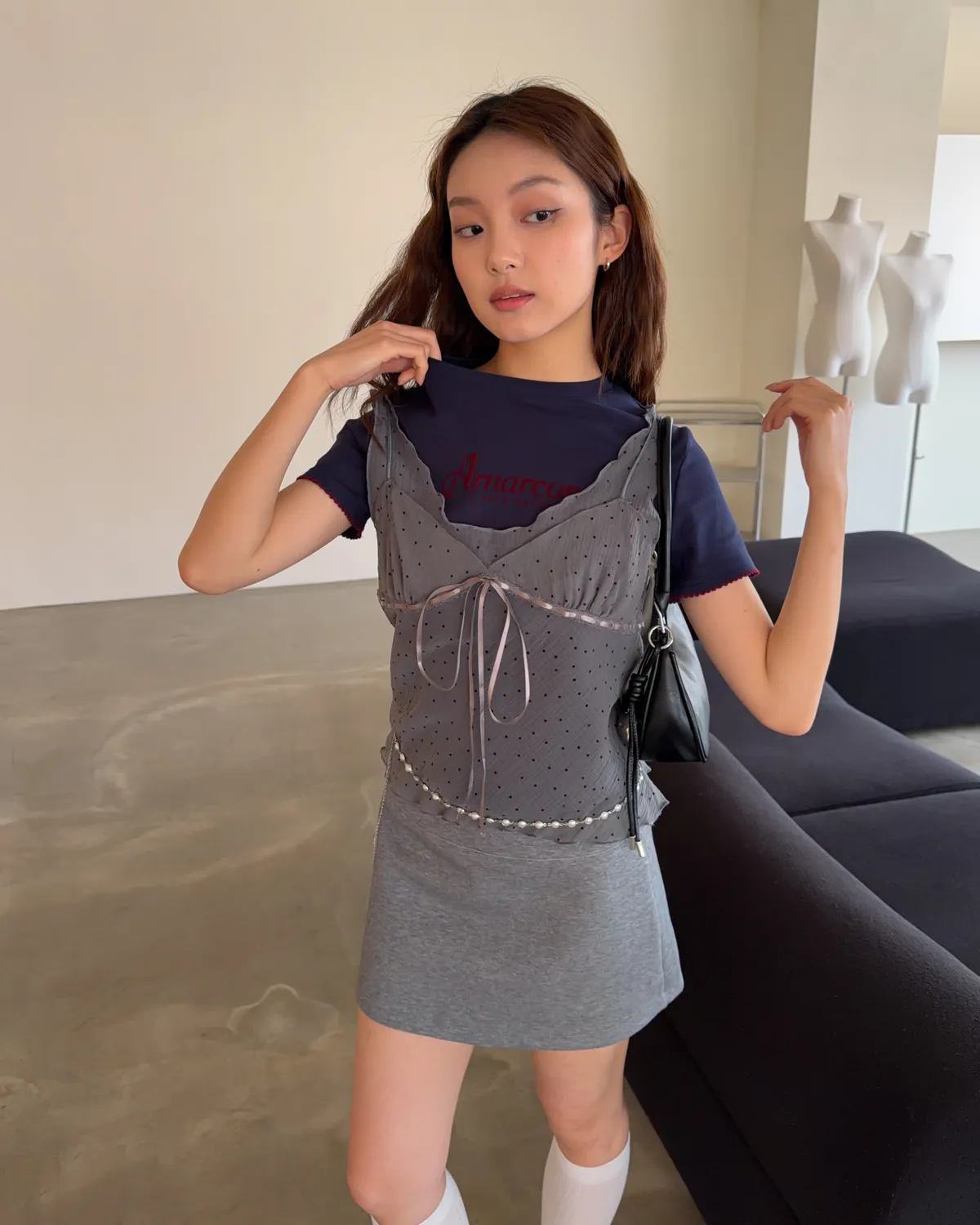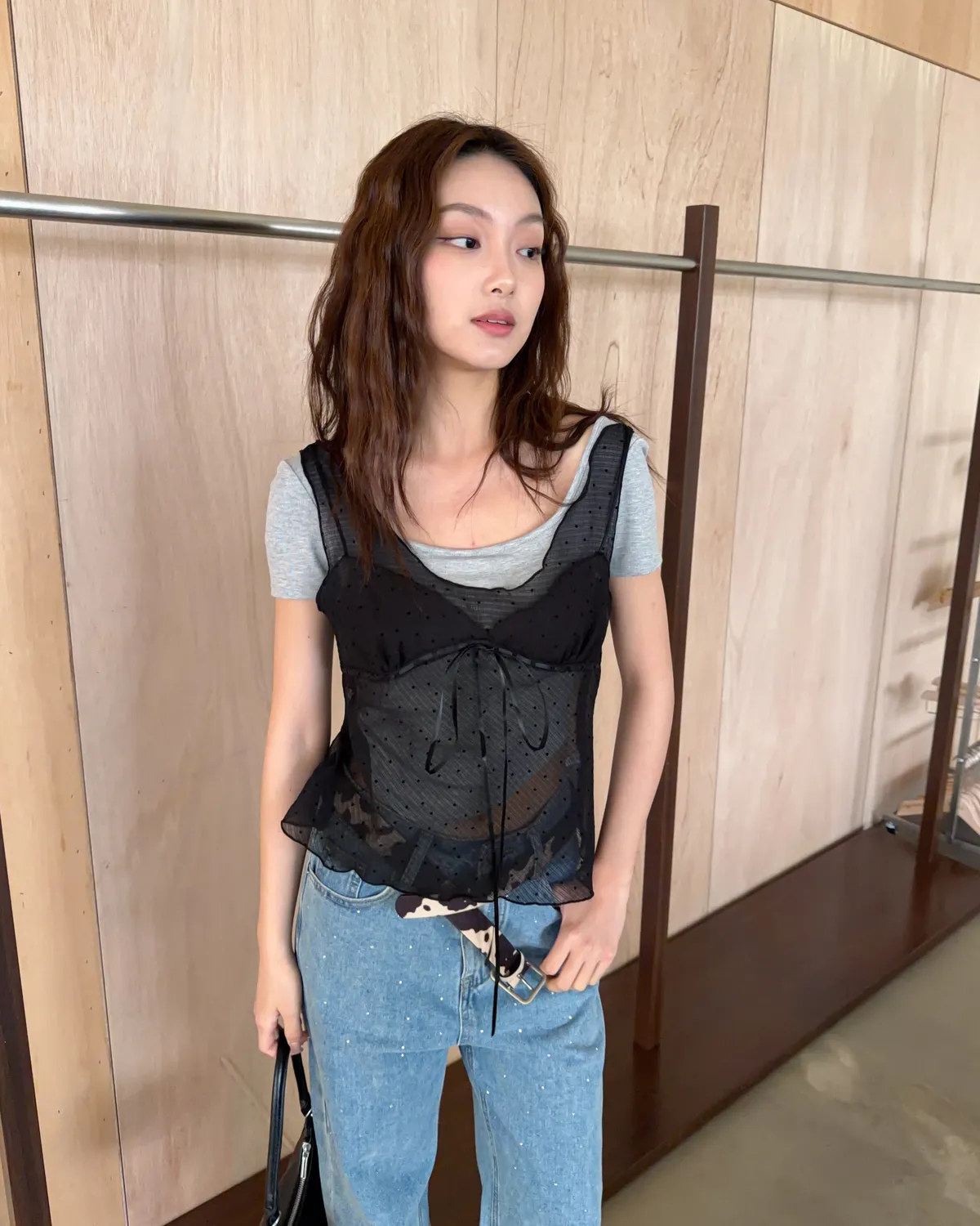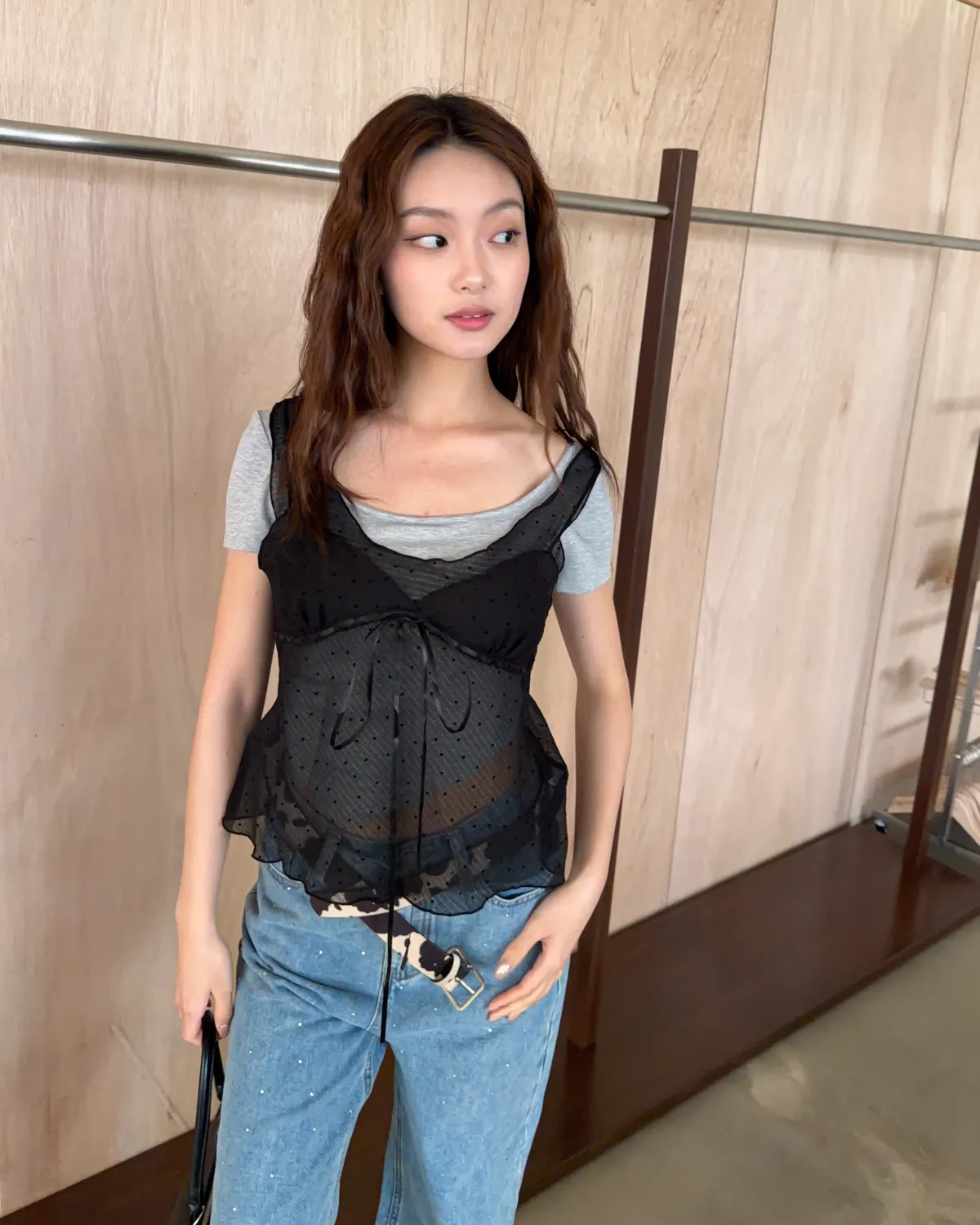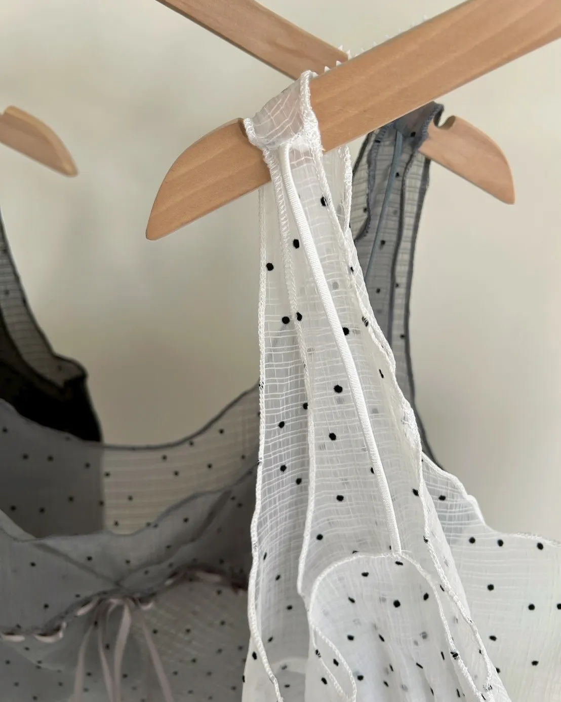 B0036波點點抽繩綁帶透紗背心(白/灰/黑)