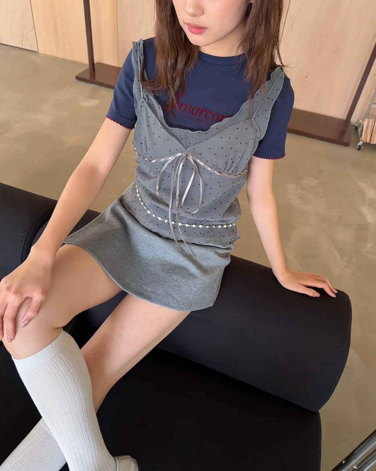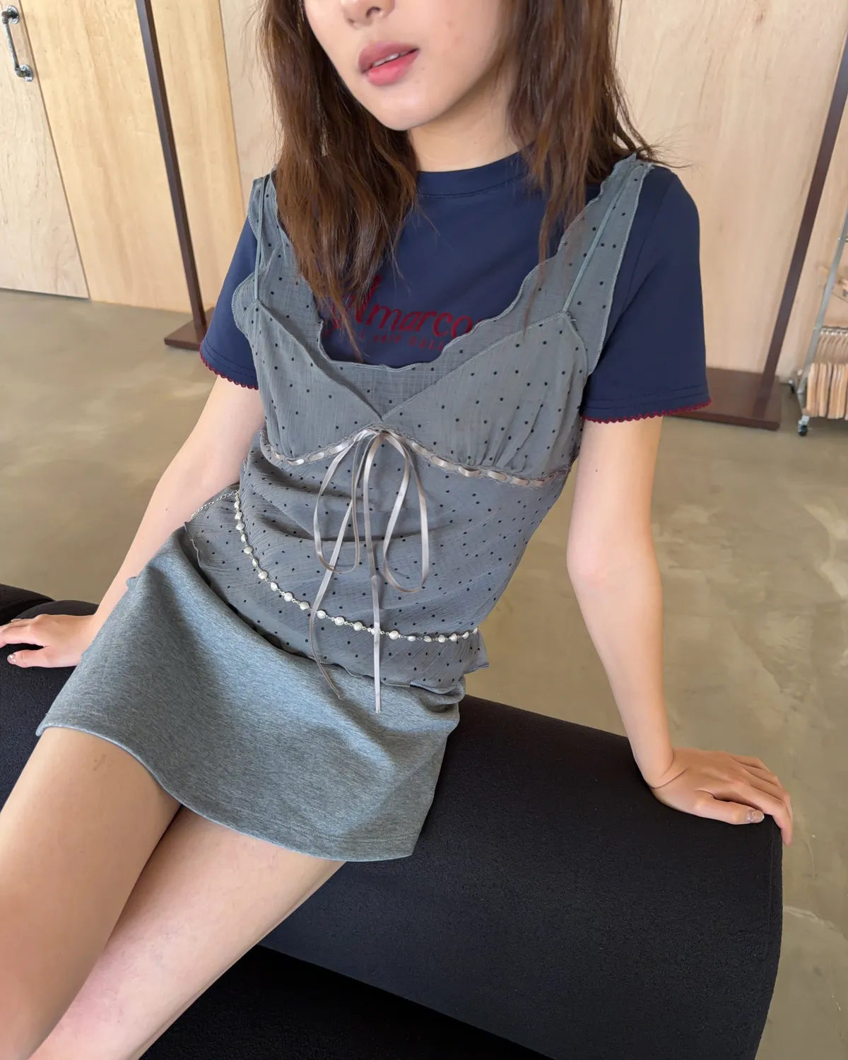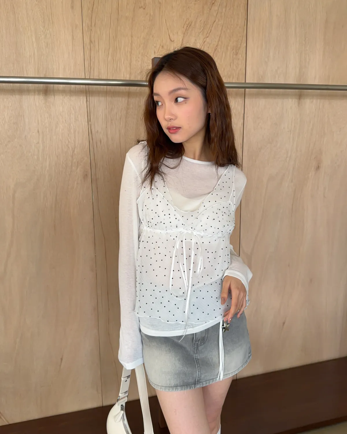 薄透紗 點點造型 前抽繩綁帶 可抽緊 肩膀前面彈性繩裝飾