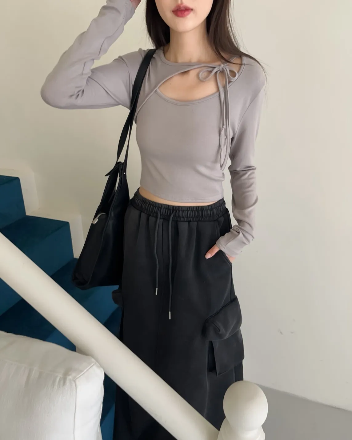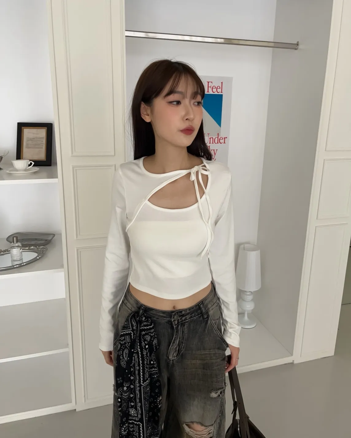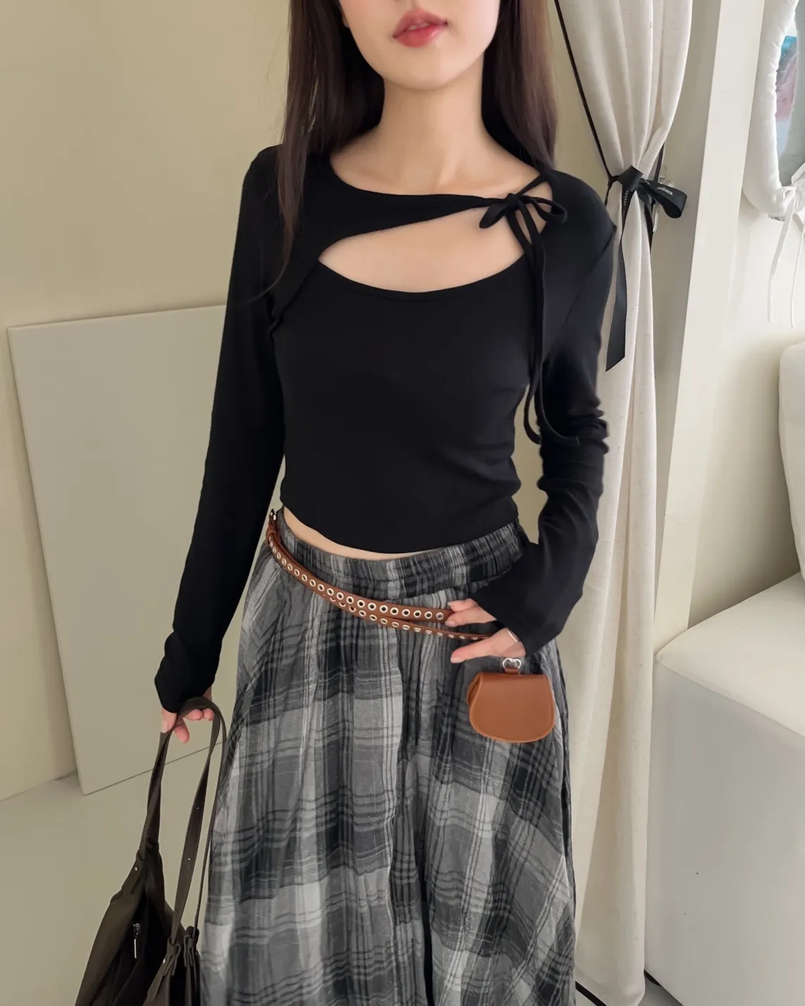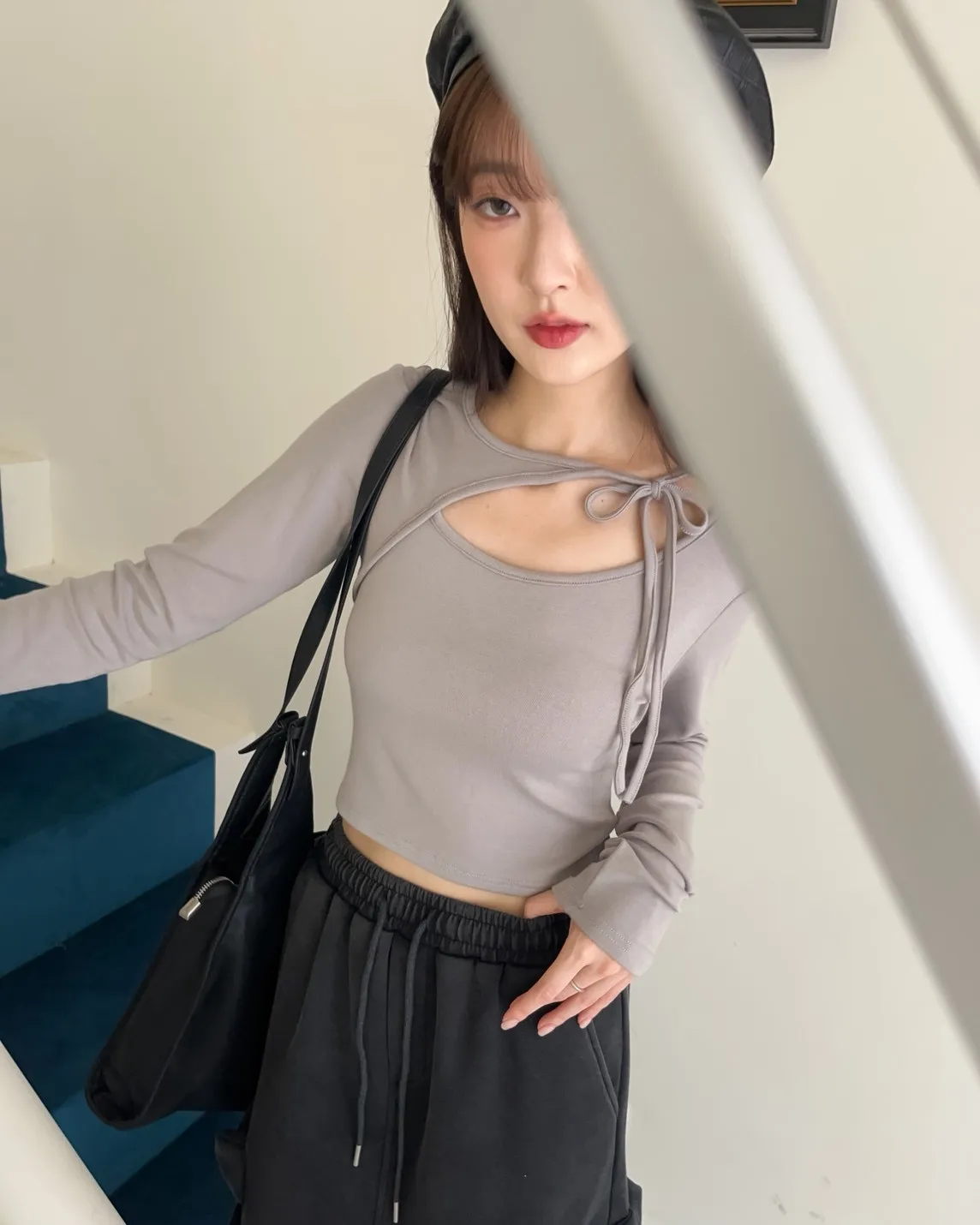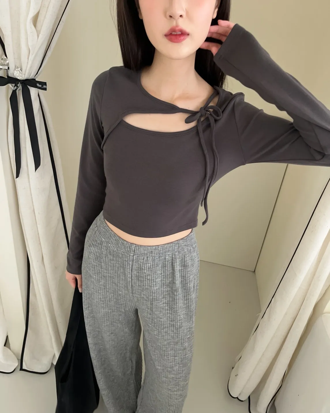領口挖洞 綁帶造型 棉料親膚彈性好~