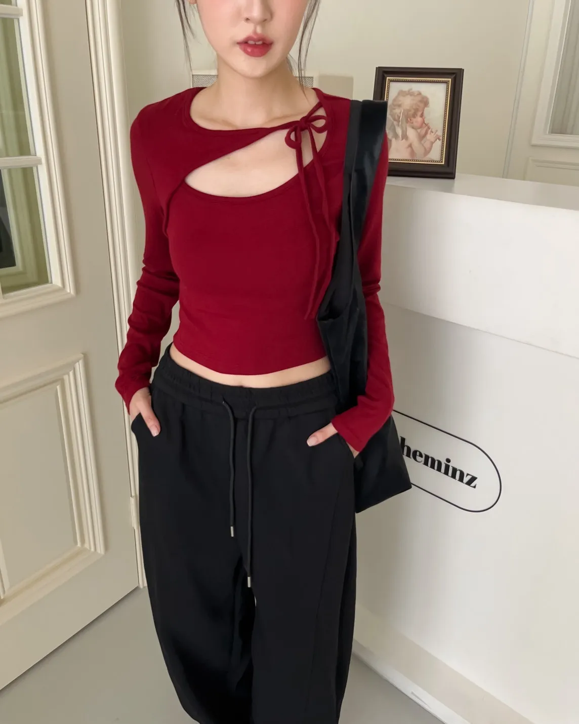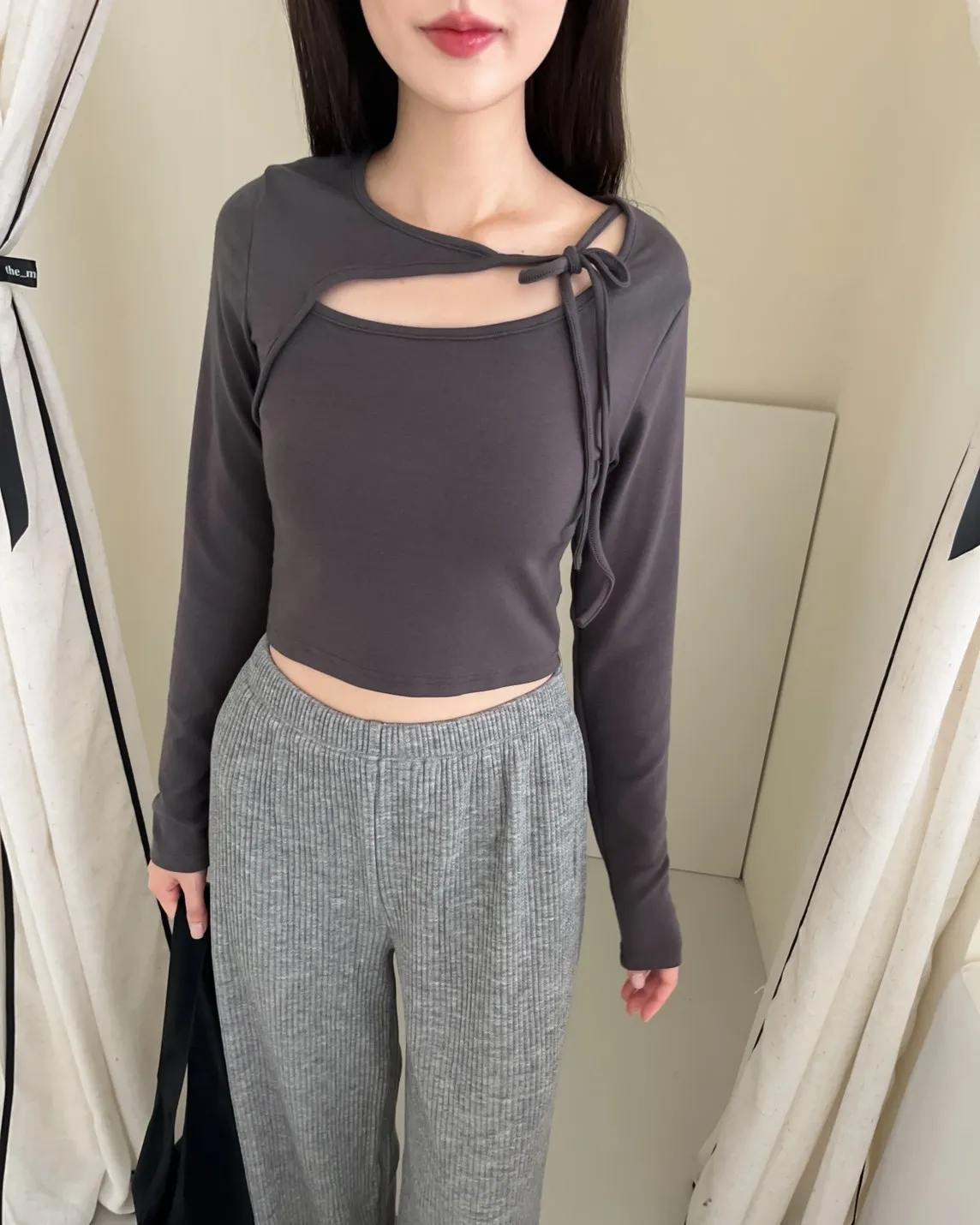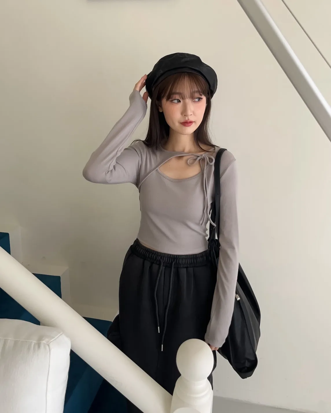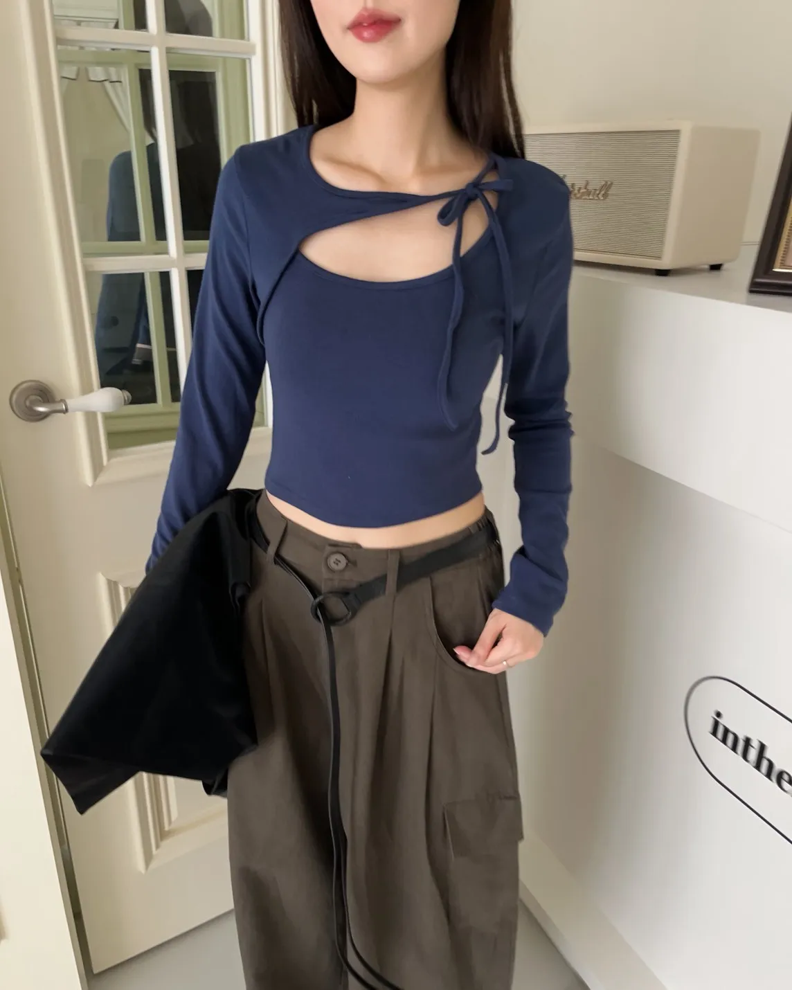 領口挖洞 綁帶造型 棉料親膚彈性好~