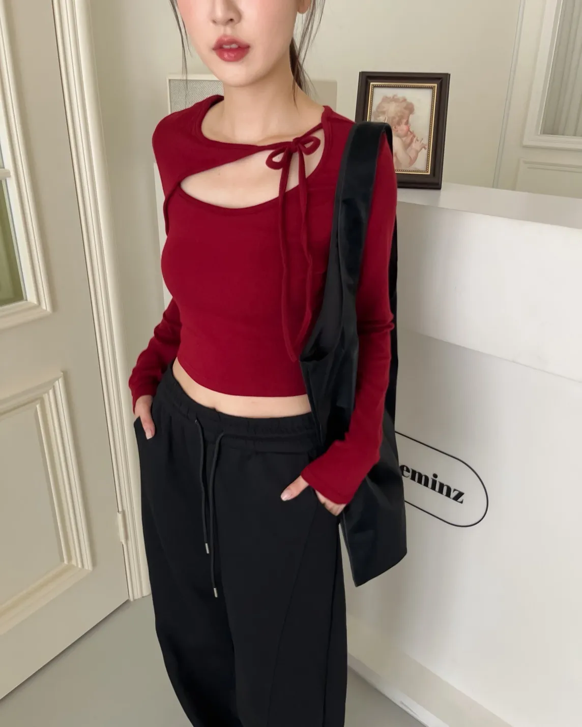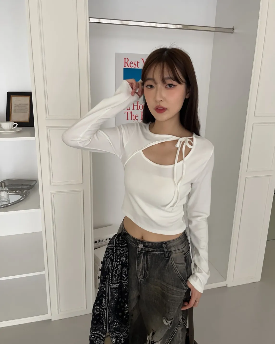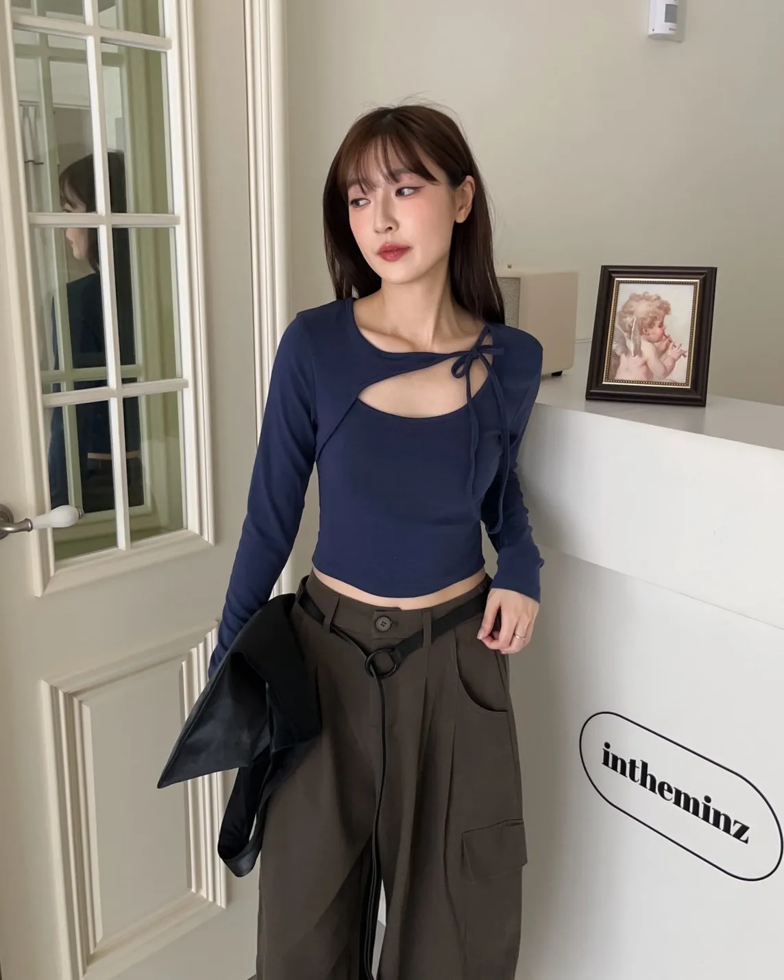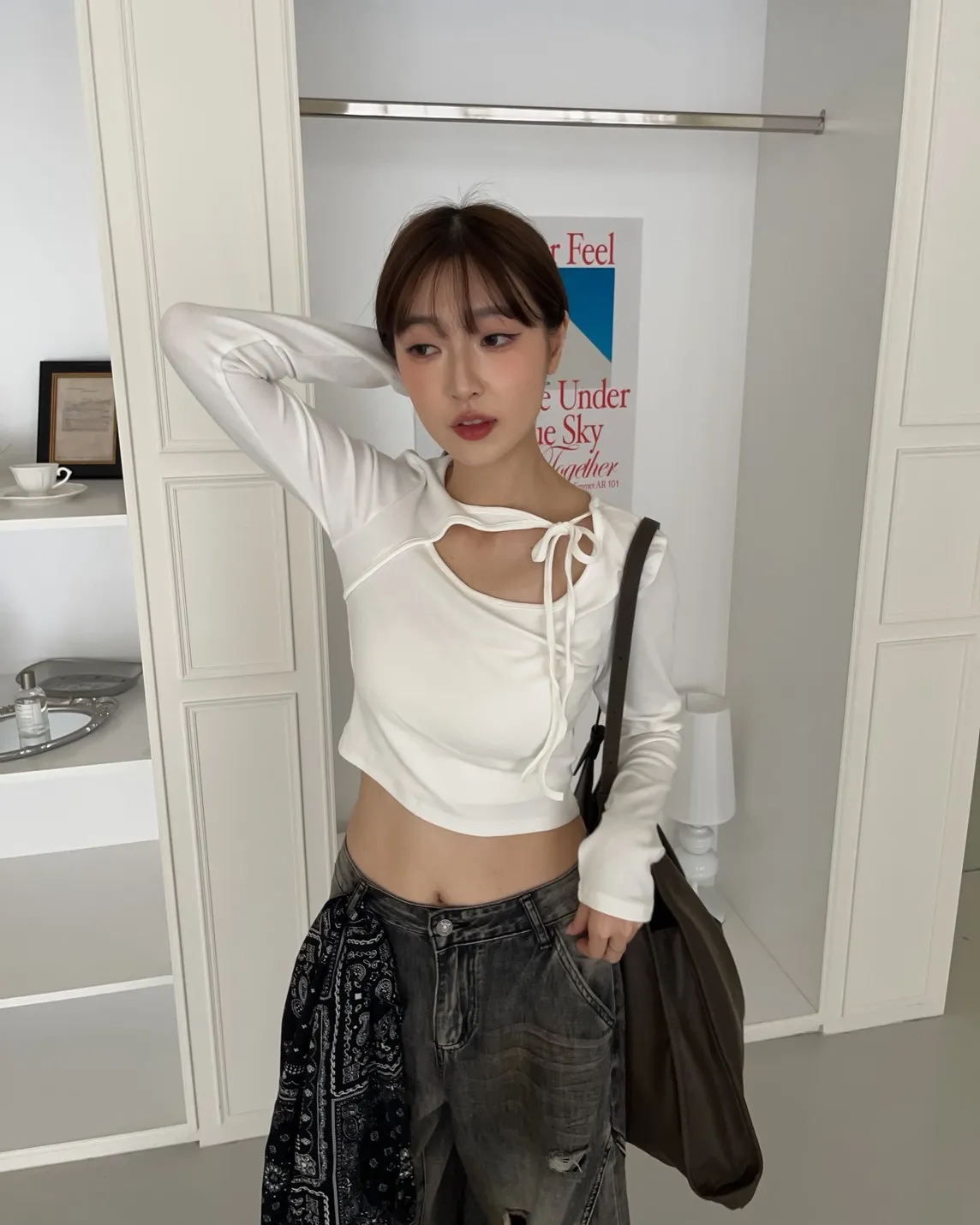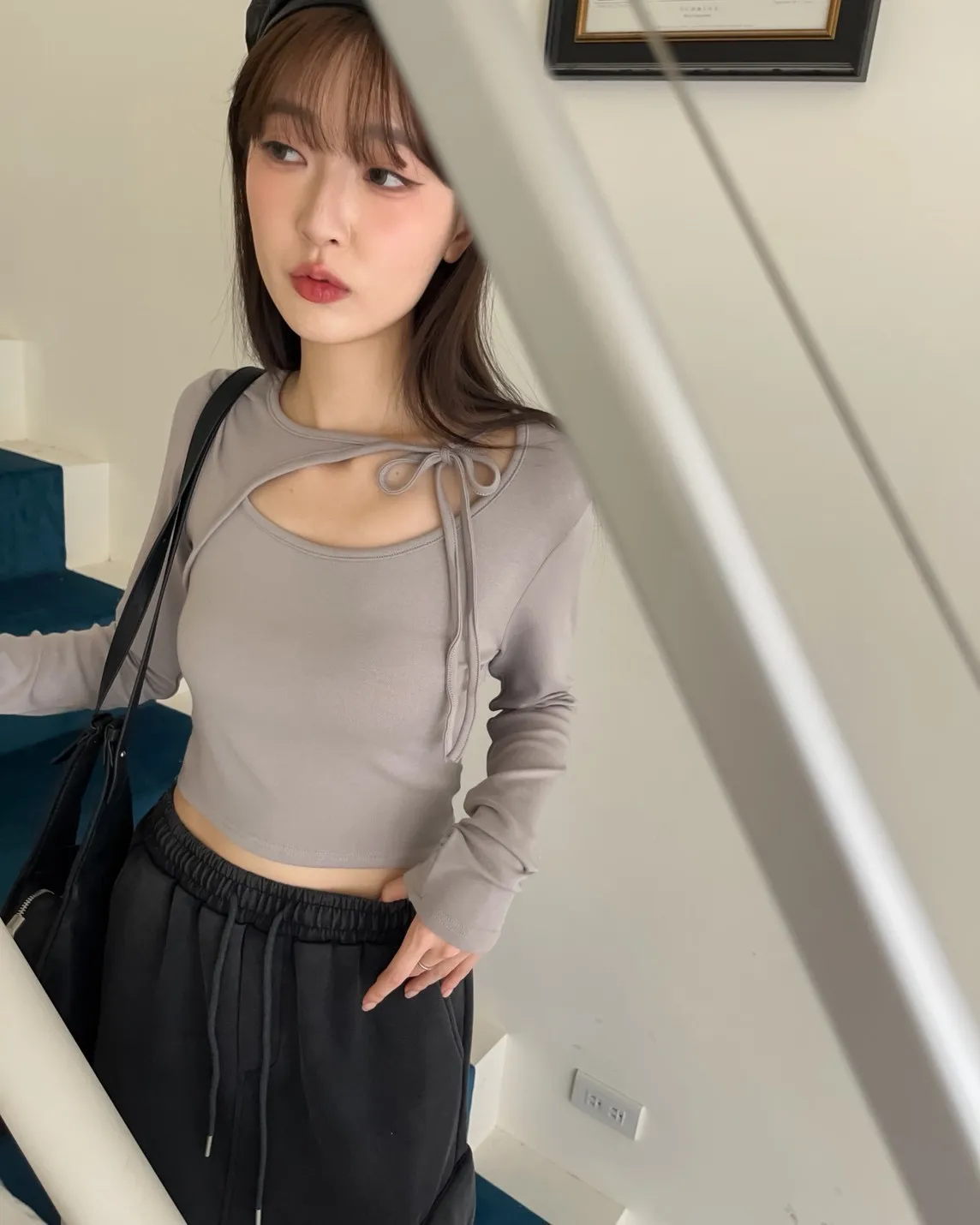 領口挖洞 綁帶造型 棉料親膚彈性好~