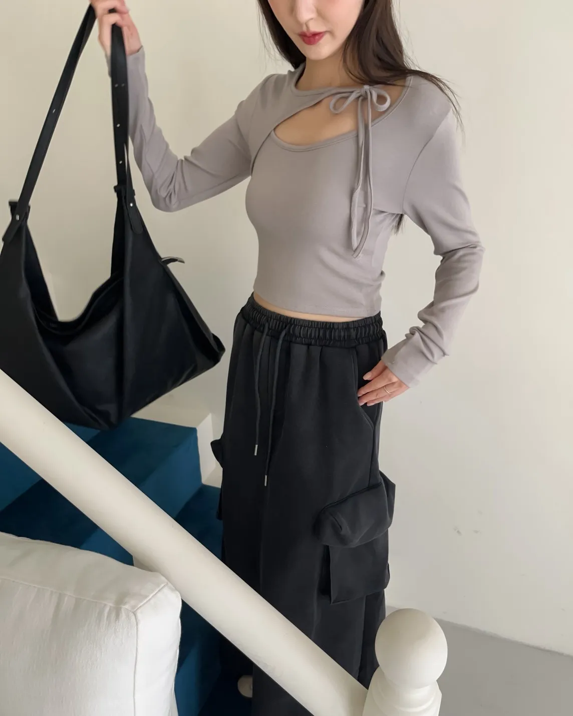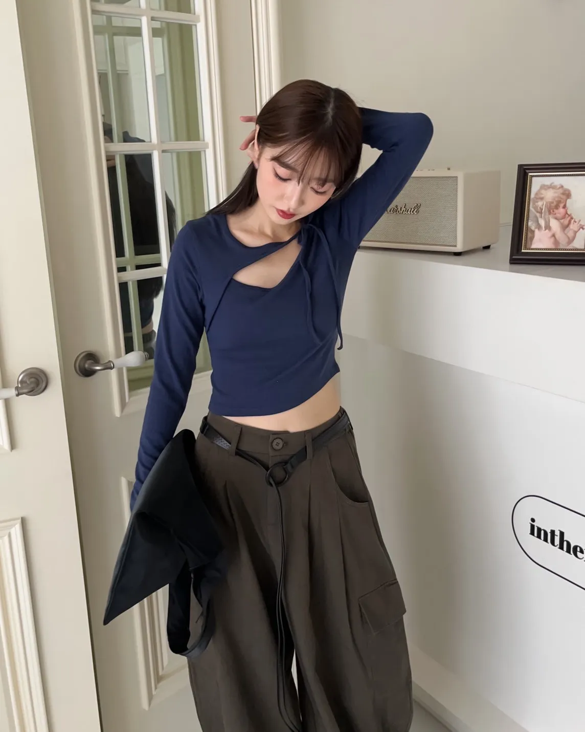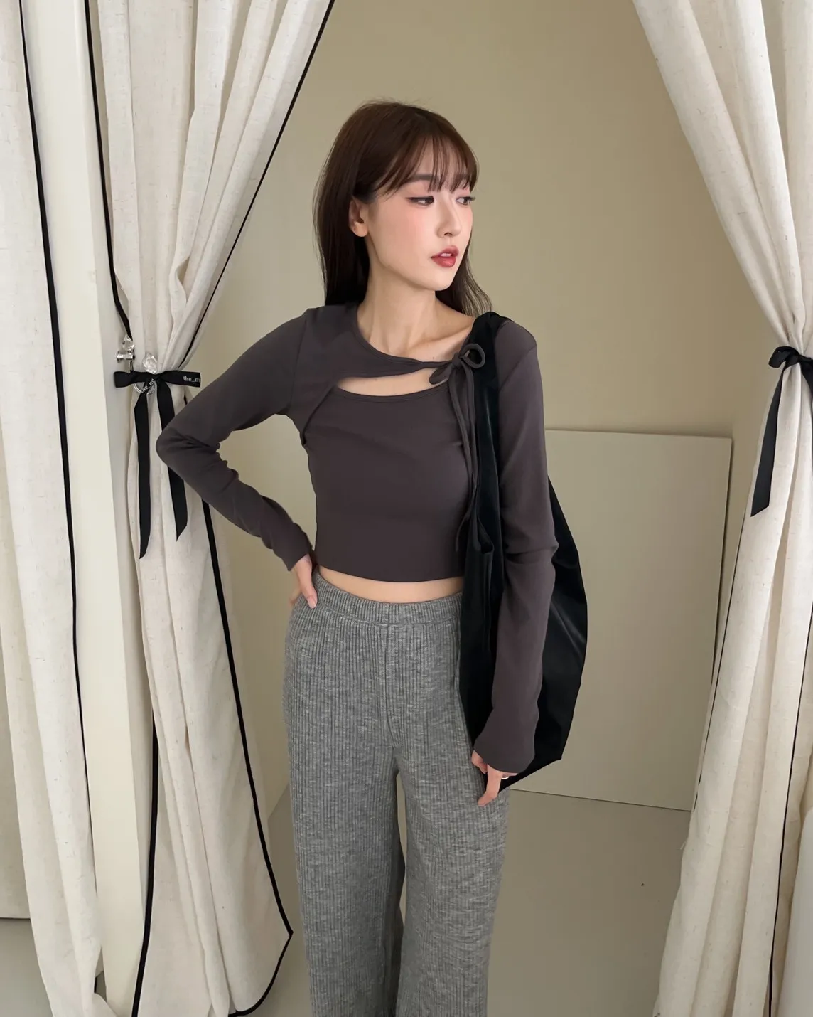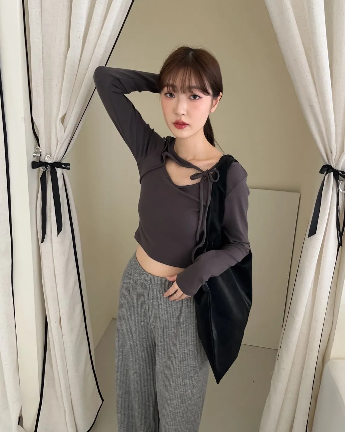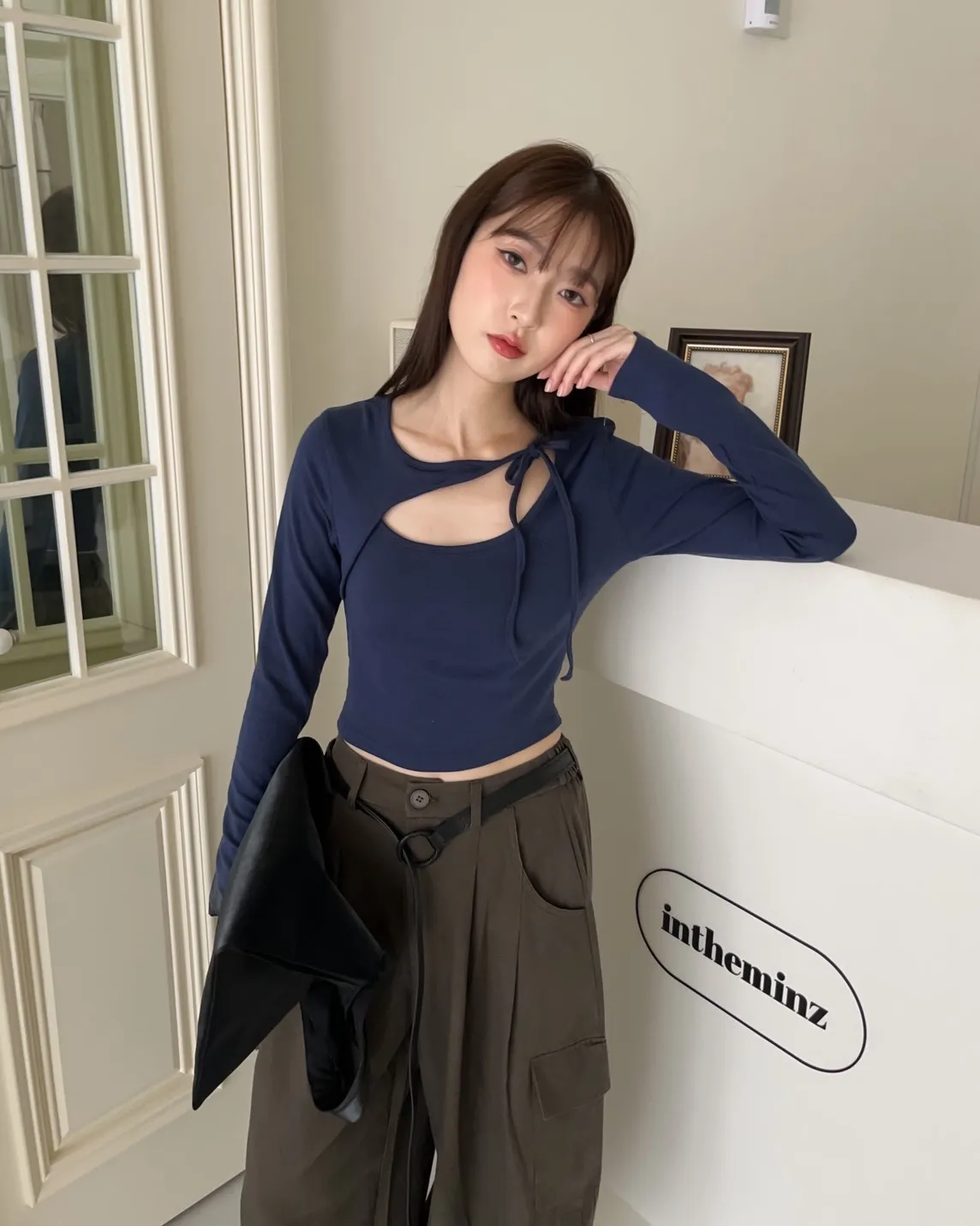 領口挖洞 綁帶造型 棉料親膚彈性好~