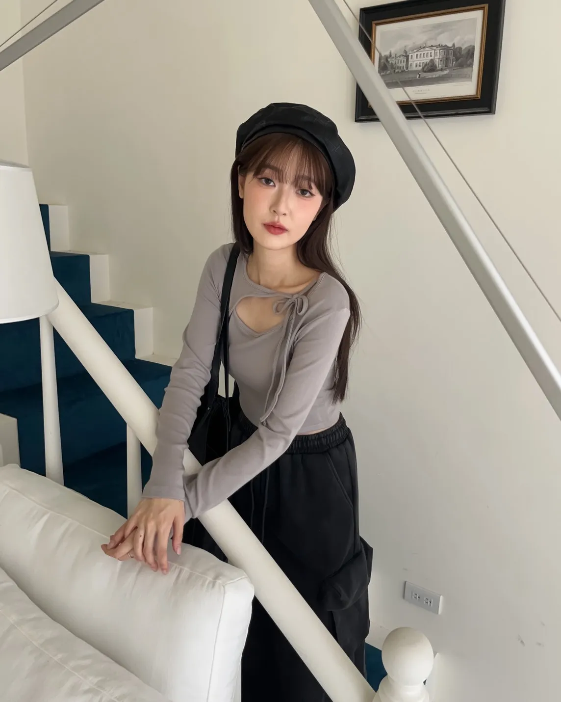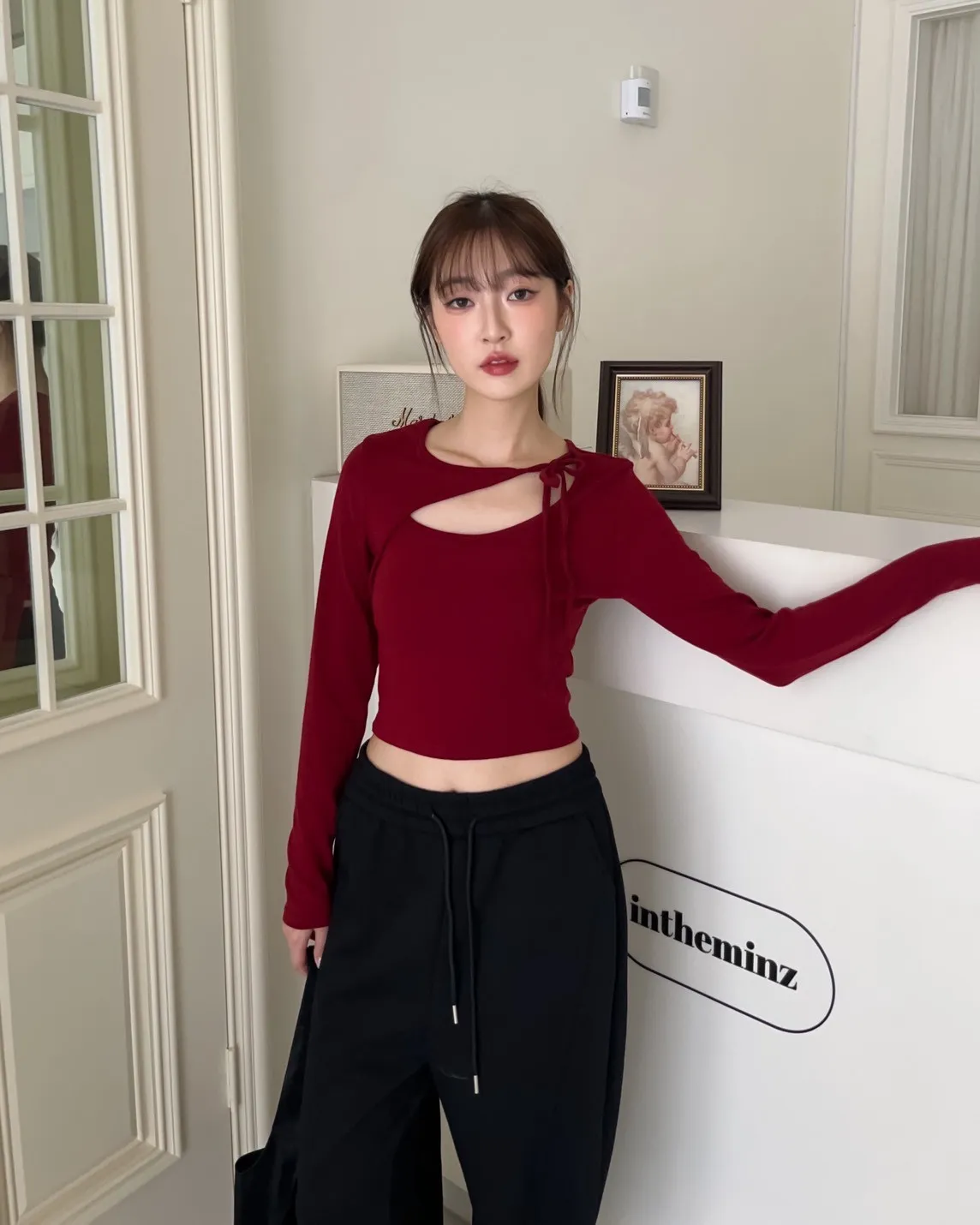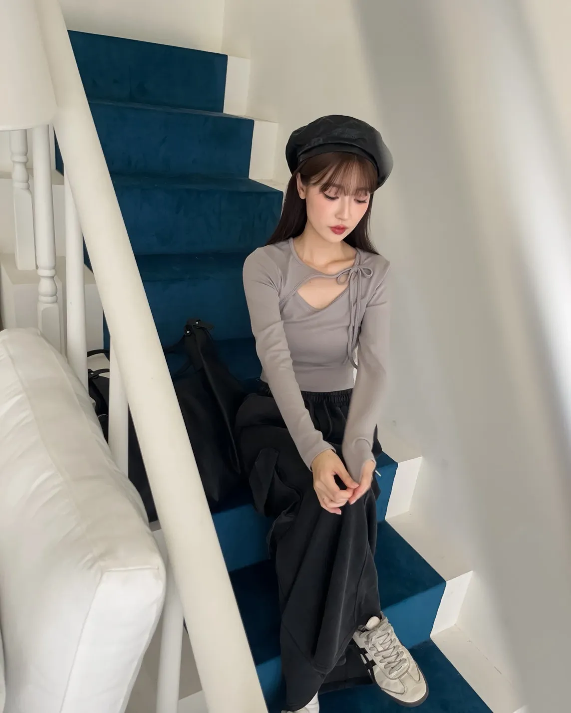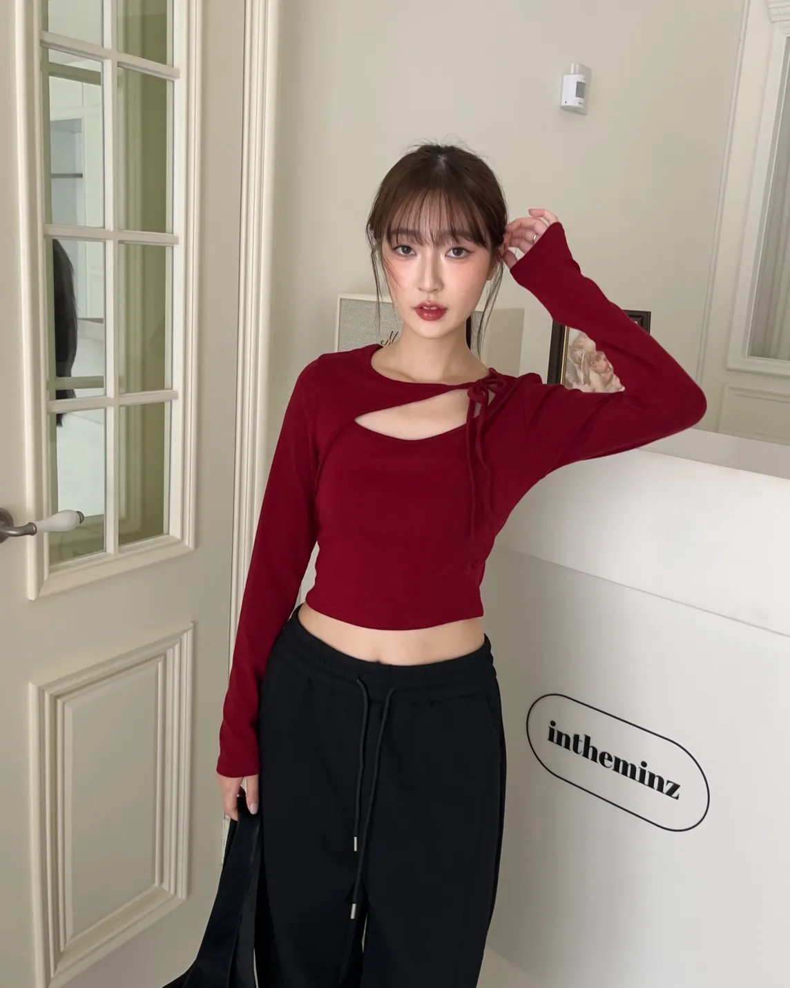 領口挖洞 綁帶造型 棉料親膚彈性好~