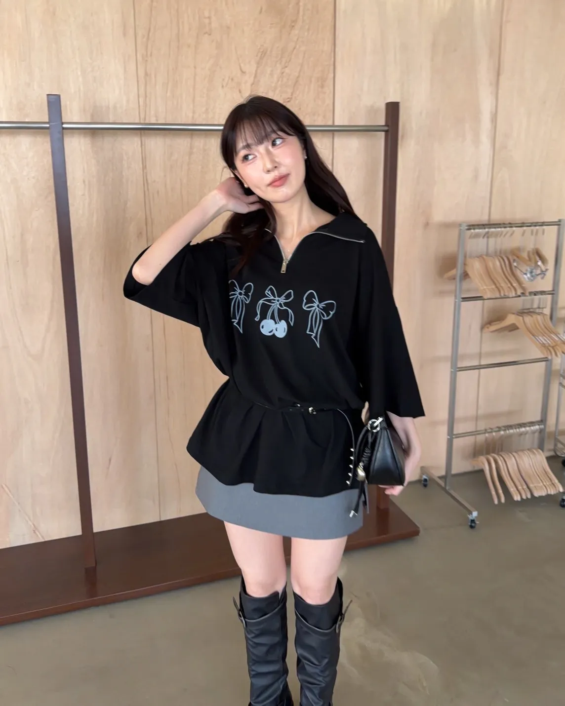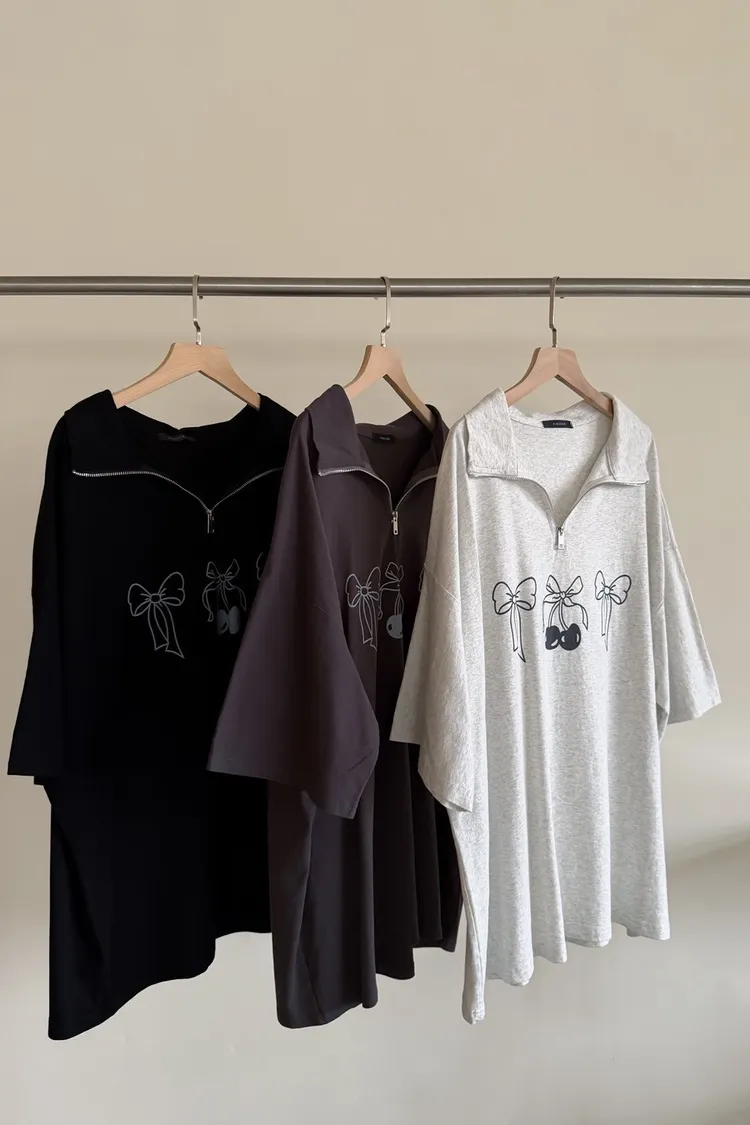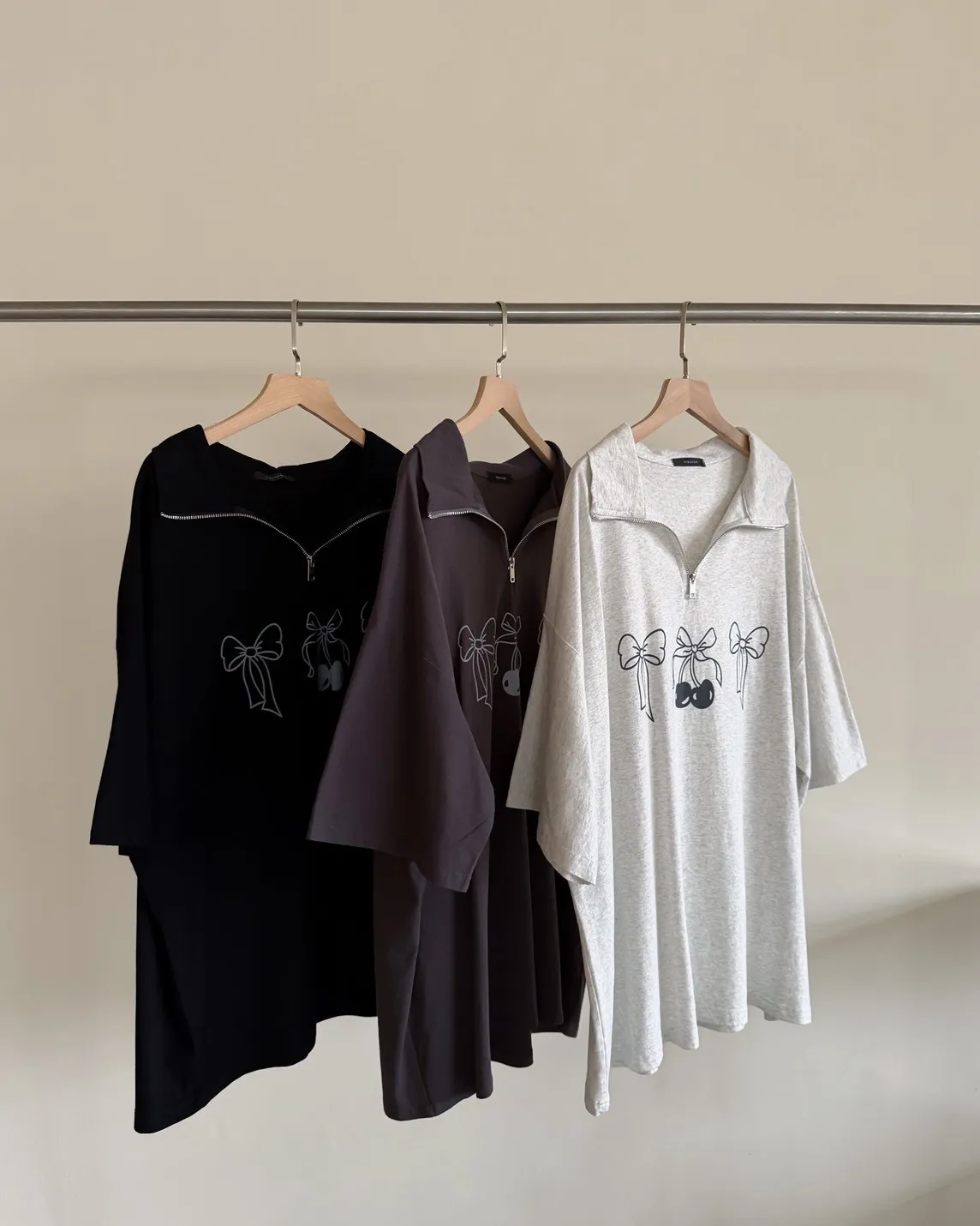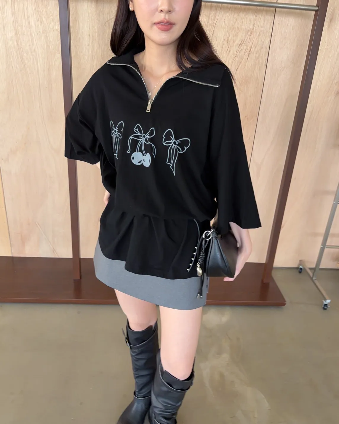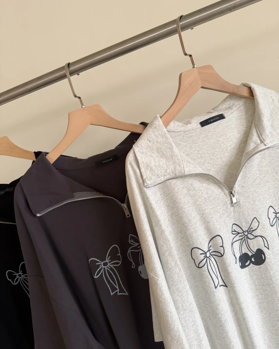 拉鍊領口 可高領/翻領 灰色調 蝴蝶結+櫻桃印花 寬鬆落肩
