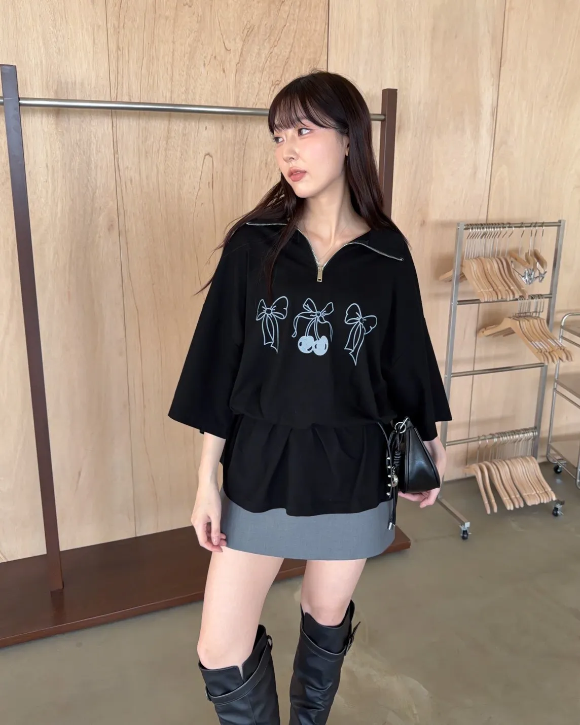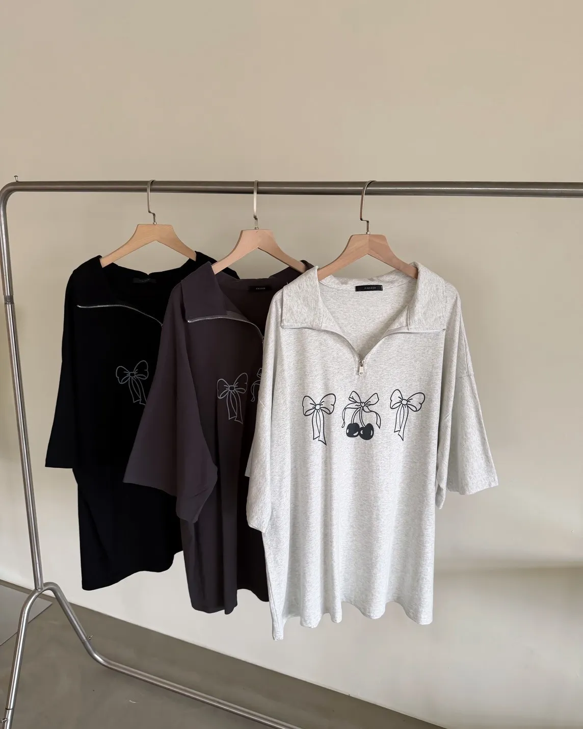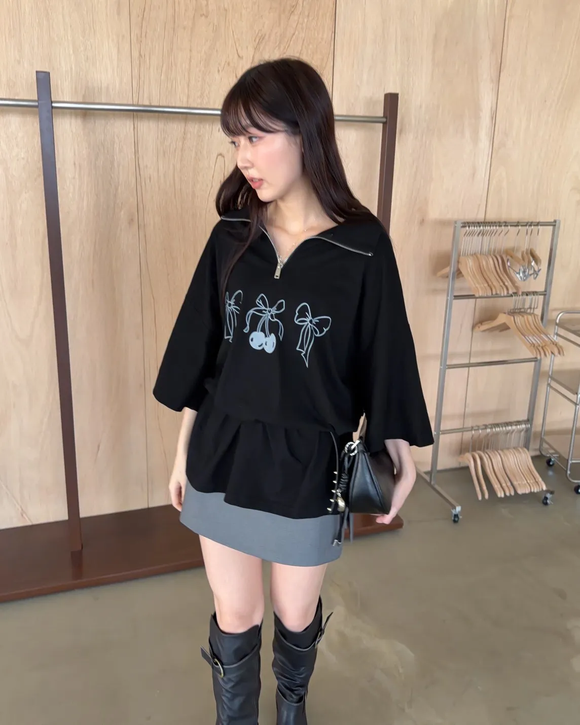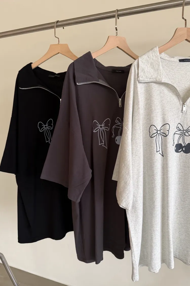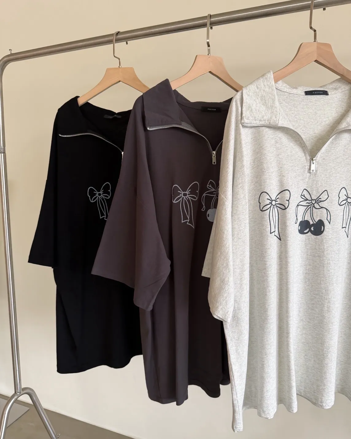 拉鍊領口 可高領/翻領 灰色調 蝴蝶結+櫻桃印花 寬鬆落肩