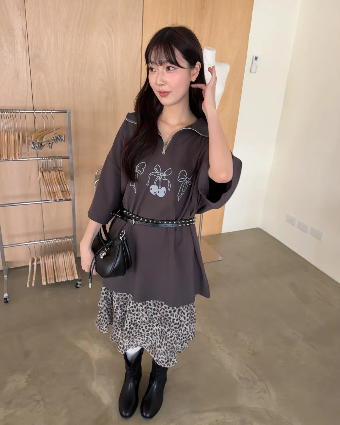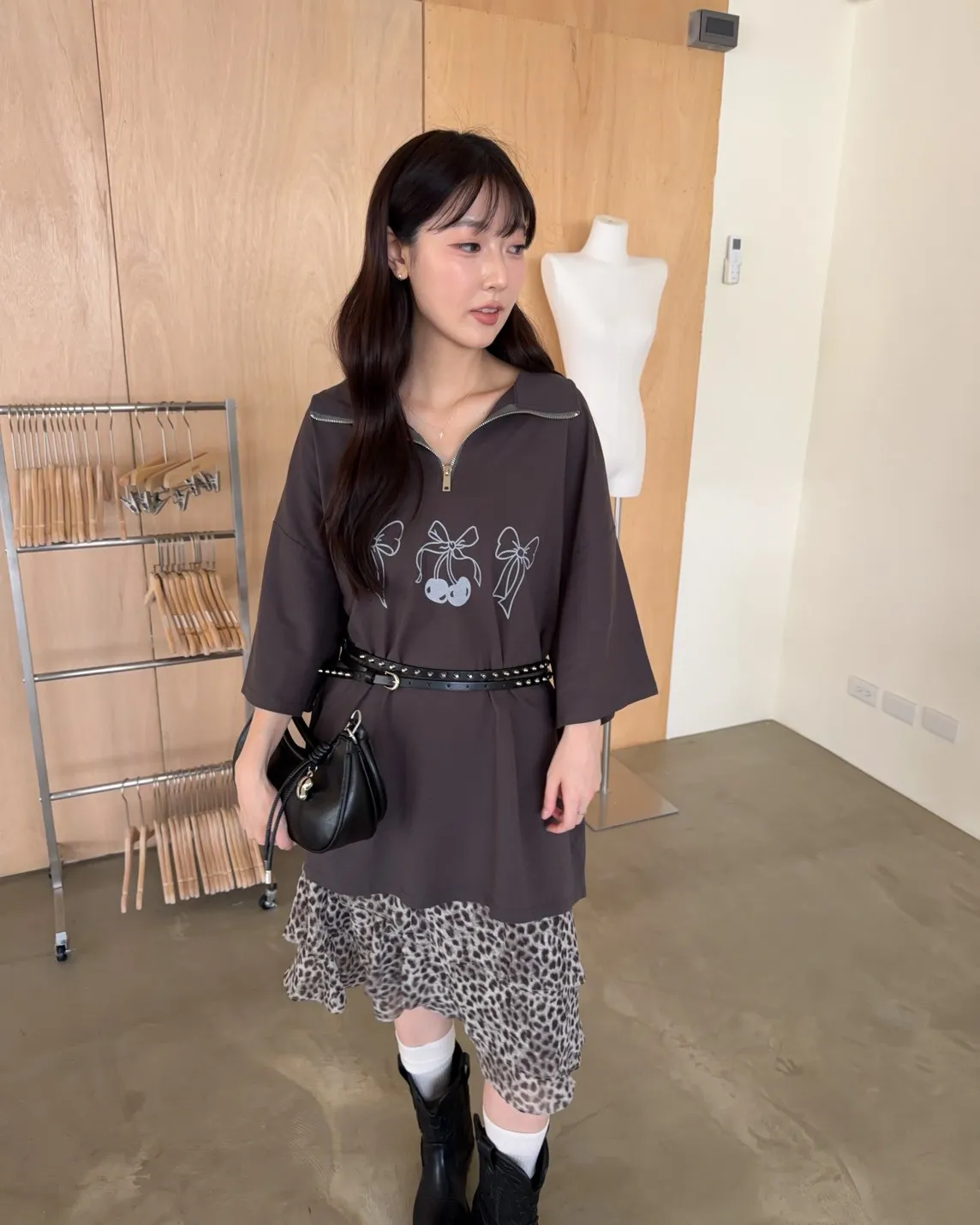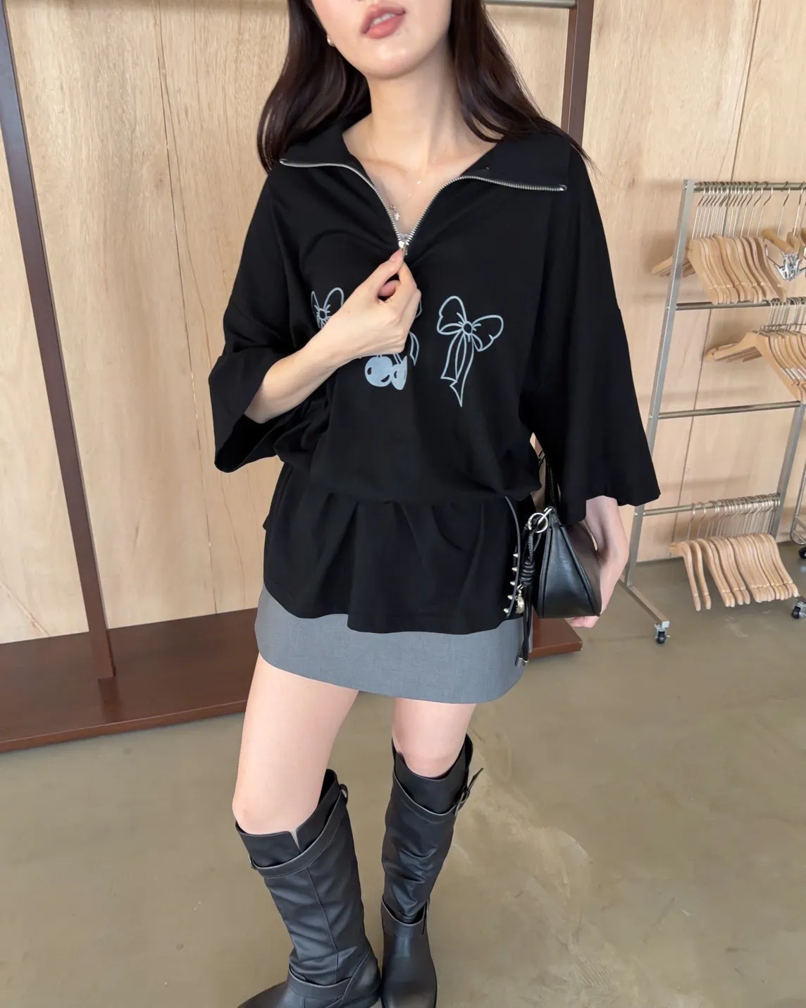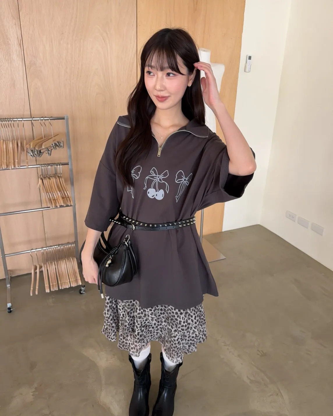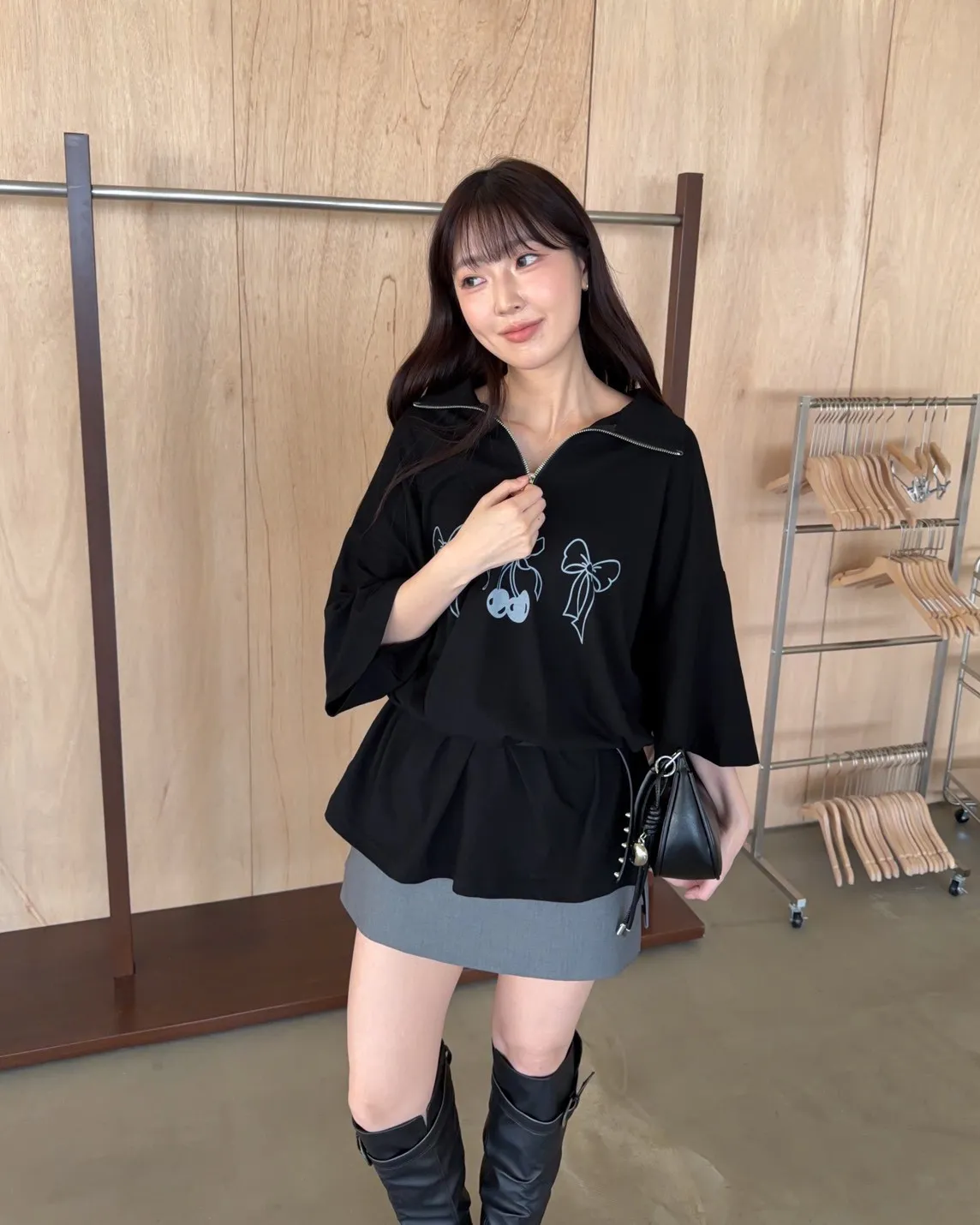 拉鍊領口 可高領/翻領 灰色調 蝴蝶結+櫻桃印花 寬鬆落肩