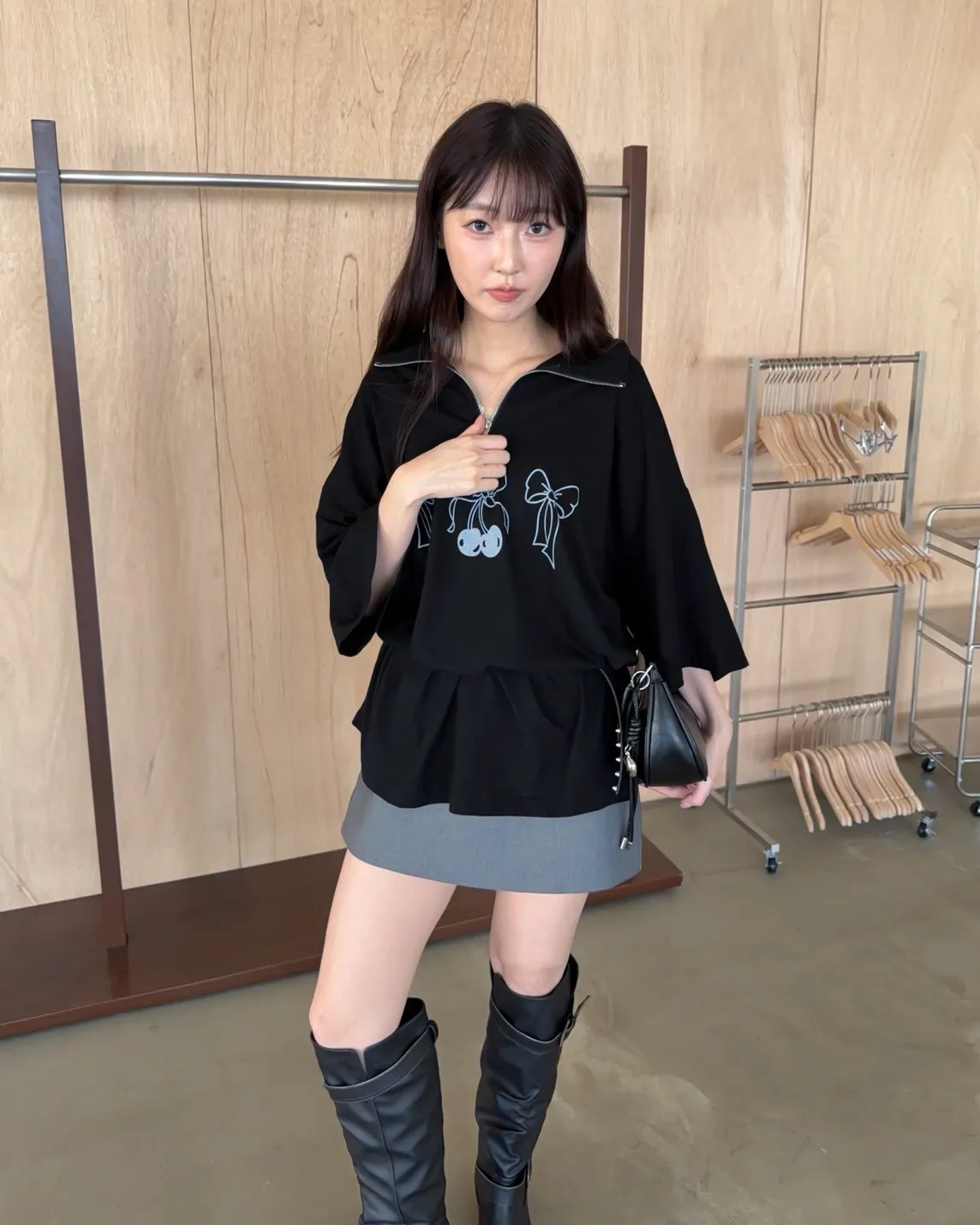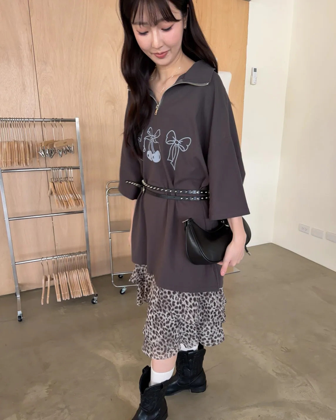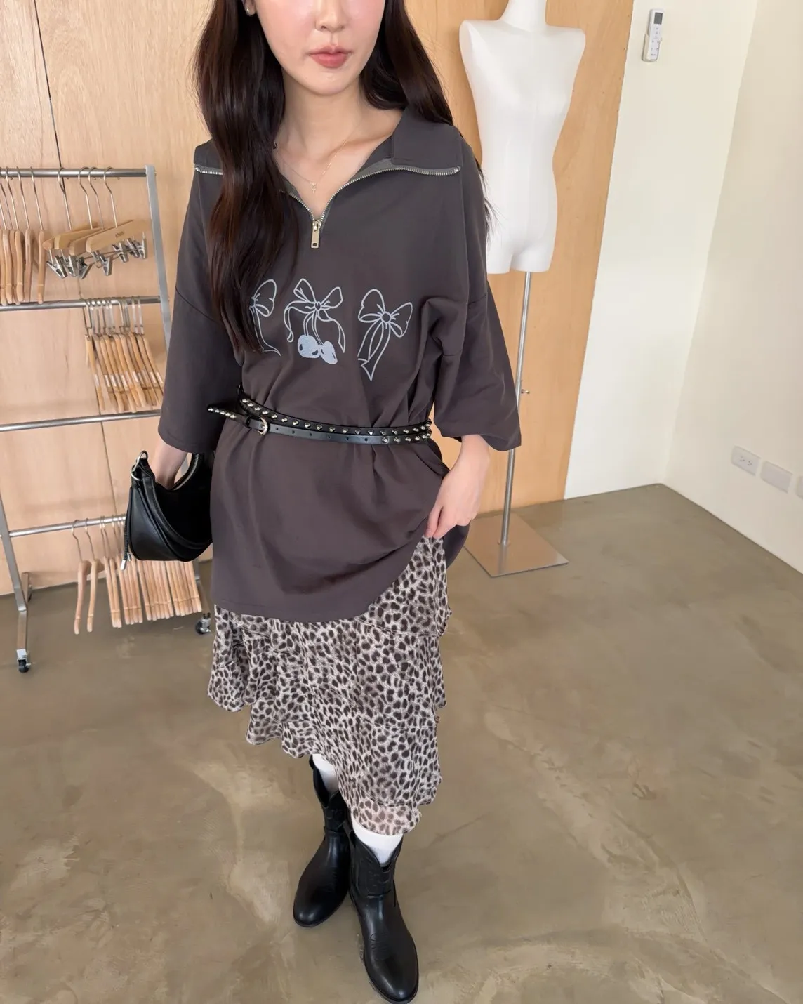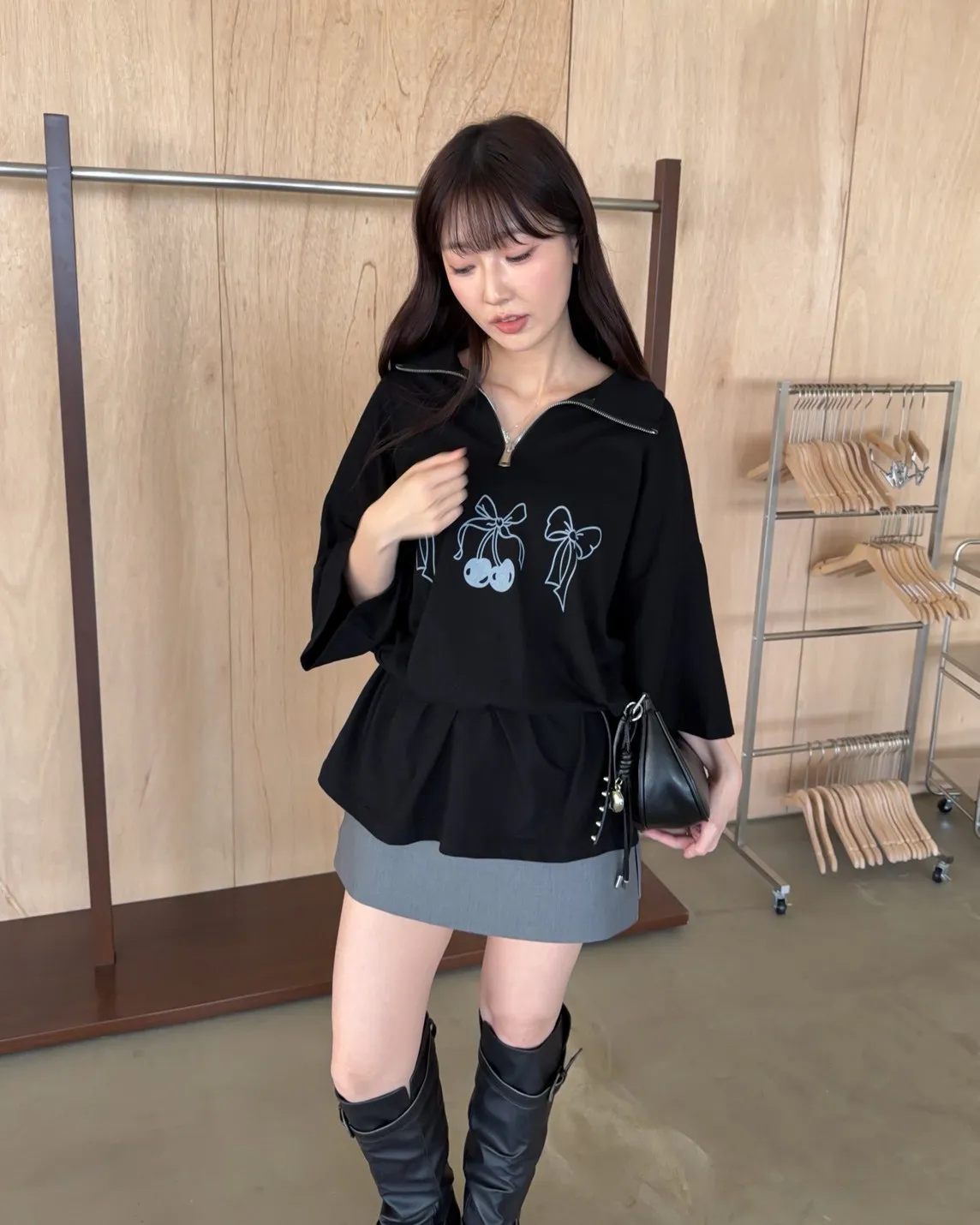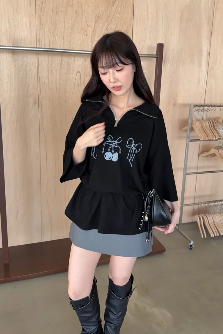拉鍊領口 可高領/翻領 灰色調 蝴蝶結+櫻桃印花 寬鬆落肩