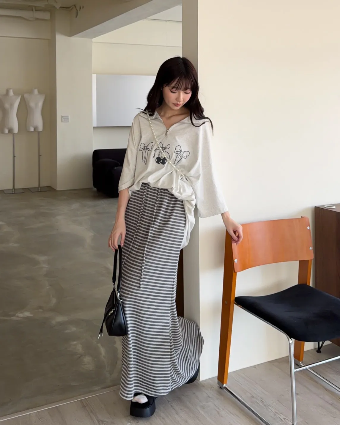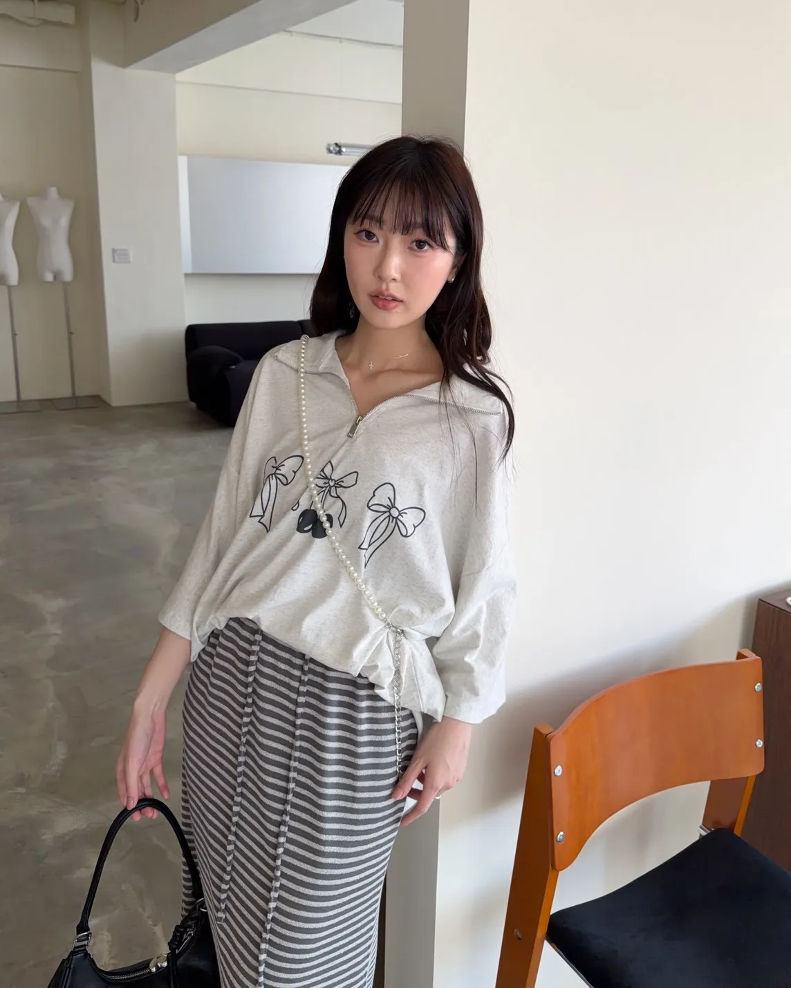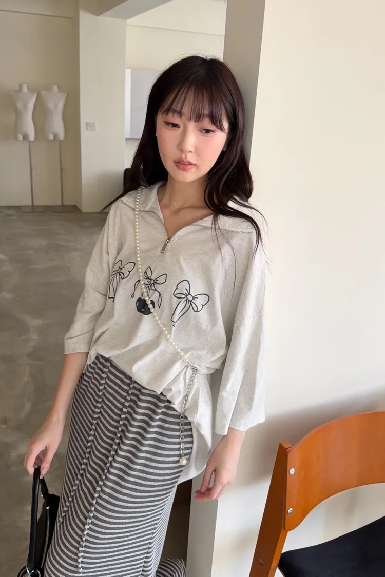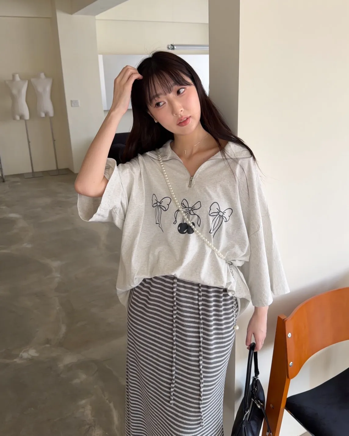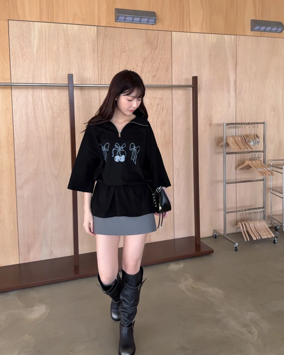 拉鍊領口 可高領/翻領 灰色調 蝴蝶結+櫻桃印花 寬鬆落肩