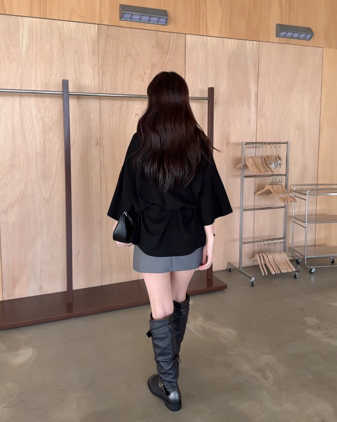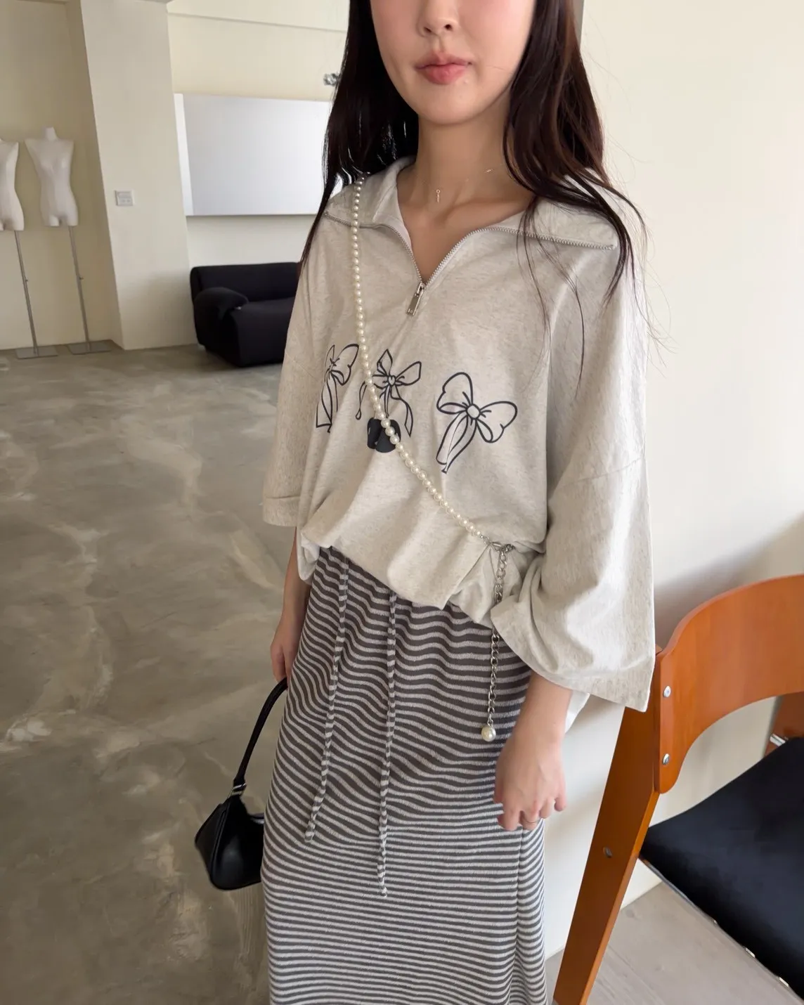B0049甜酷拉鍊領蝴蝶結大T(白灰/深灰/黑)