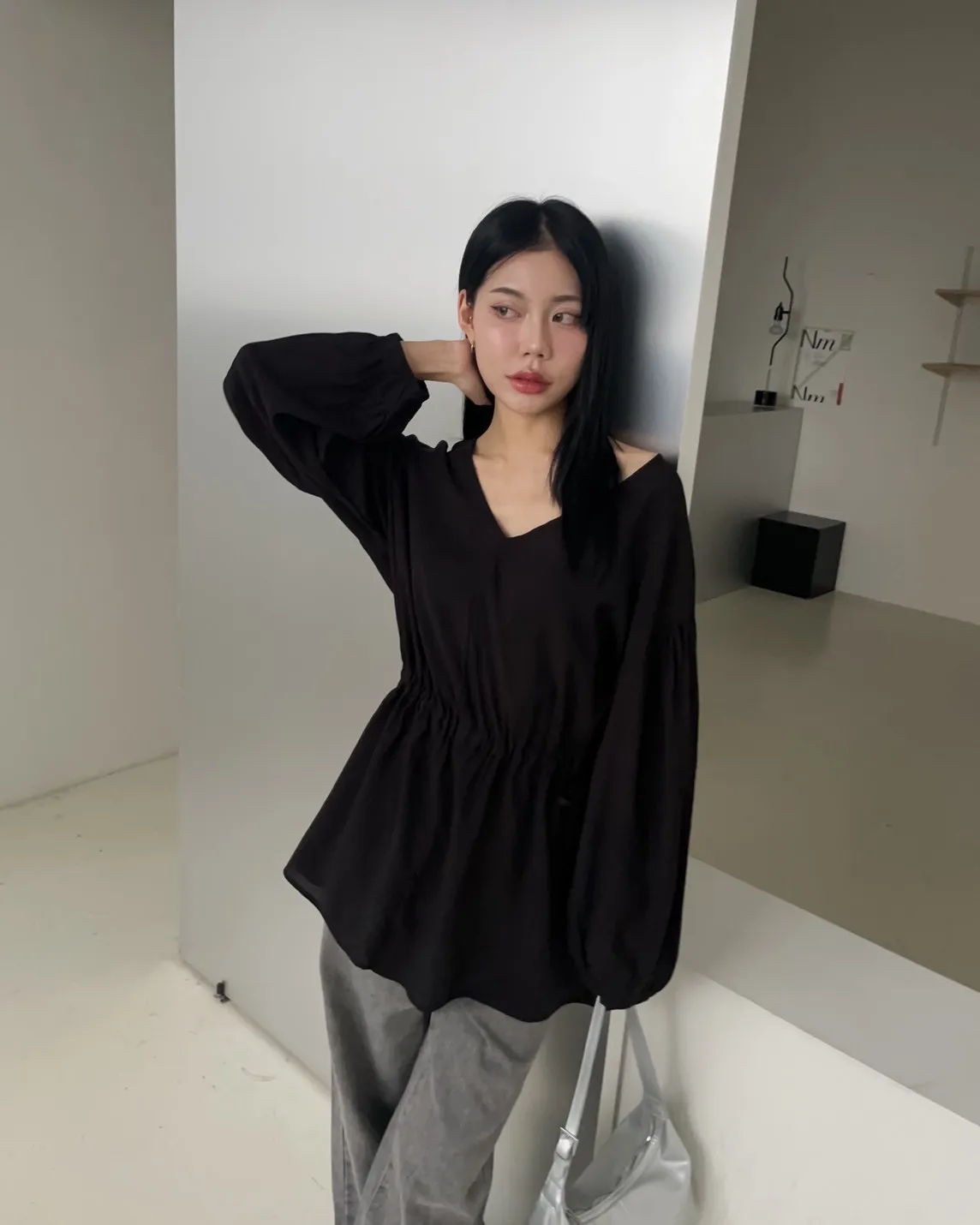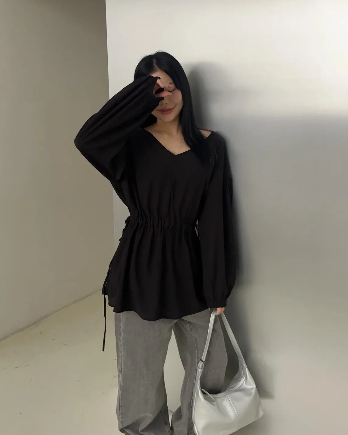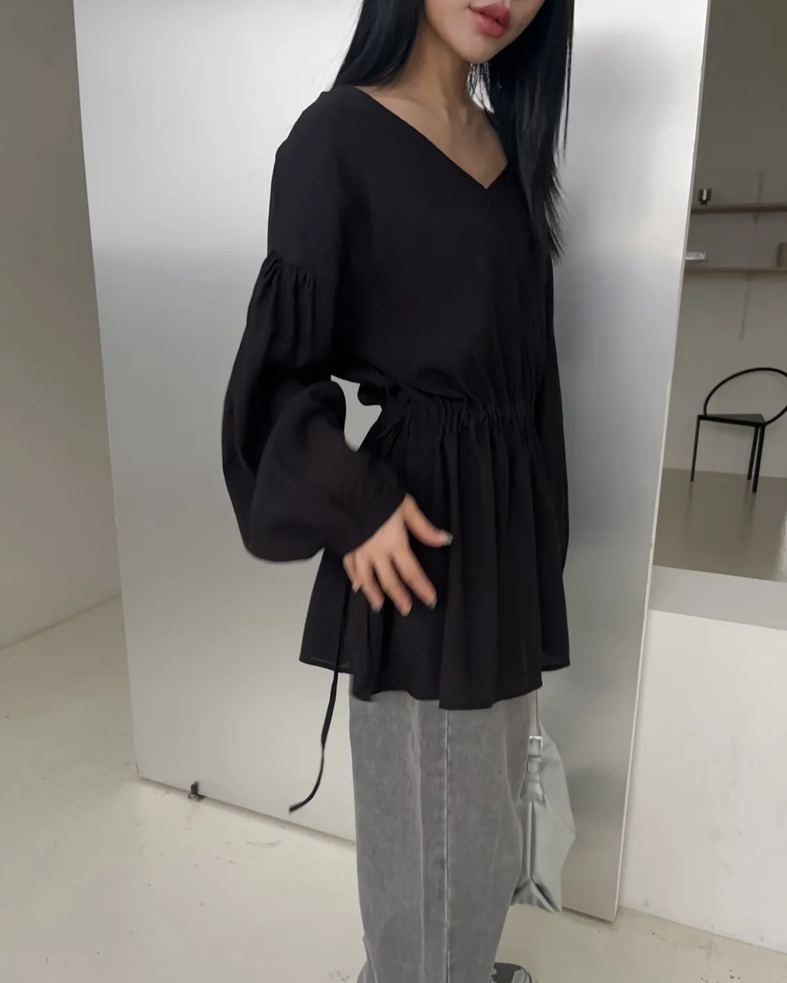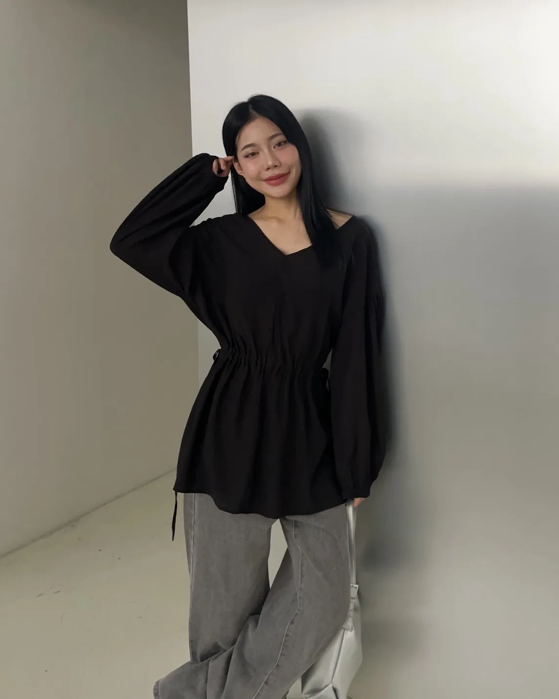 U0031溫婉氣質V領抽繩裙擺上衣(米/黑)