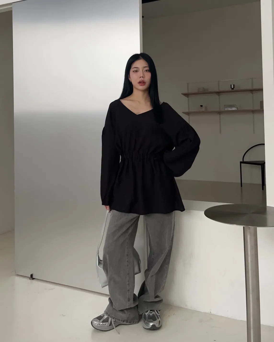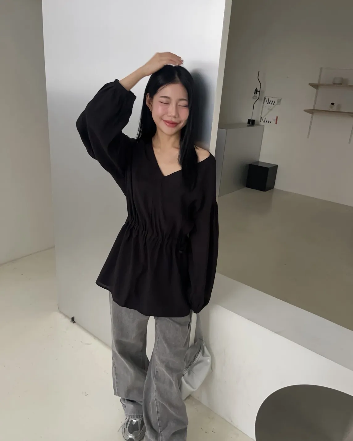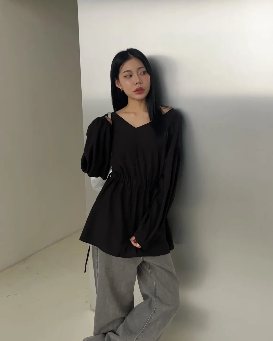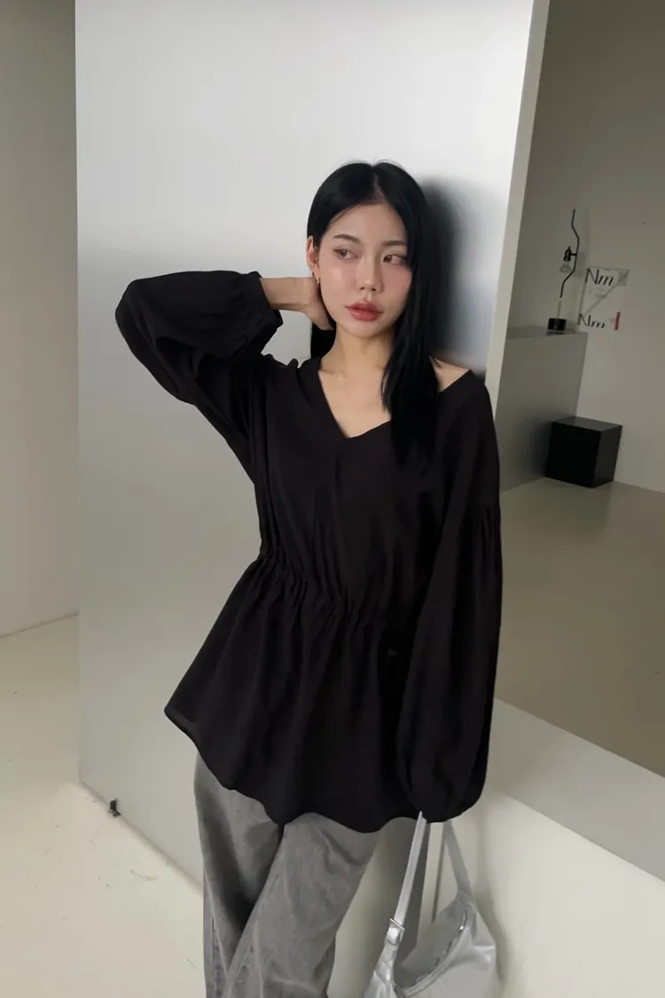 U0031溫婉氣質V領抽繩裙擺上衣(米/黑)