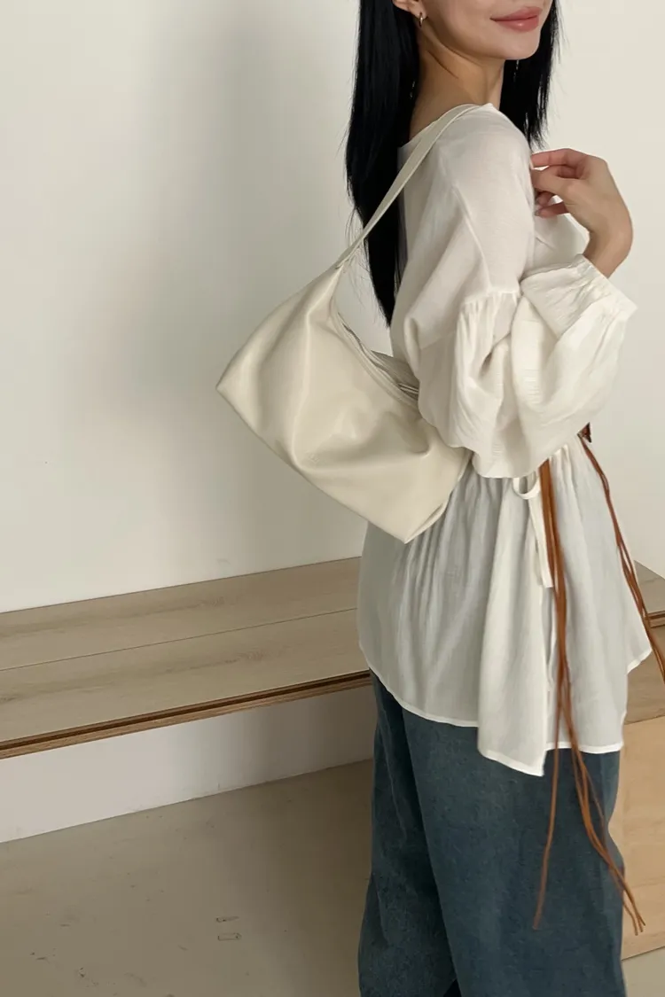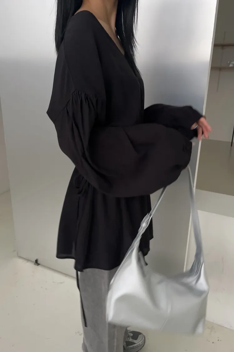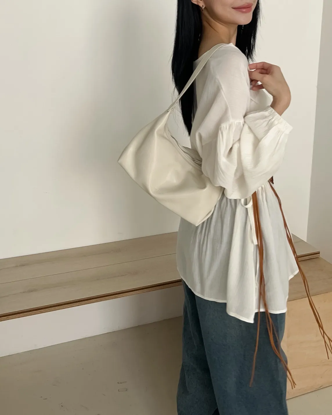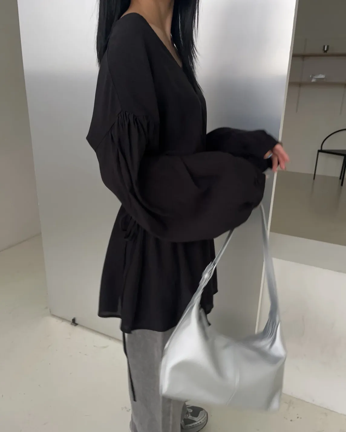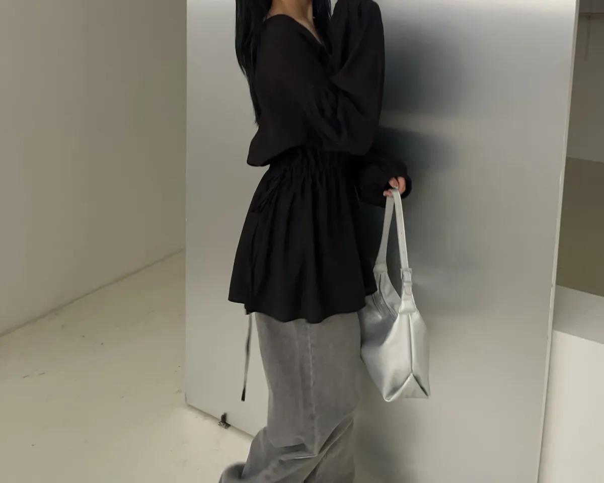 U0031溫婉氣質V領抽繩裙擺上衣(米/黑)